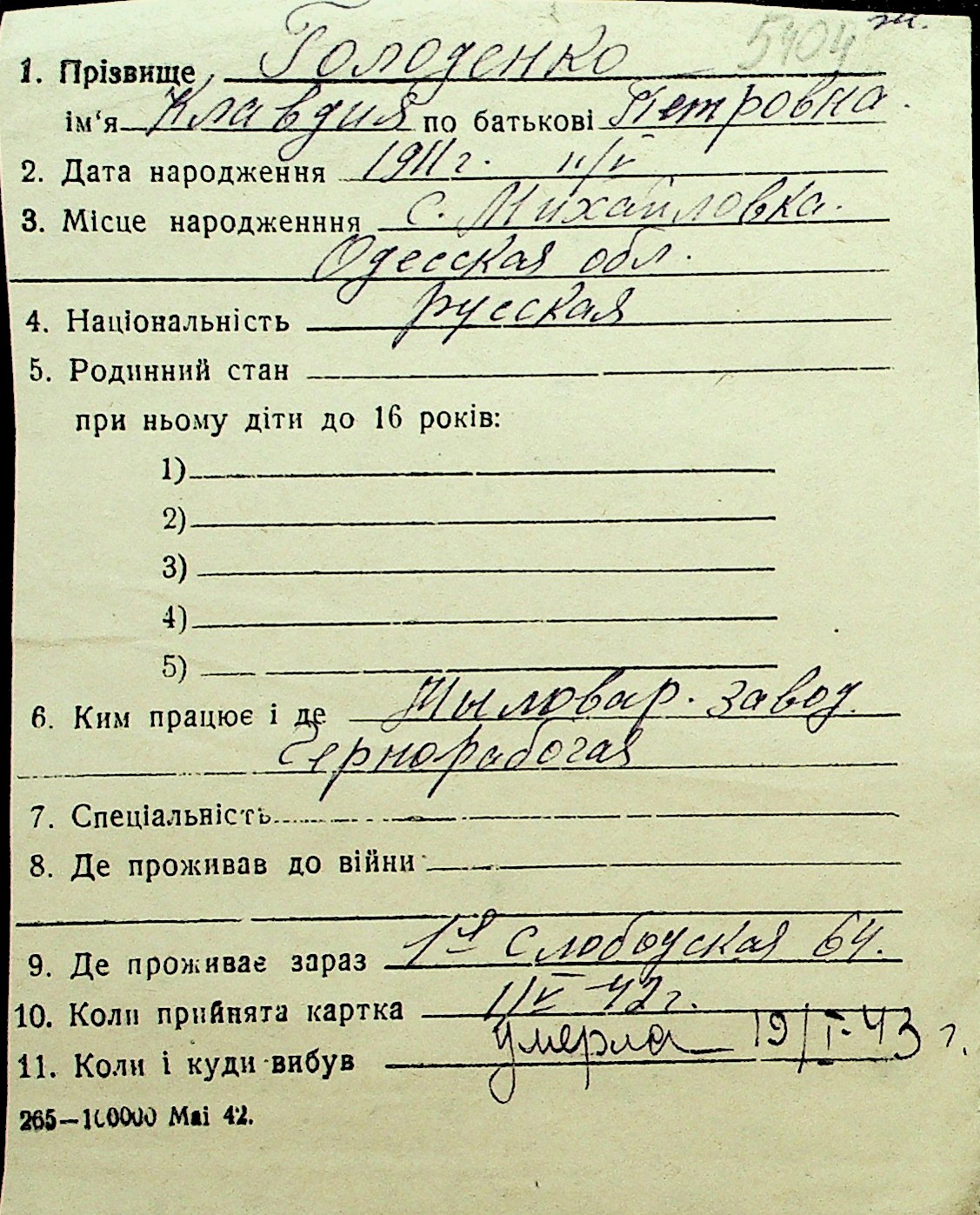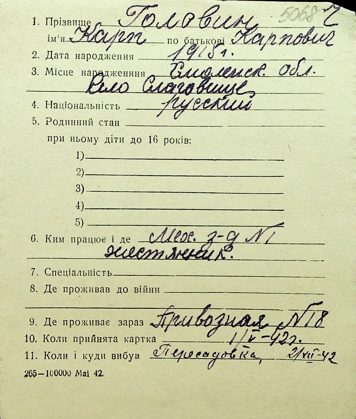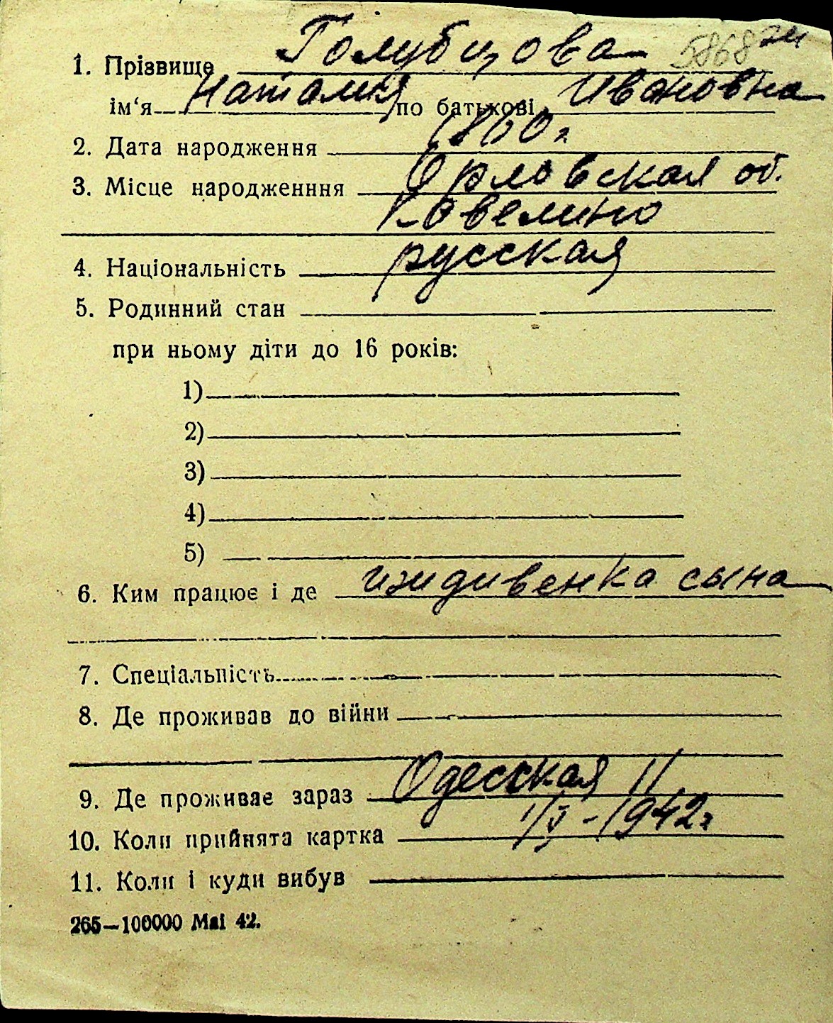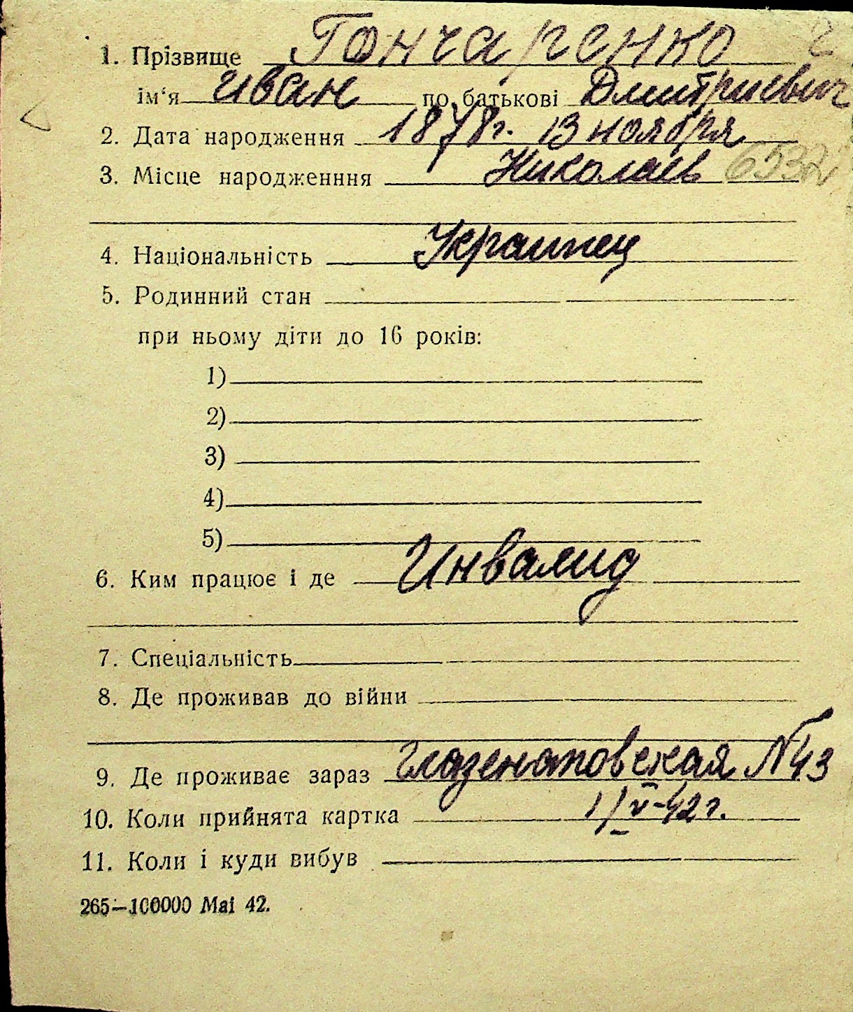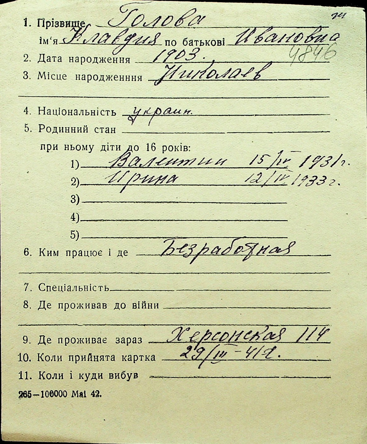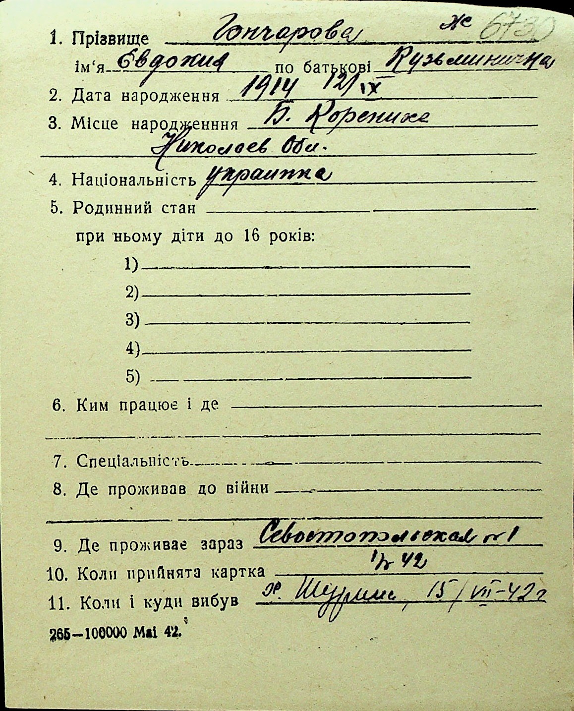 • • Перелік карток до фонду № Н-1016