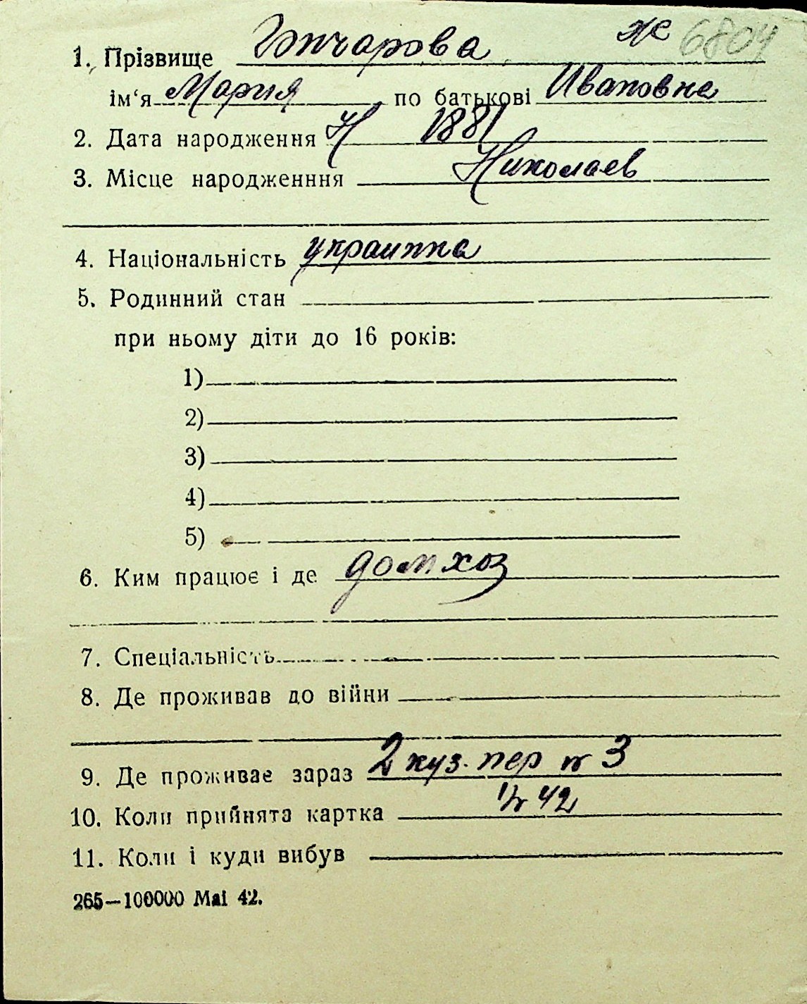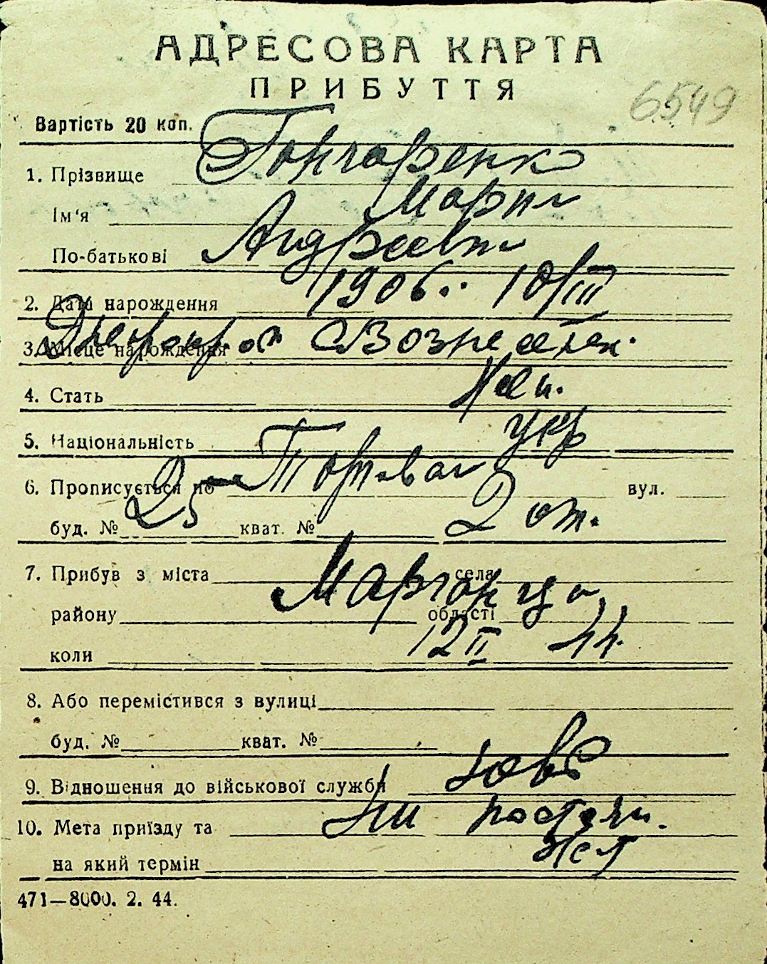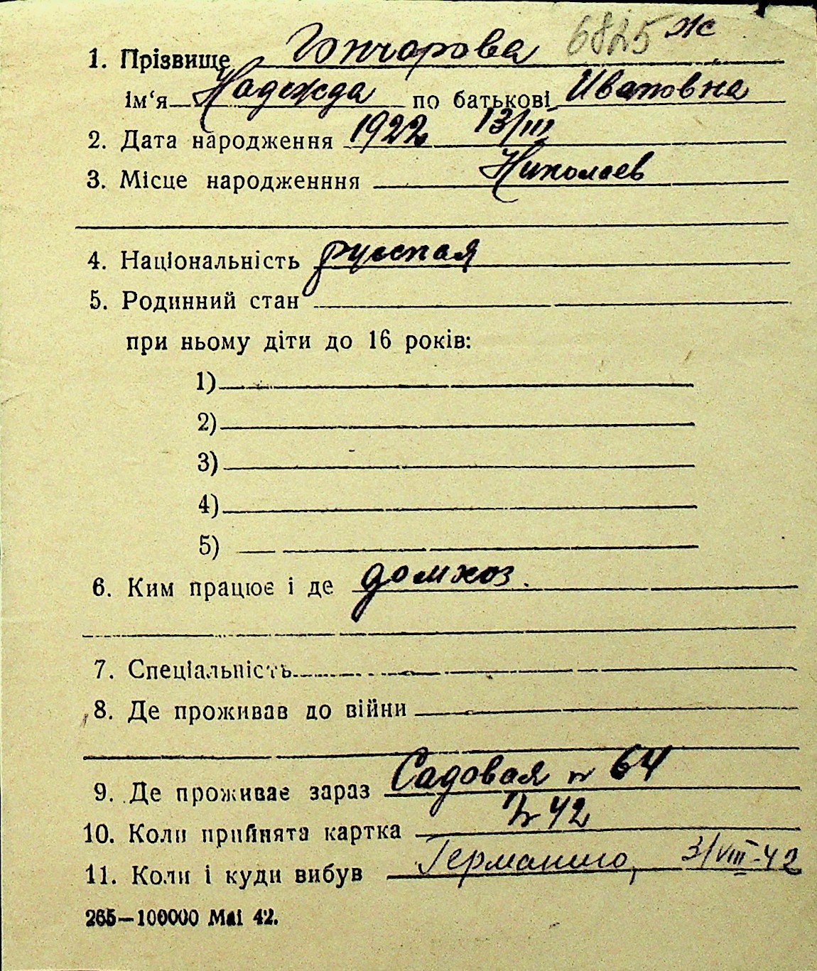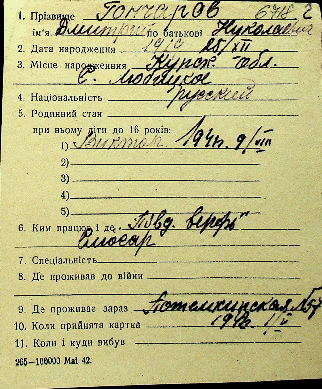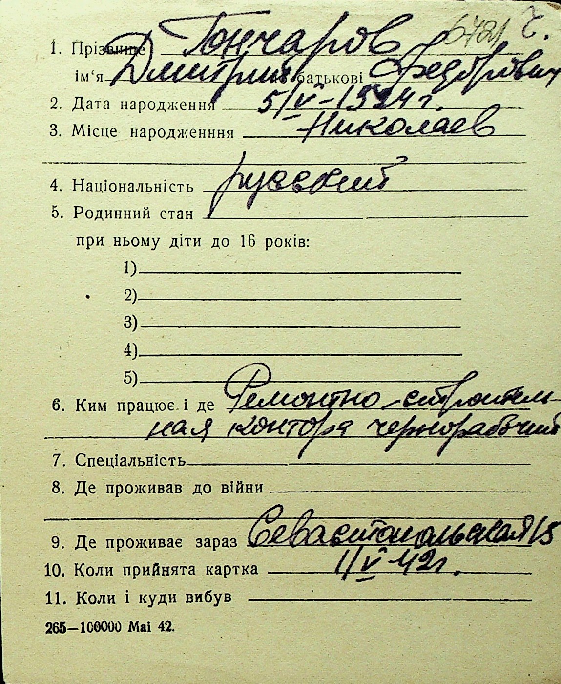 • • Перелік карток до фонду № Н-1016