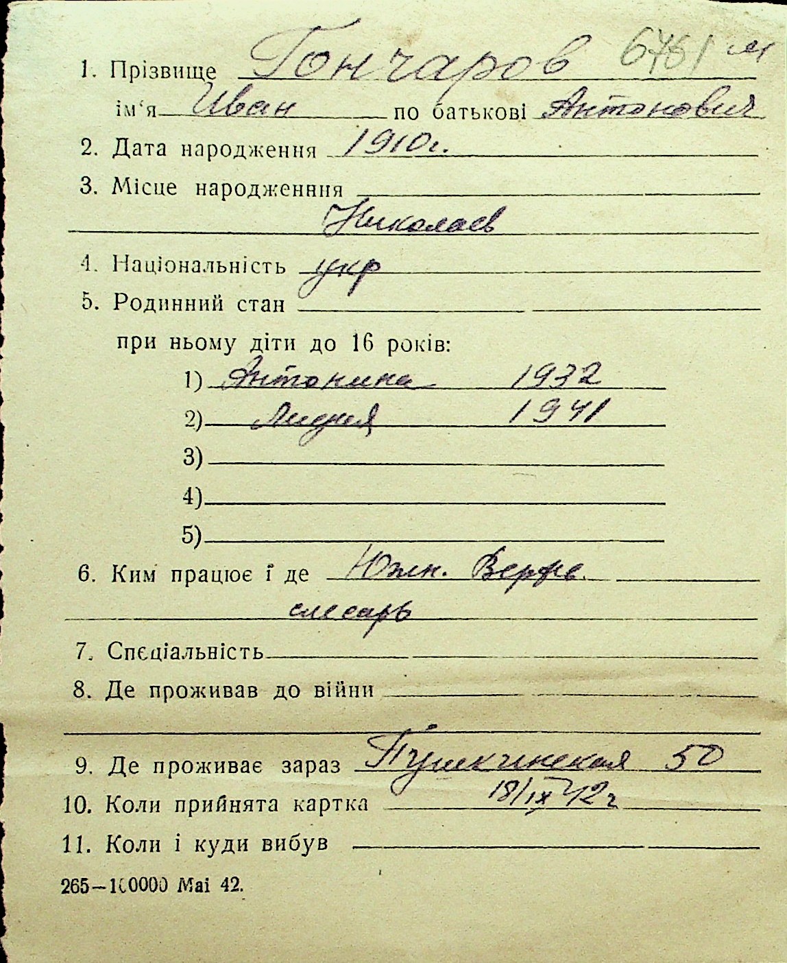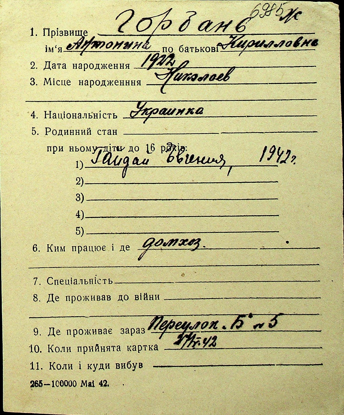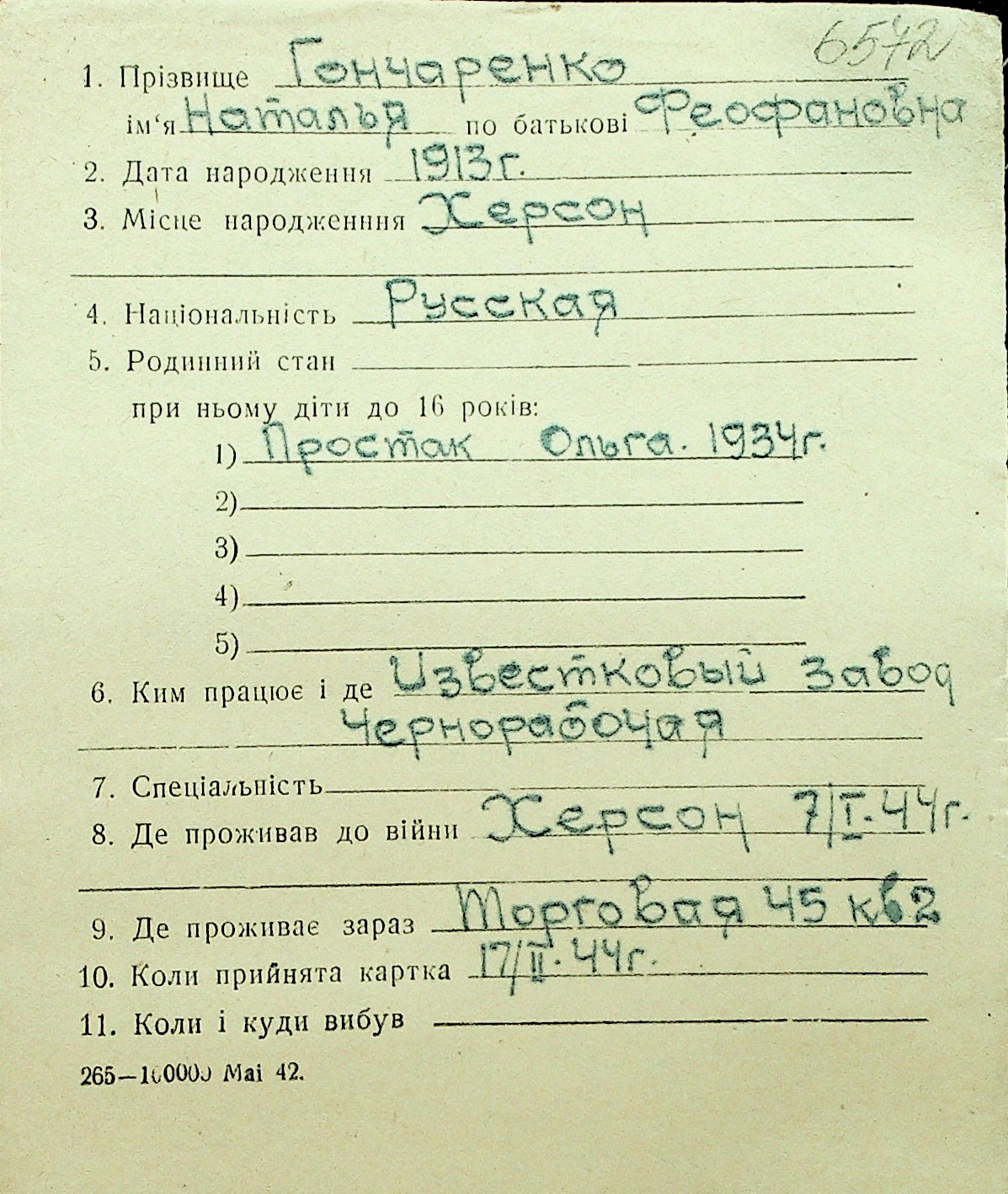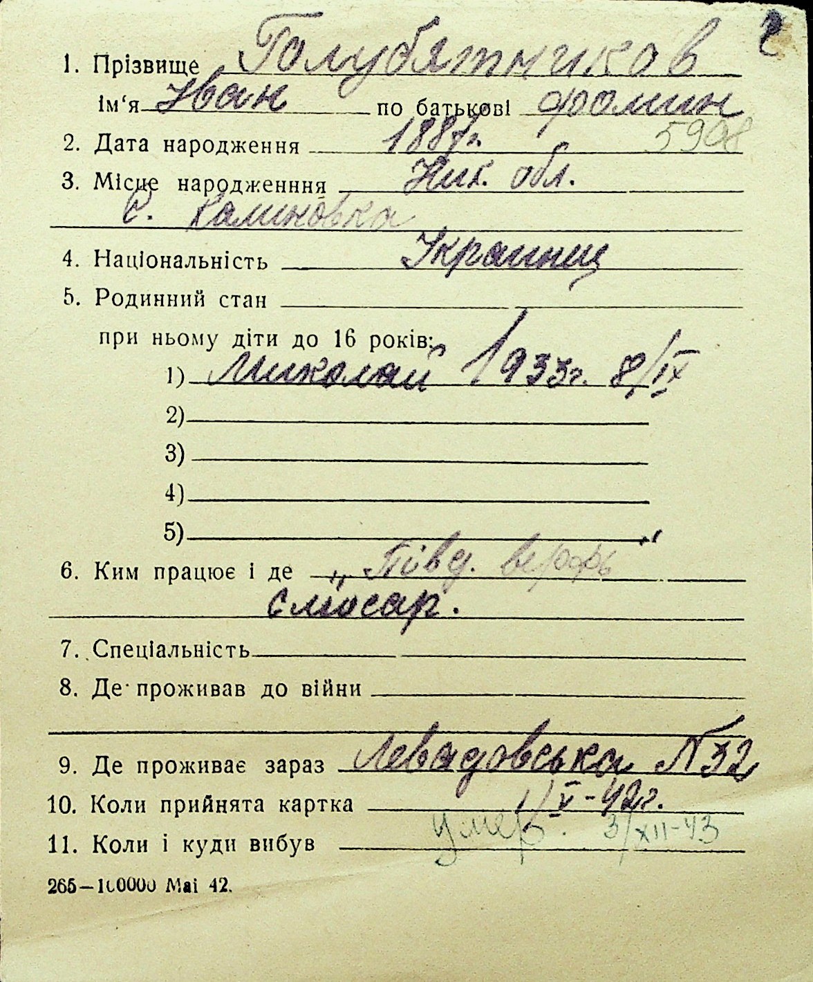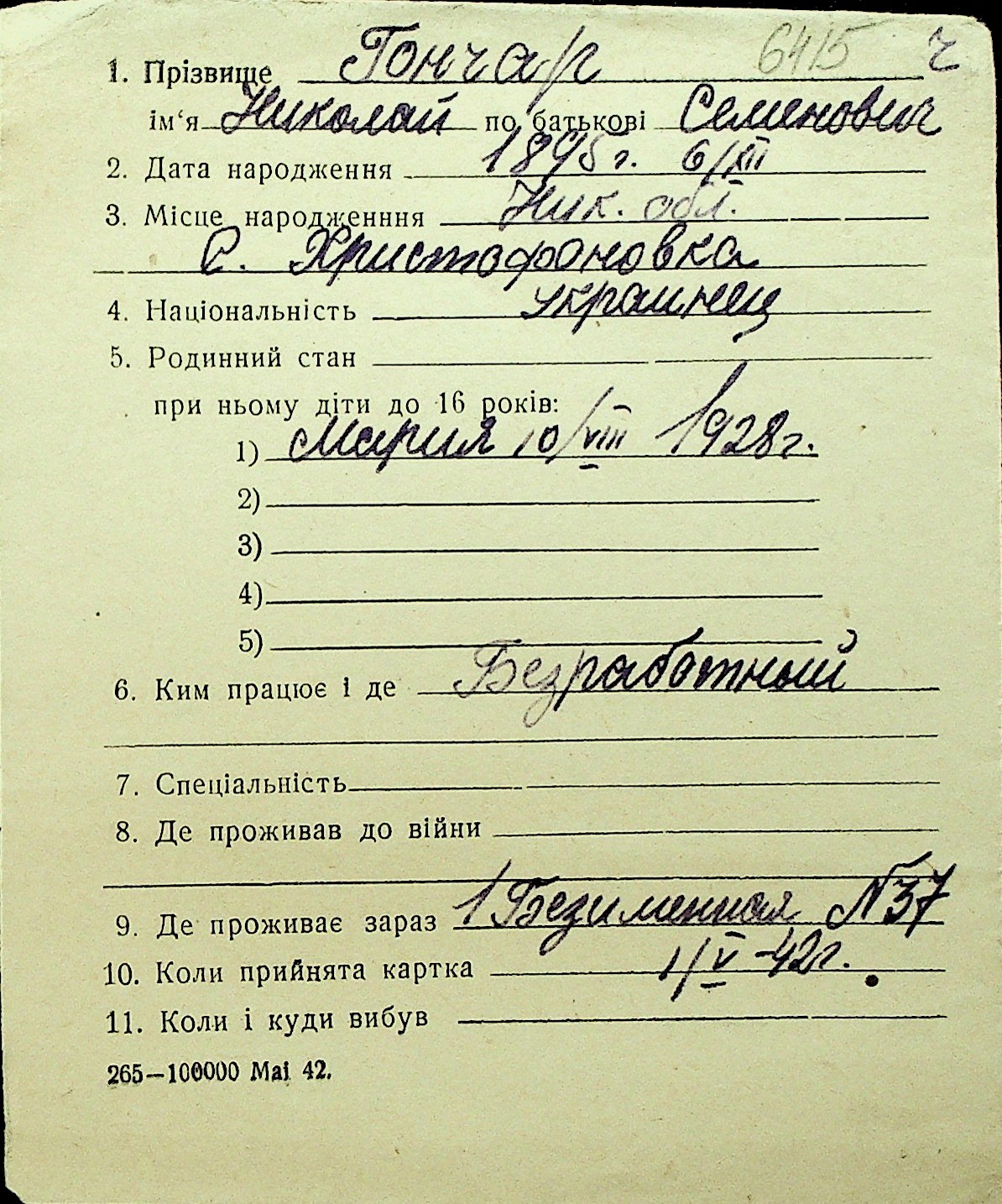 • • Перелік карток до фонду № Н-1016