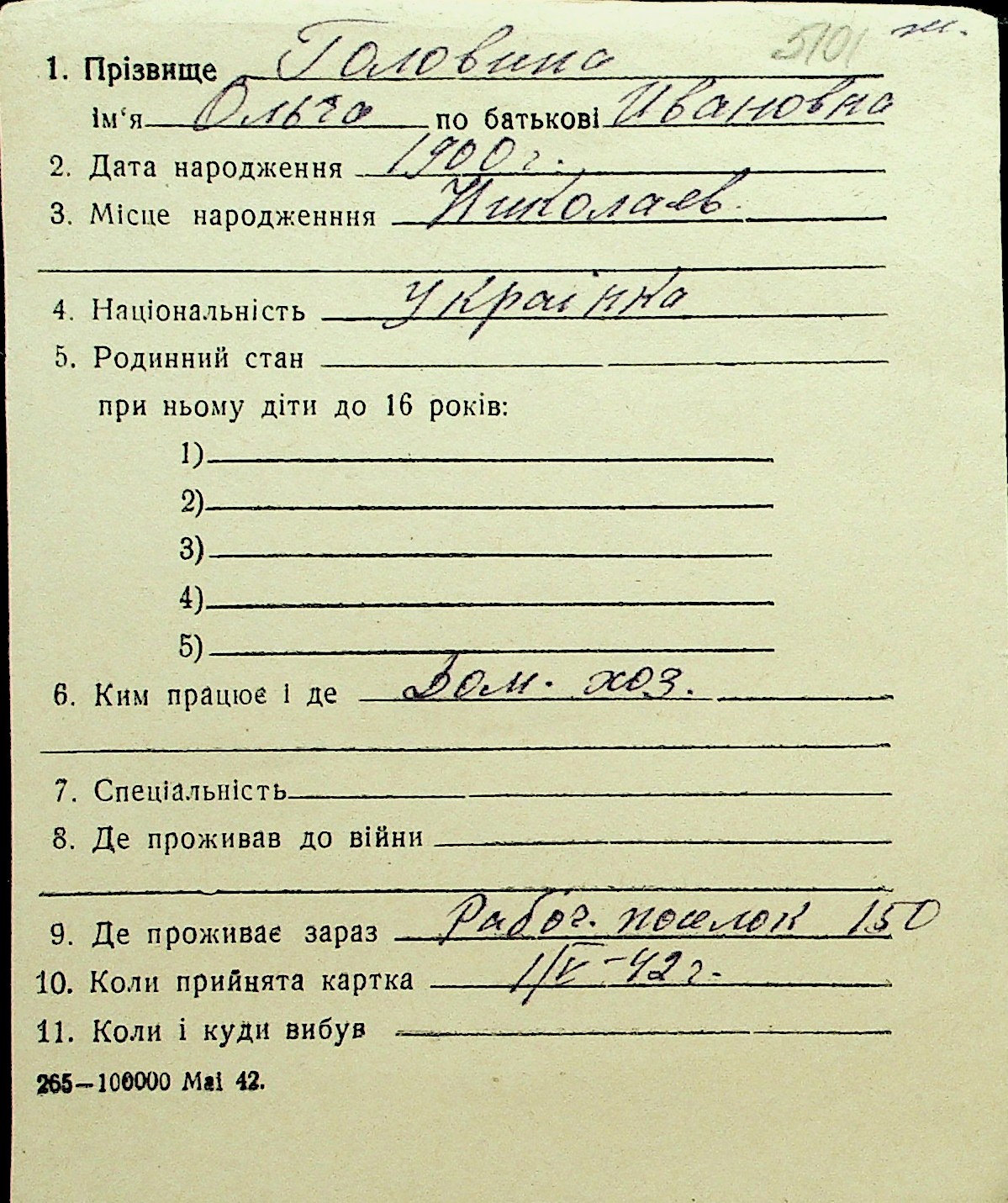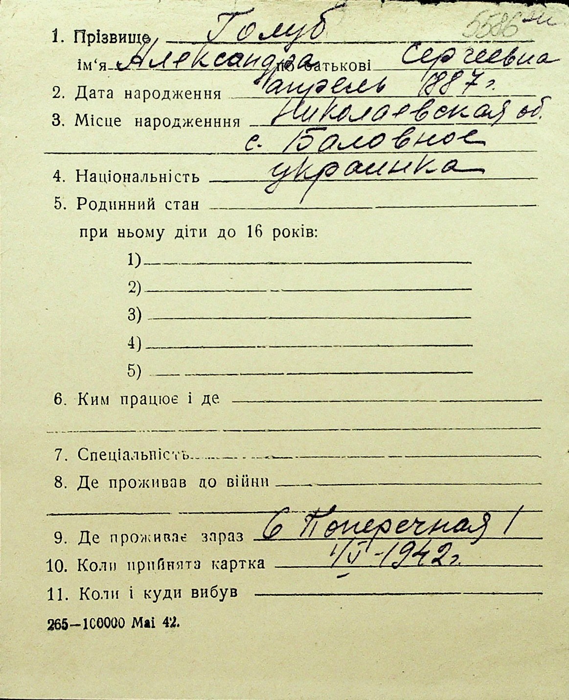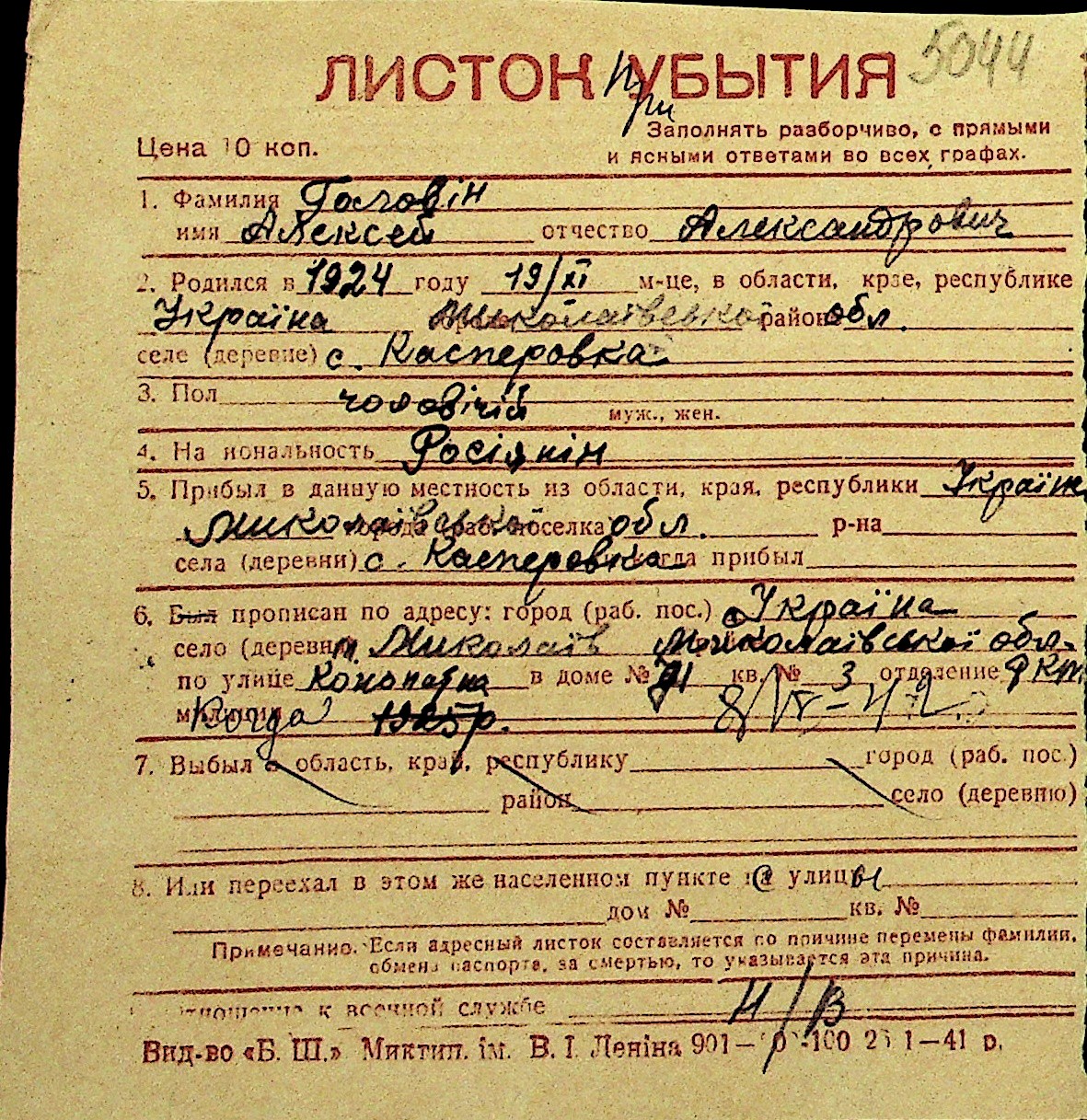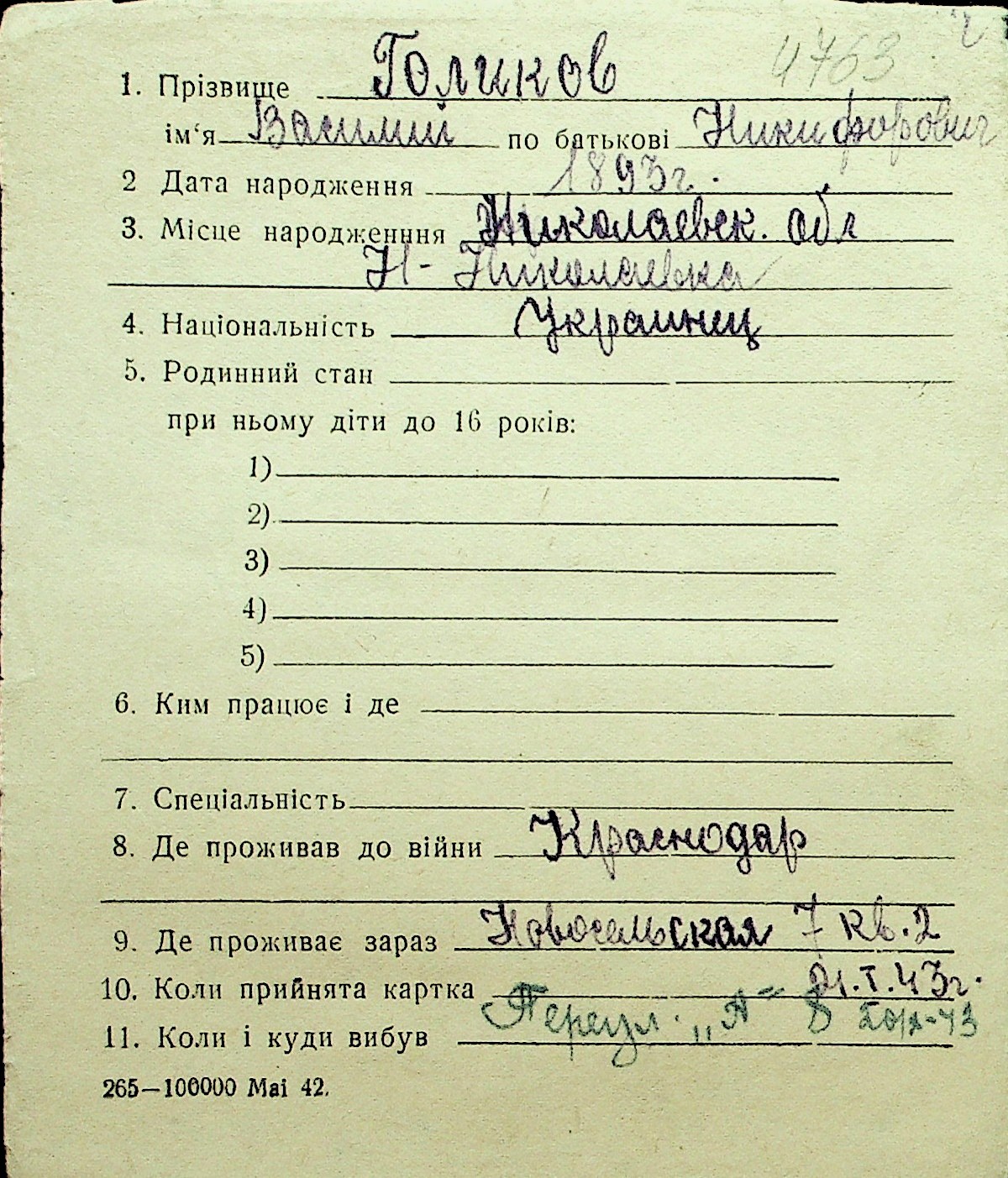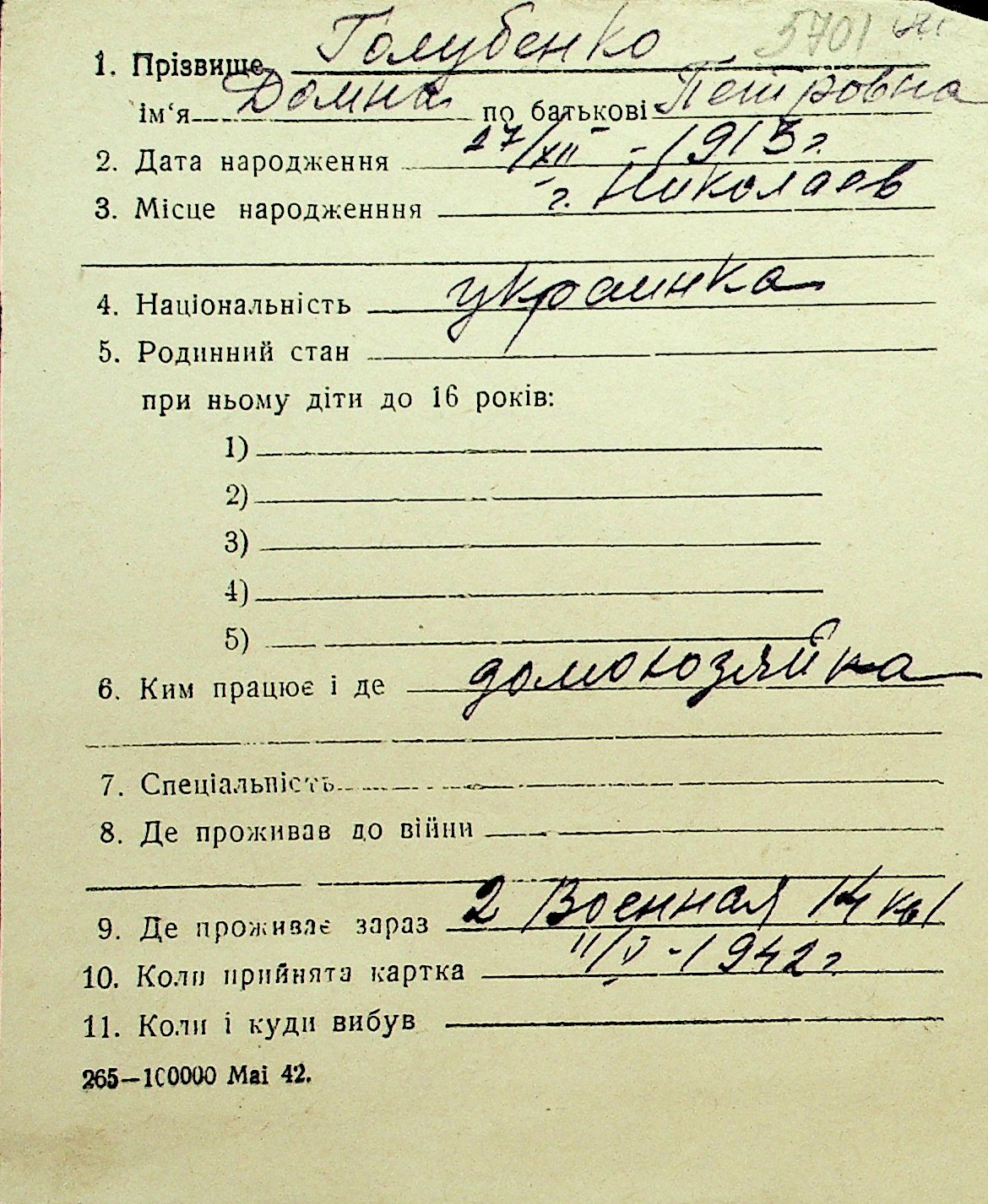 • • Перелік карток до фонду № Н-1016