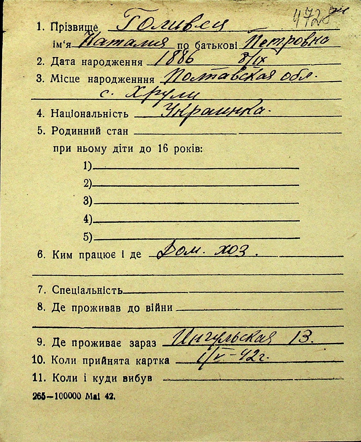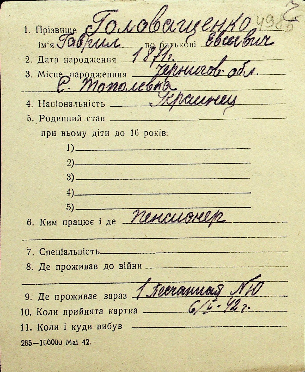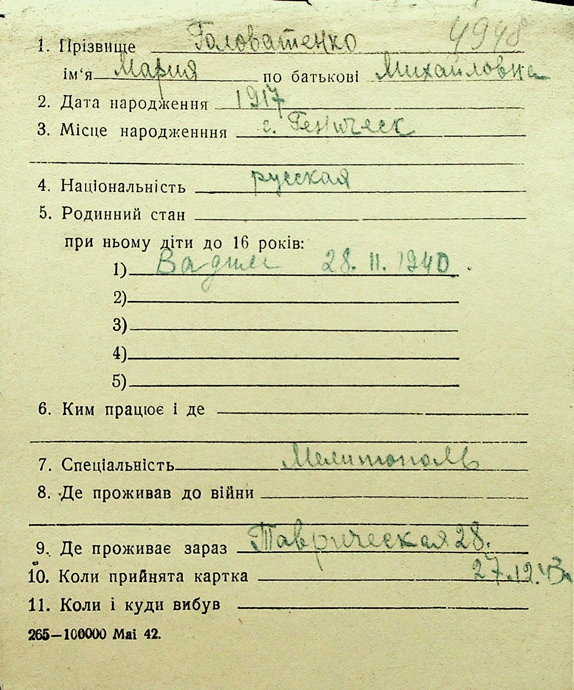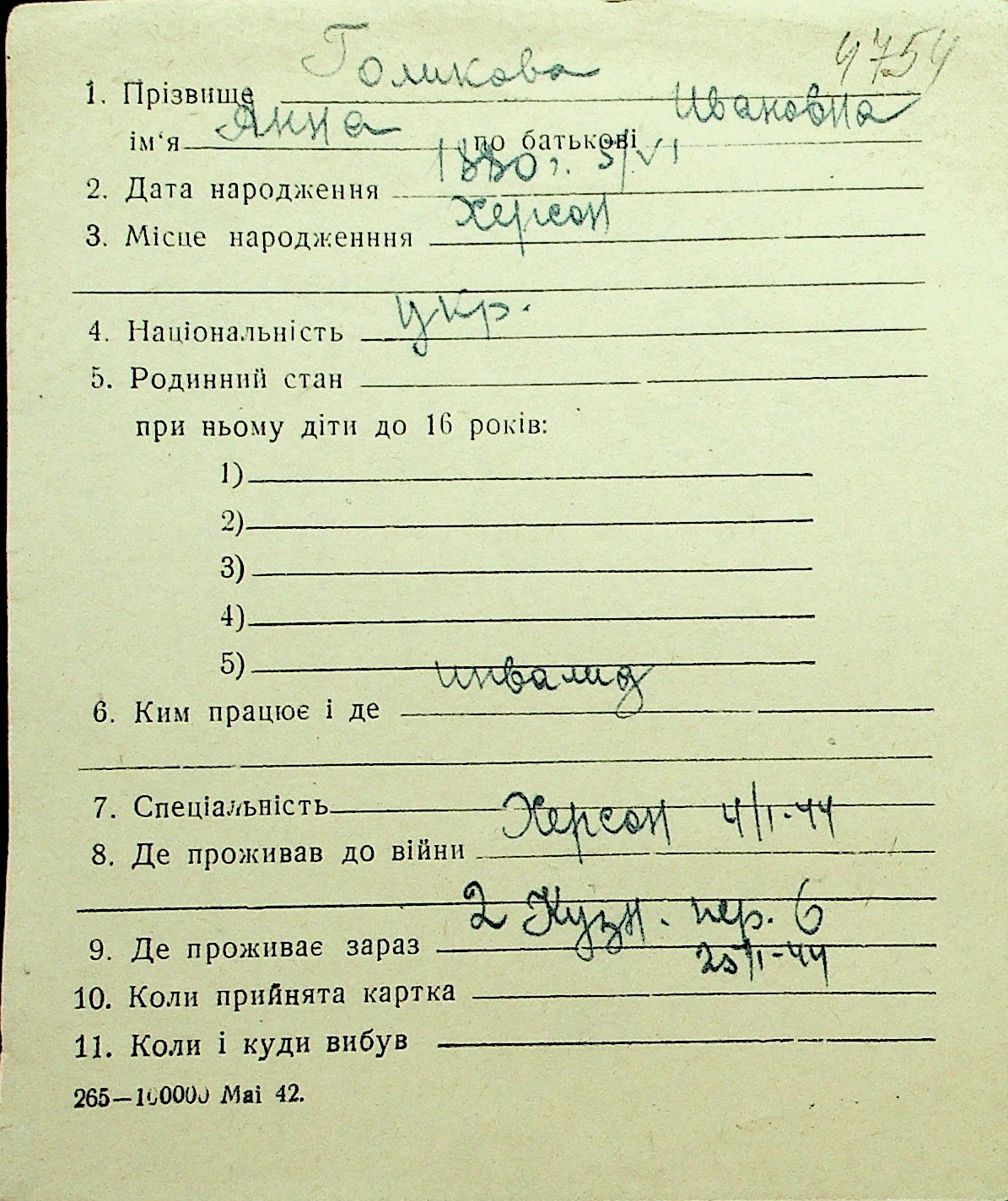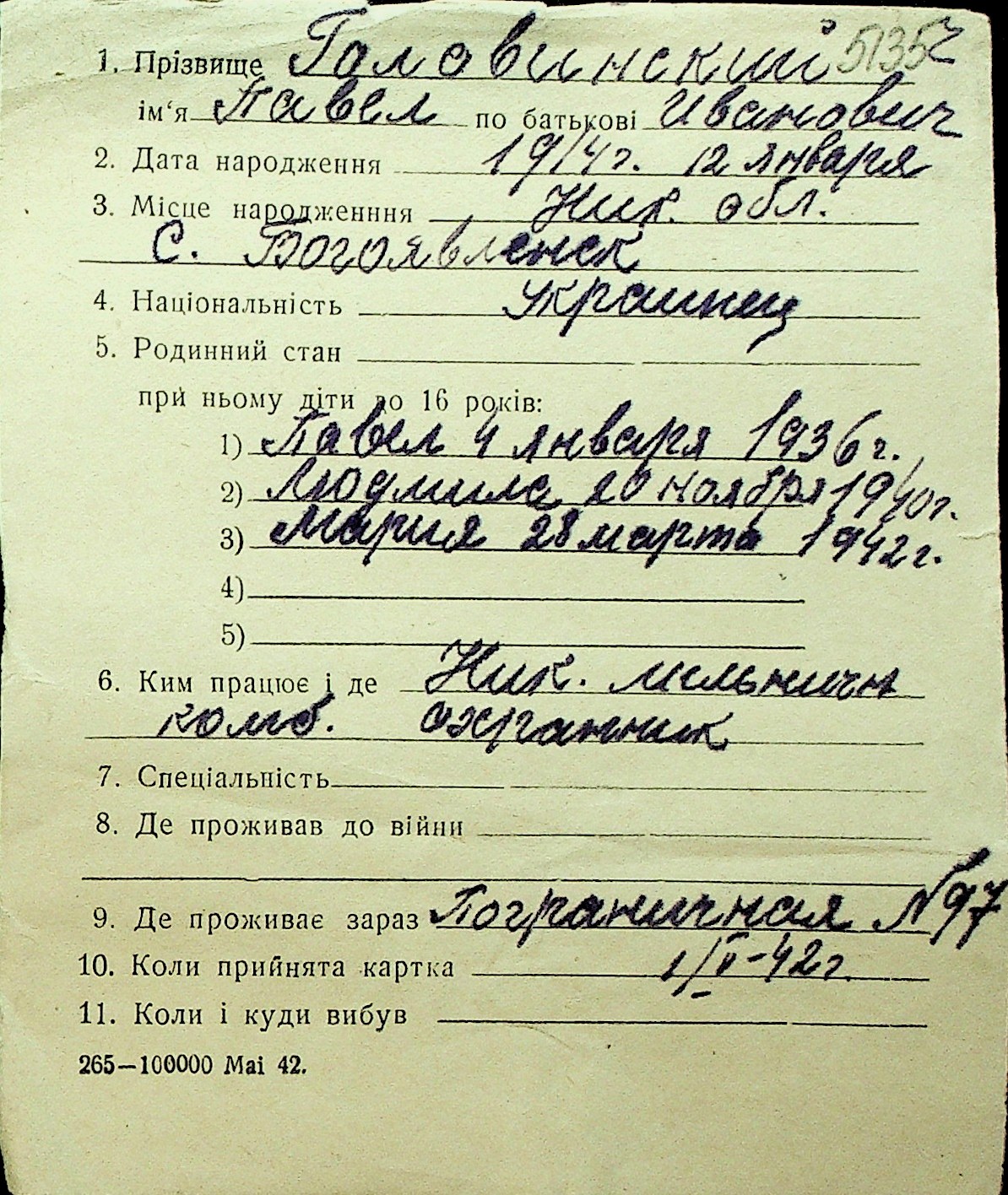 • • Перелік карток до фонду № Н-1016