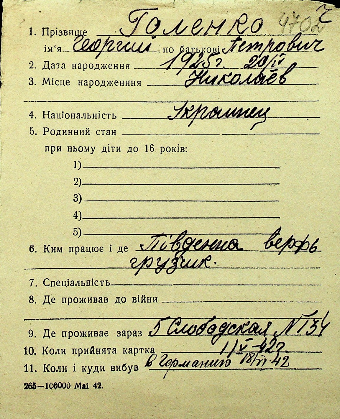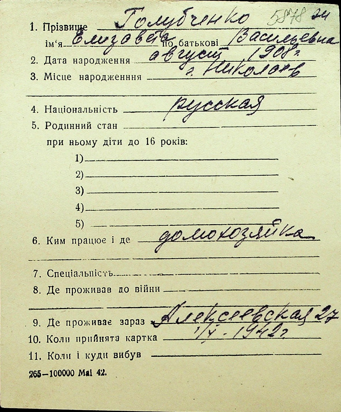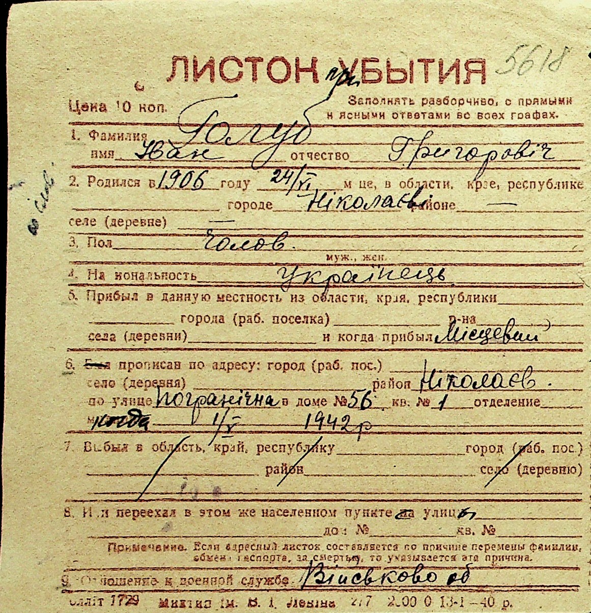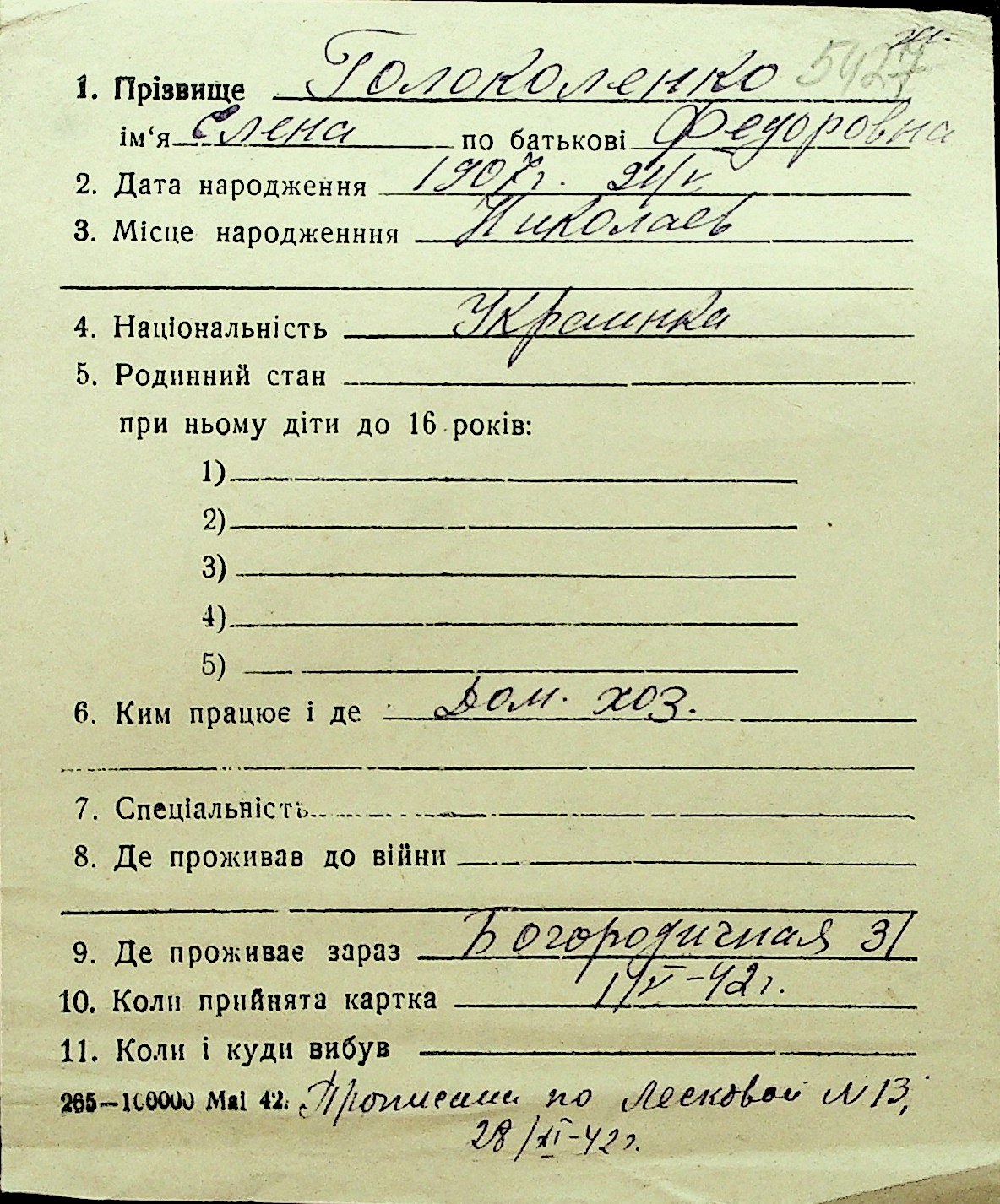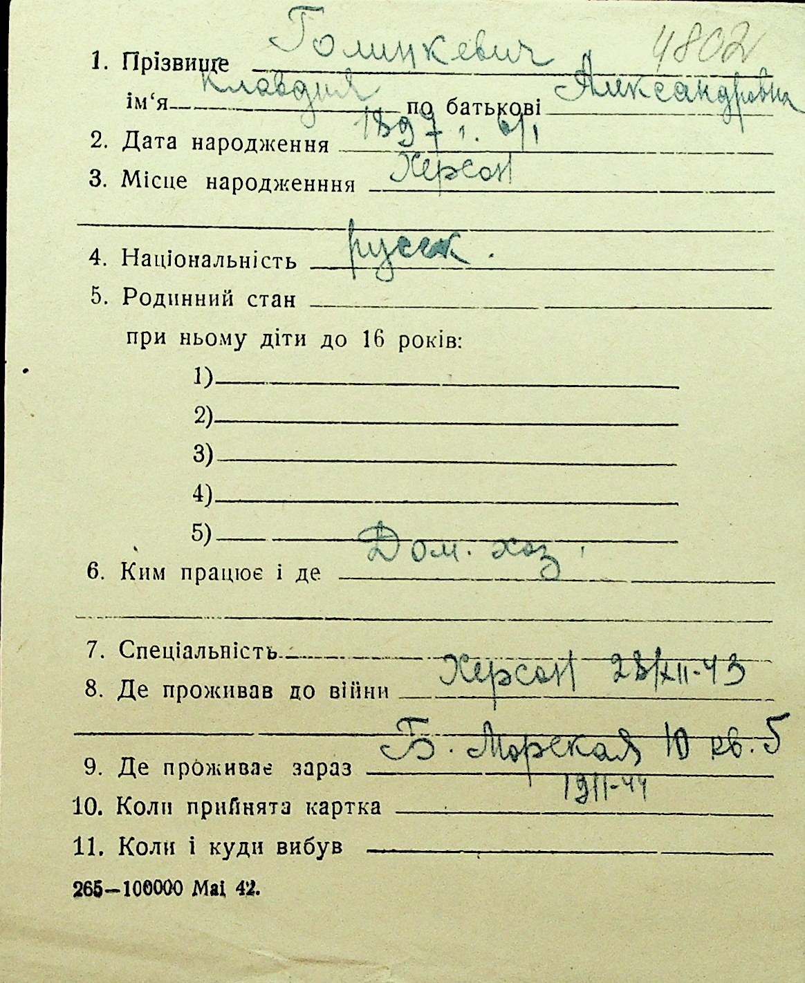 • • Перелік карток до фонду № Н-1016