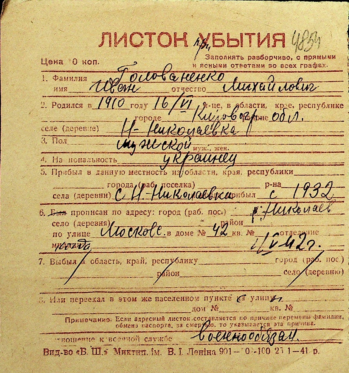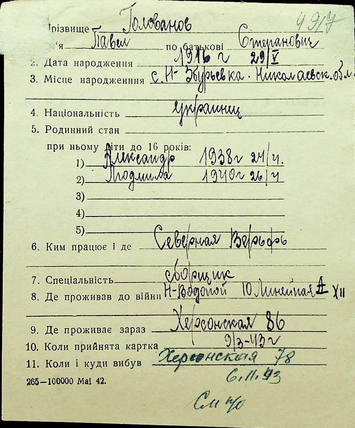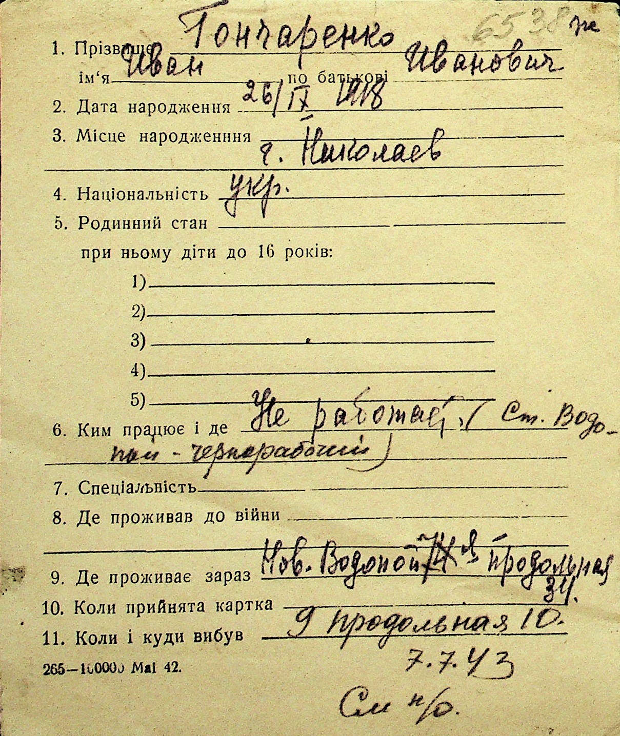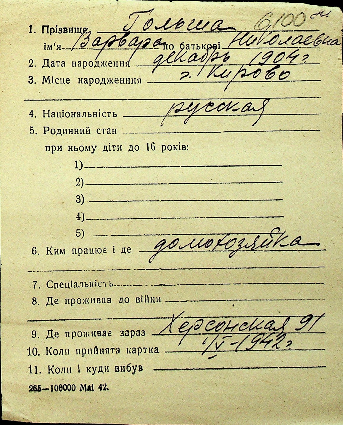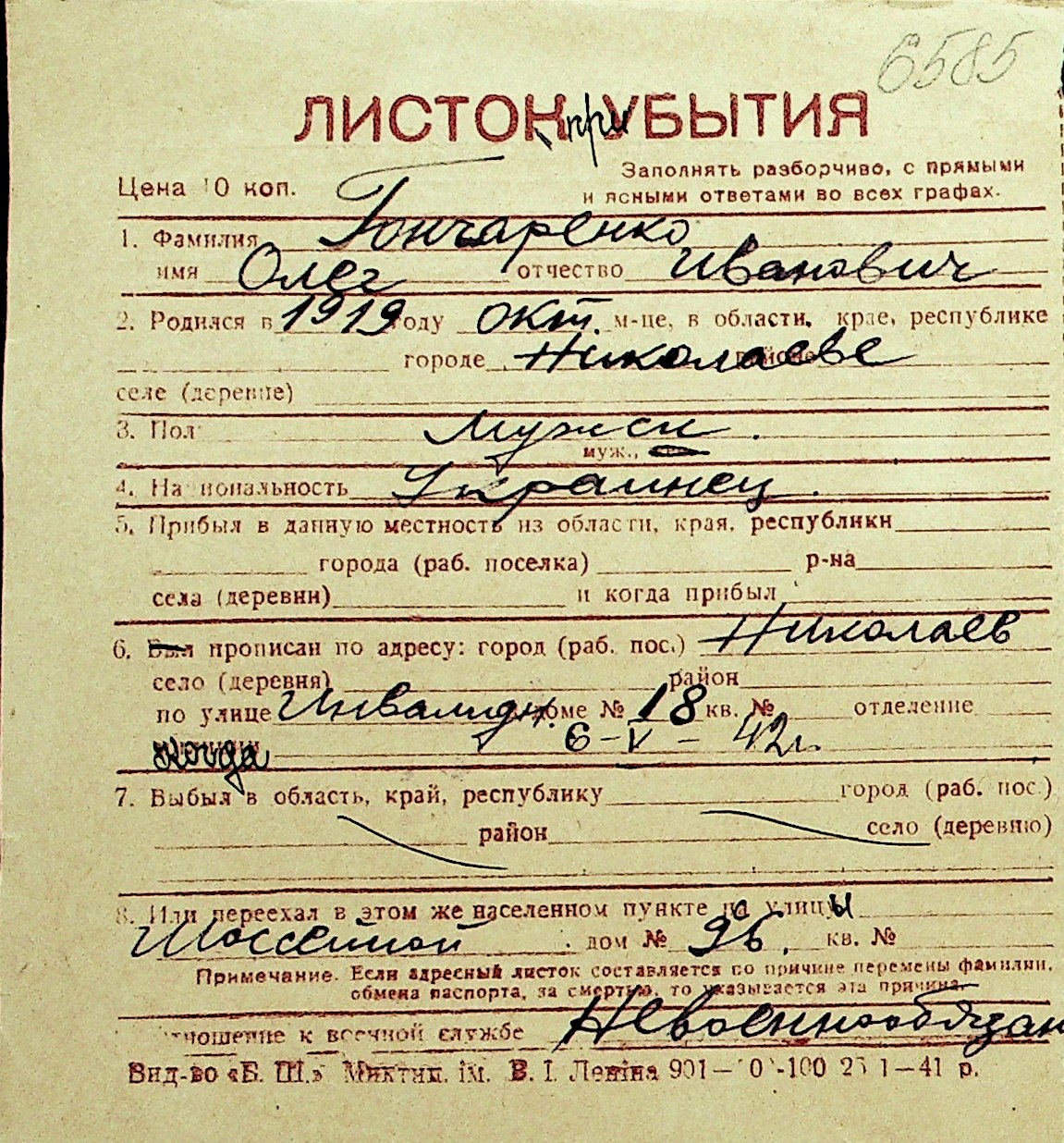 • • Перелік карток до фонду № Н-1016