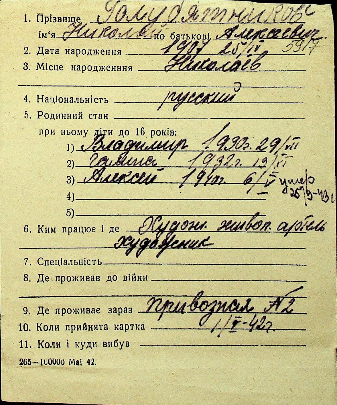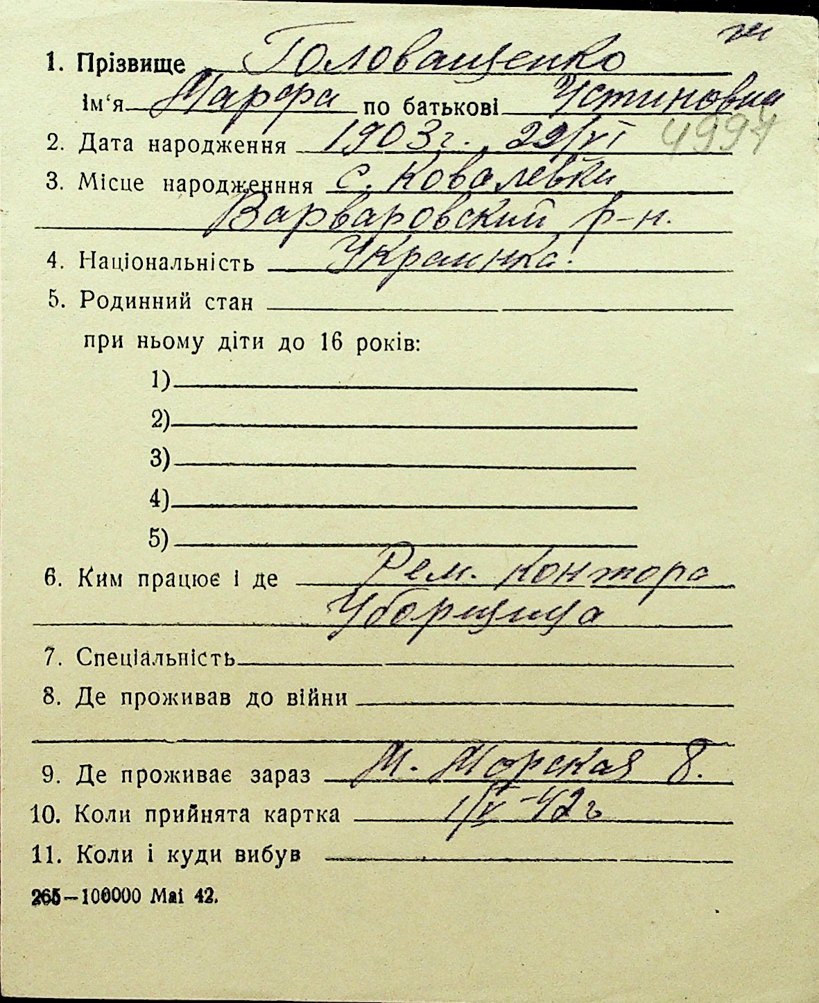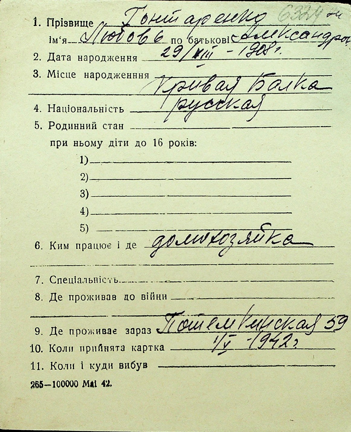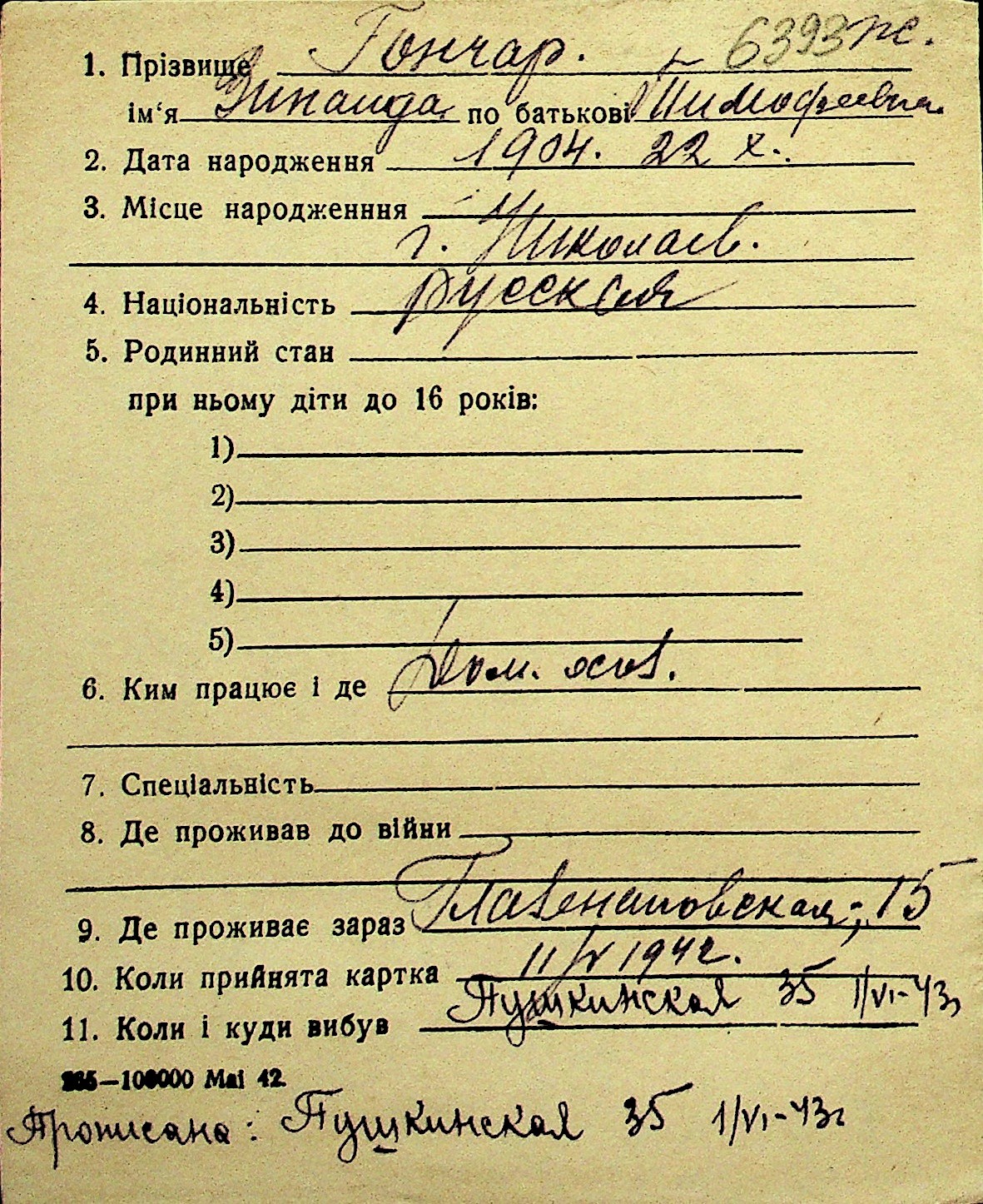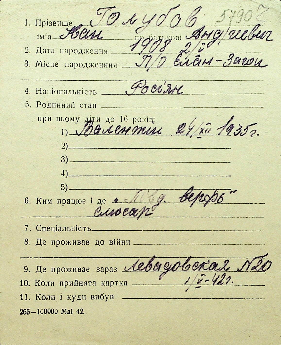• • Перелік карток до фонду № Н-1016