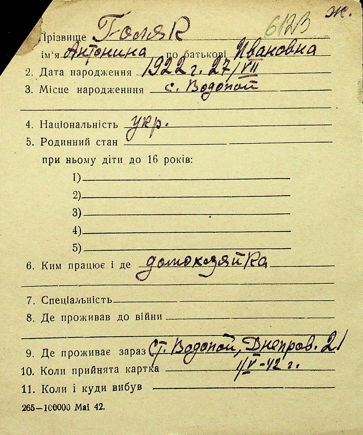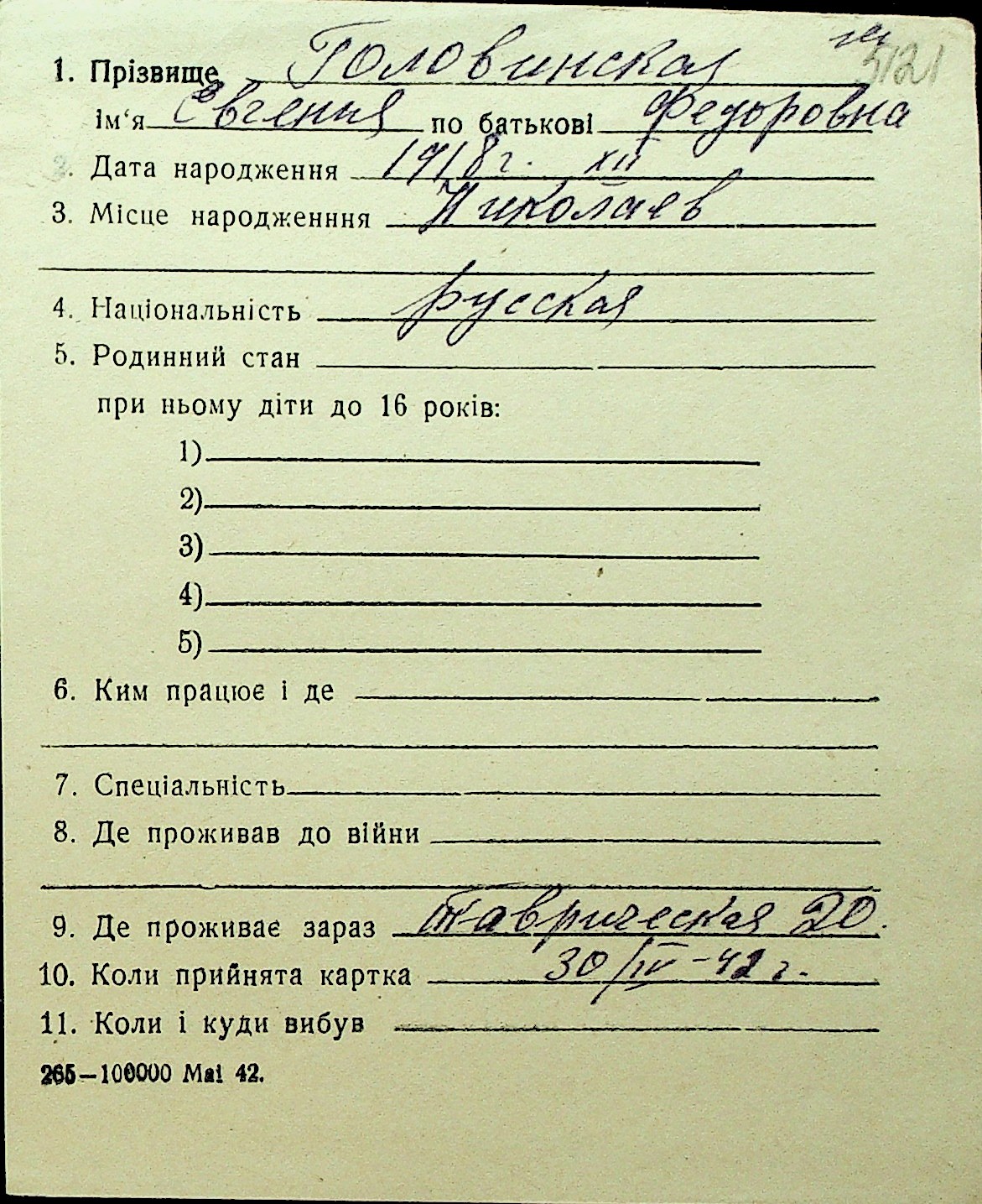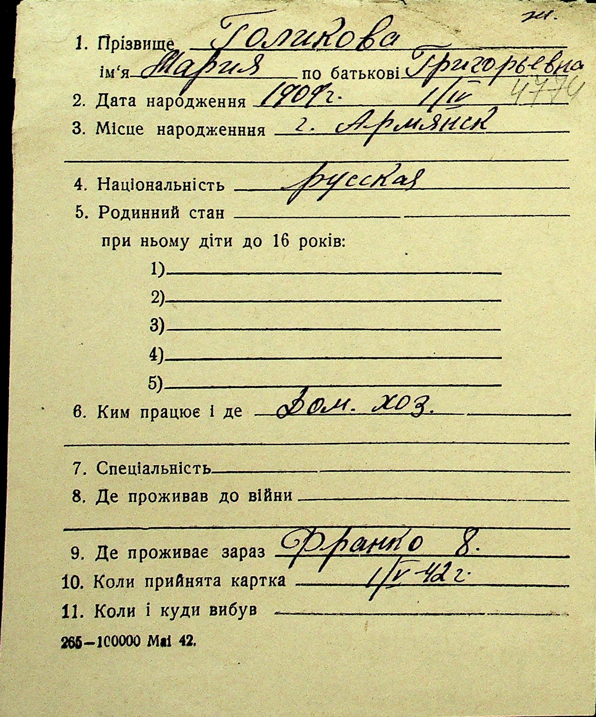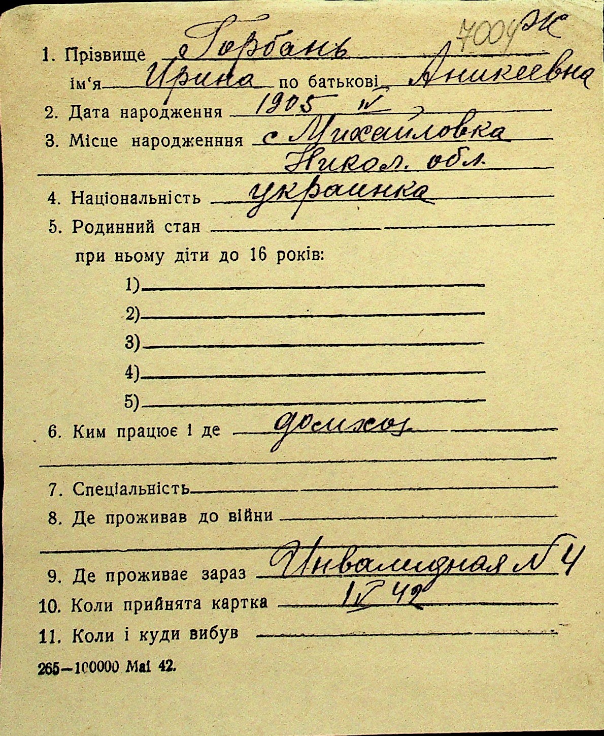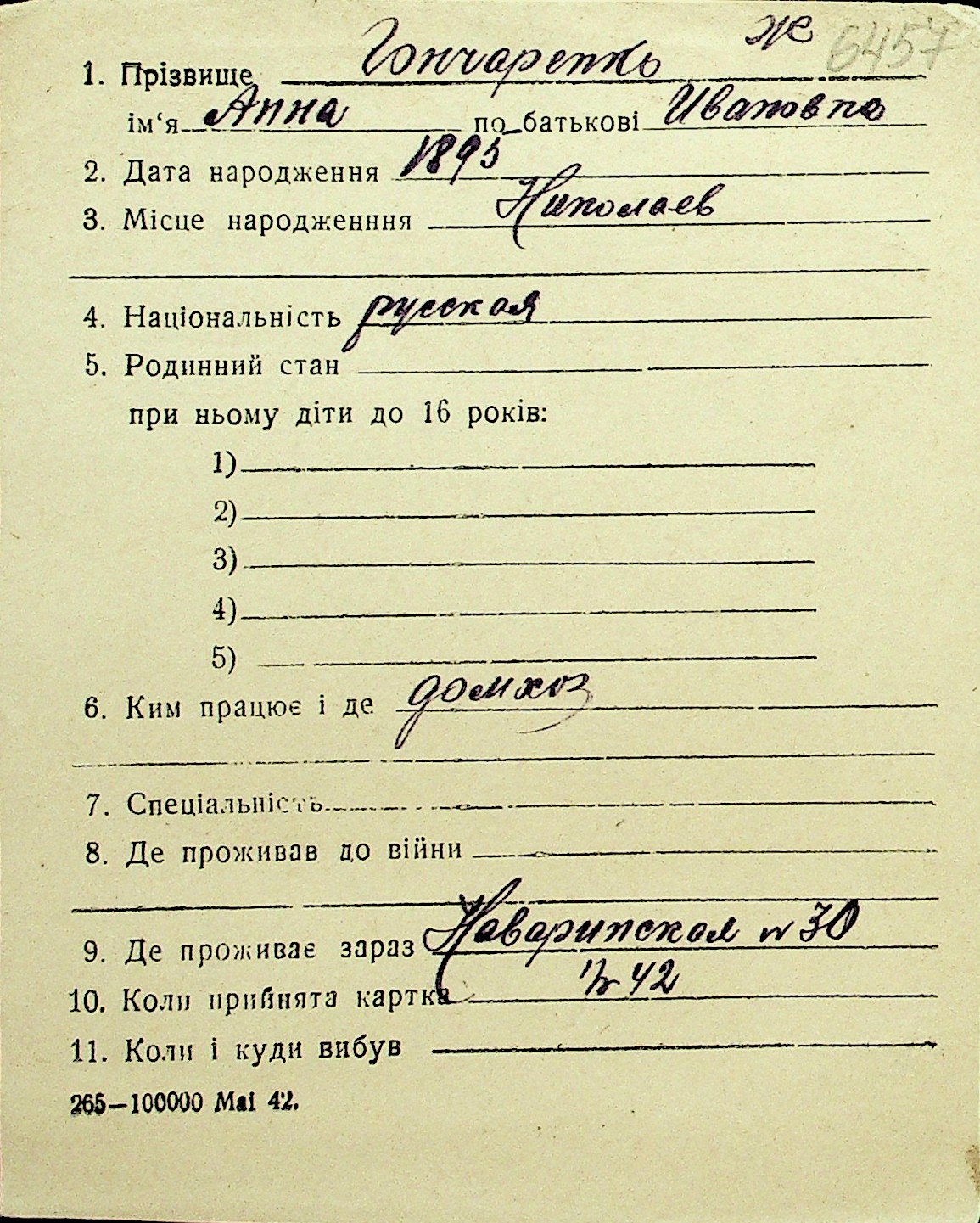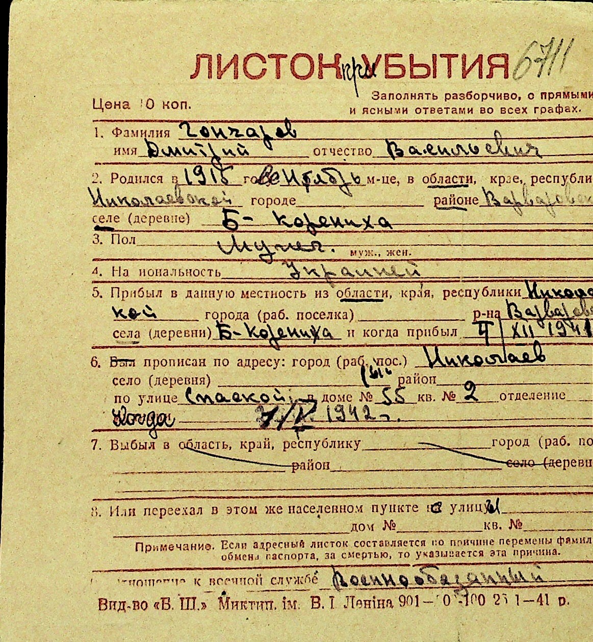 • • Перелік карток до фонду № Н-1016