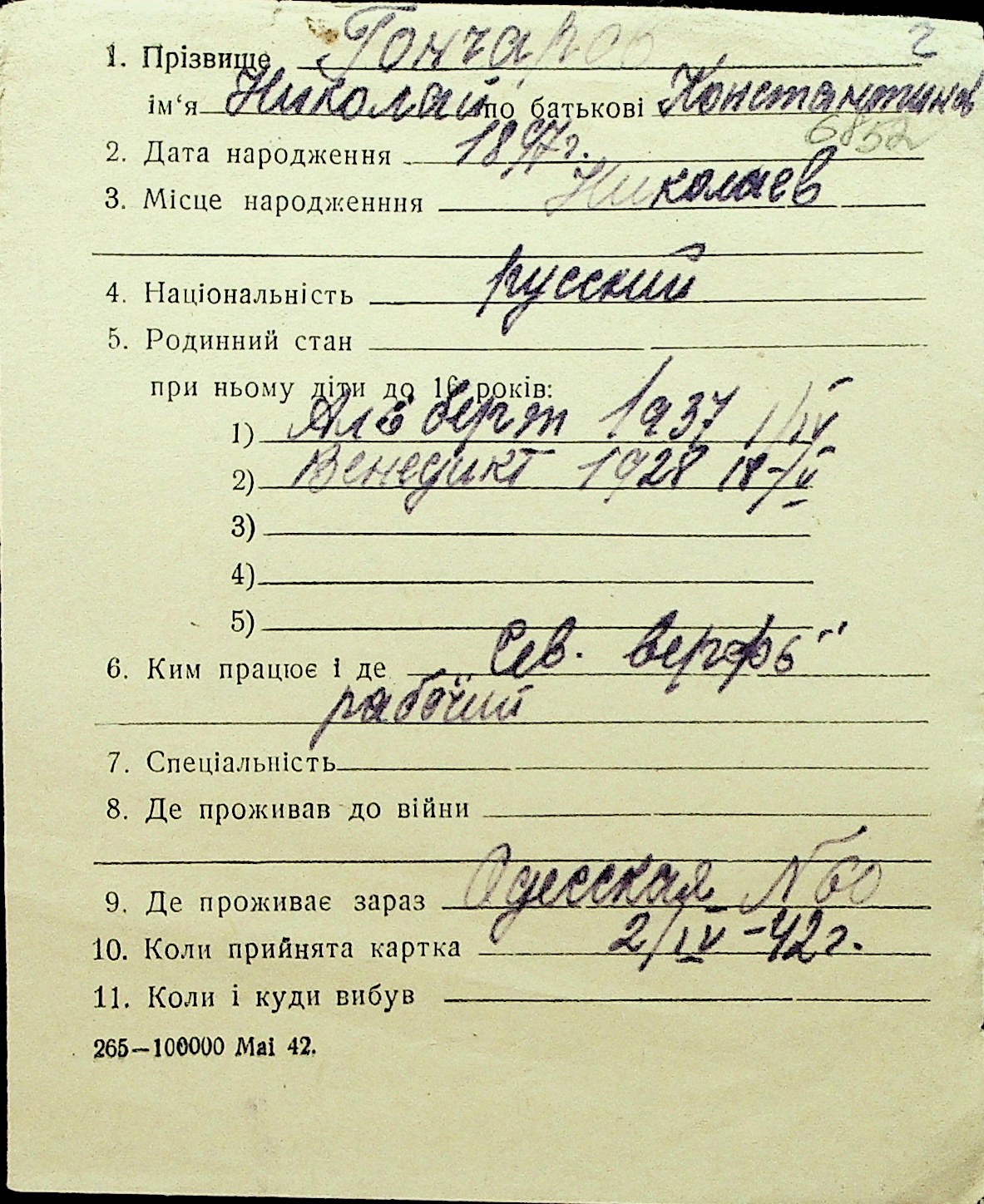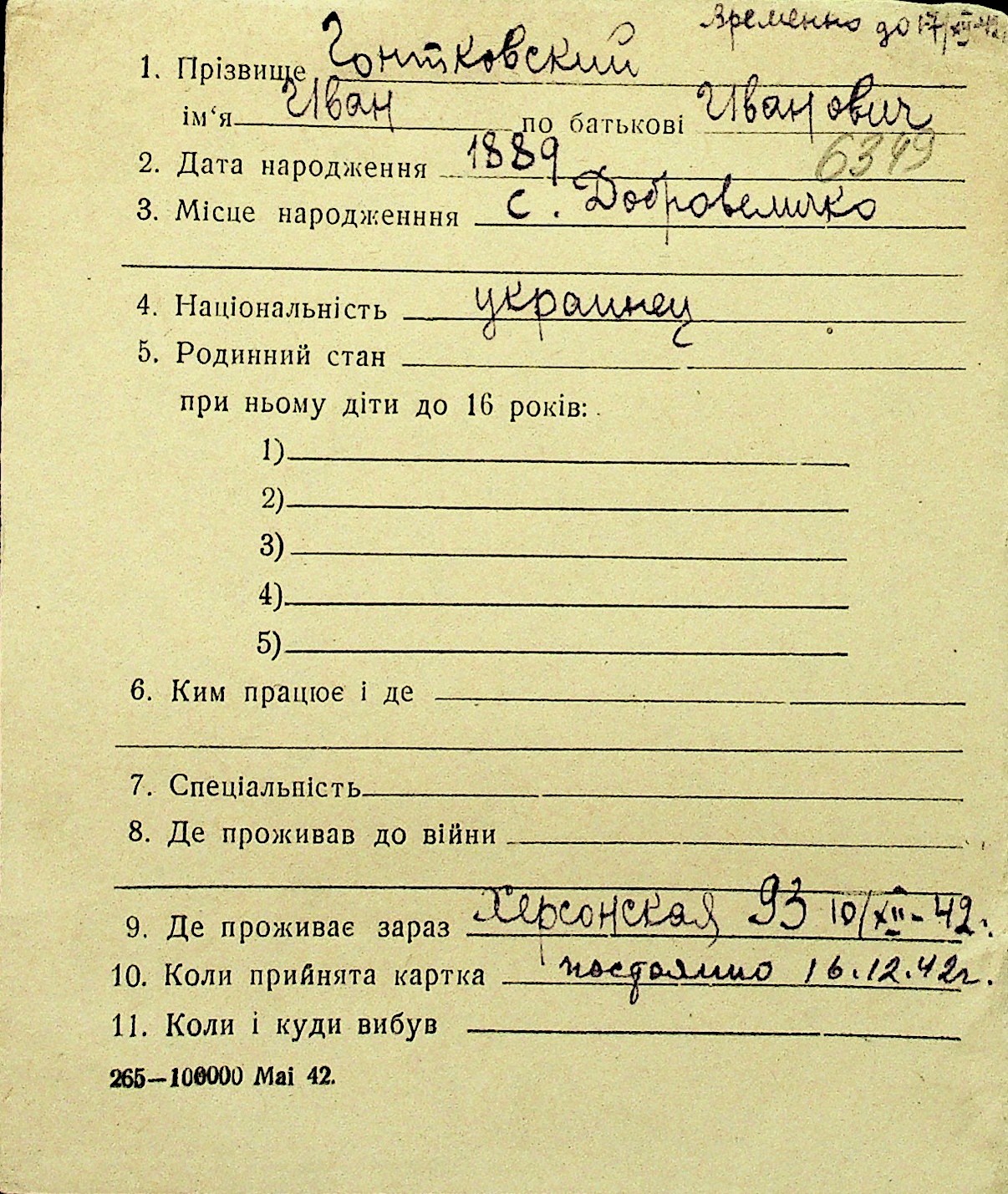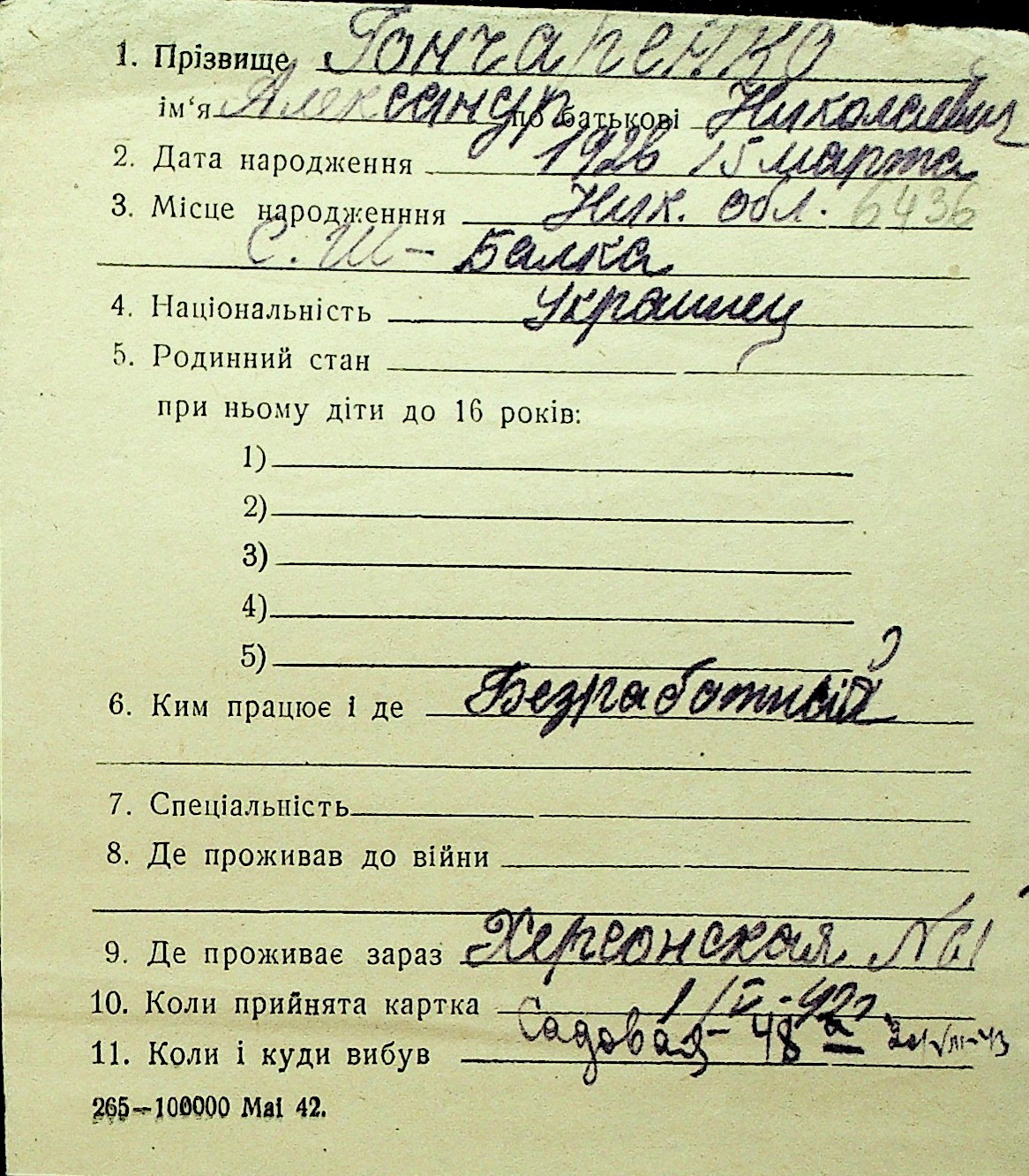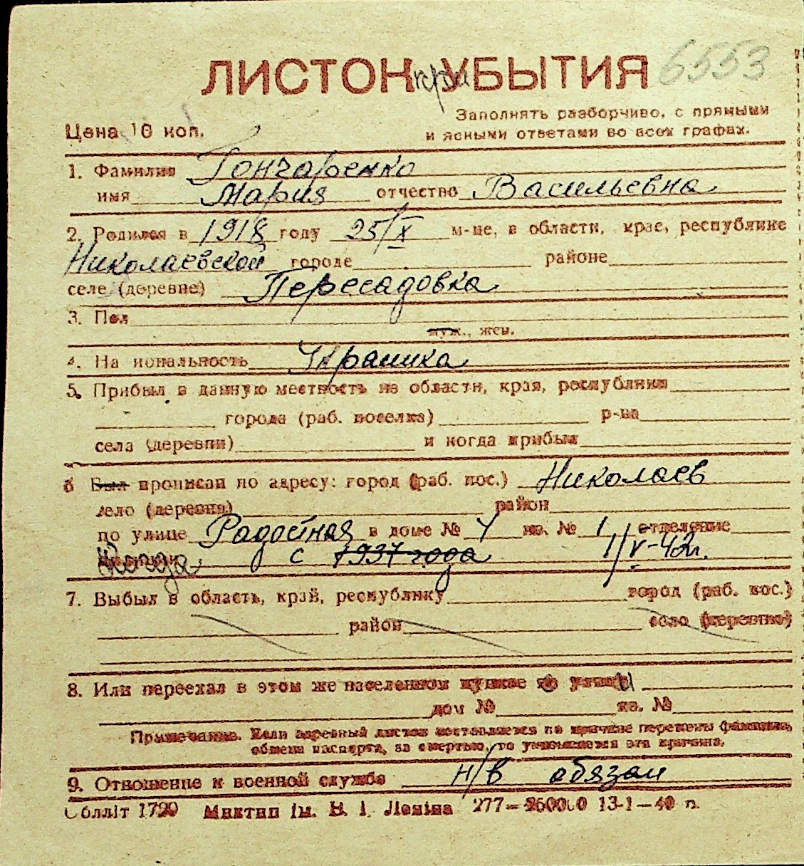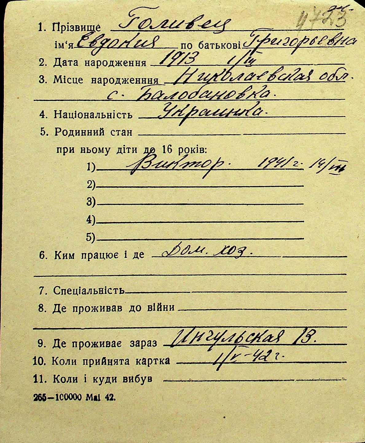 • • Перелік карток до фонду № Н-1016