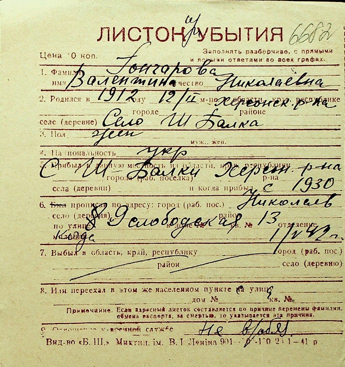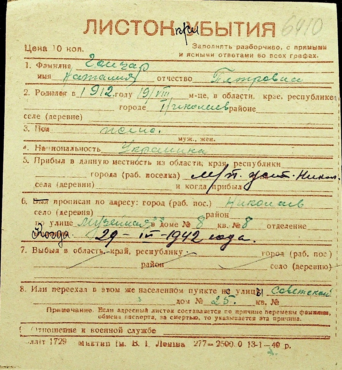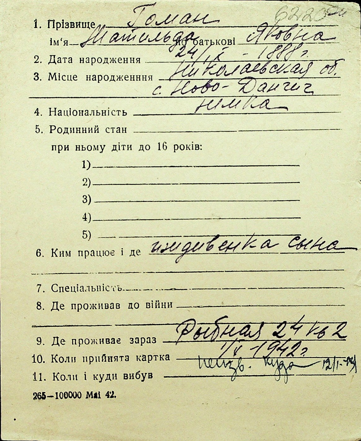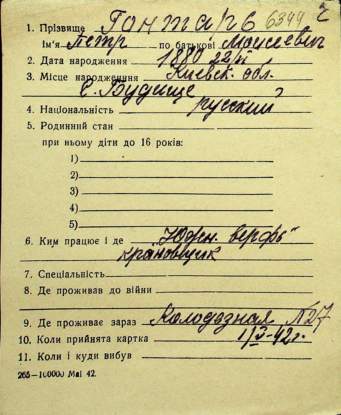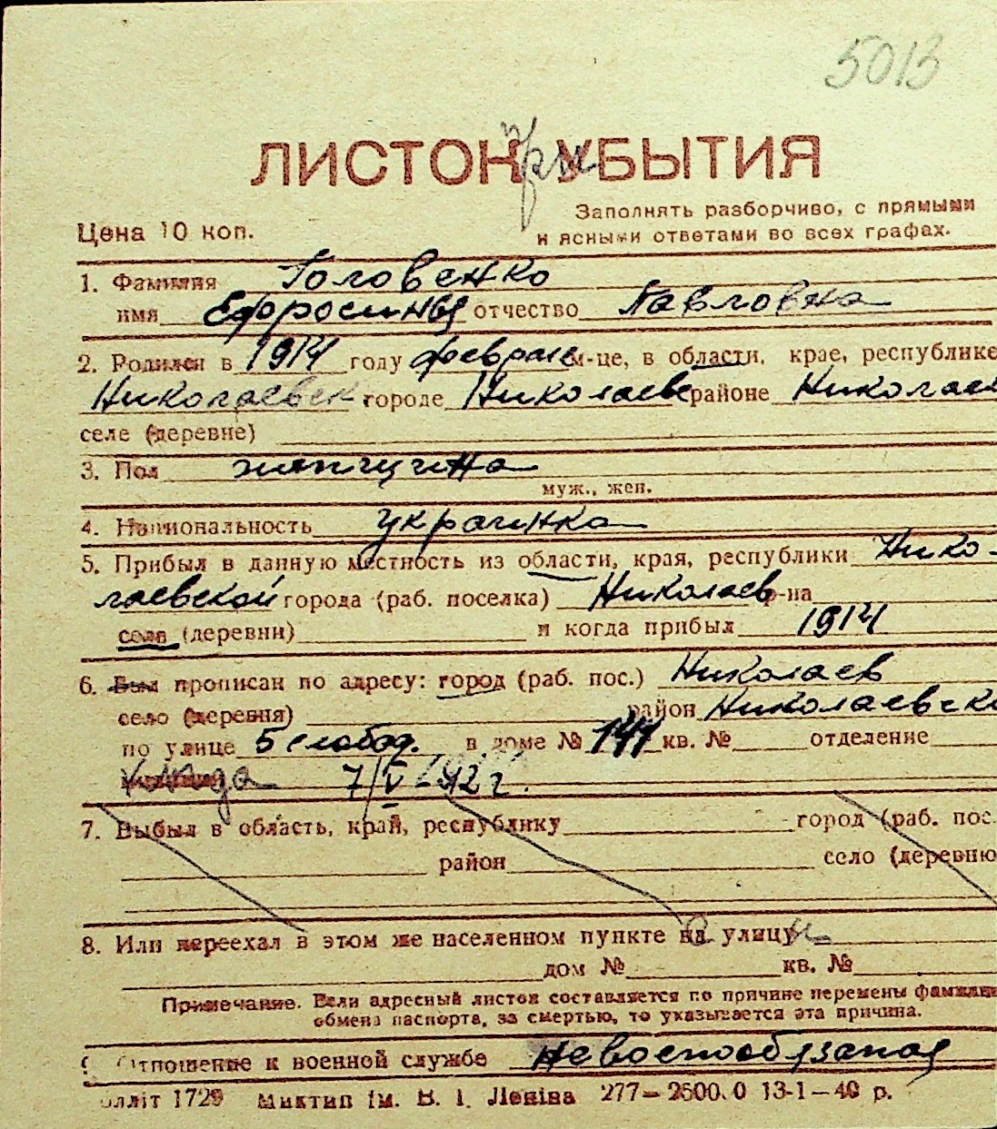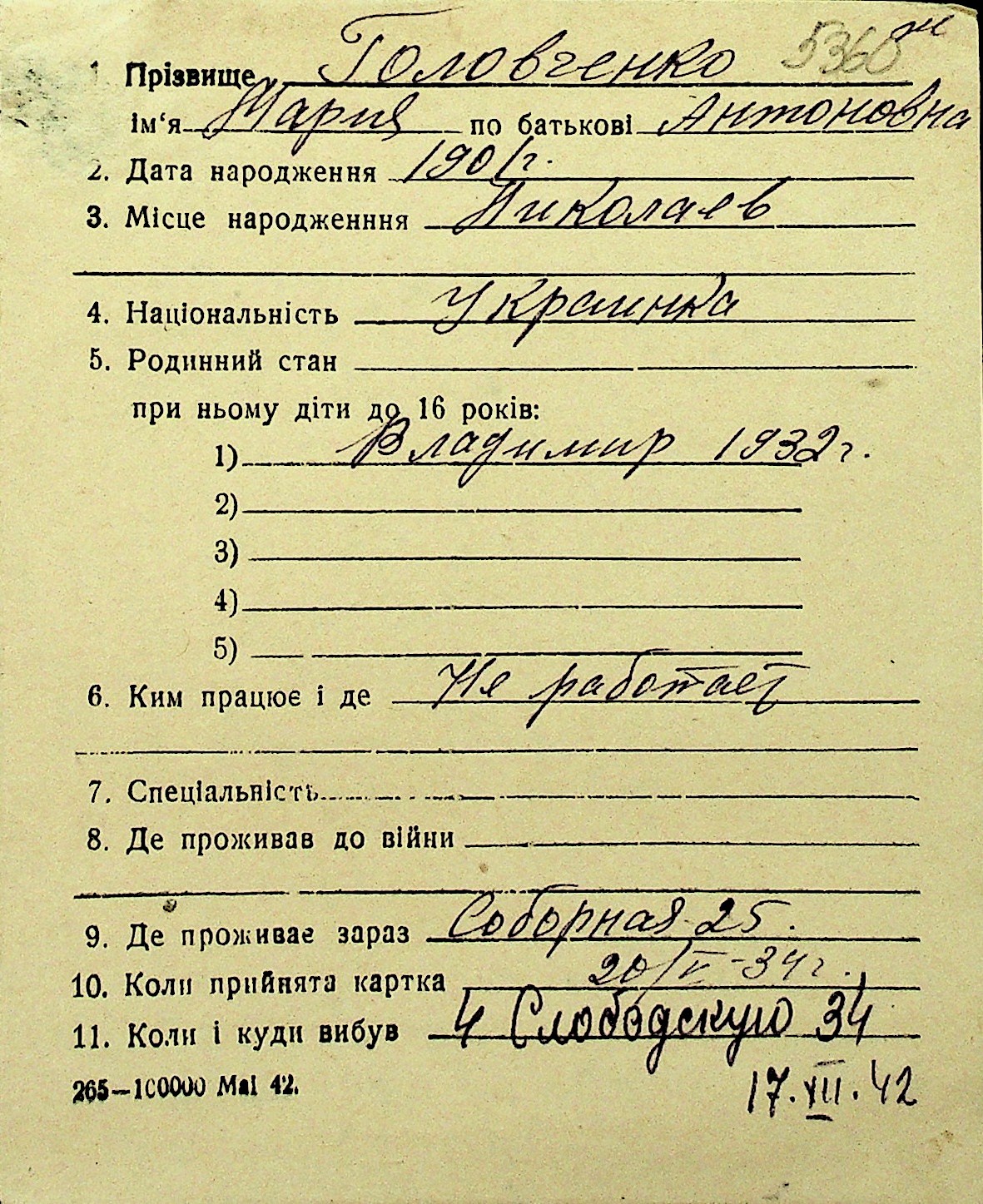 • • Перелік карток до фонду № Н-1016