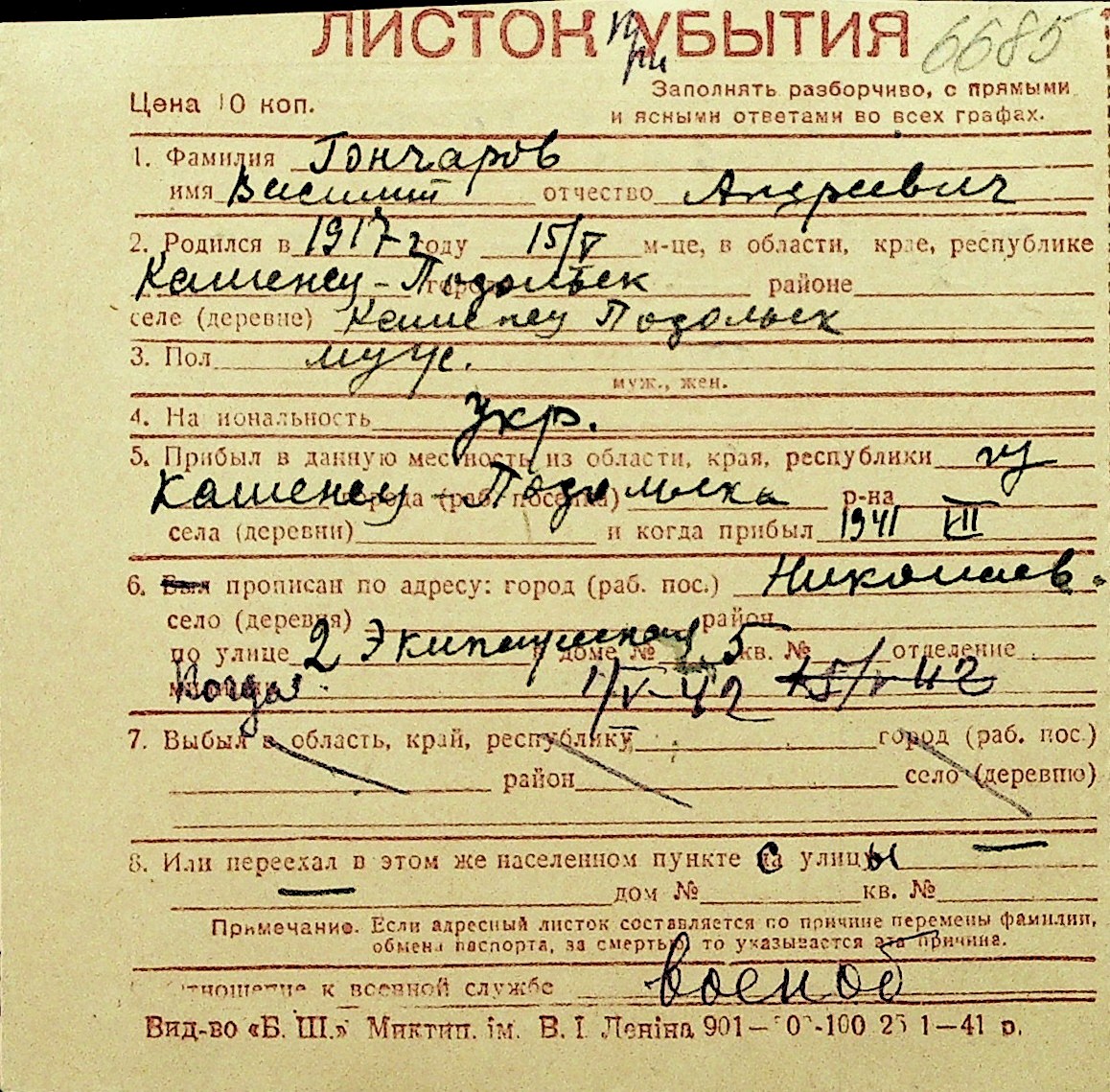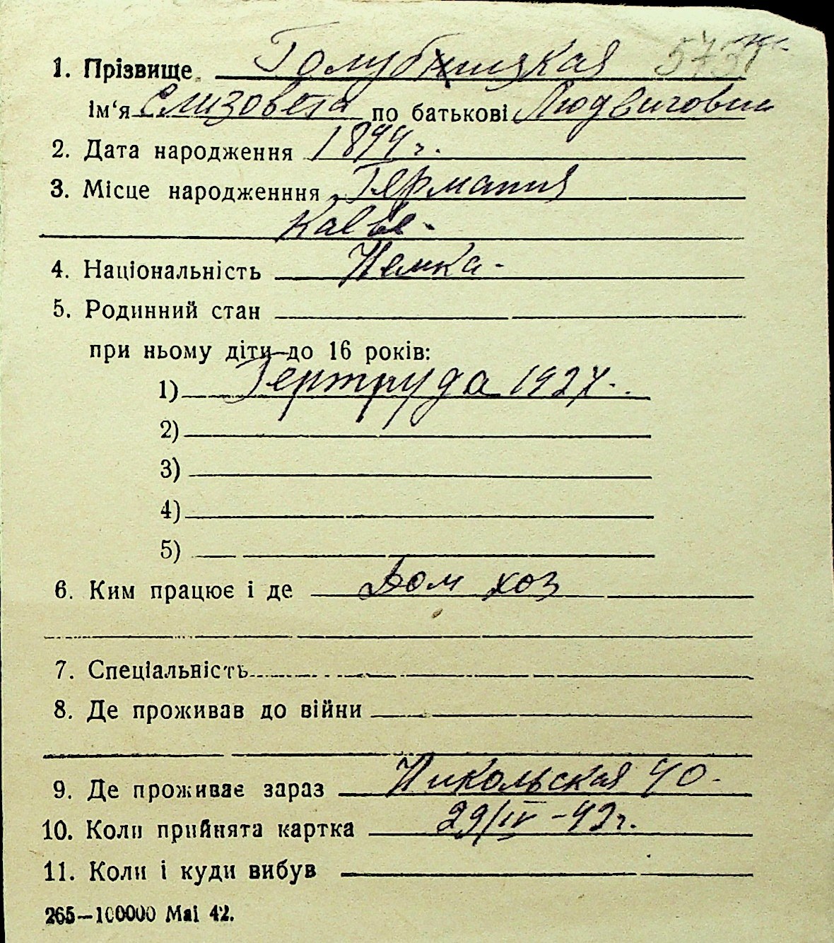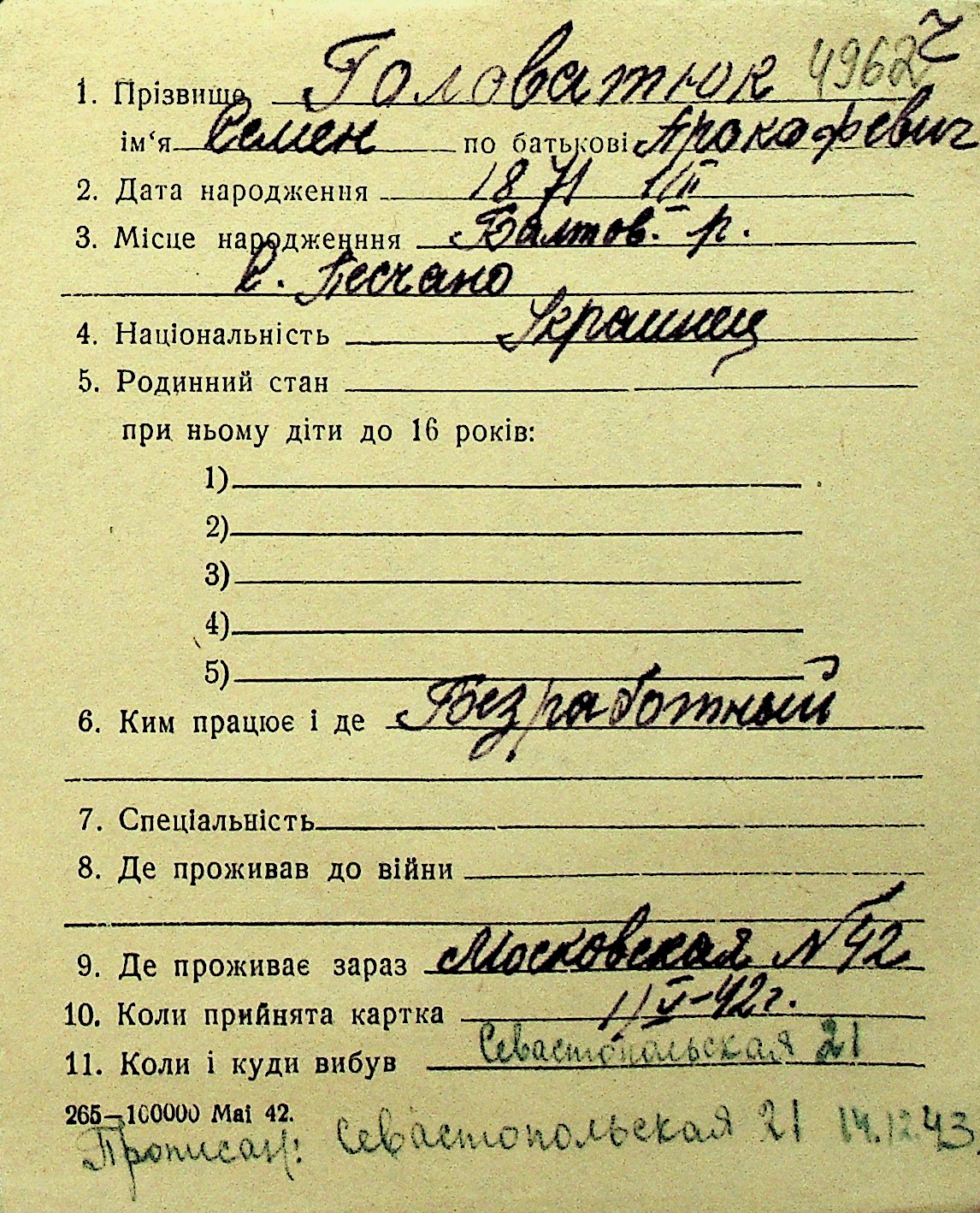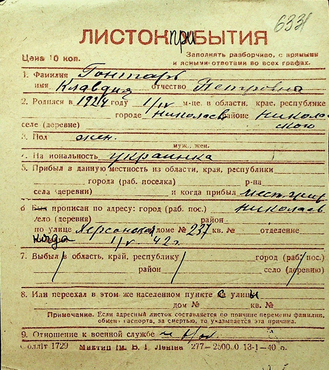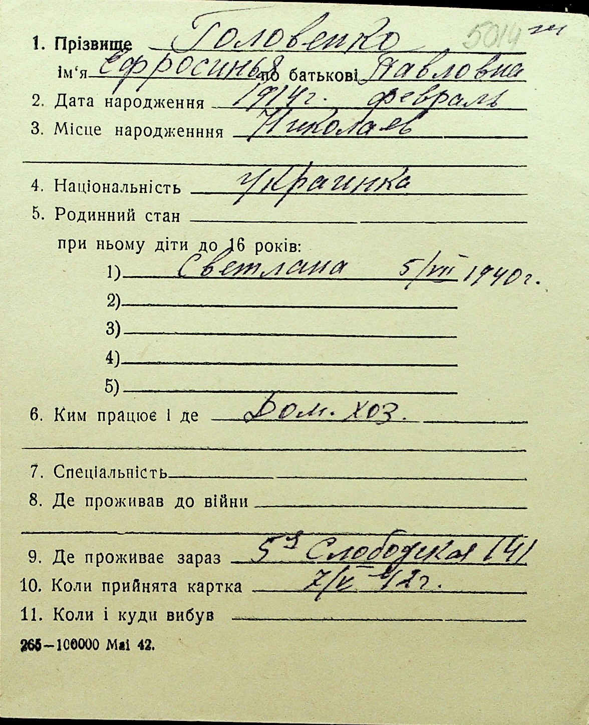 • • Перелік карток до фонду № Н-1016