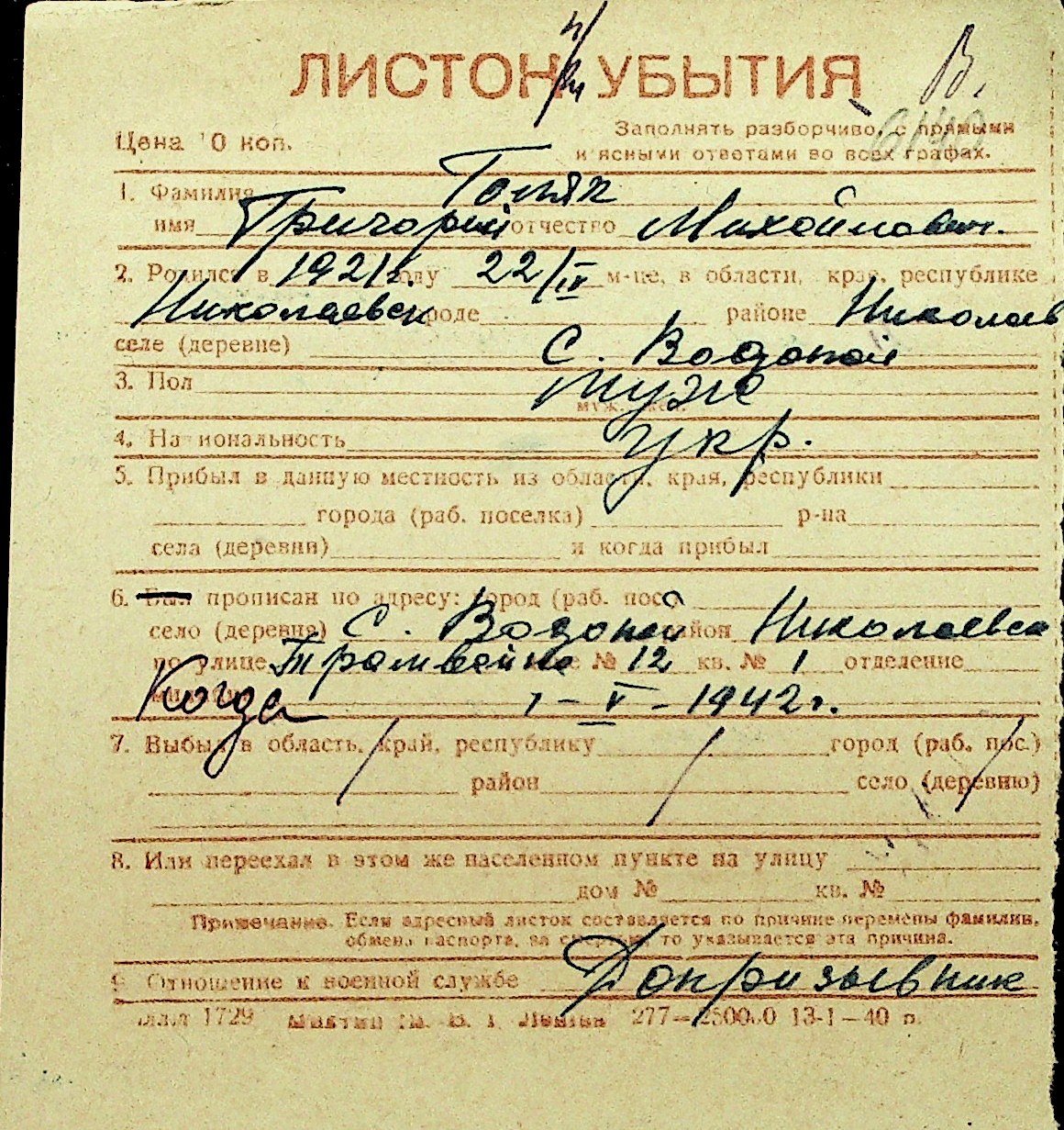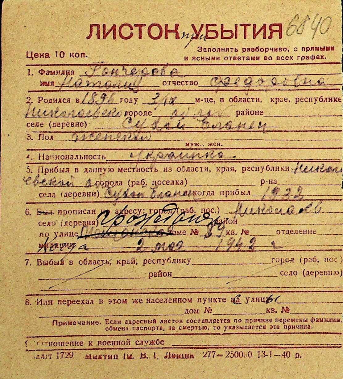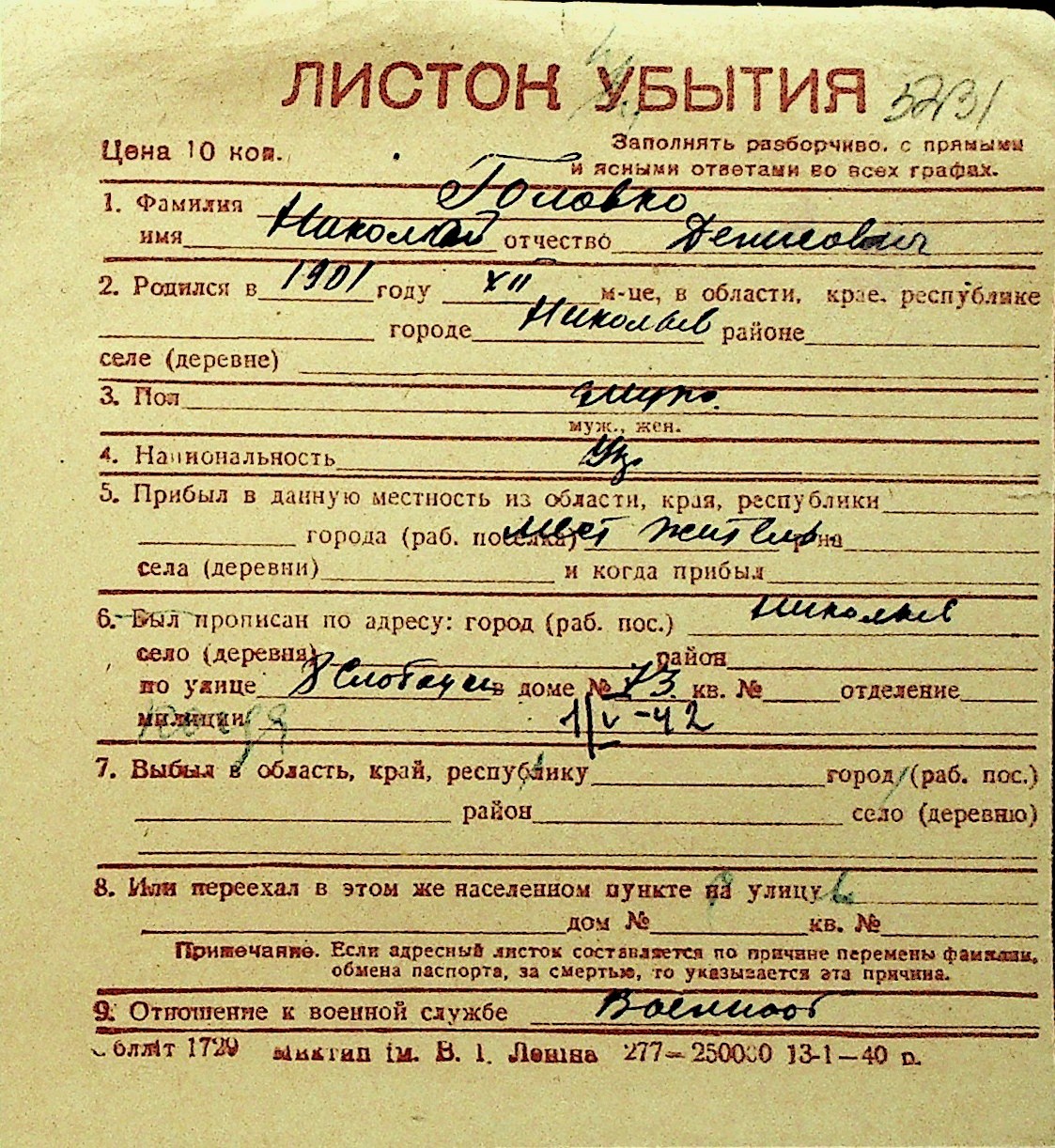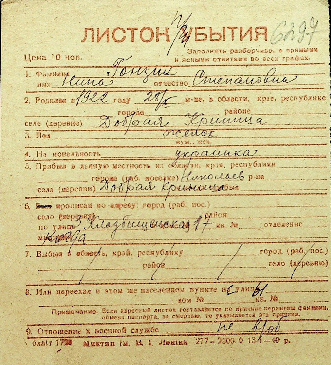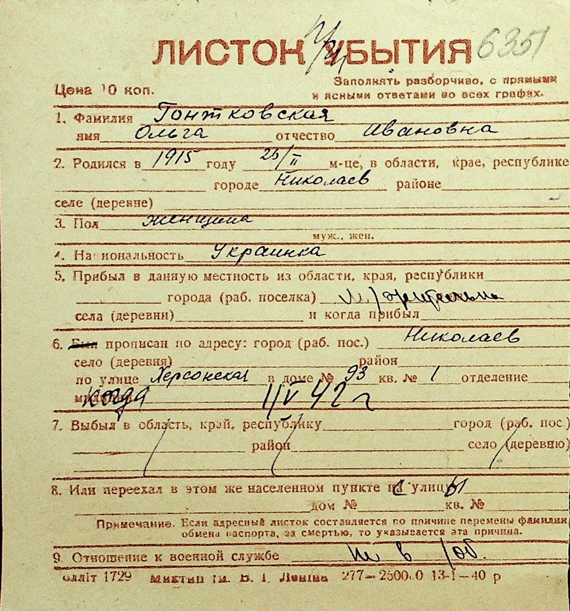 • • Перелік карток до фонду № Н-1016
