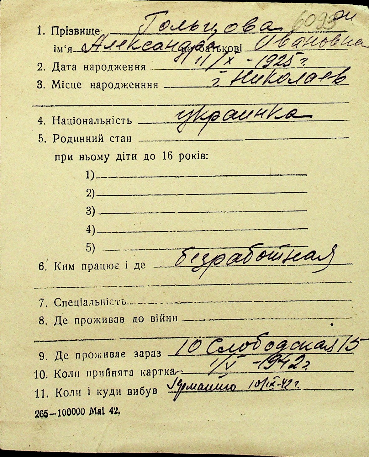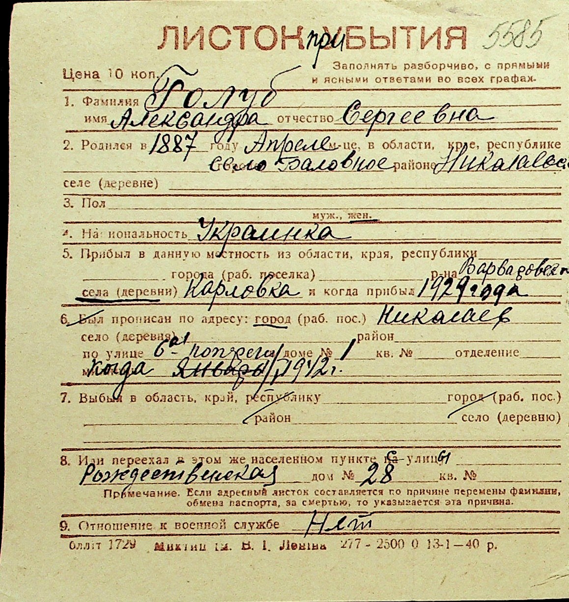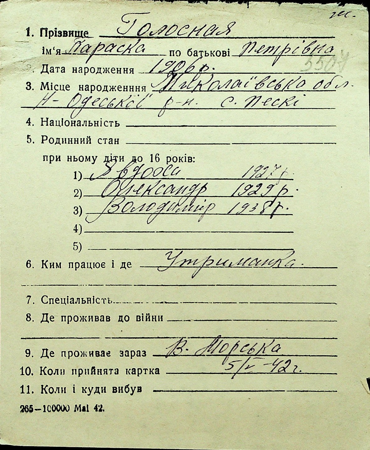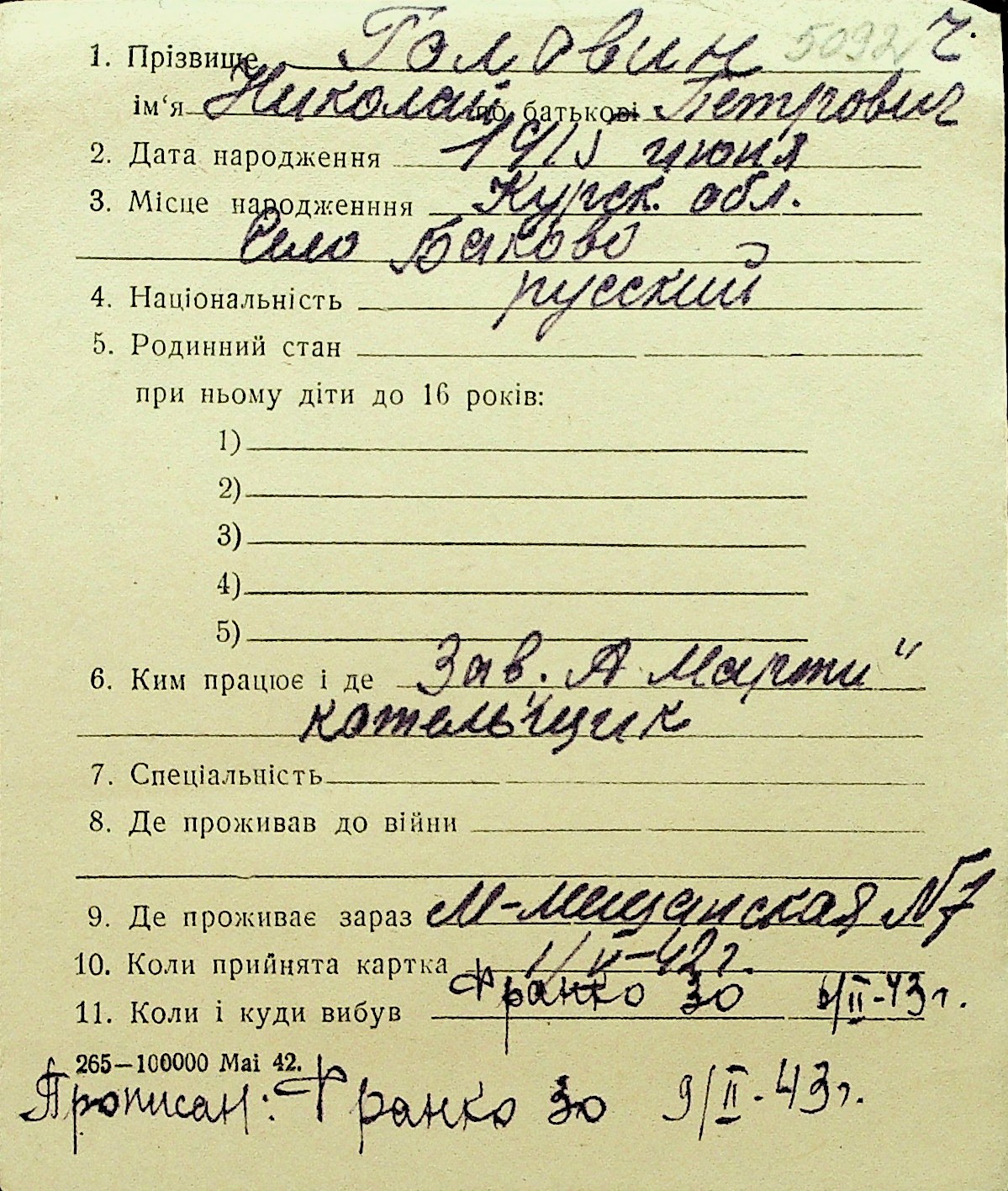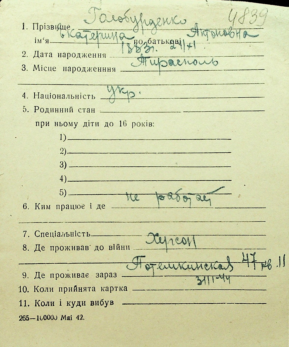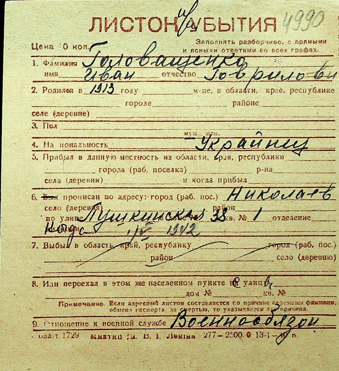 • • Перелік карток до фонду № Н-1016