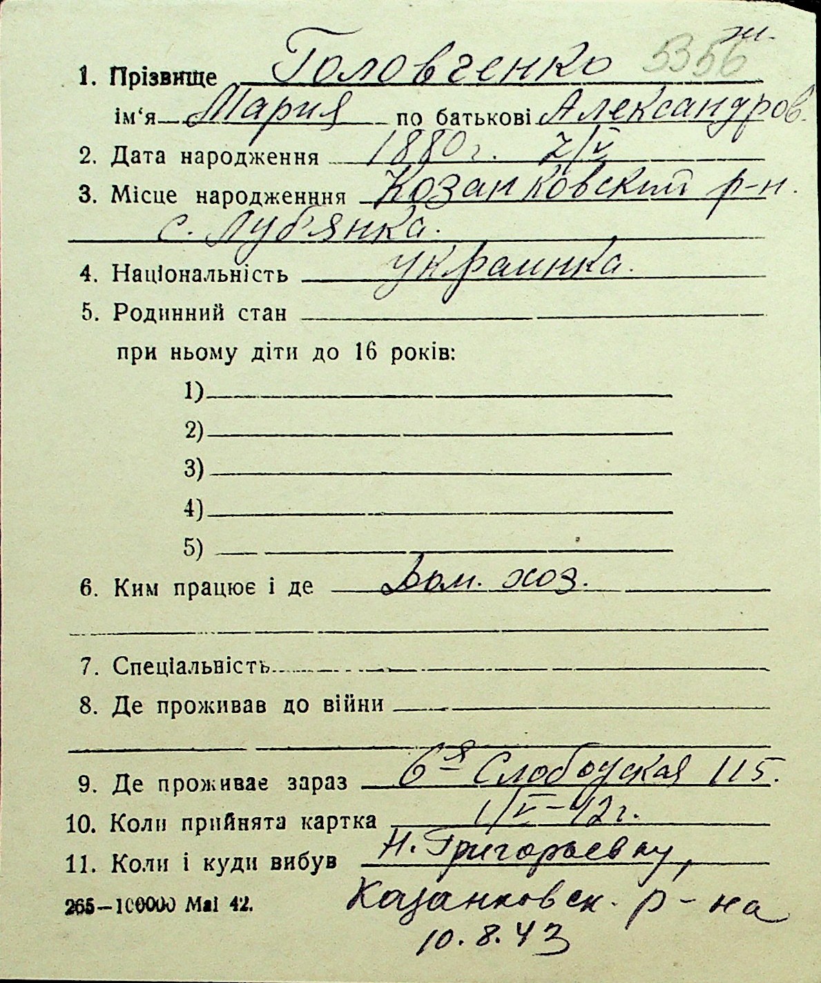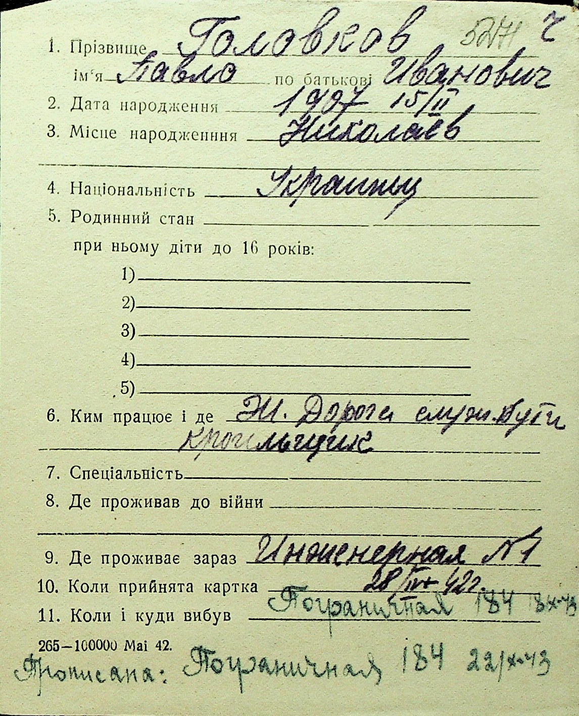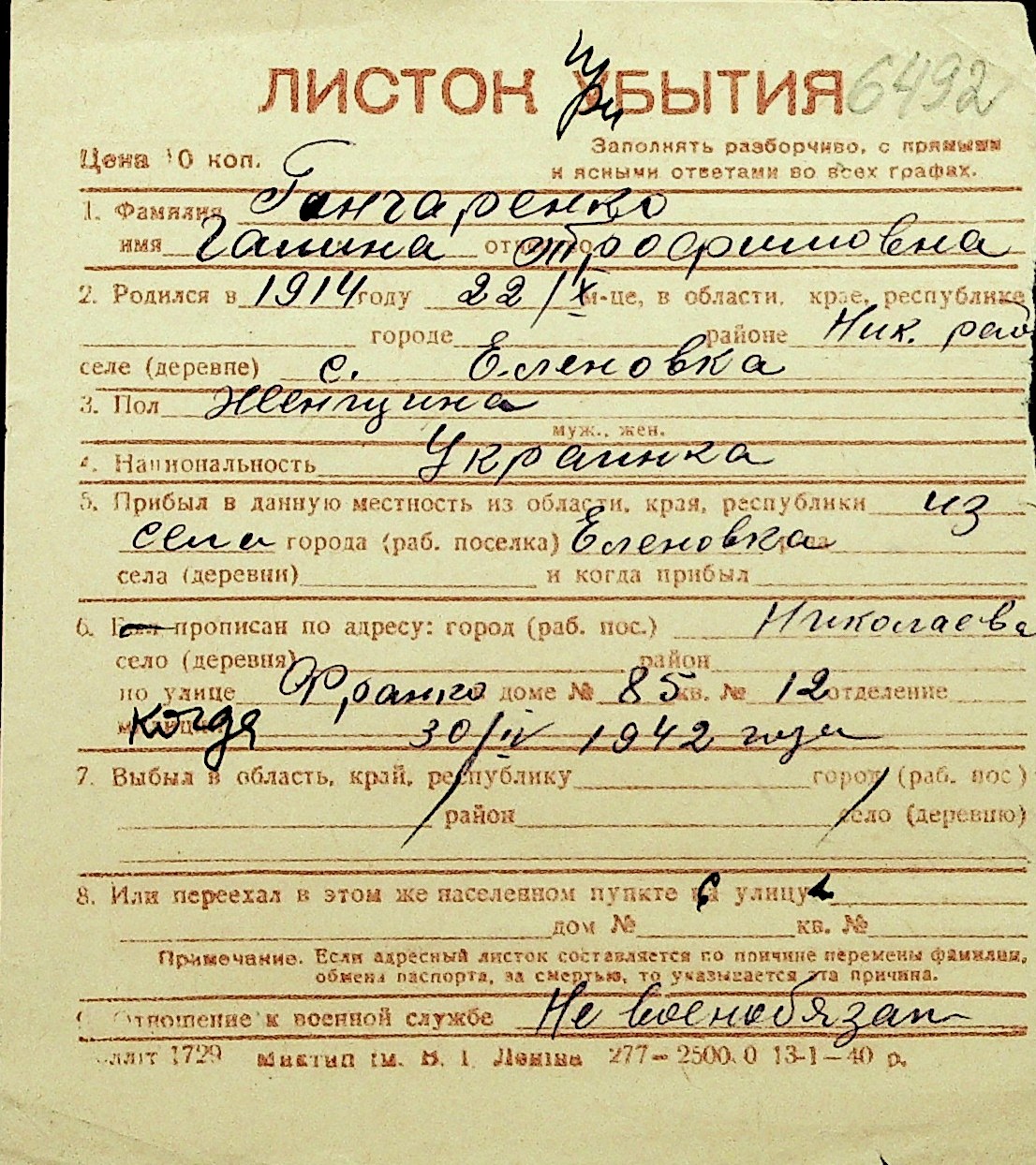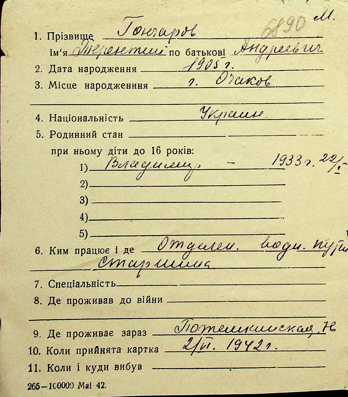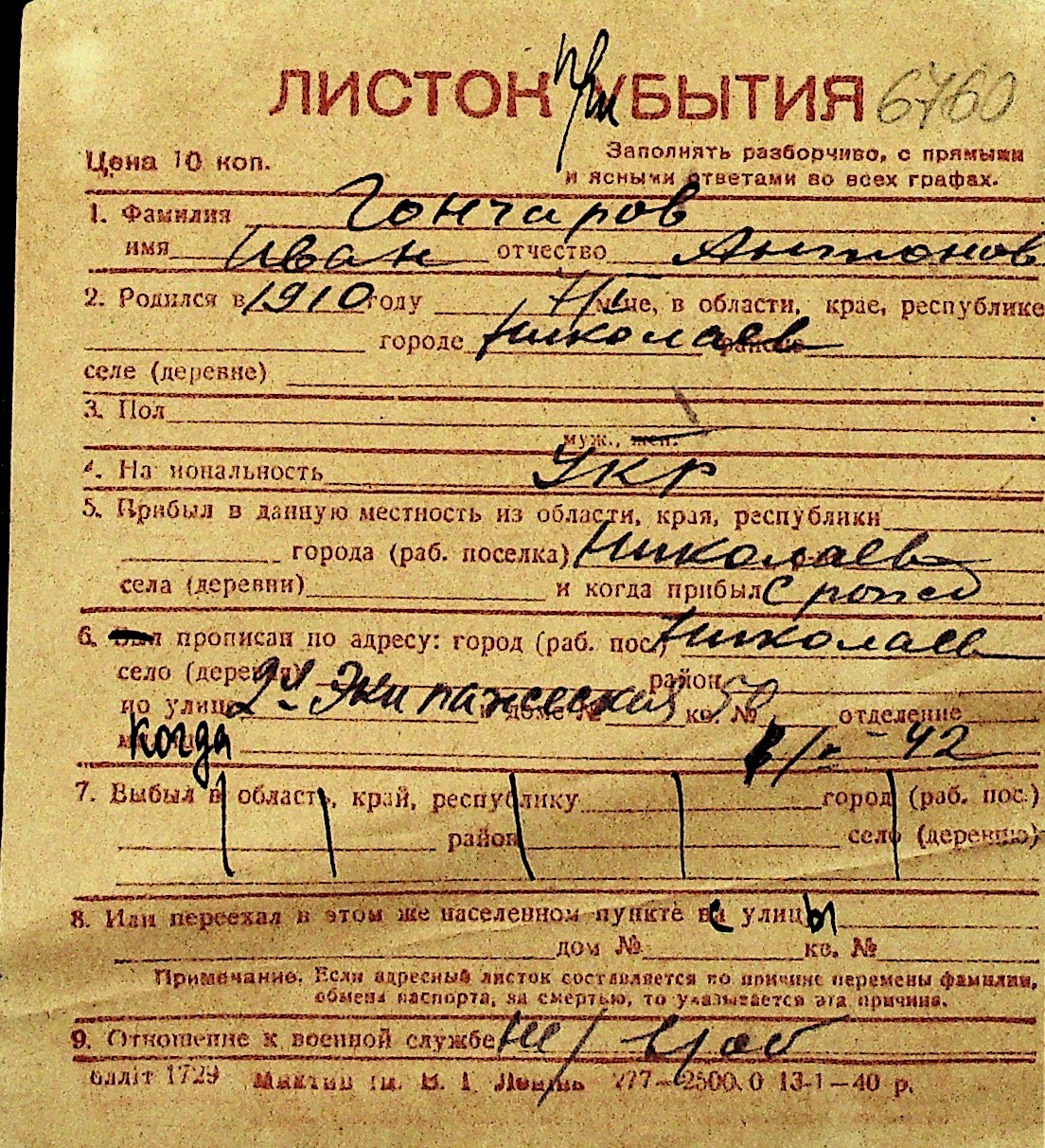 • • Перелік карток до фонду № Н-1016