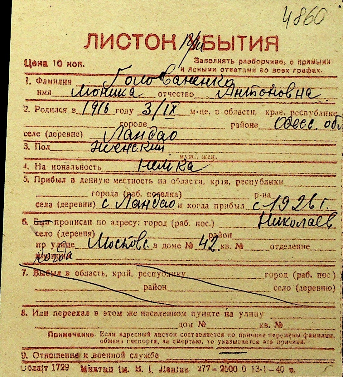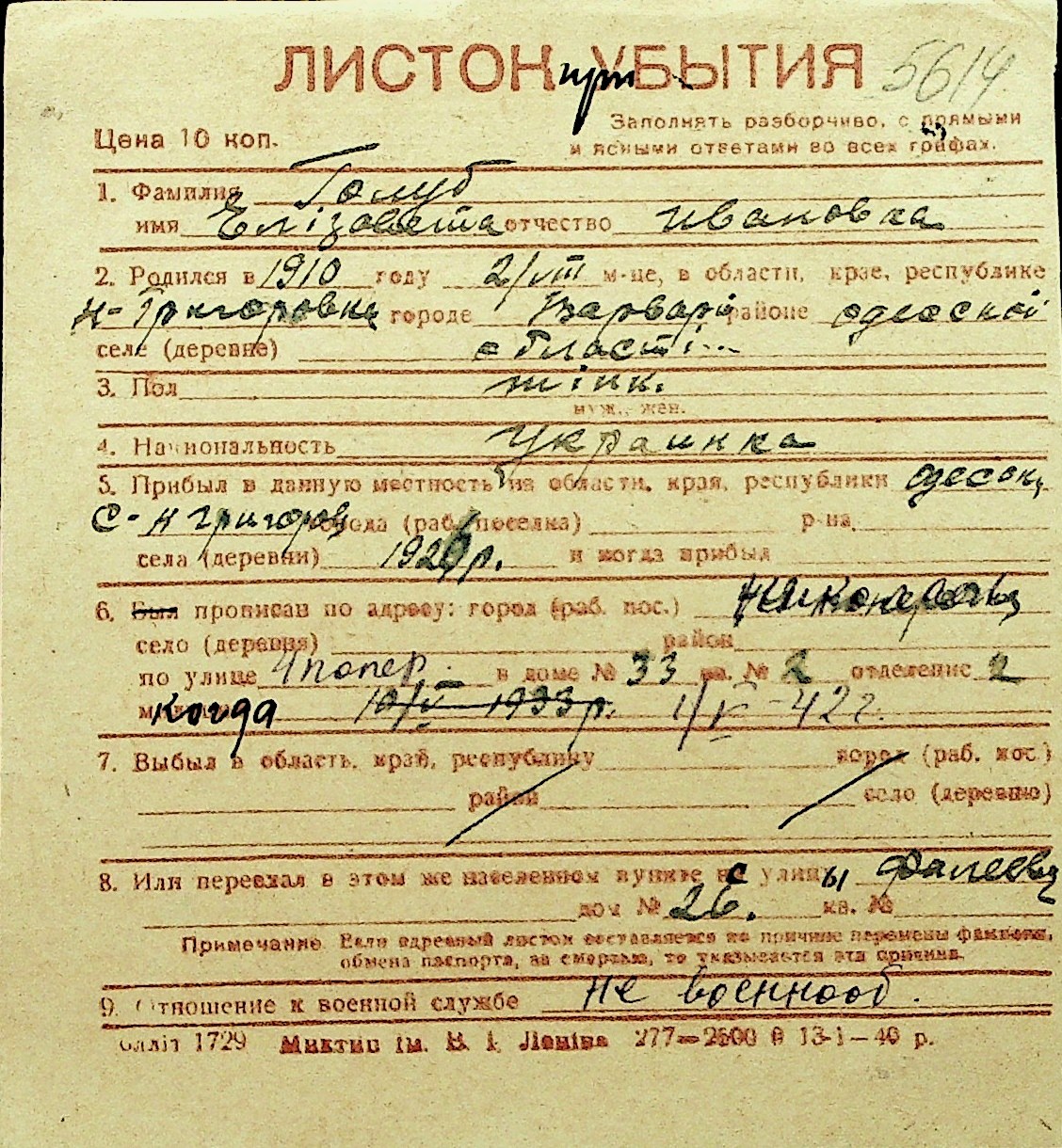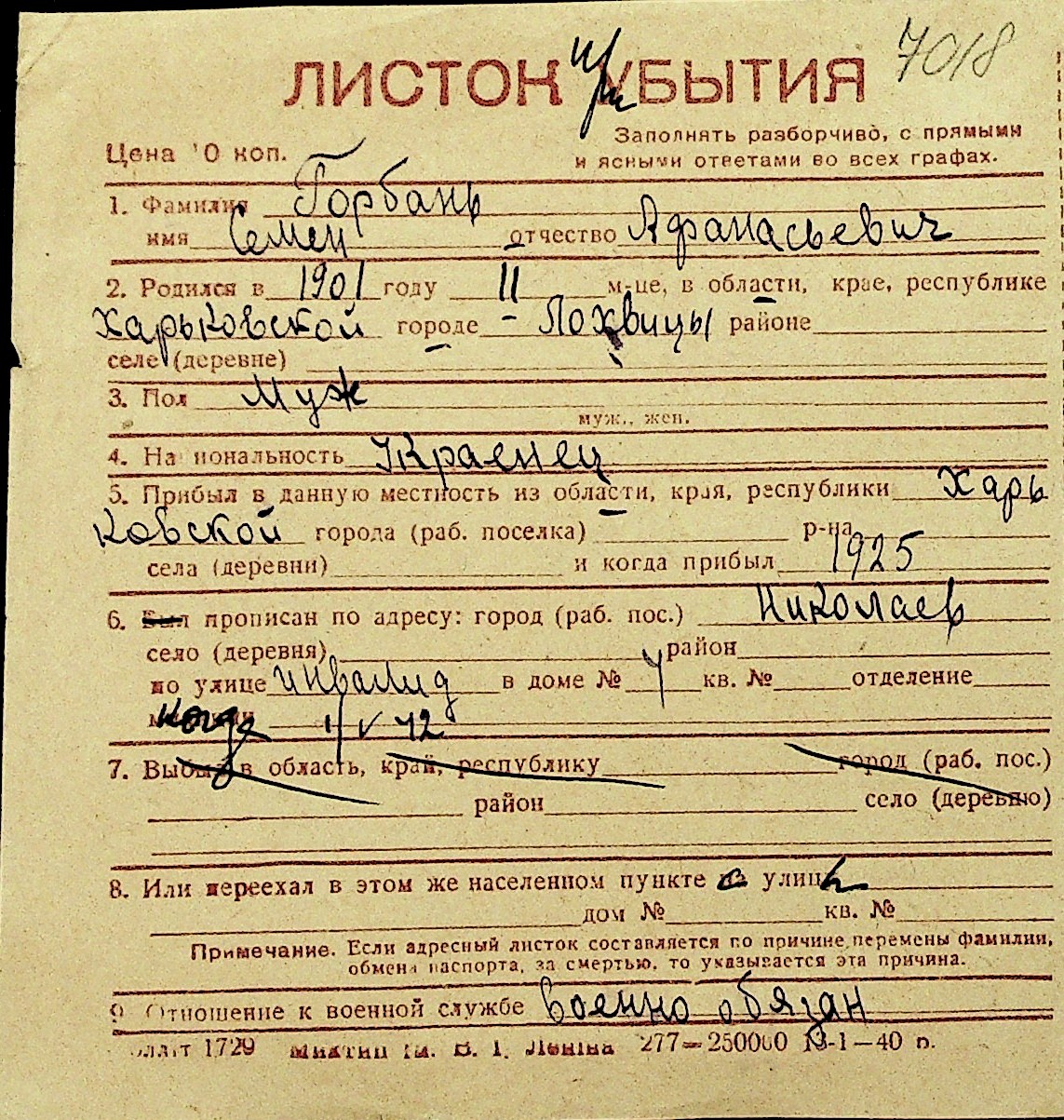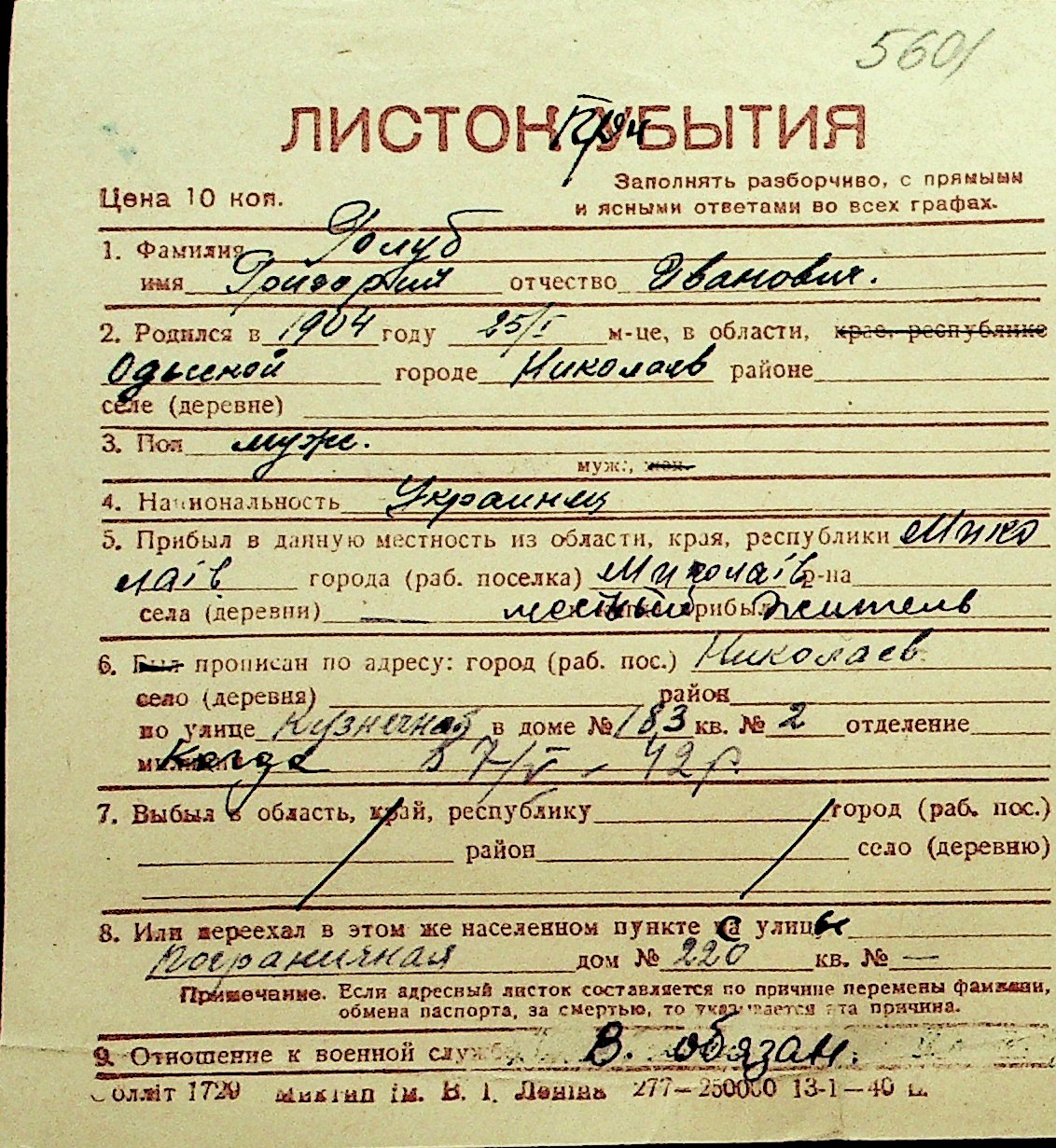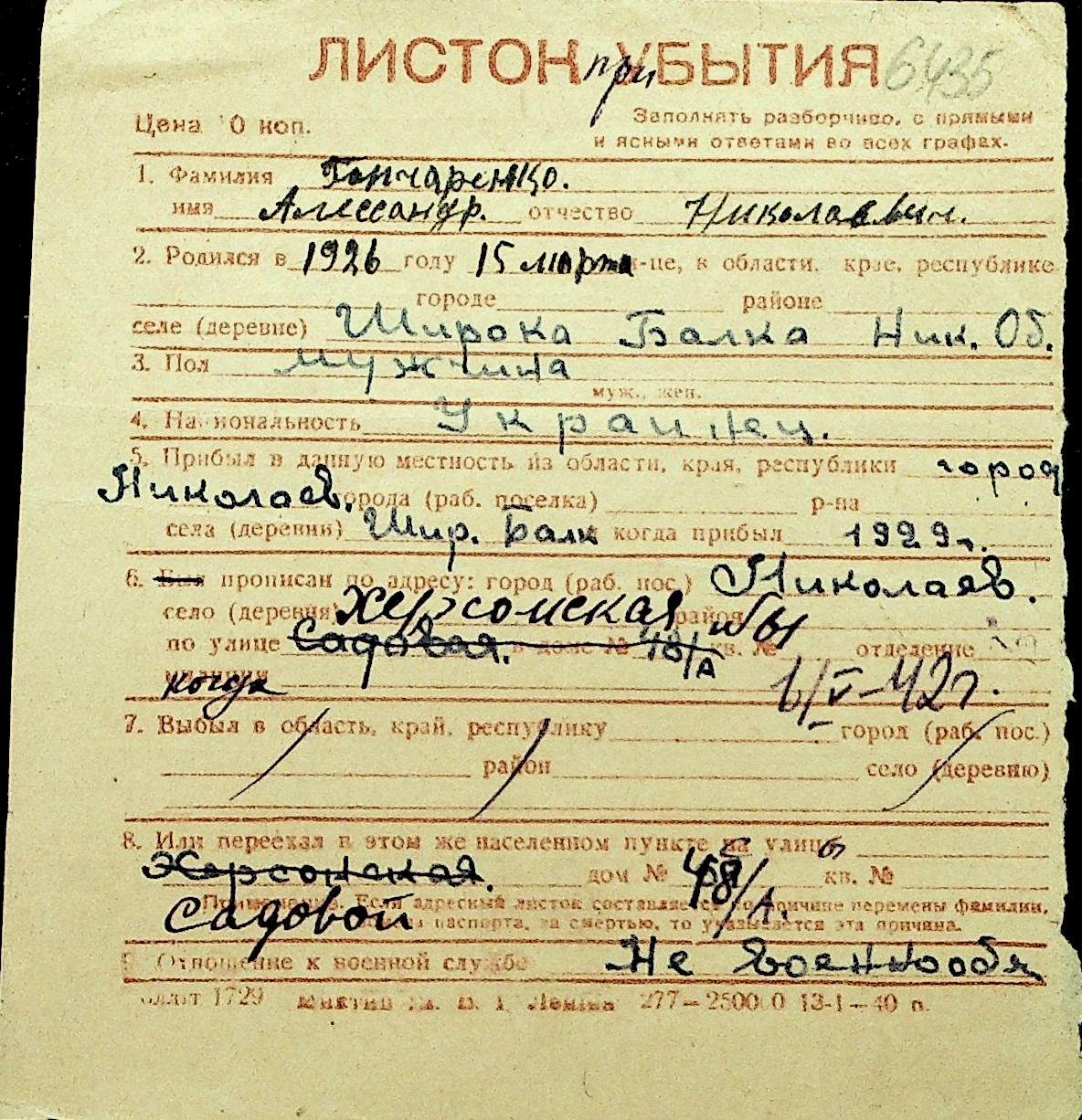 • • Перелік карток до фонду № Н-1016