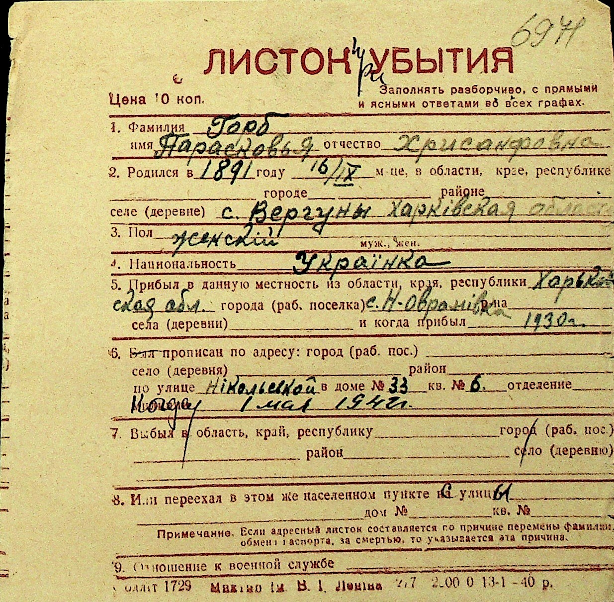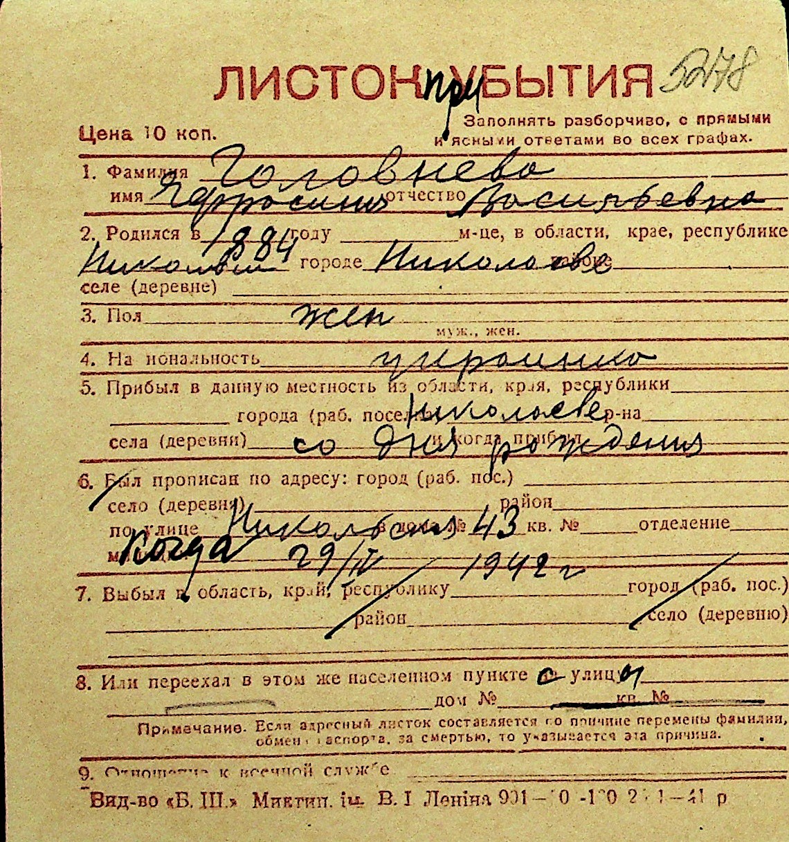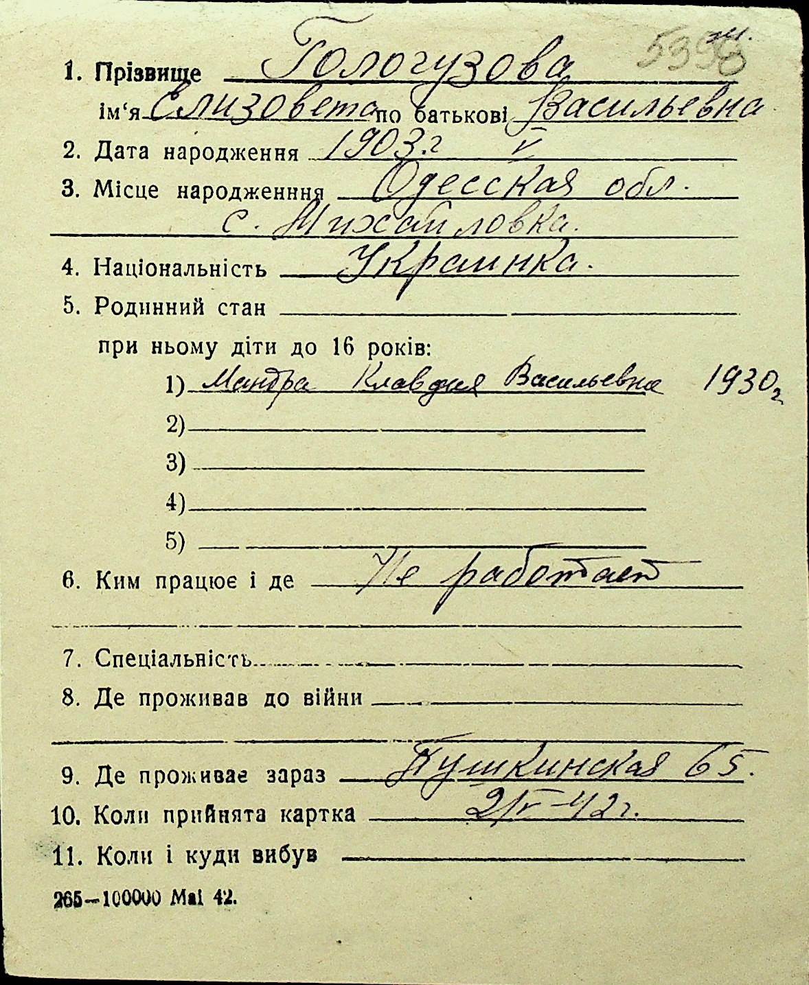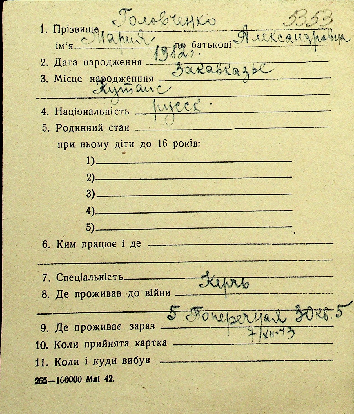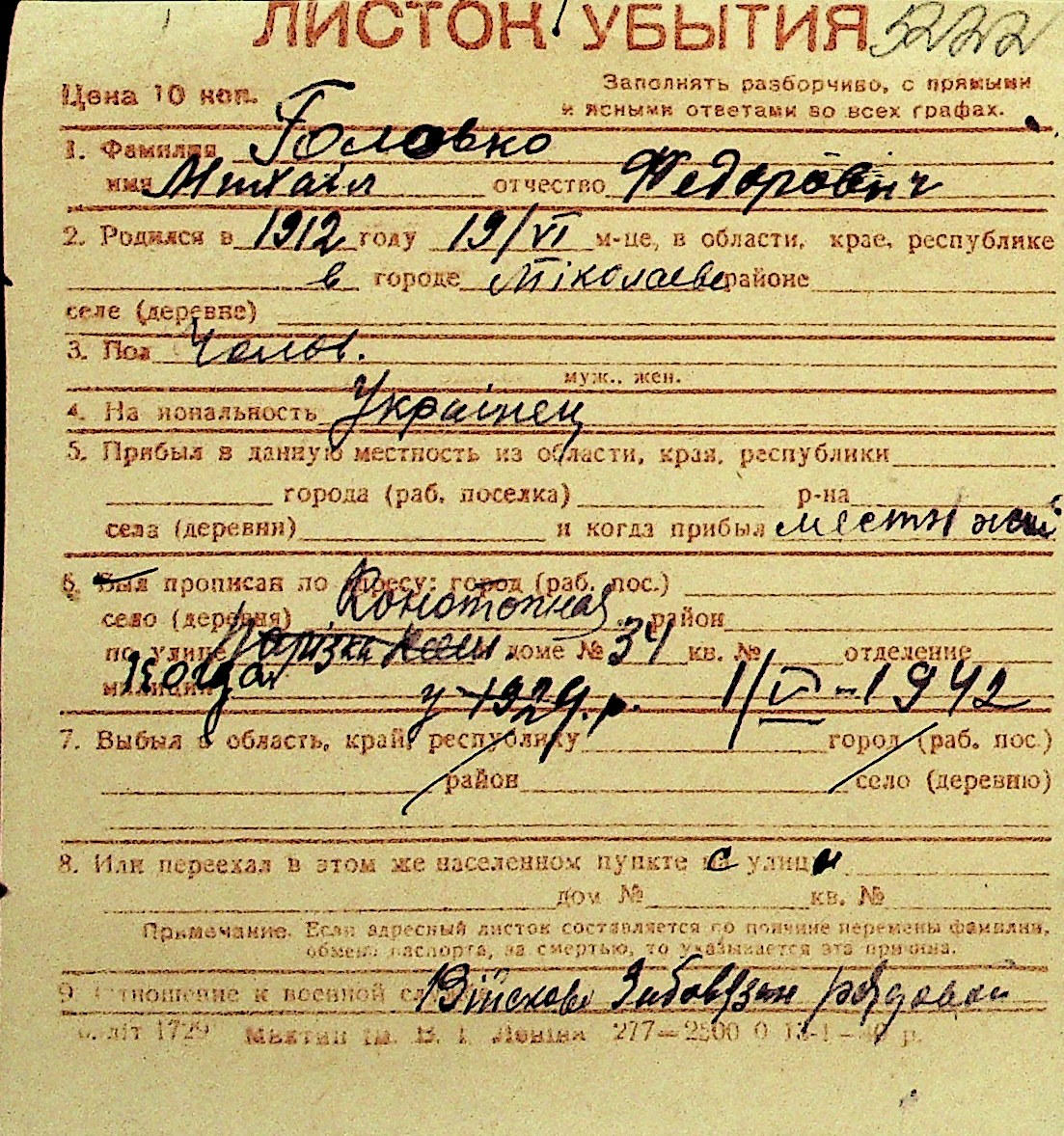 • • Перелік карток до фонду № Н-1016
