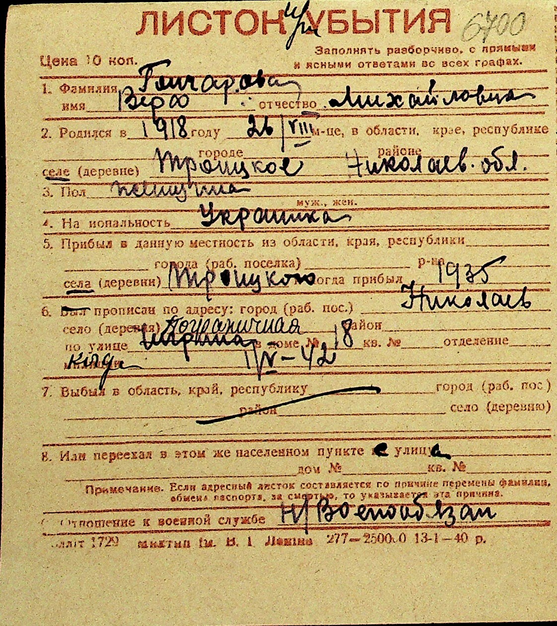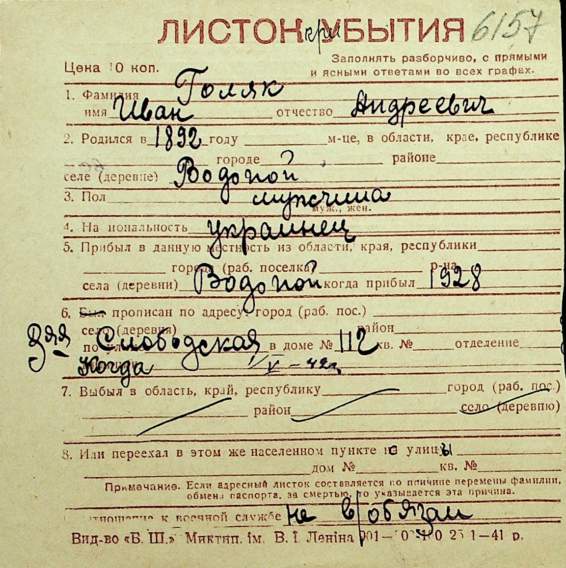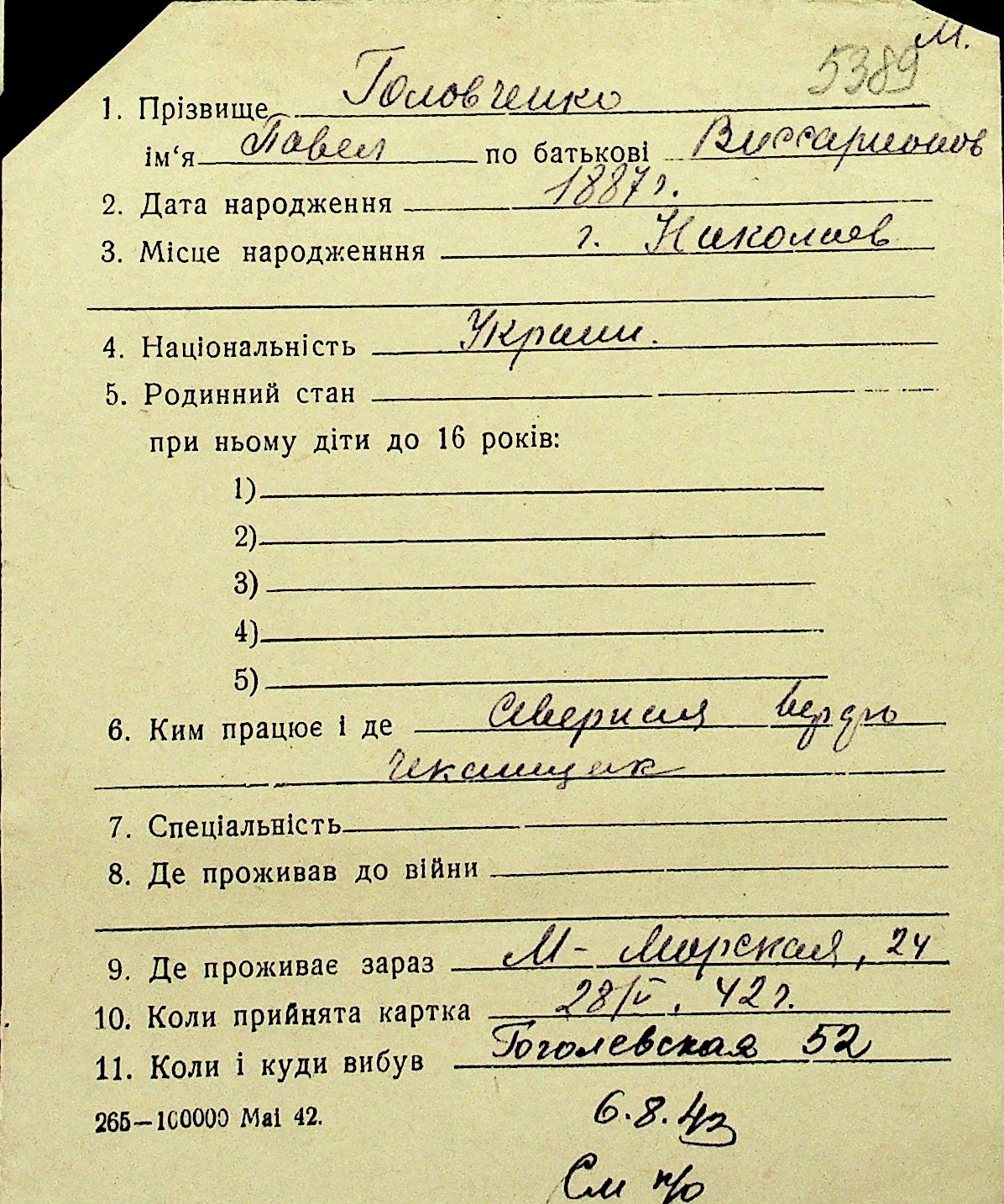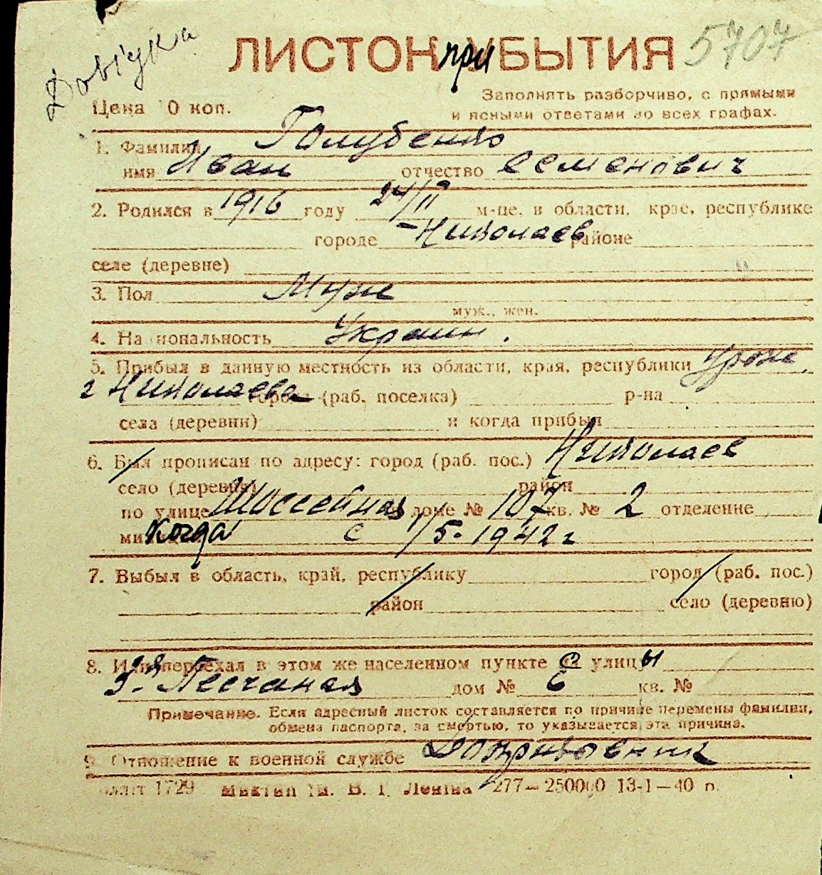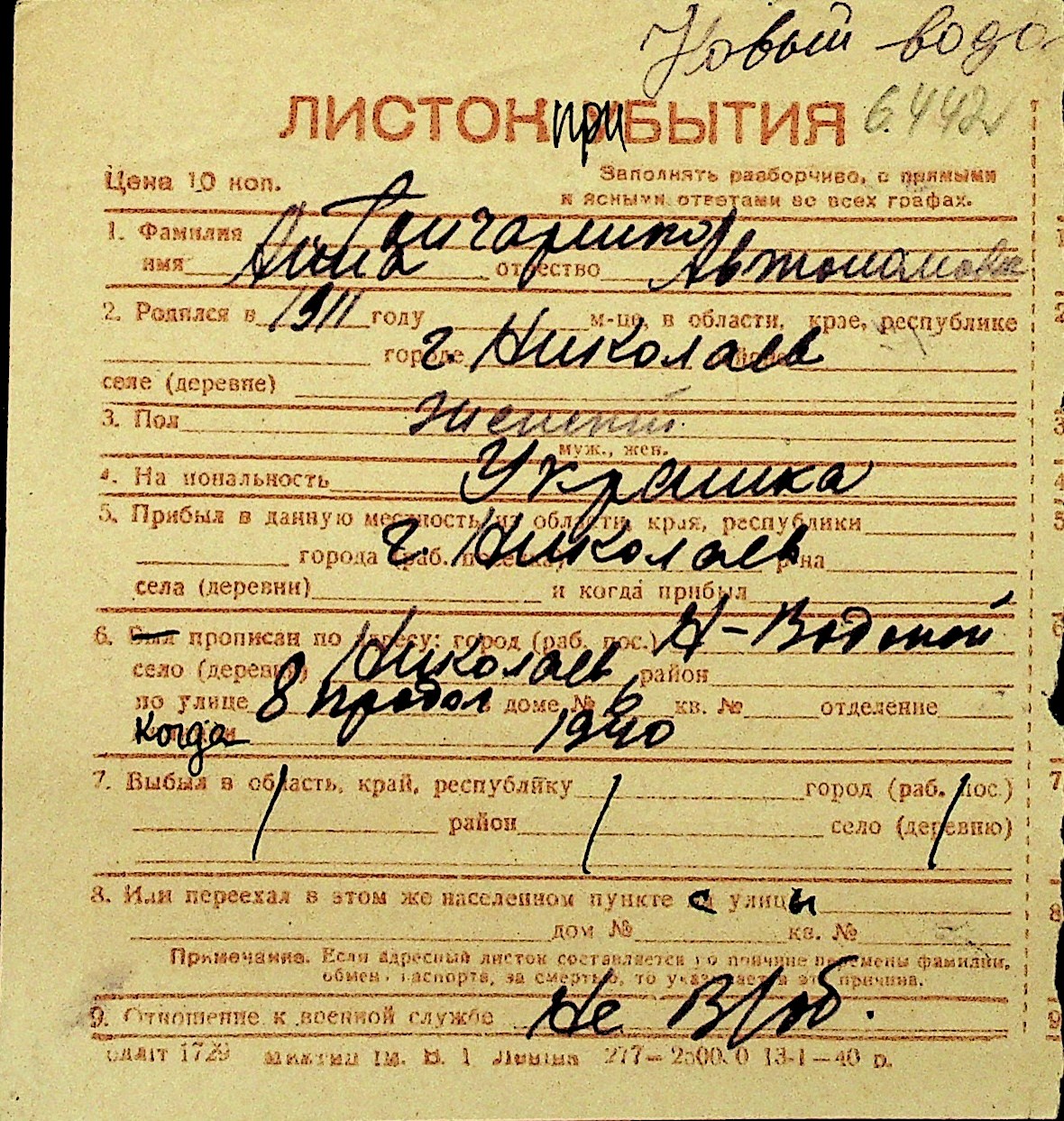 • • Перелік карток до фонду № Н-1016