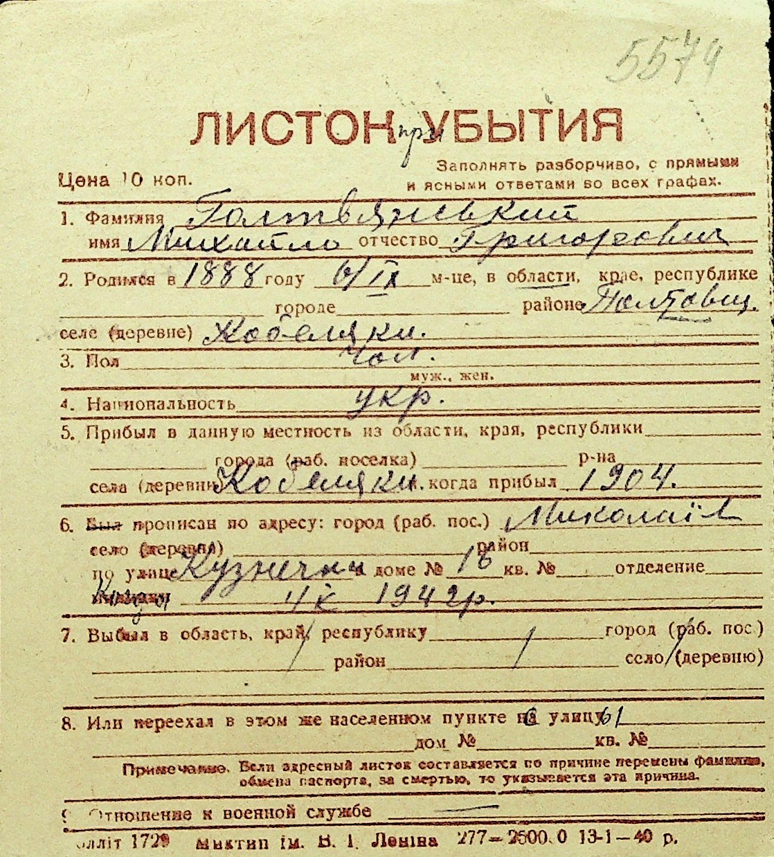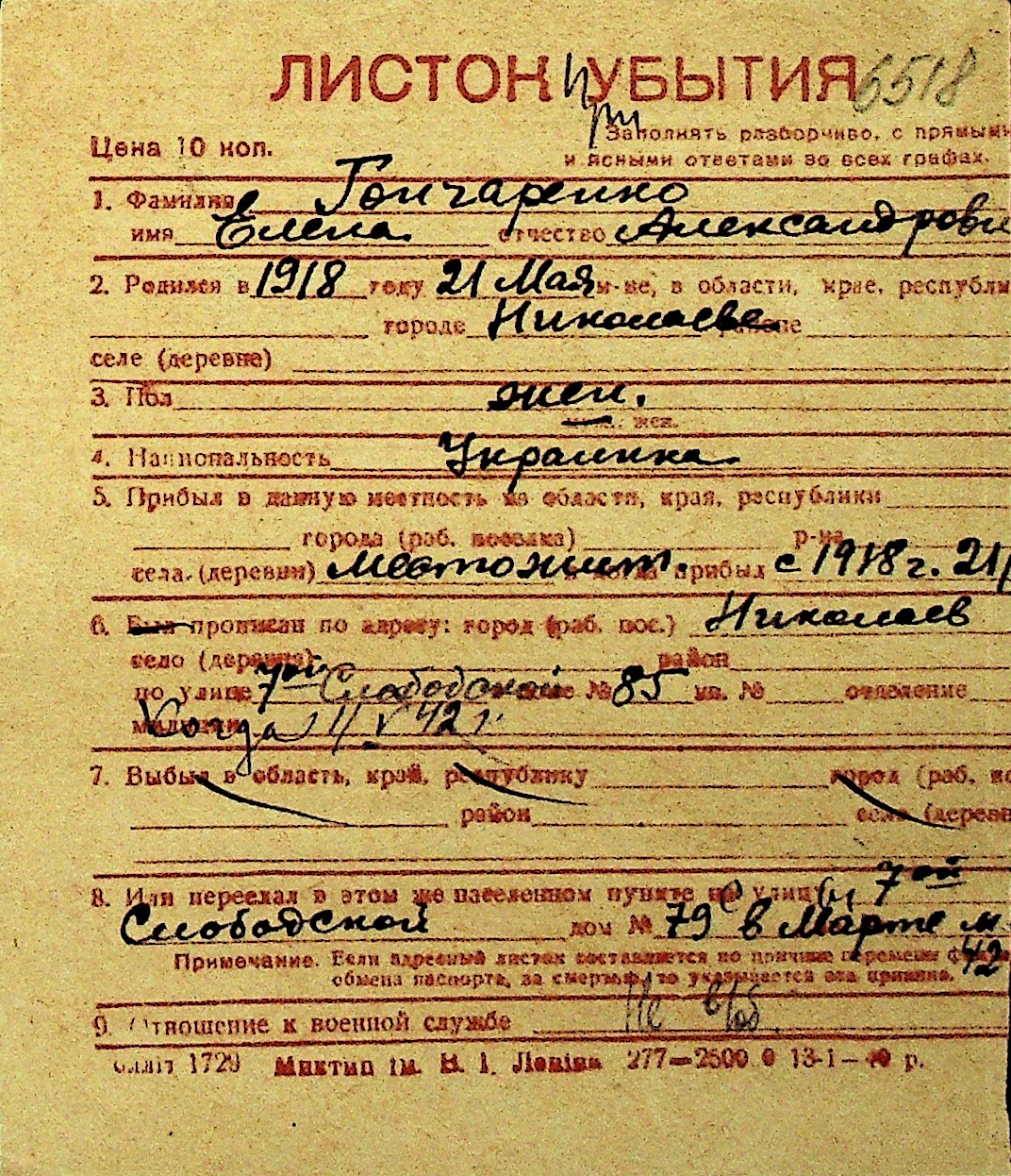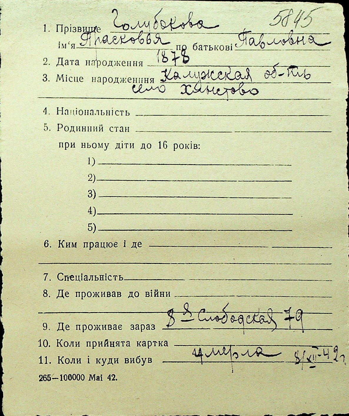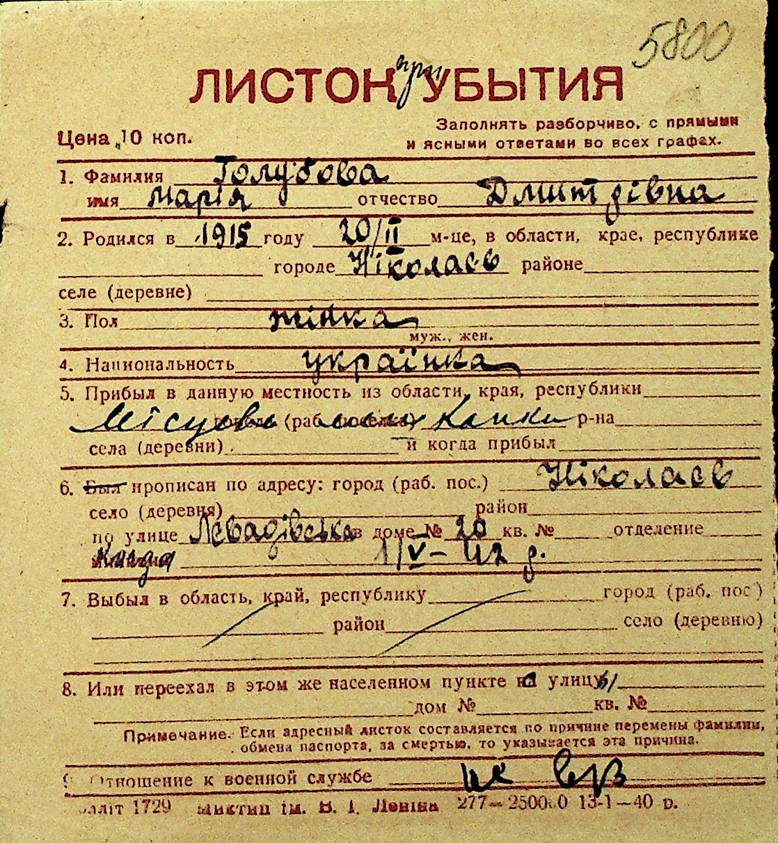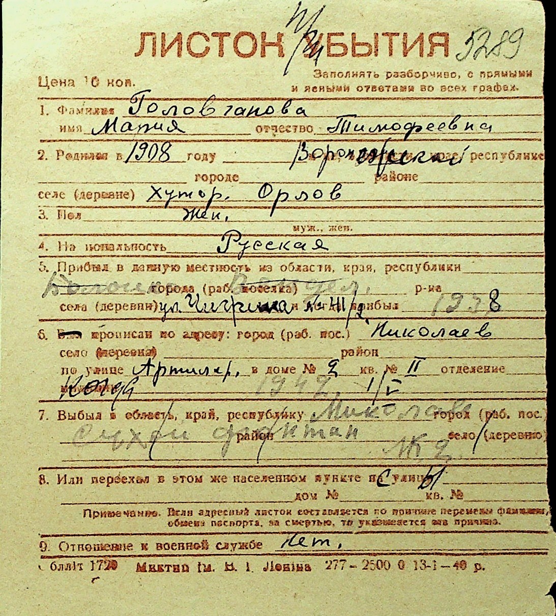 • • Перелік карток до фонду № Н-1016