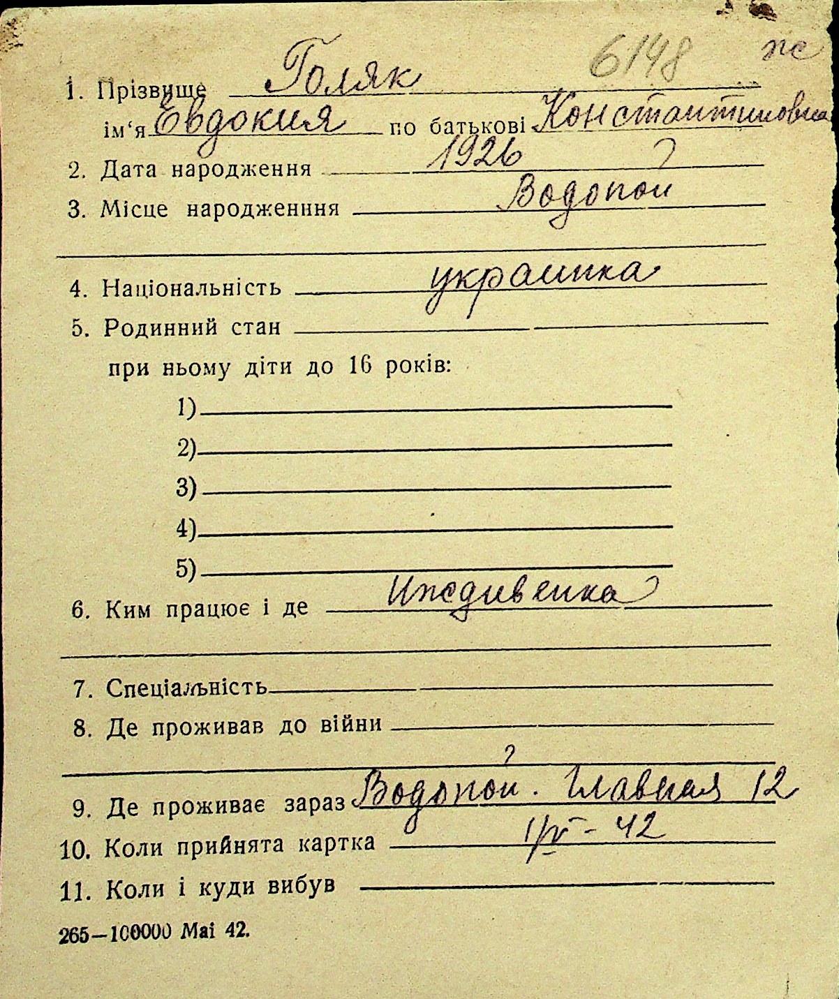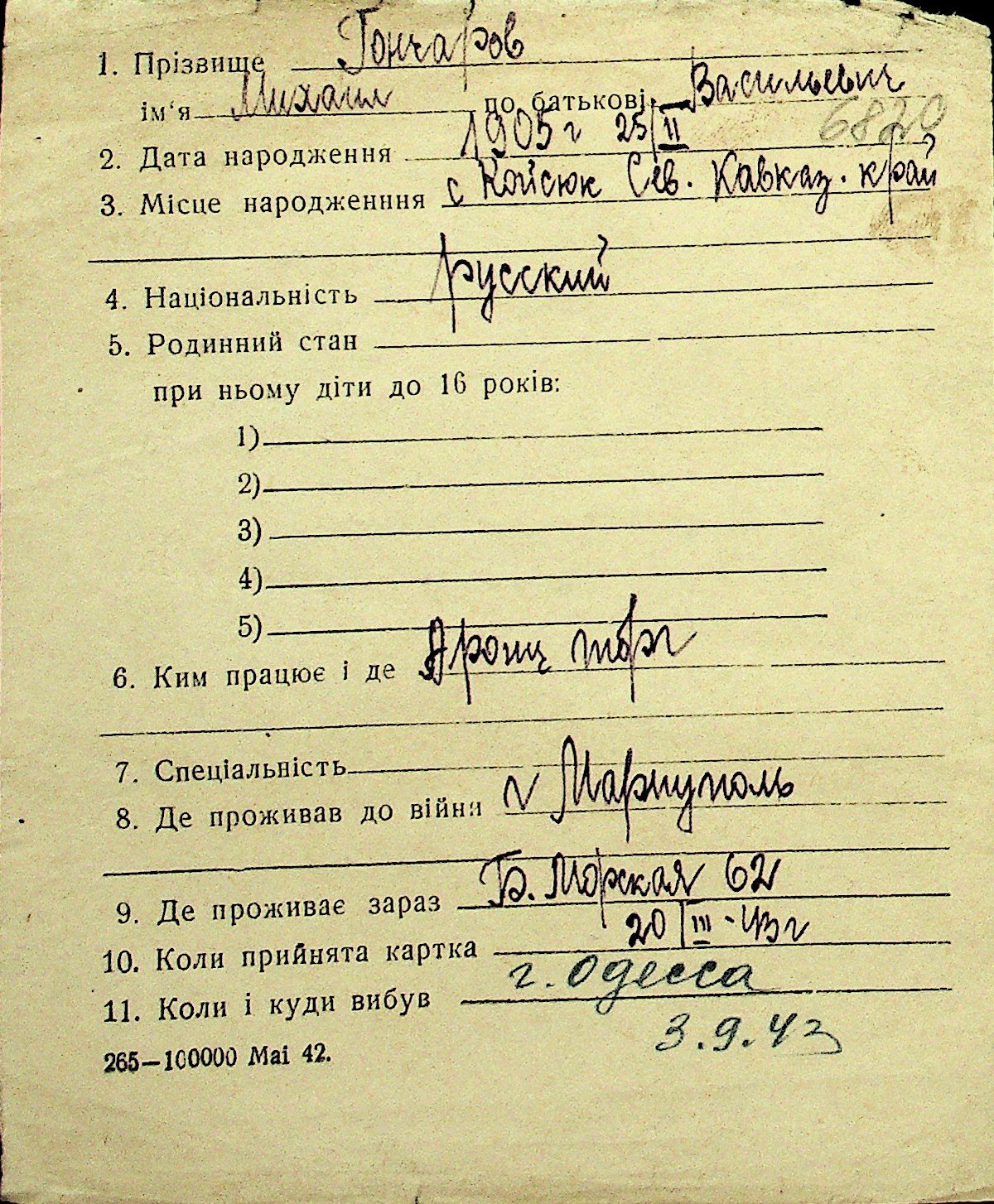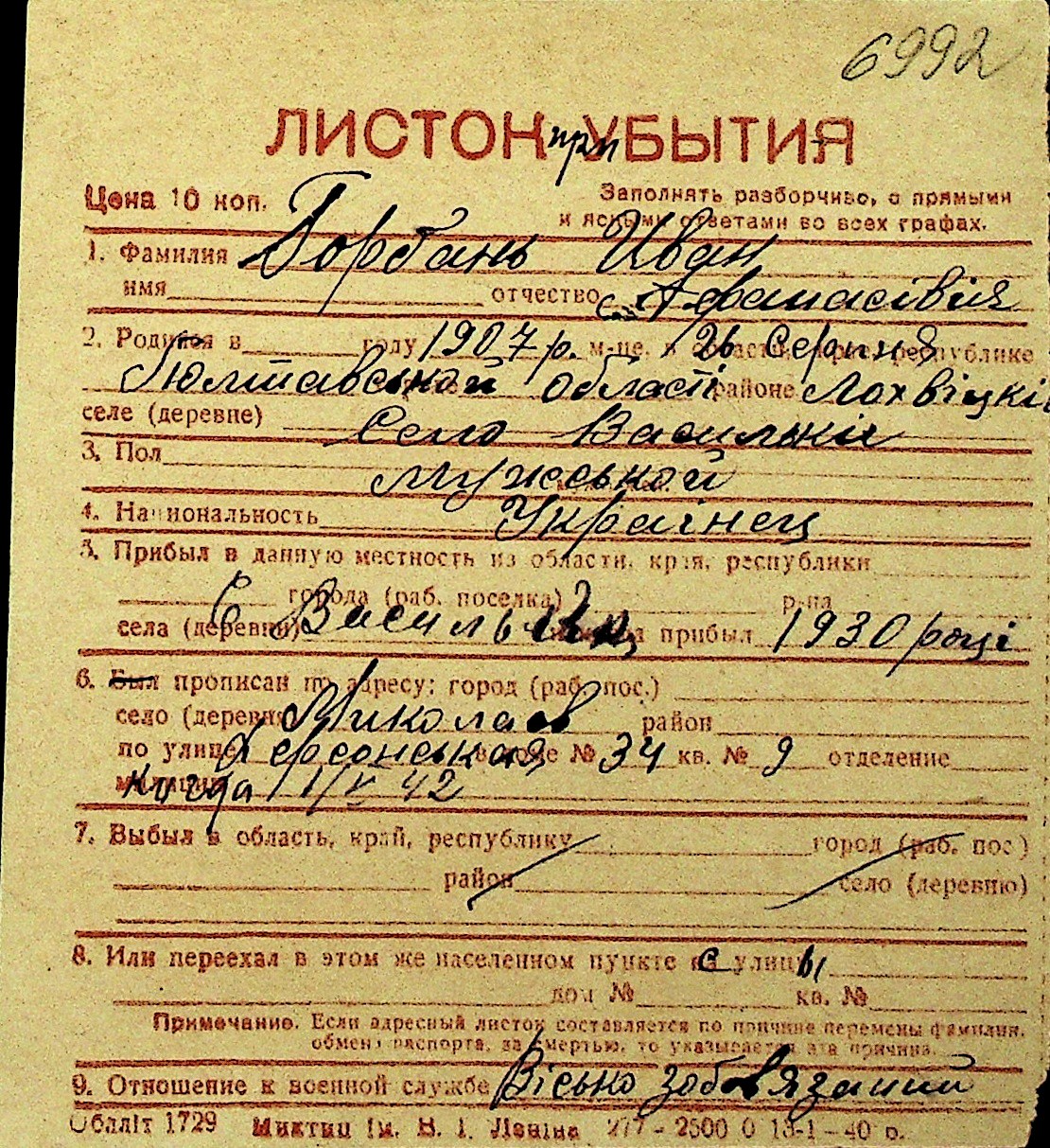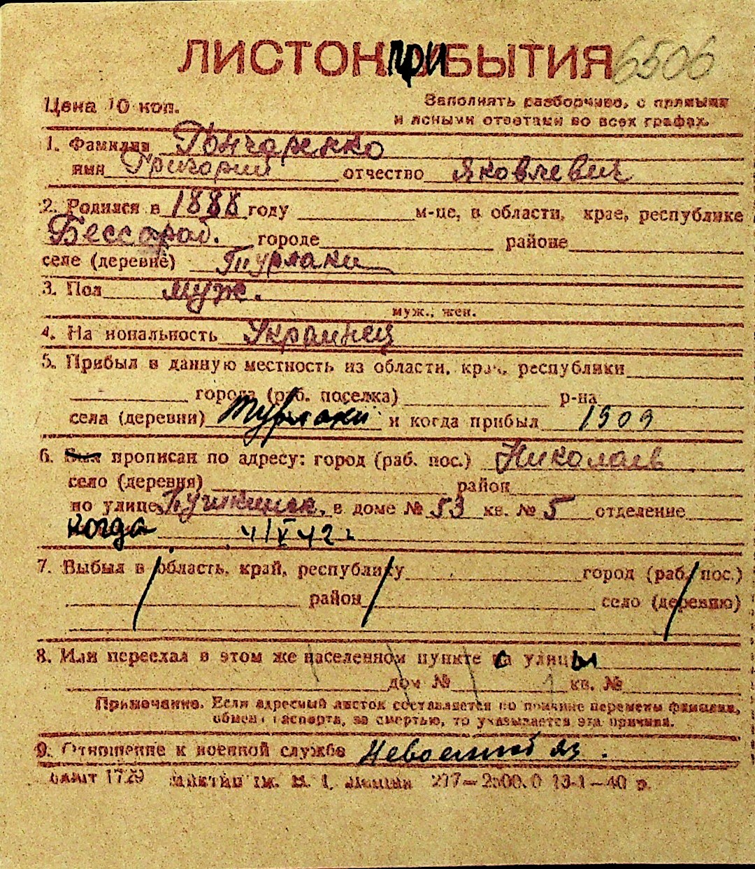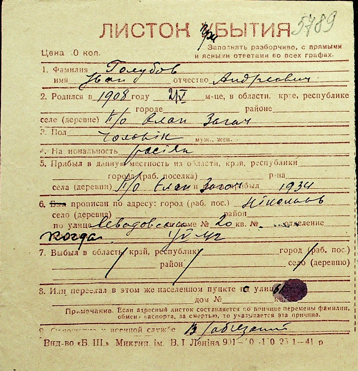 • • Перелік карток до фонду № Н-1016