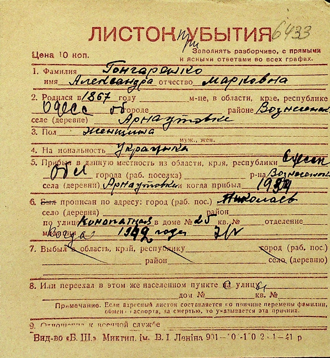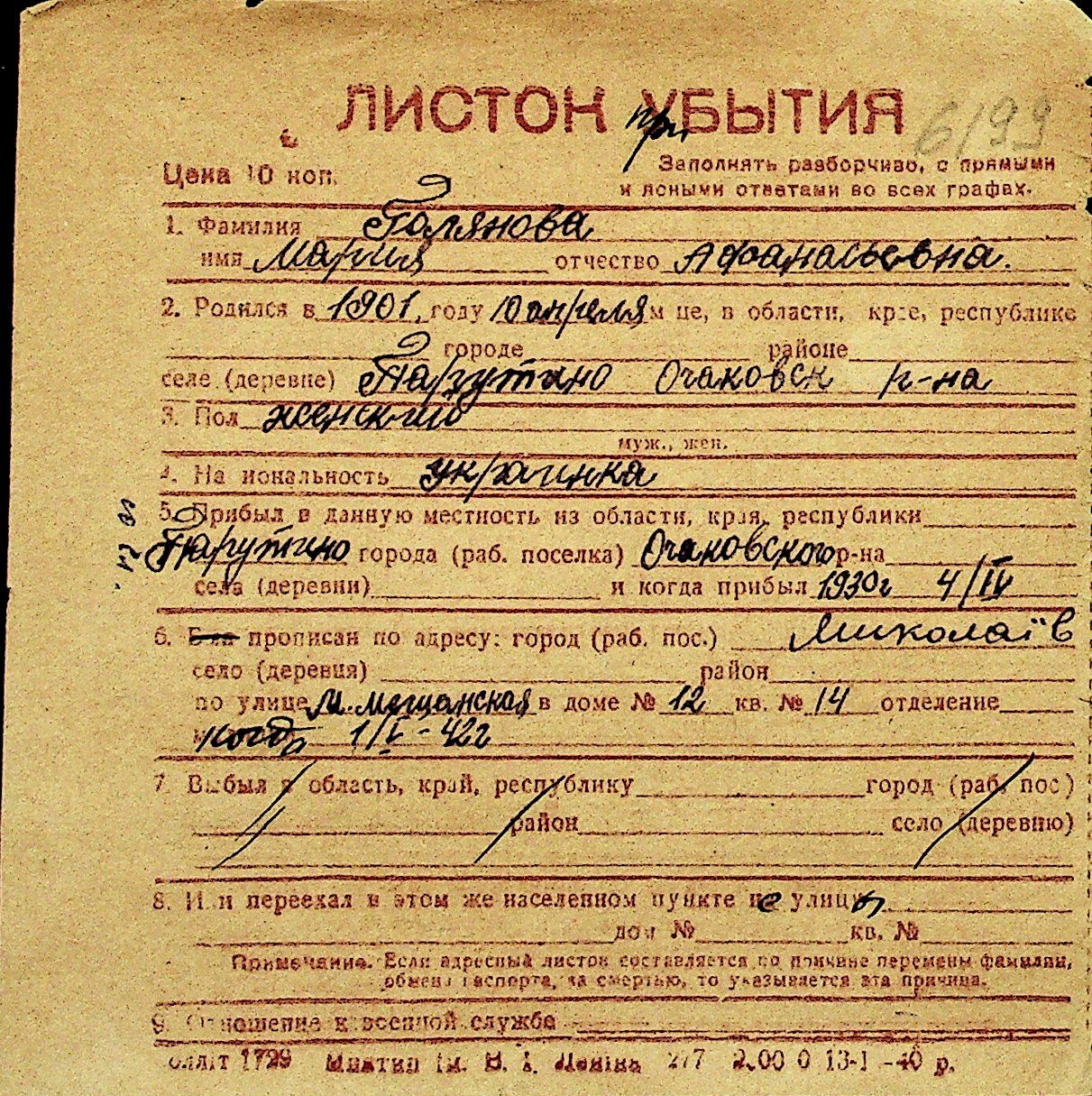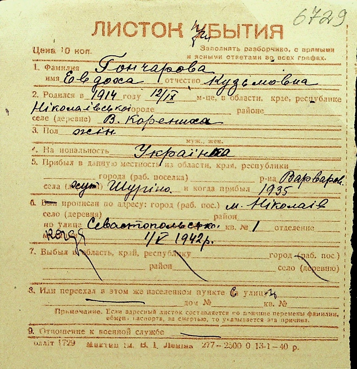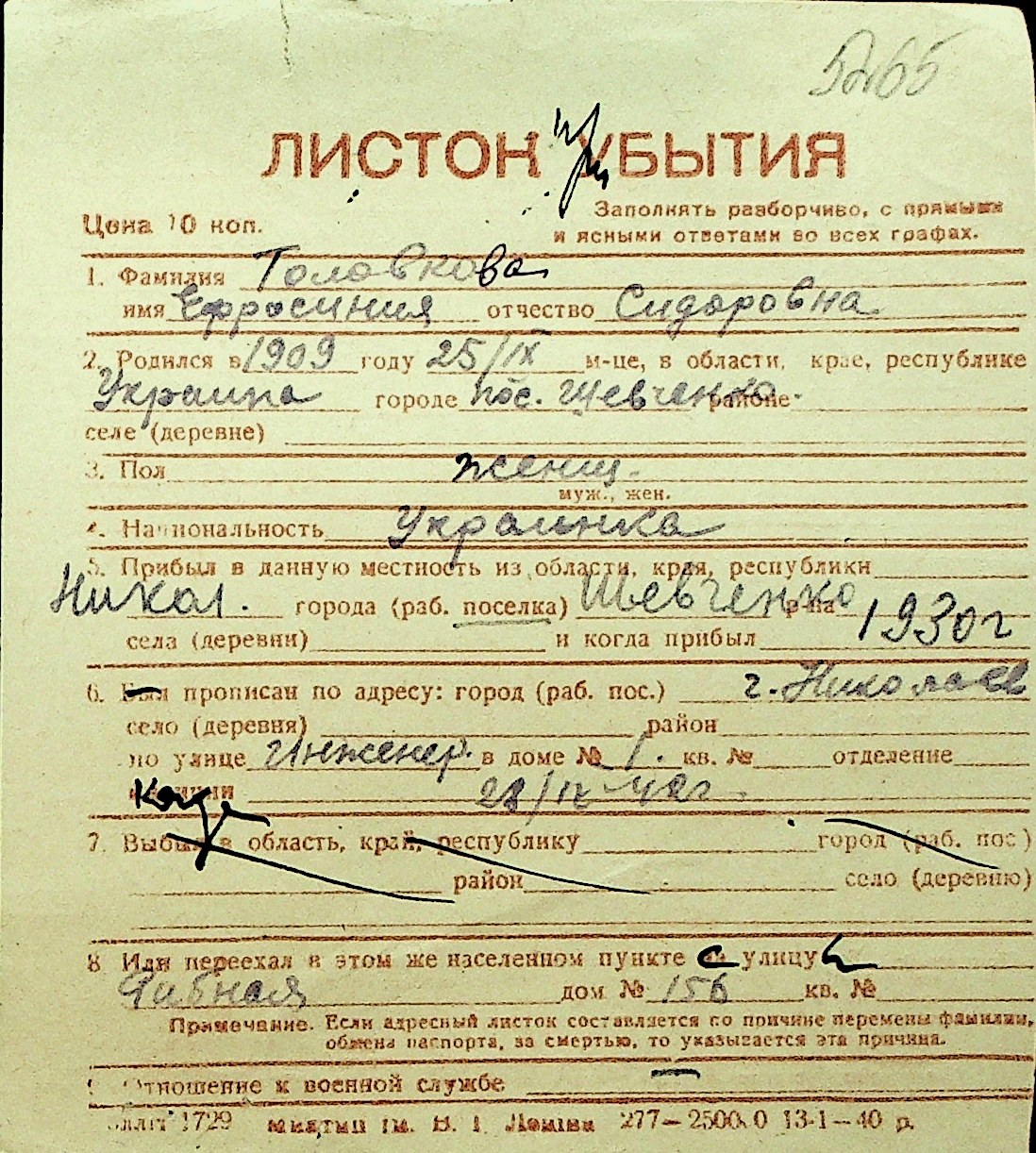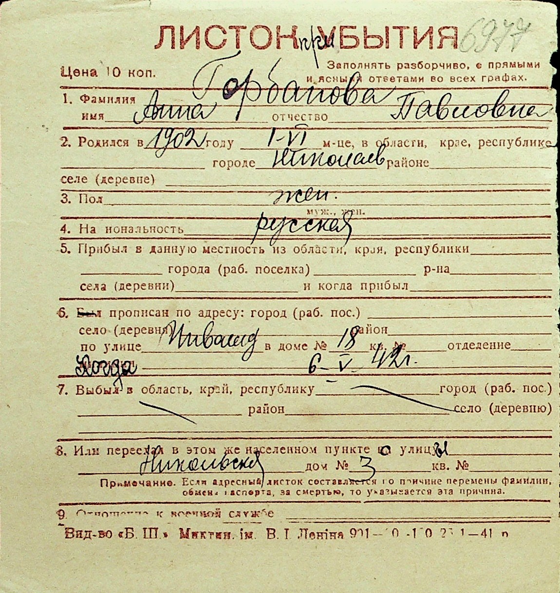 • • Перелік карток до фонду № Н-1016