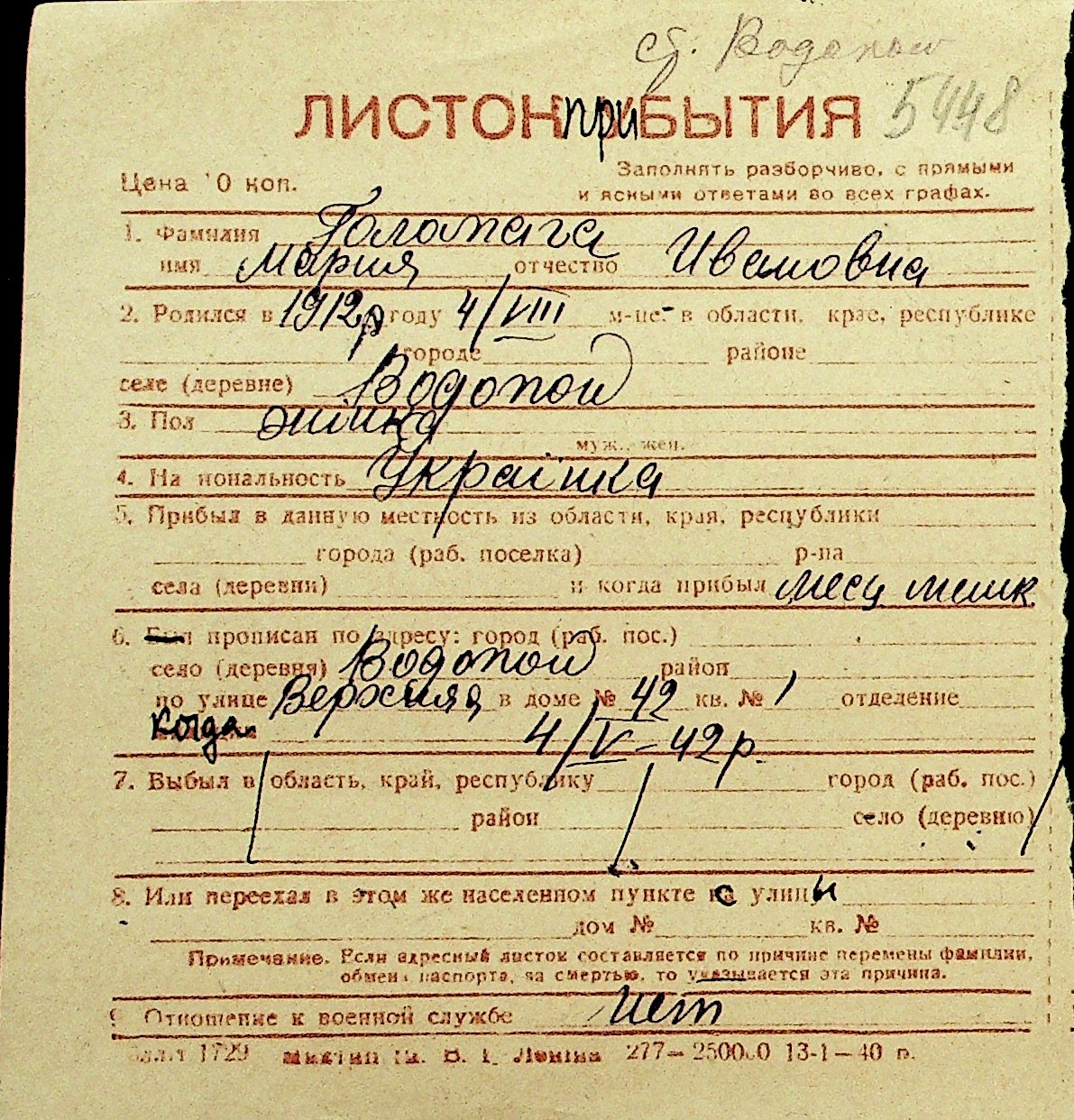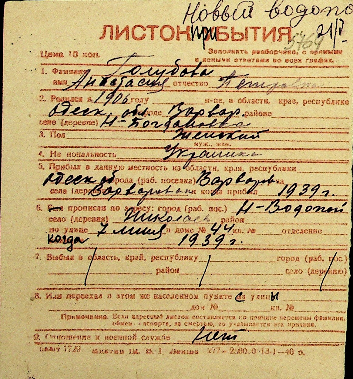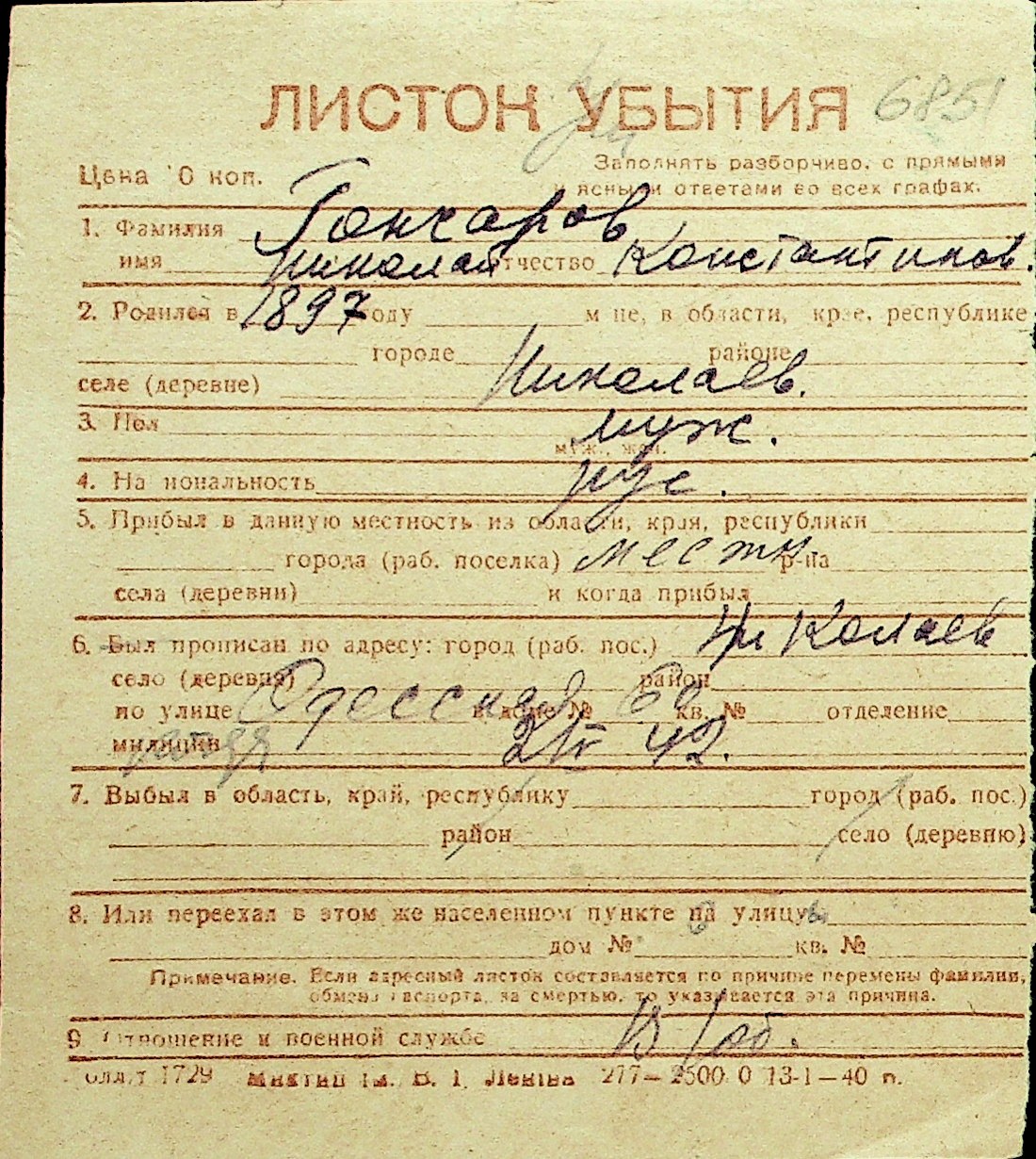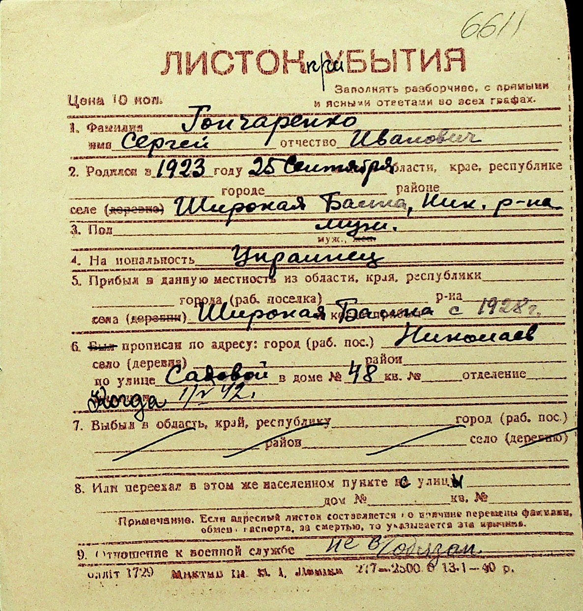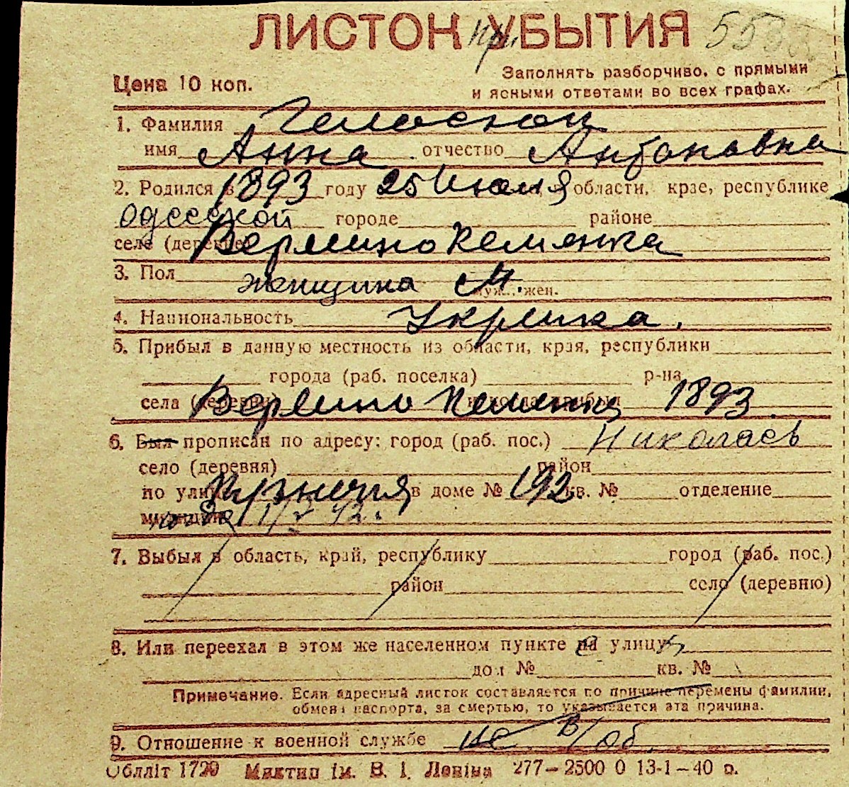 • • Перелік карток до фонду № Н-1016