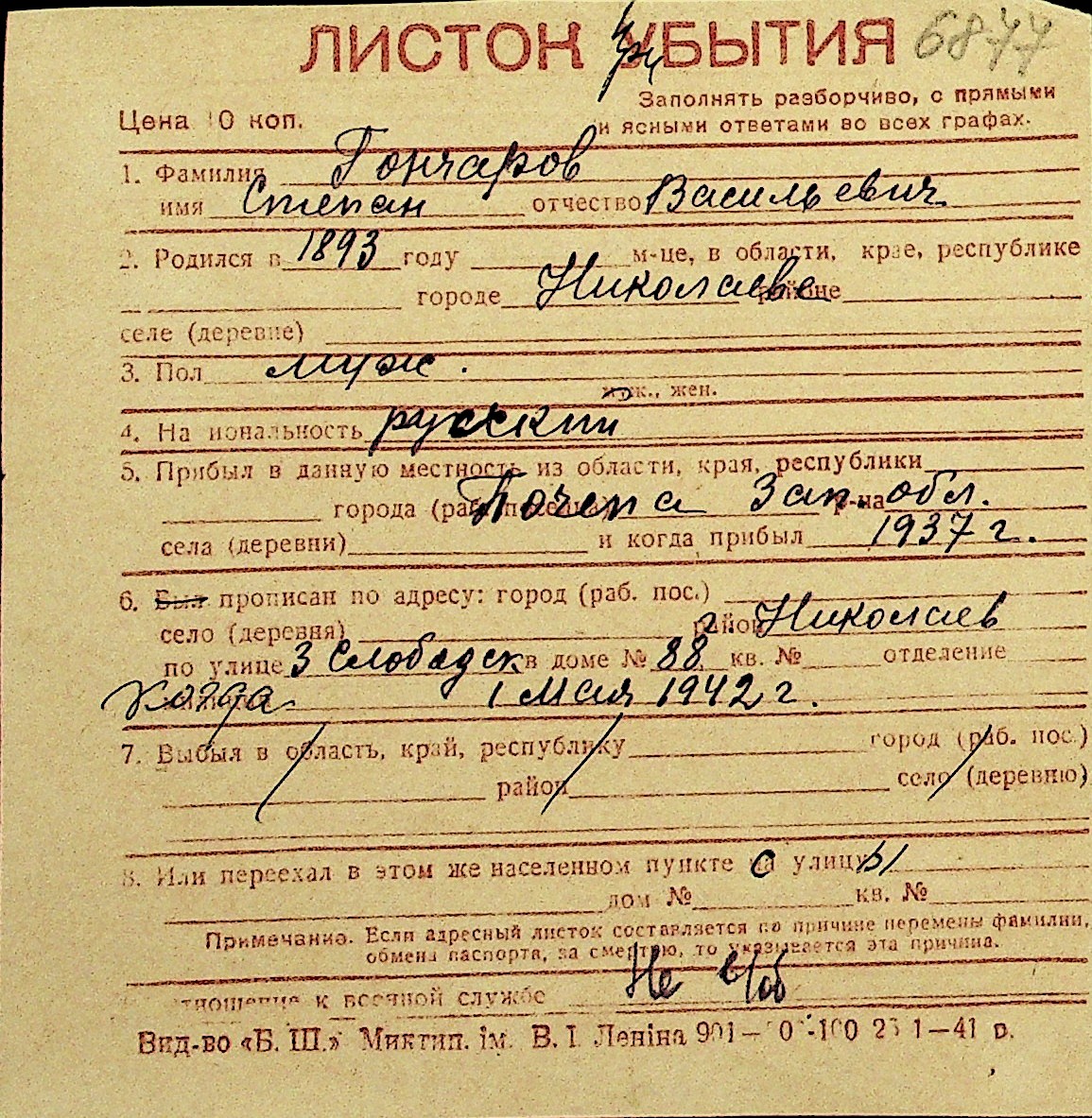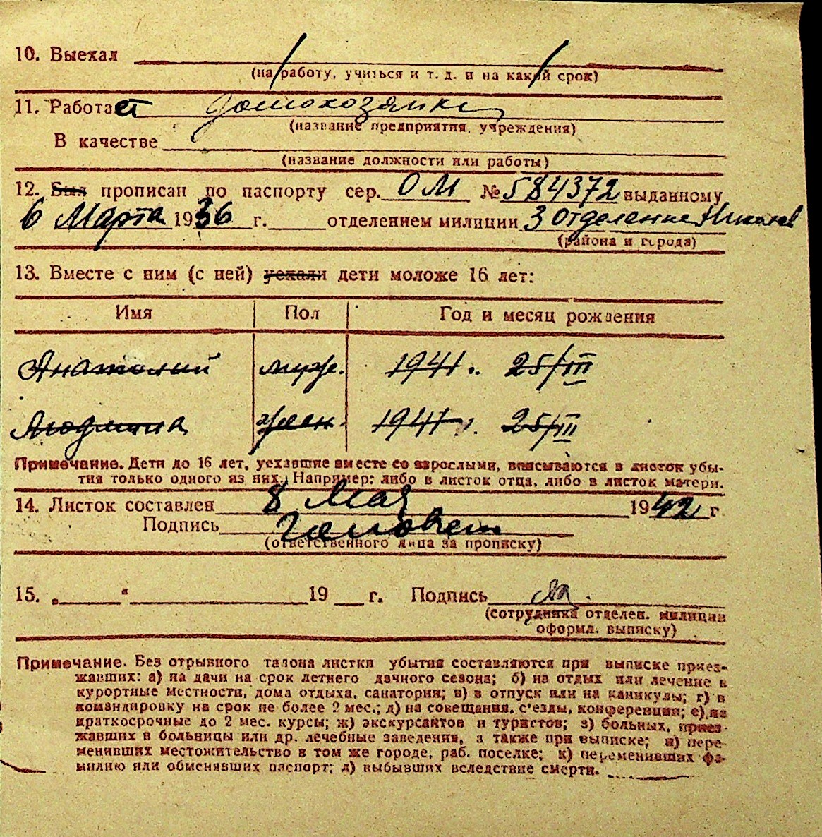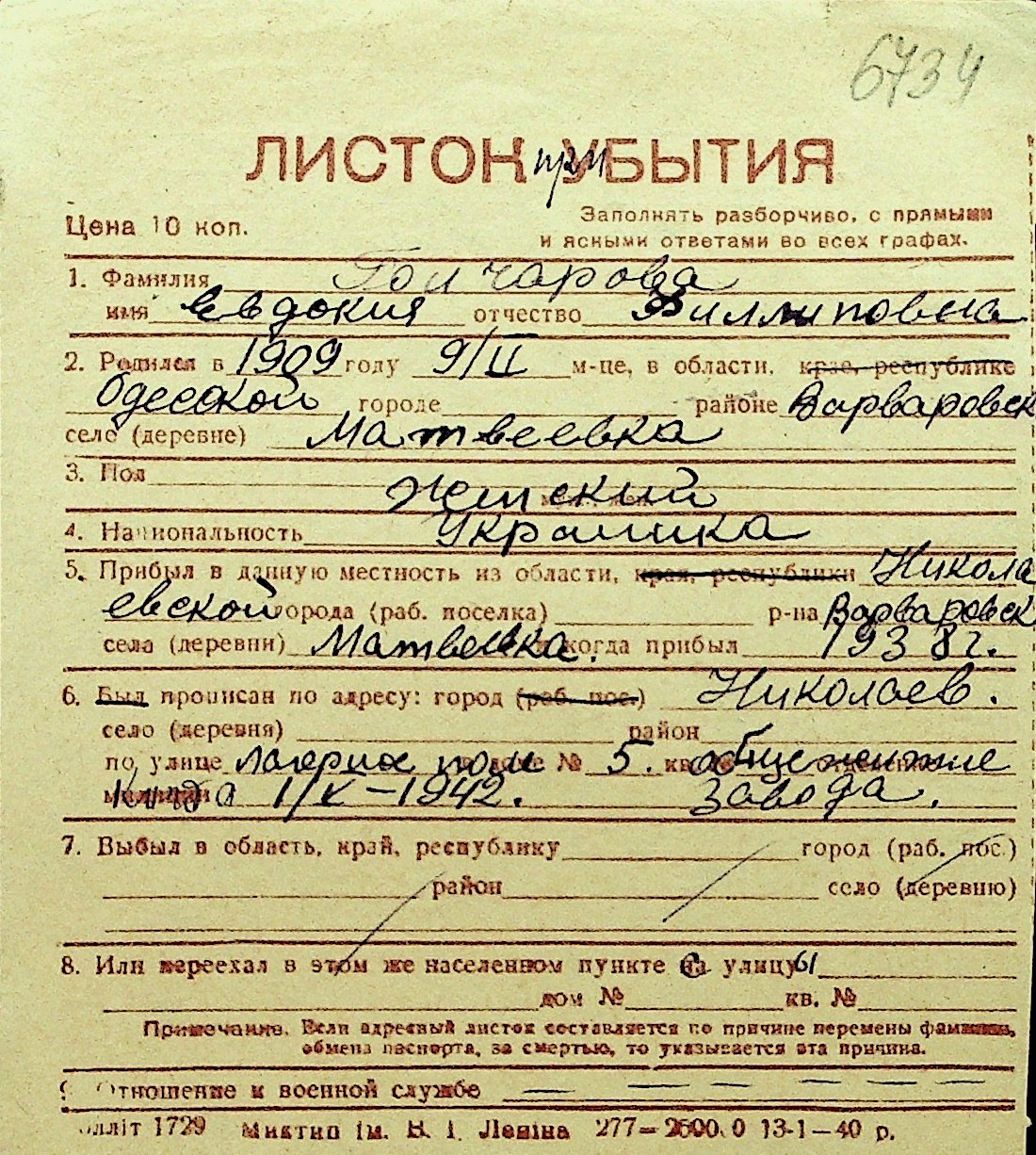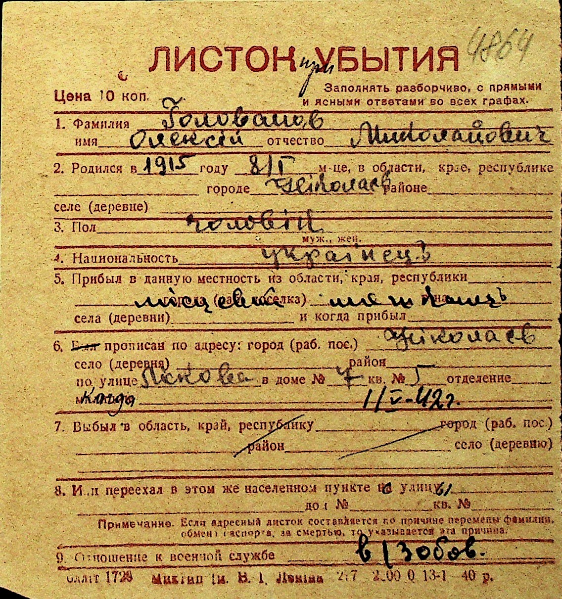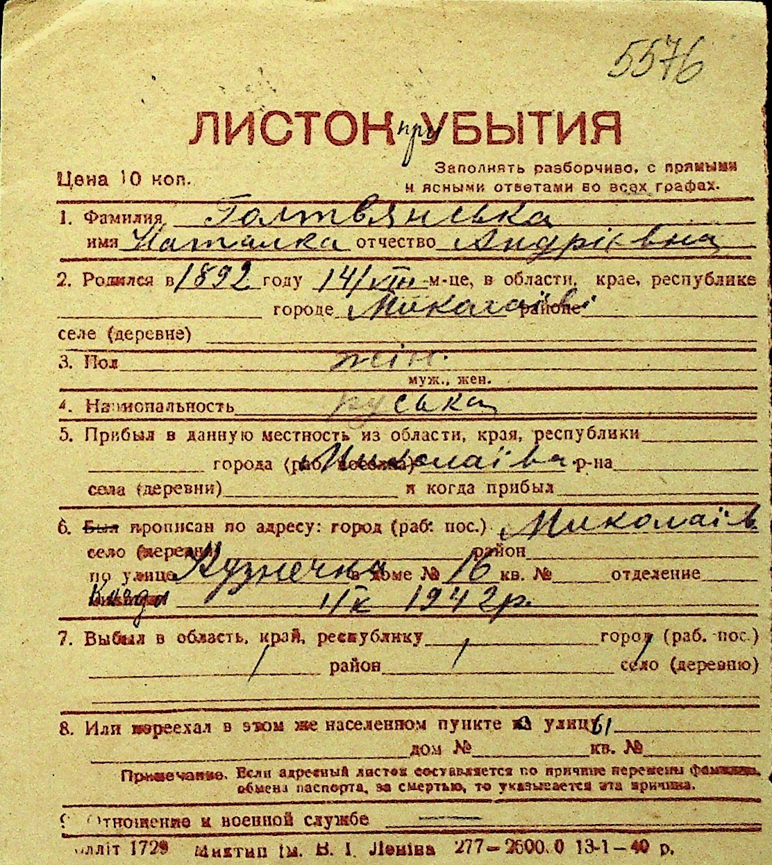 • • Перелік карток до фонду № Н-1016
