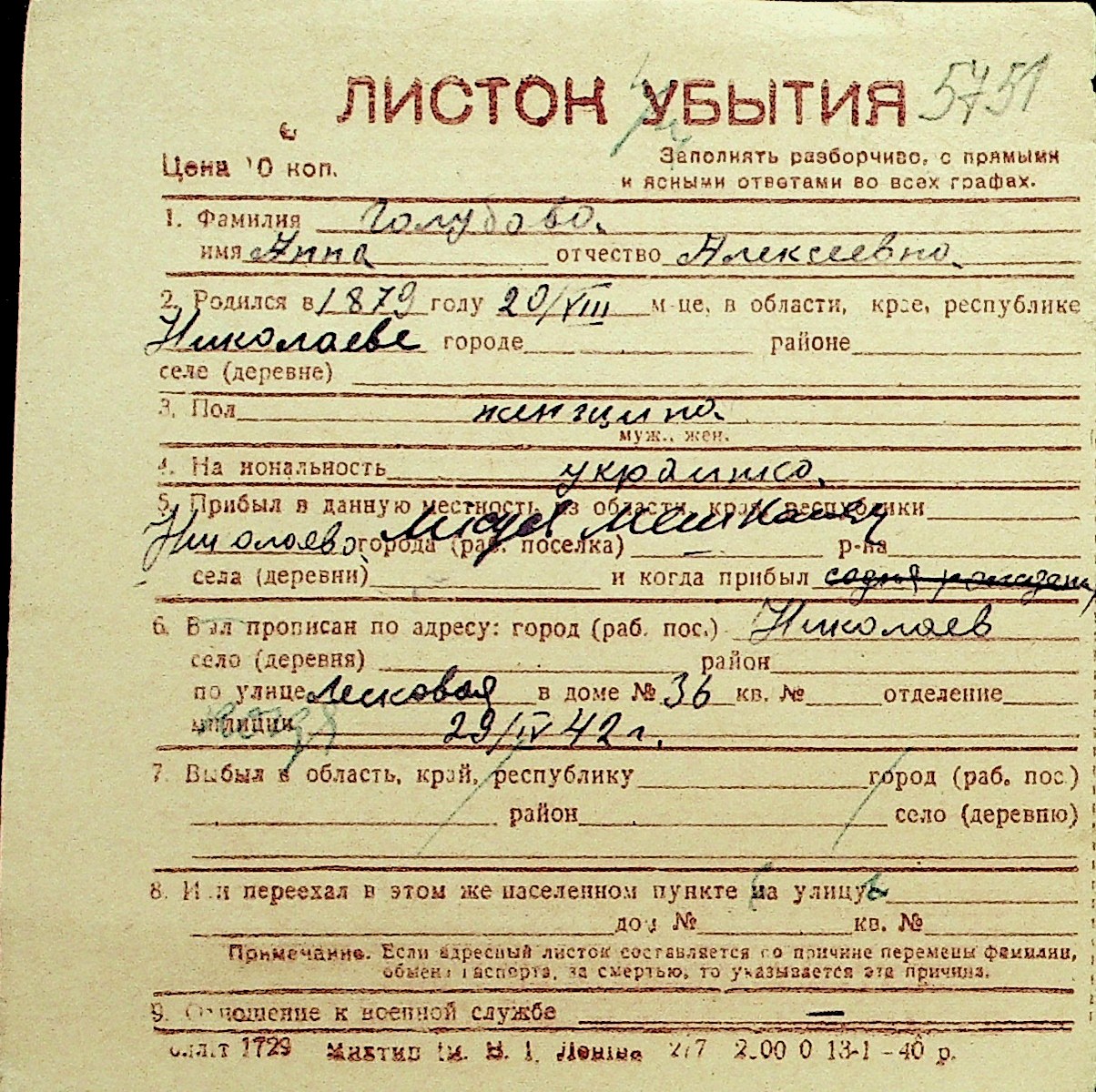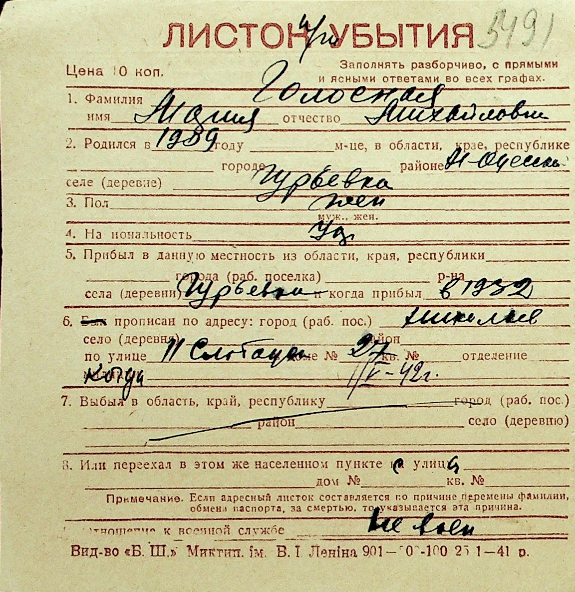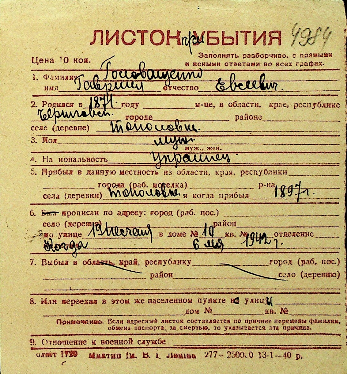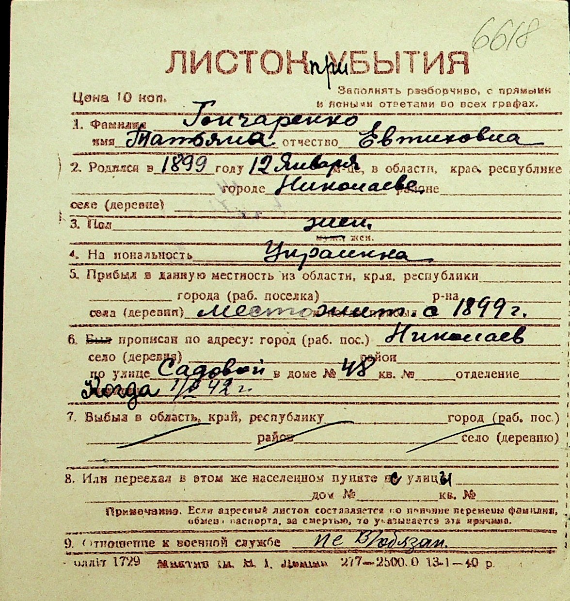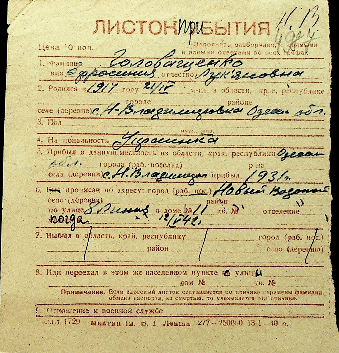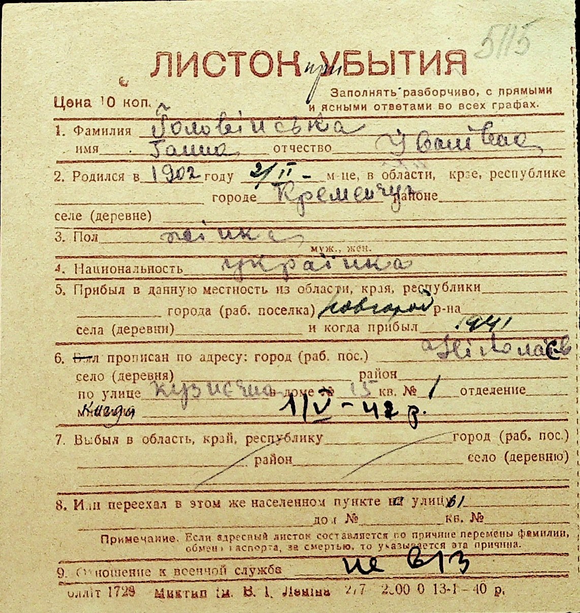 • • Перелік карток до фонду № Н-1016