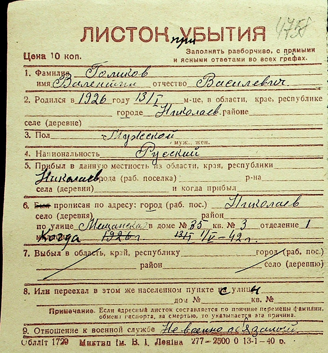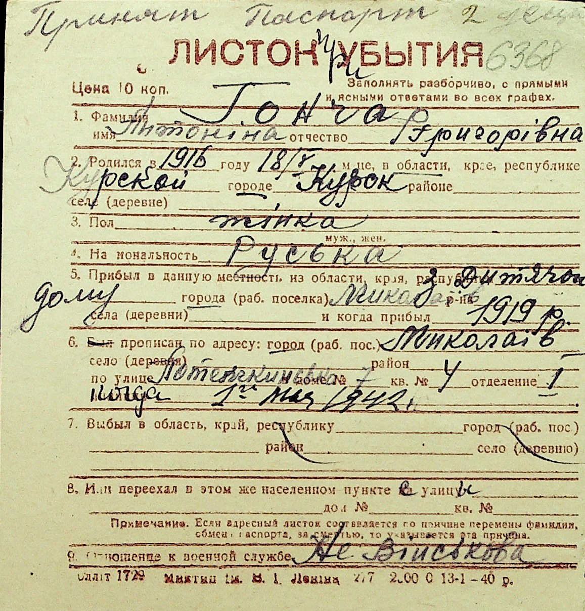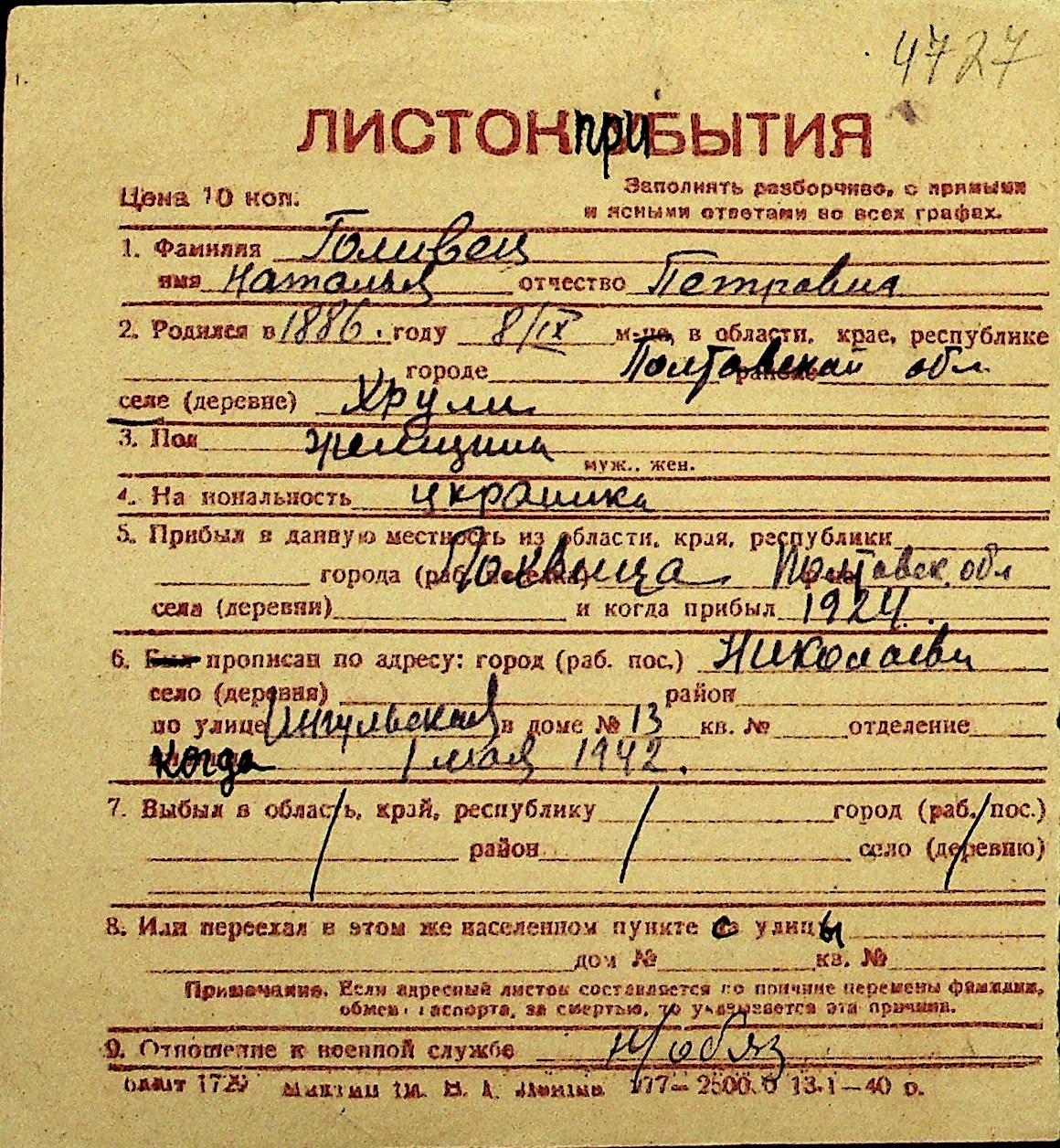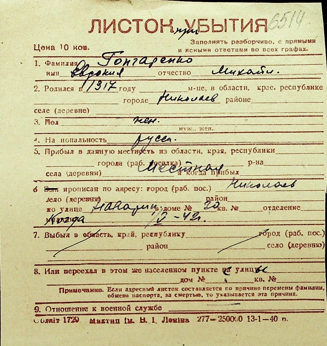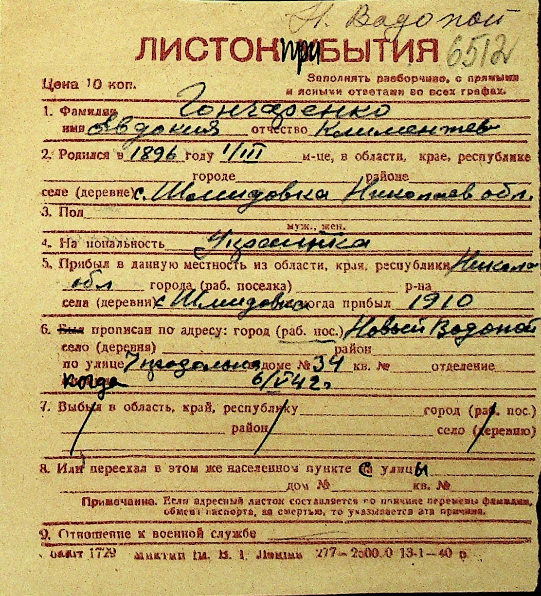 • • Перелік карток до фонду № Н-1016