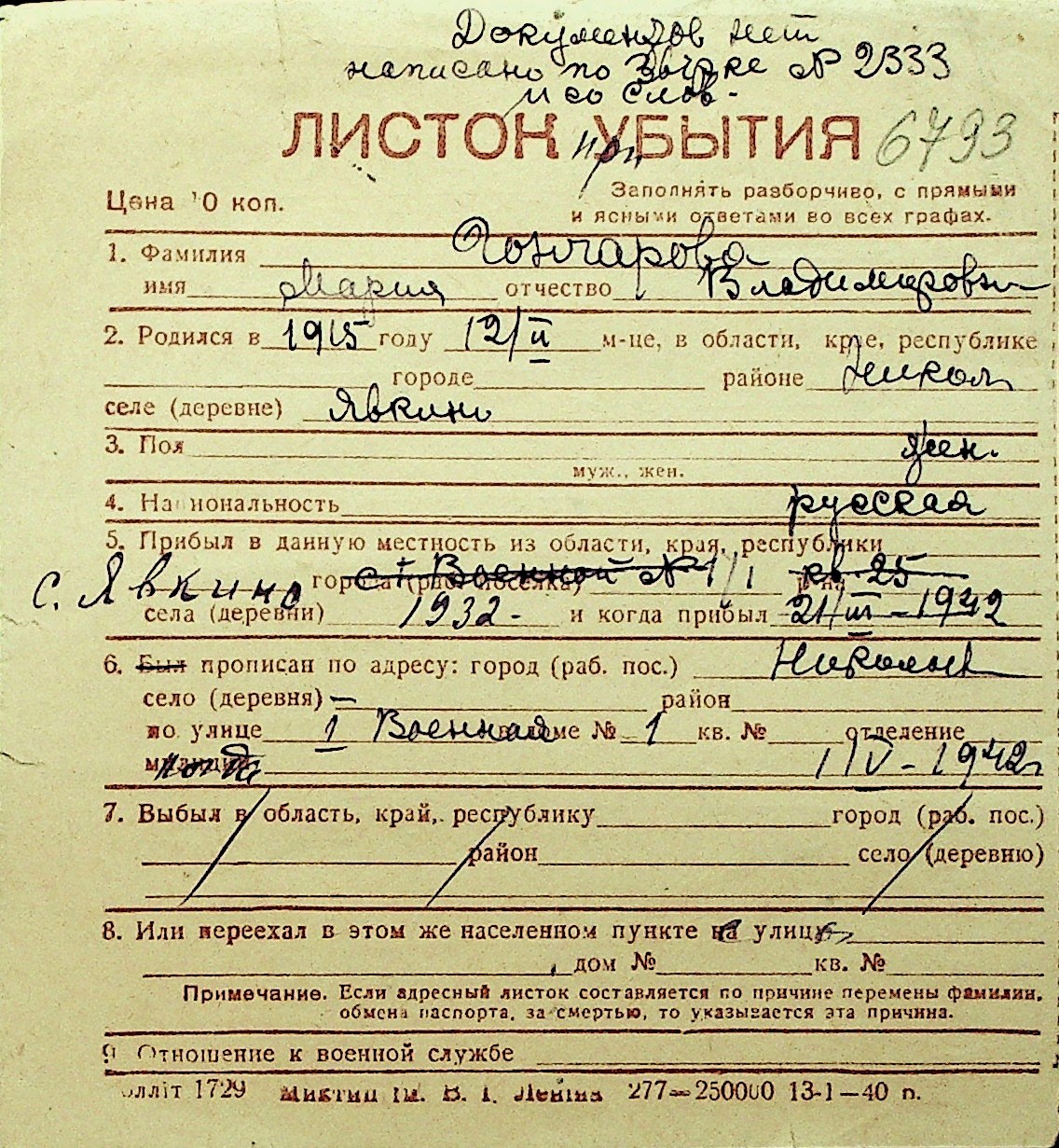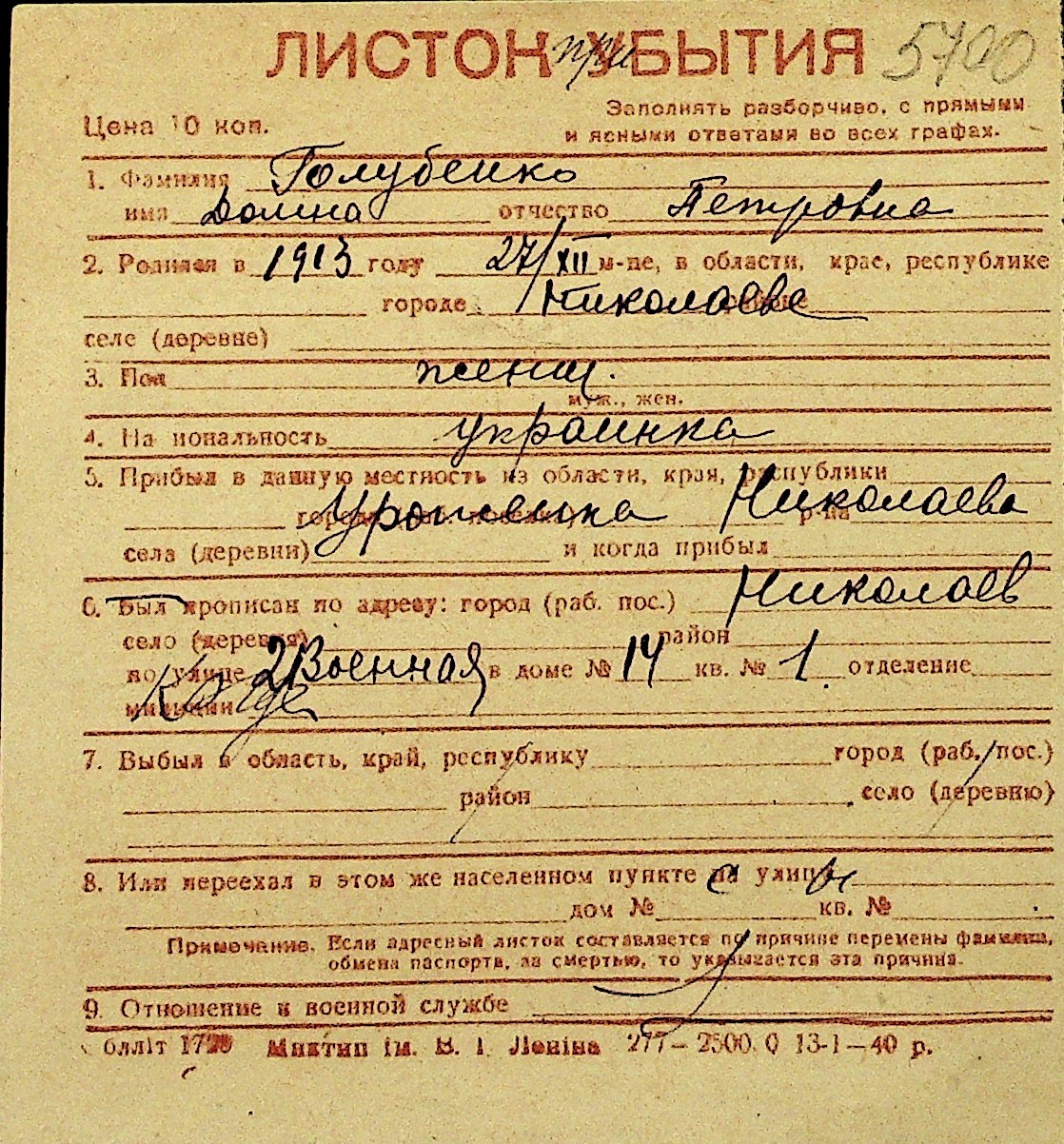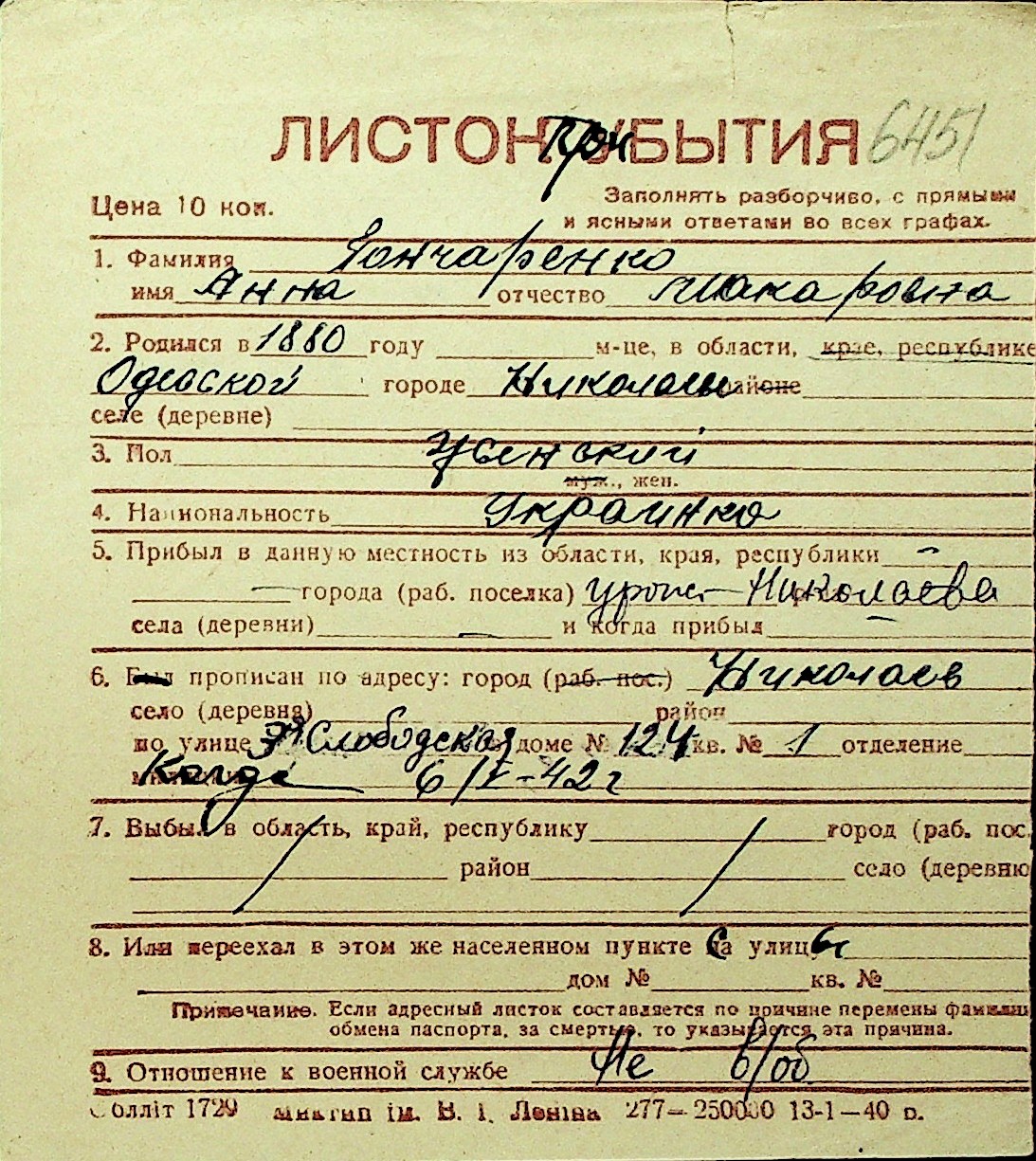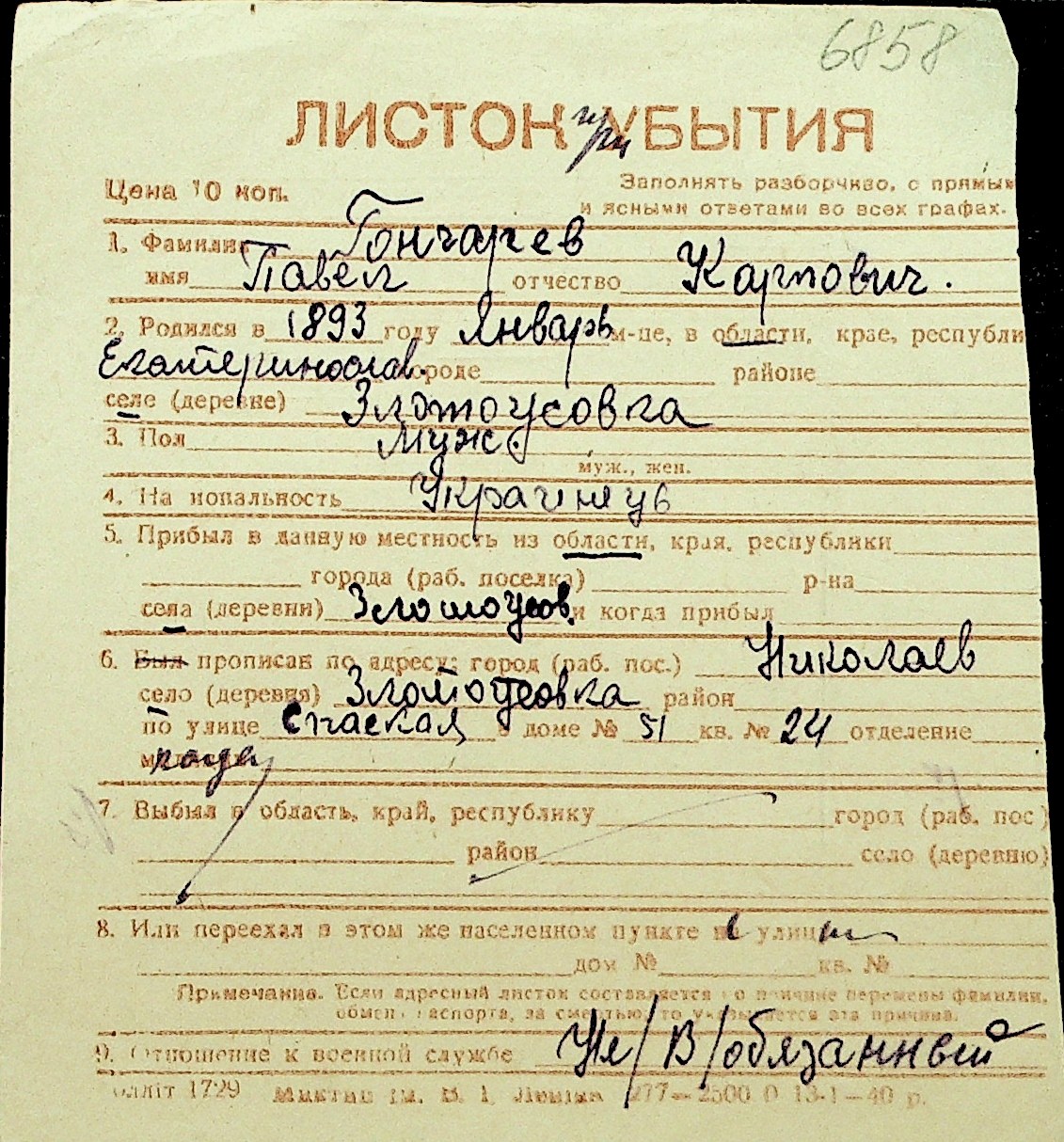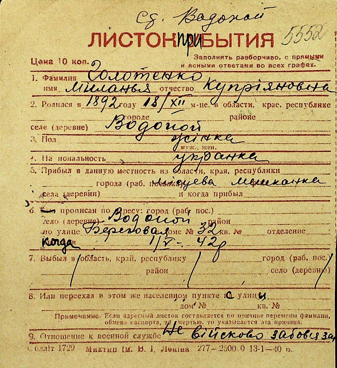 • • Перелік карток до фонду № Н-1016