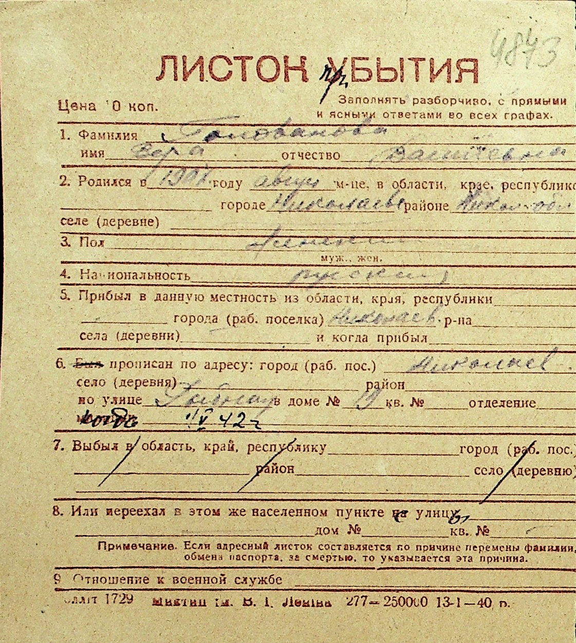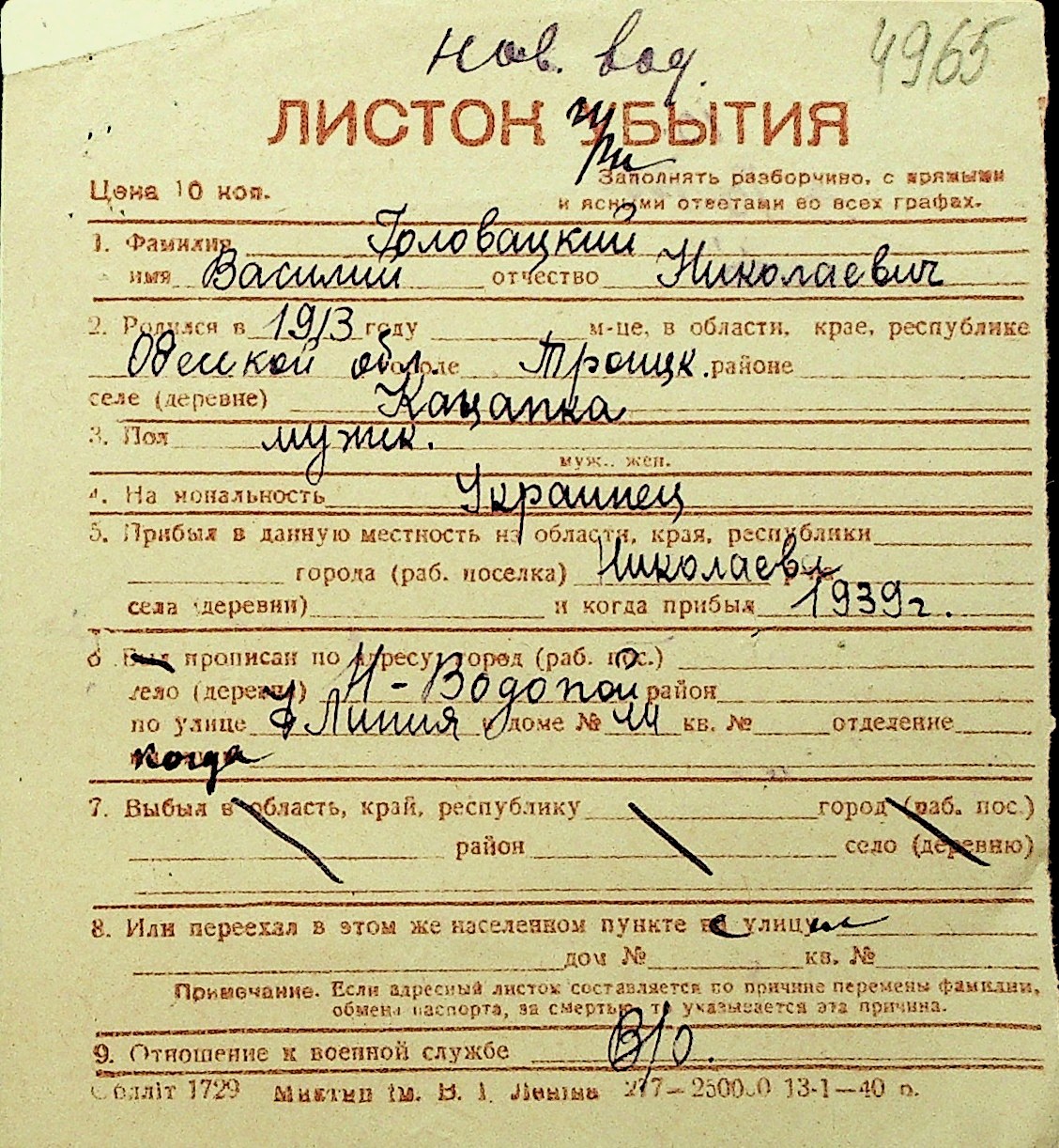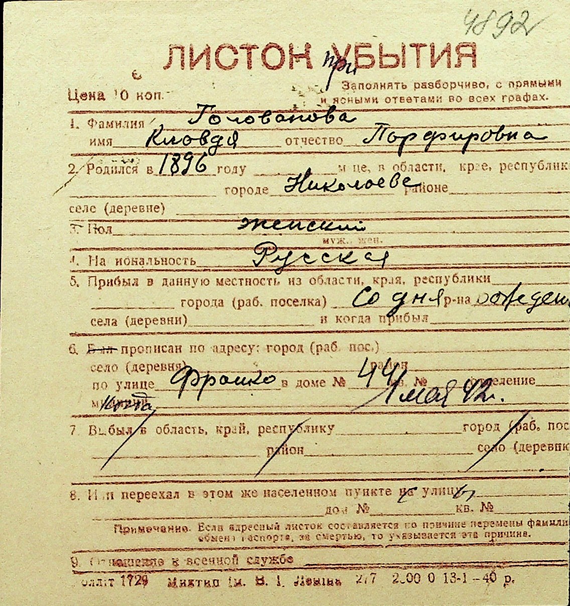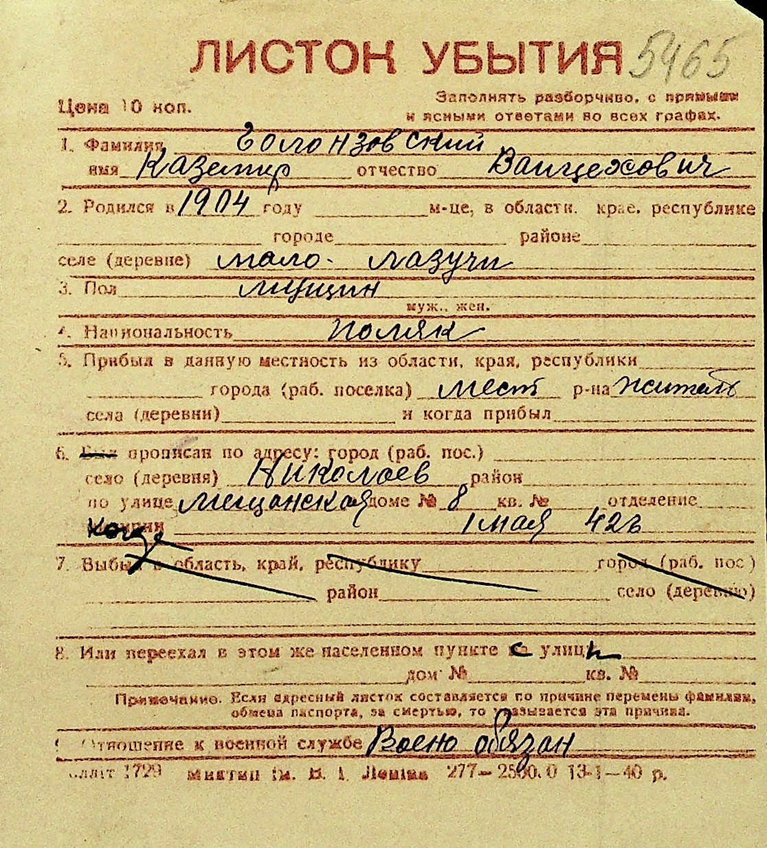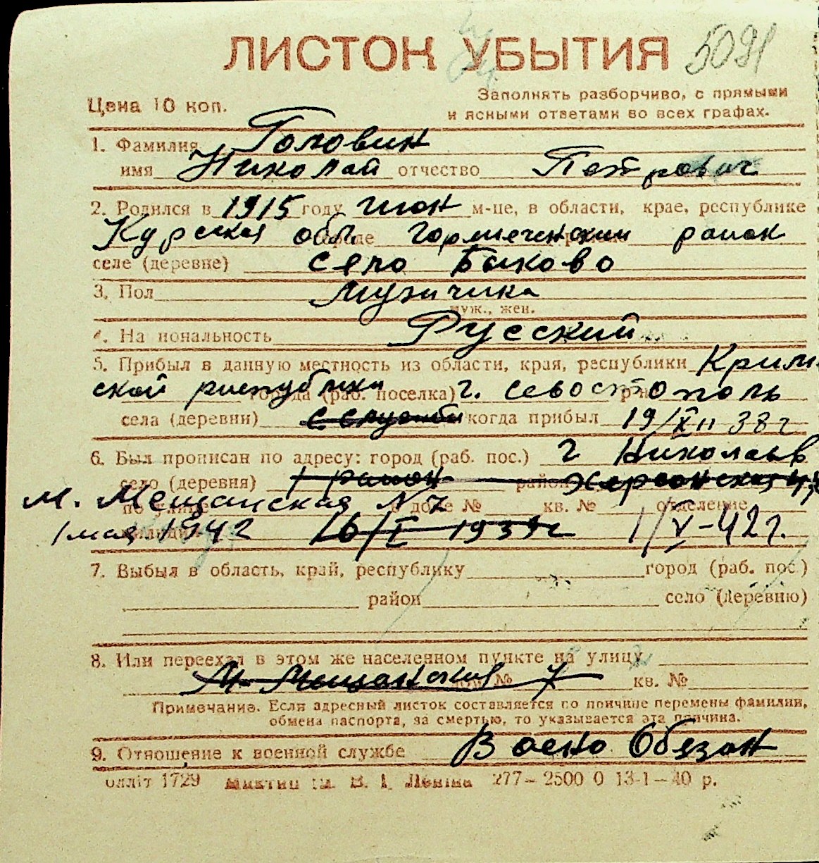 • • Перелік карток до фонду № Н-1016
