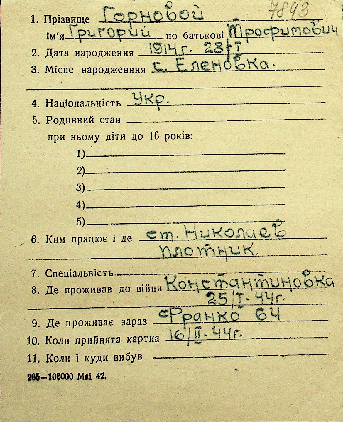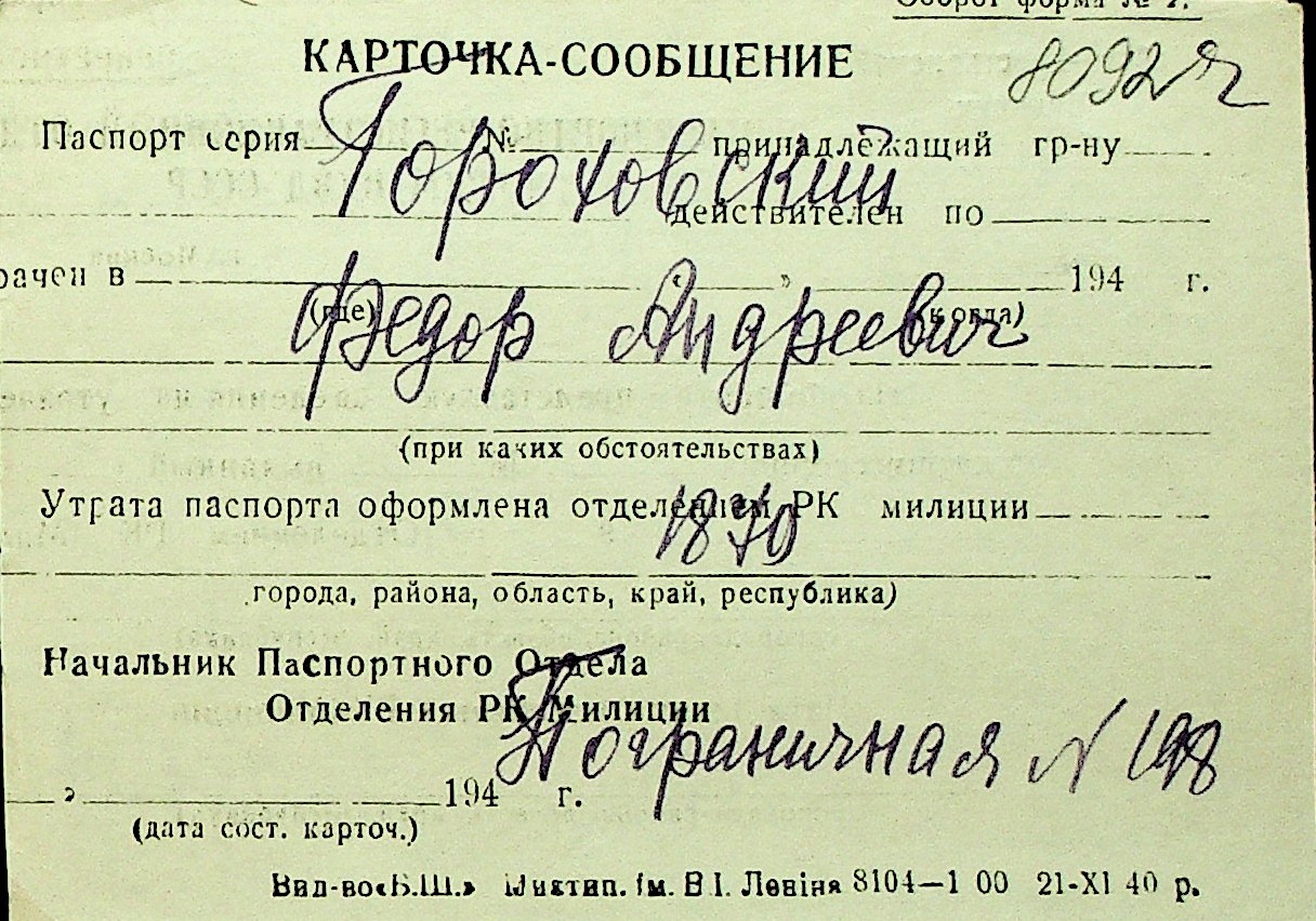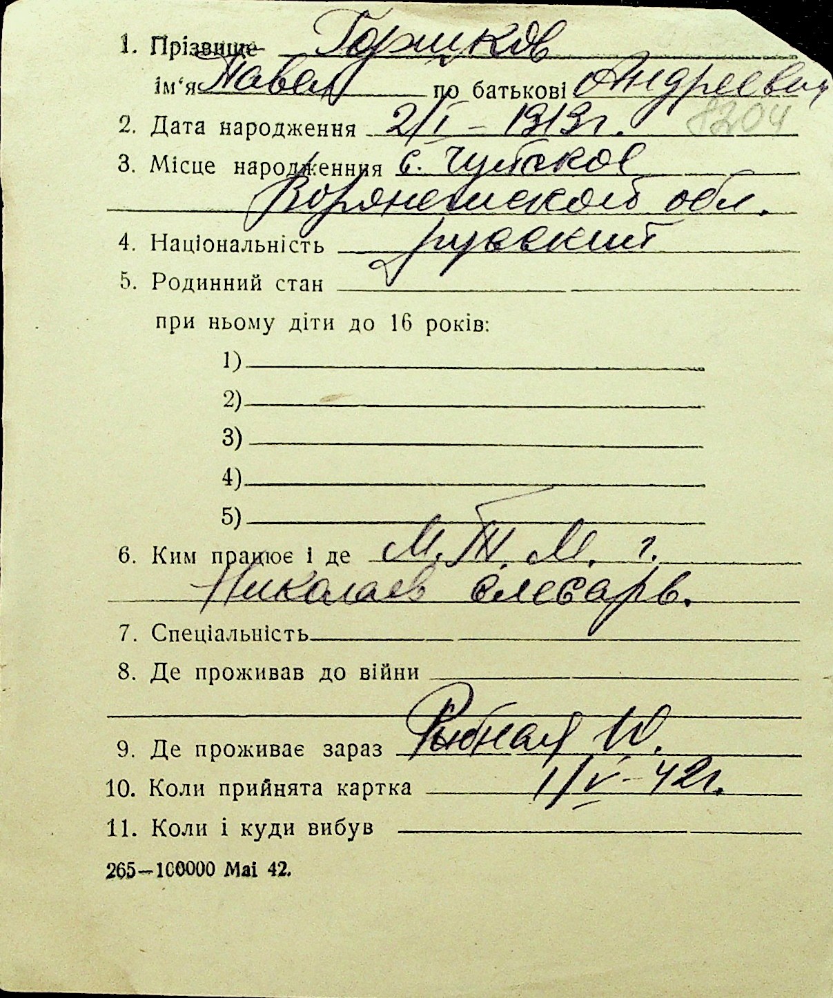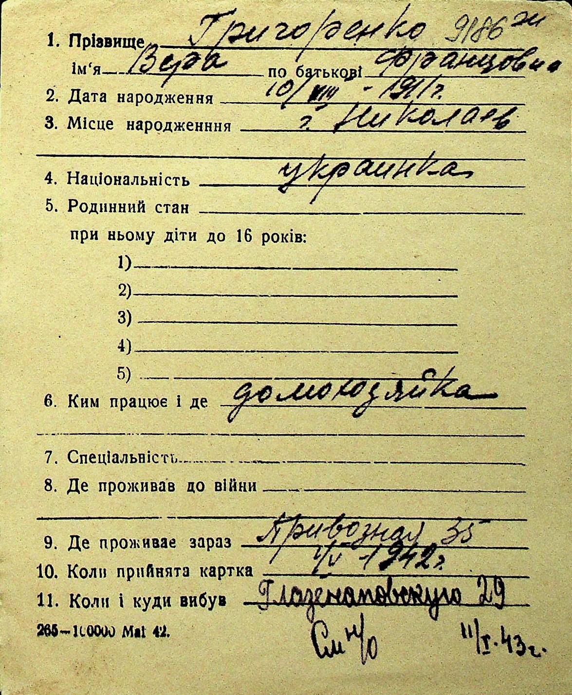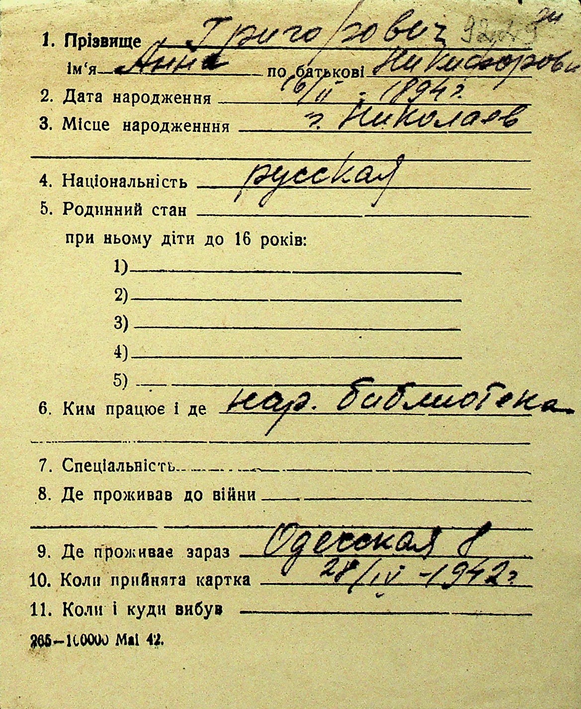 • • Перелік карток до фонду № Н-1016