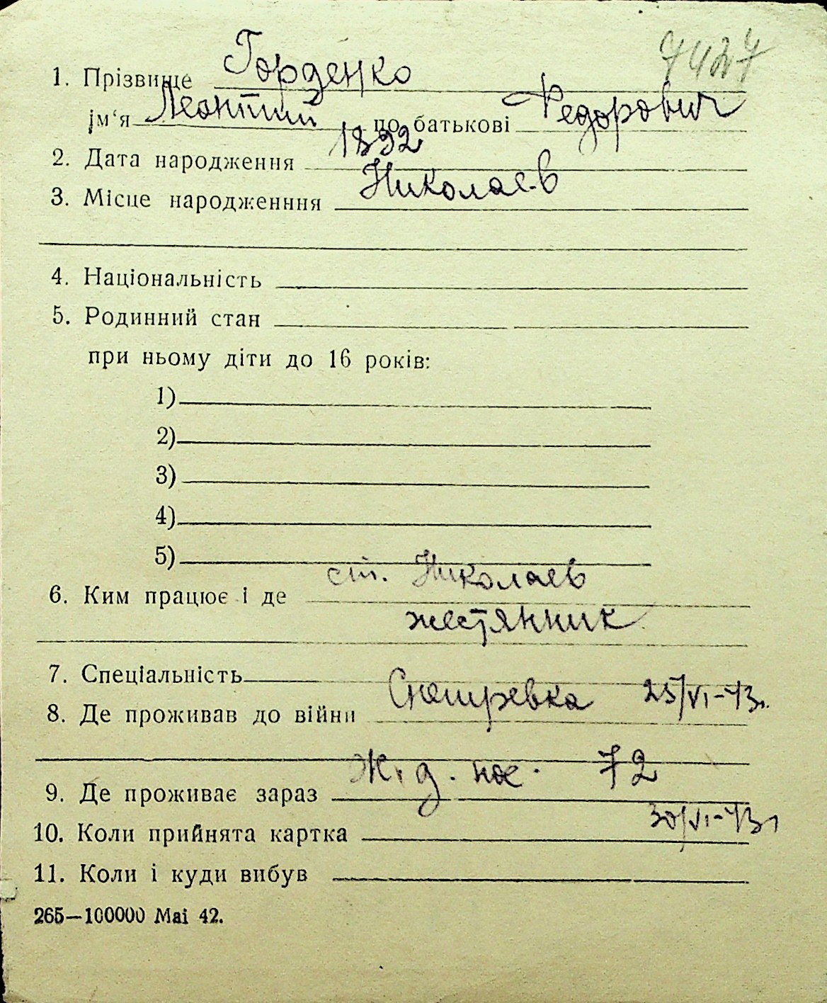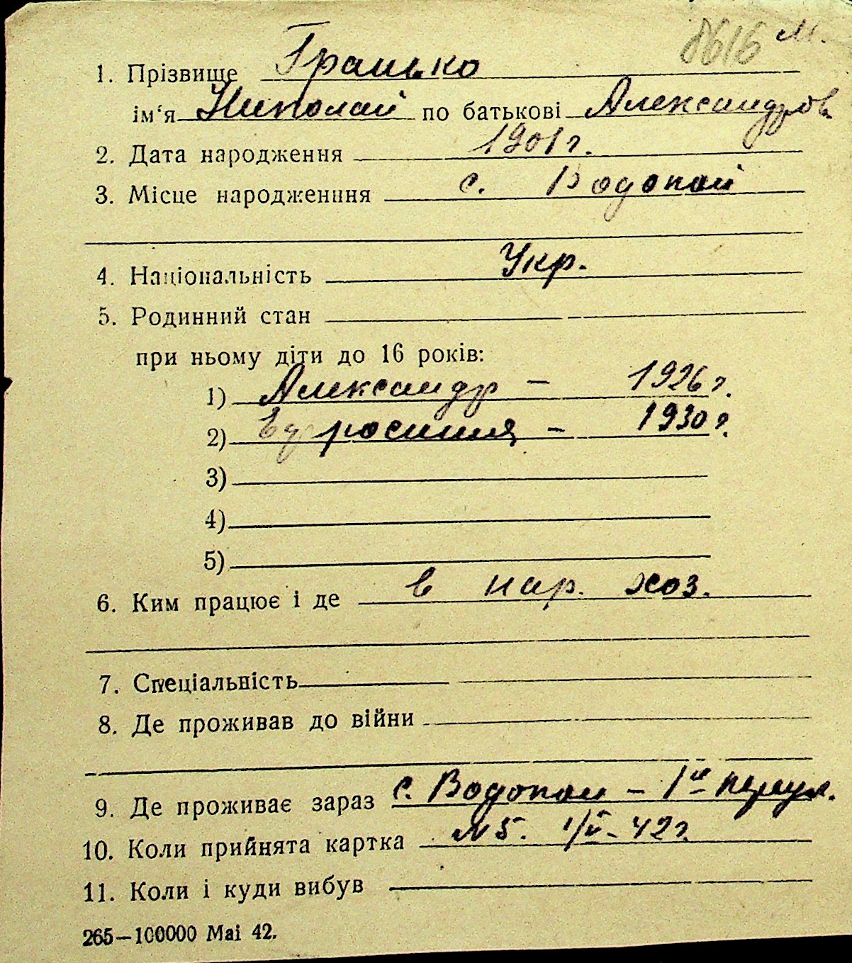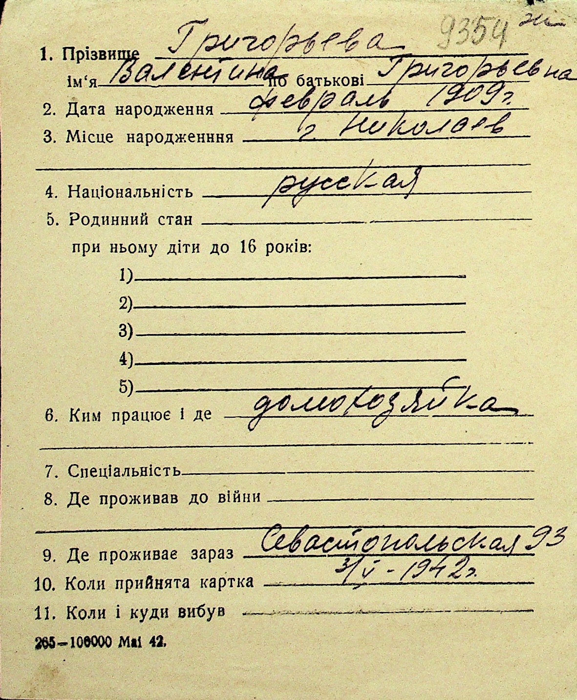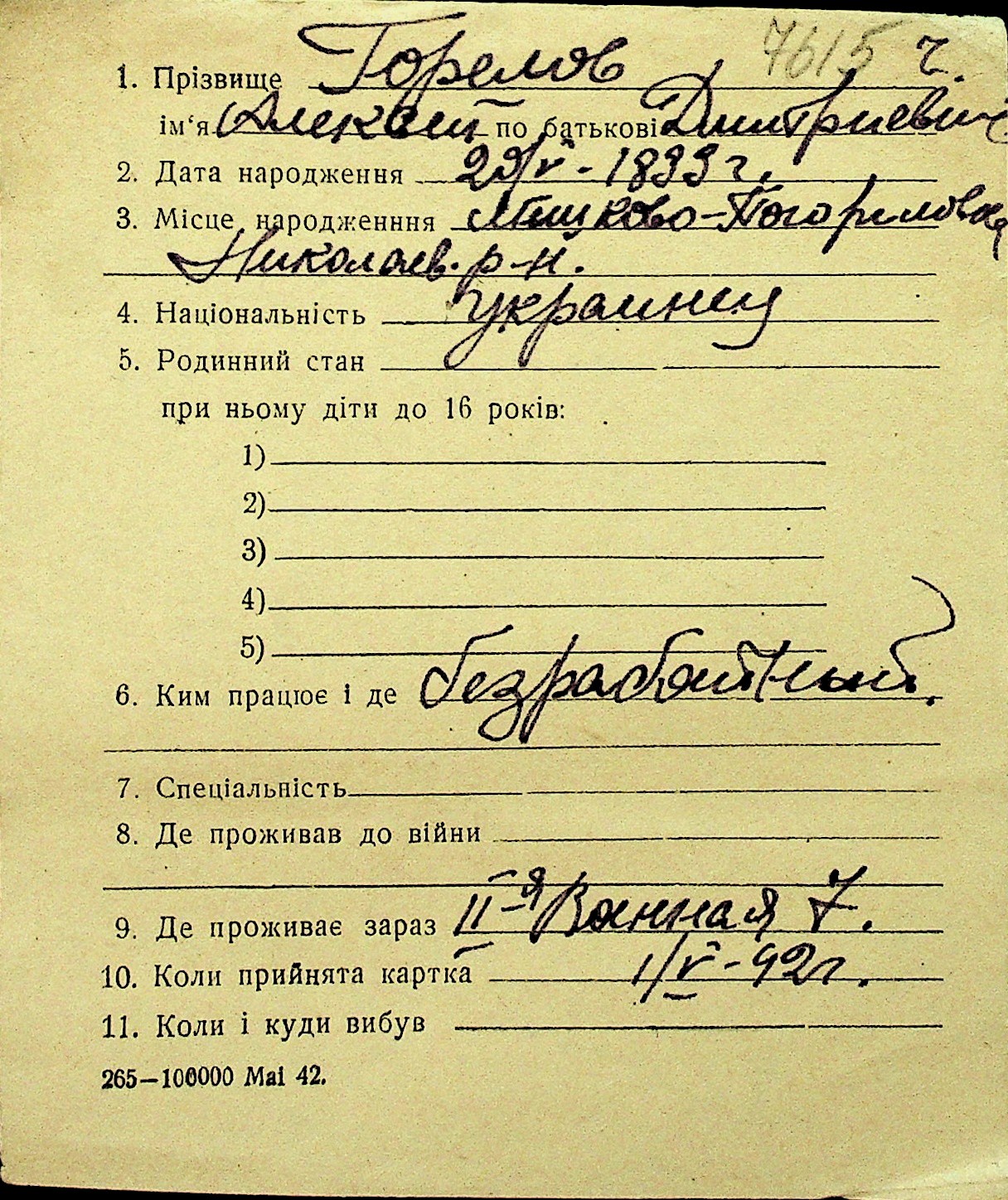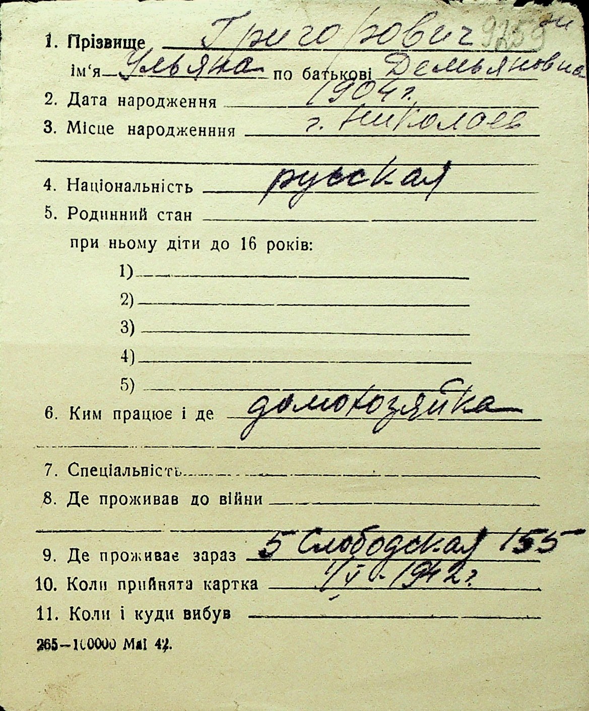 • • Перелік карток до фонду № Н-1016