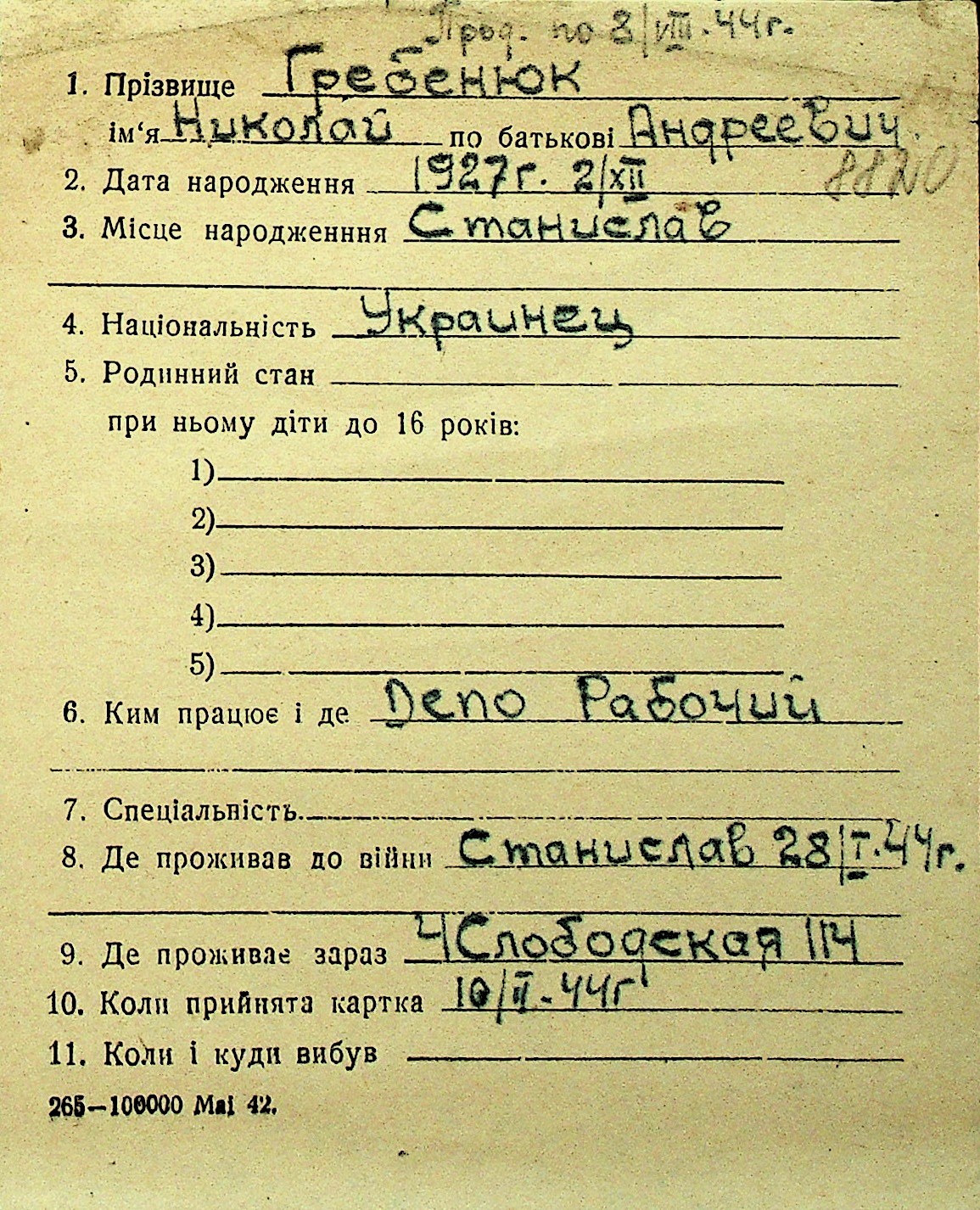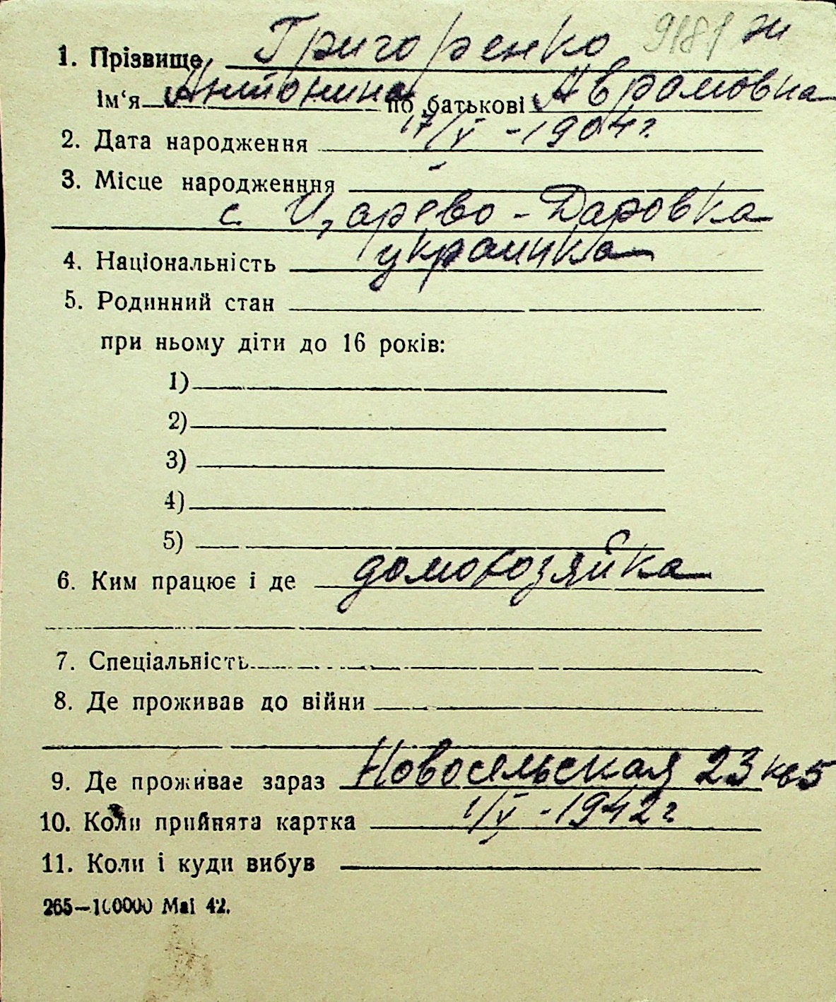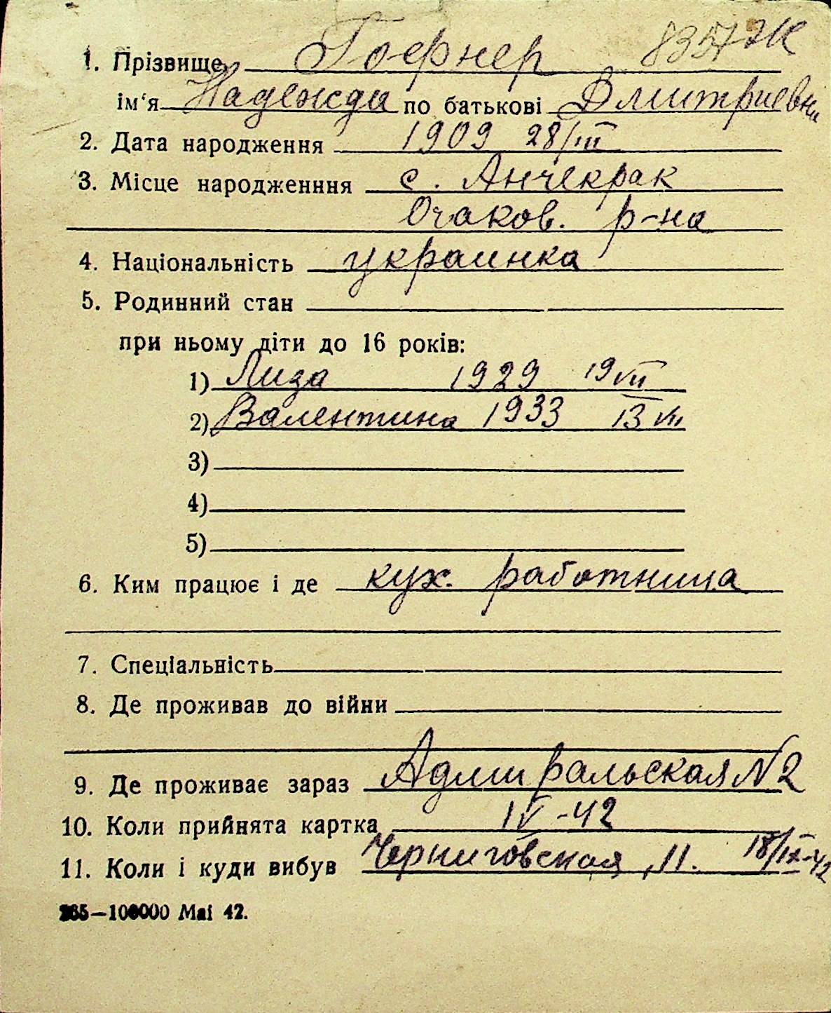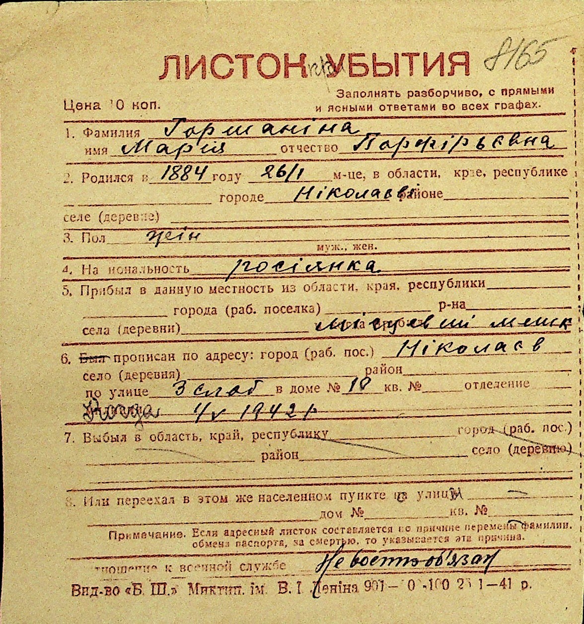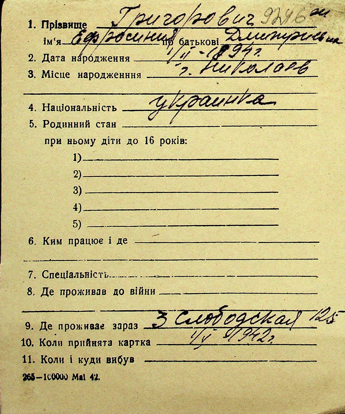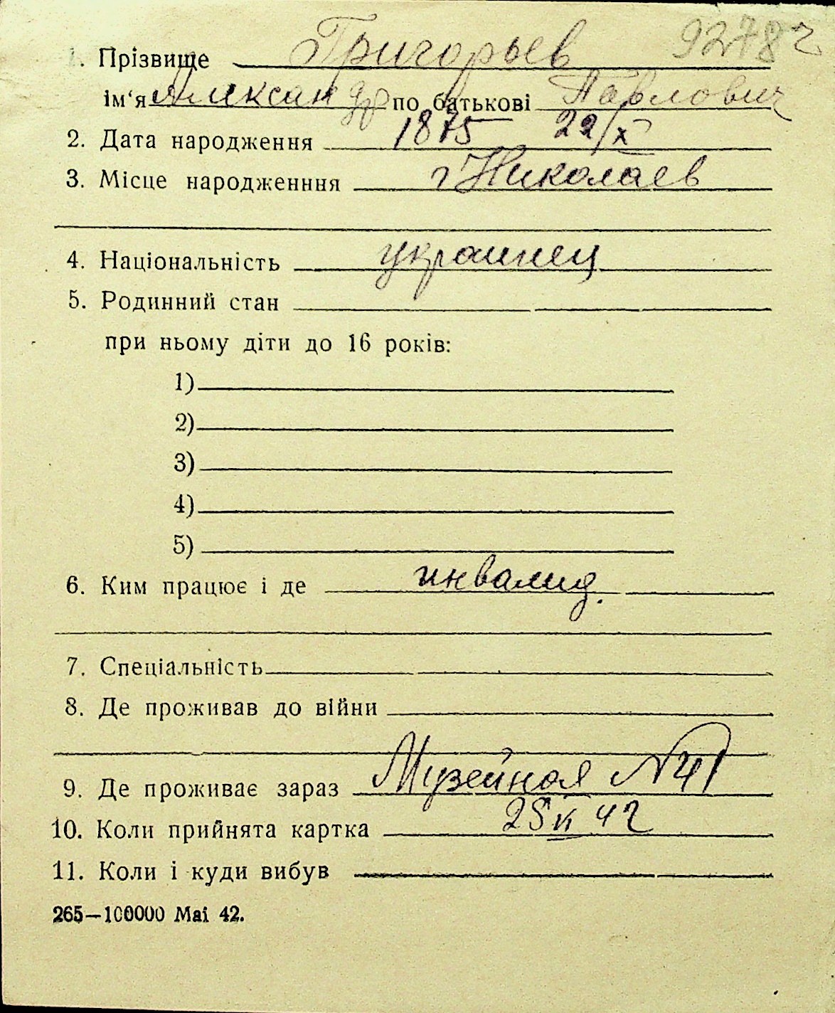 • • Перелік карток до фонду № Н-1016