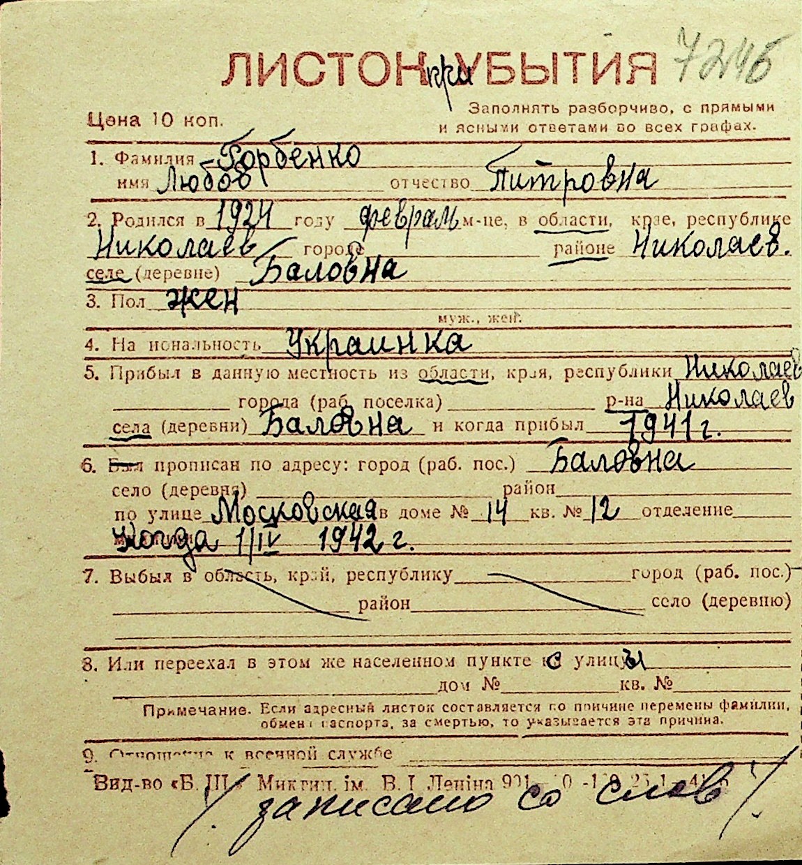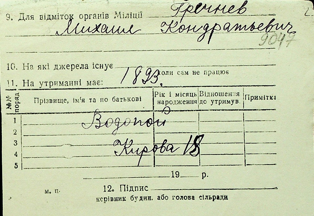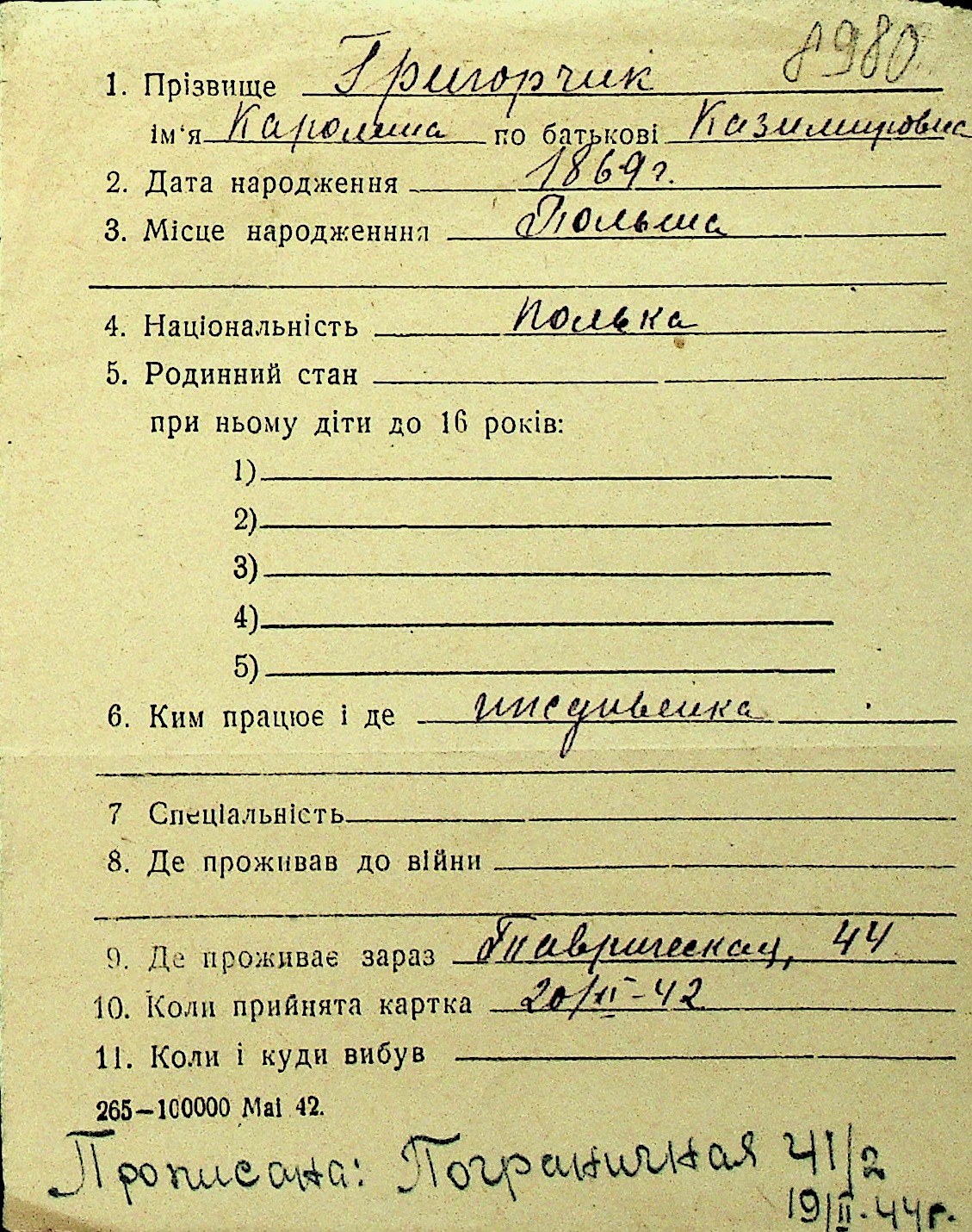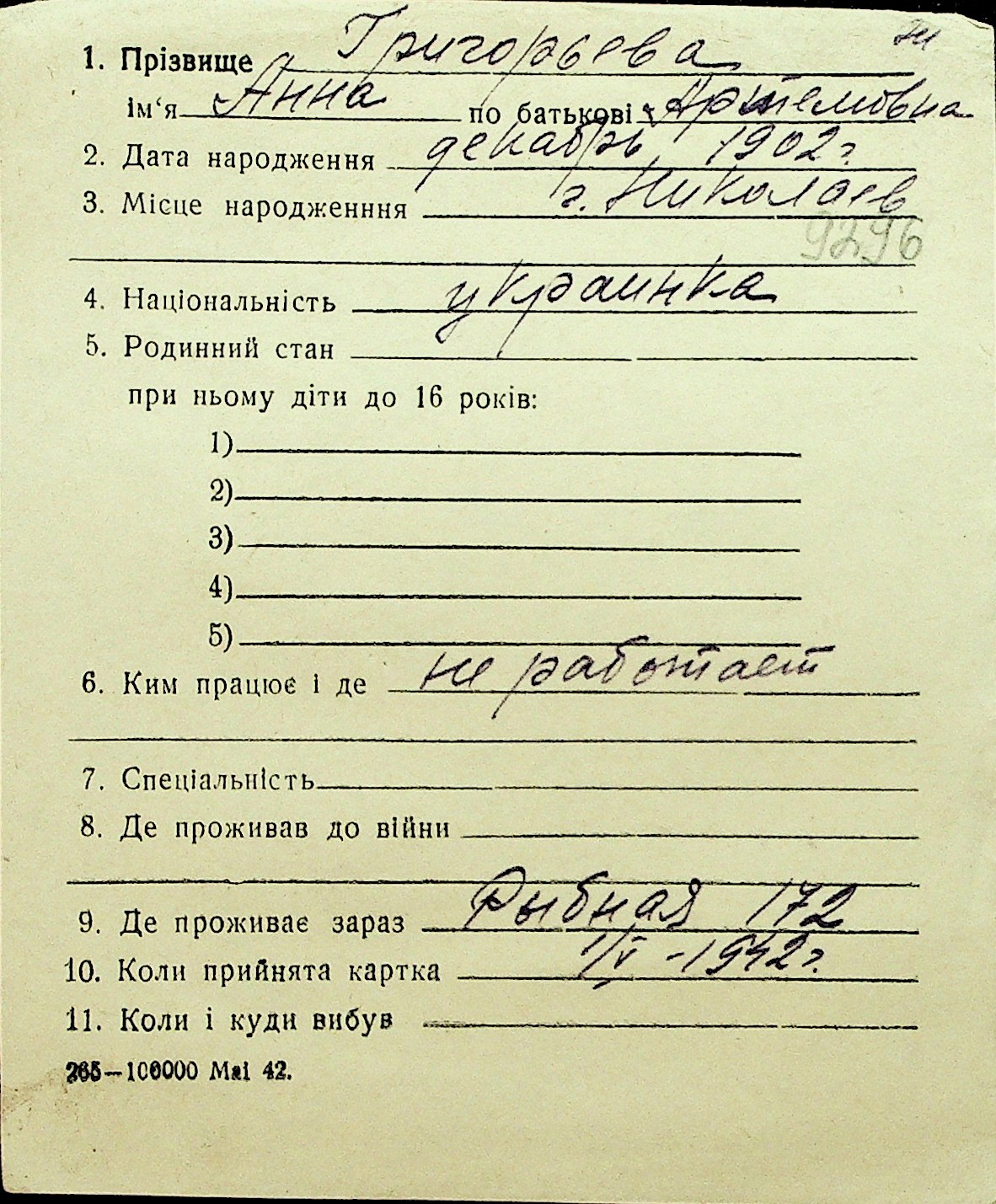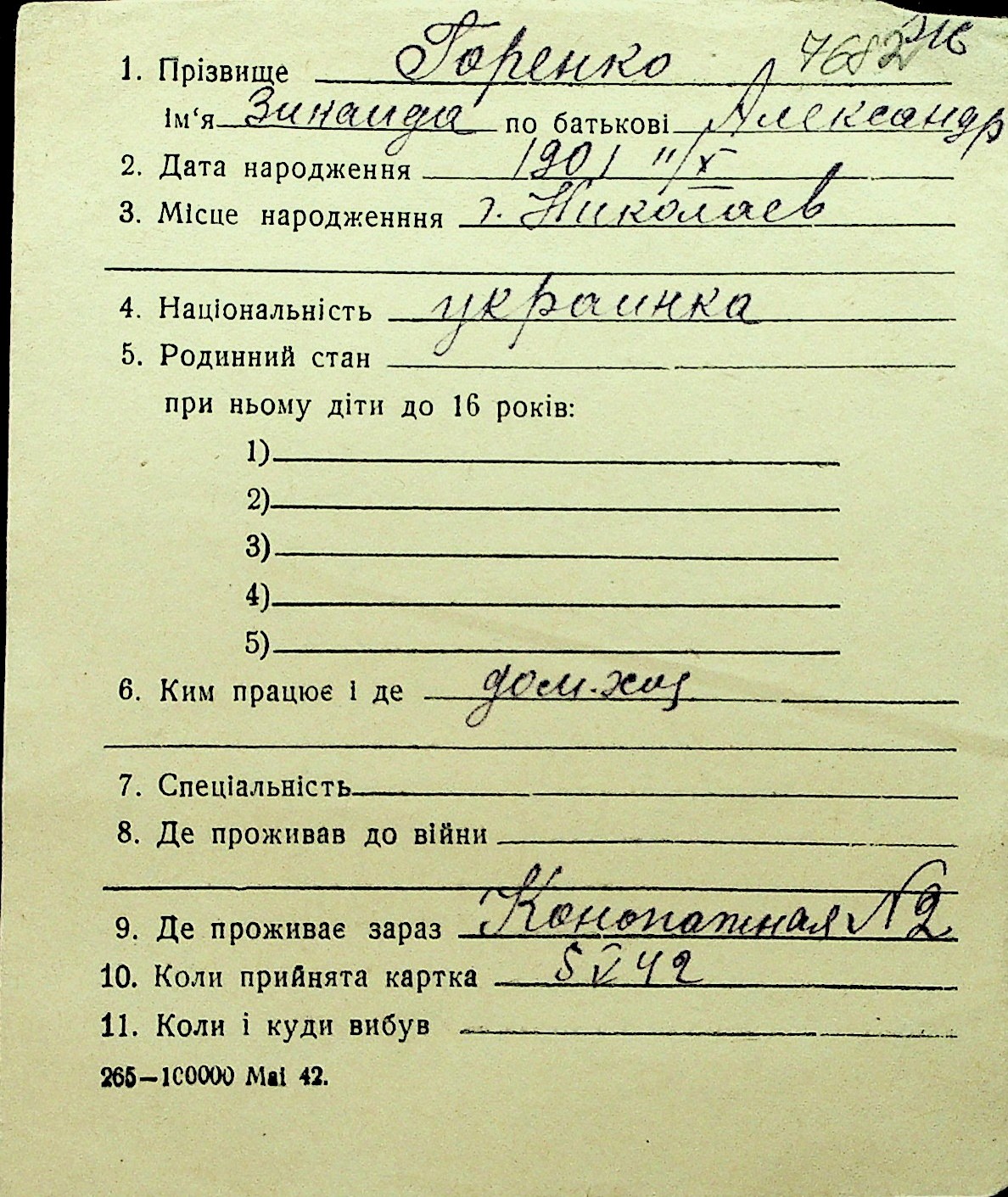 • • Перелік карток до фонду № Н-1016