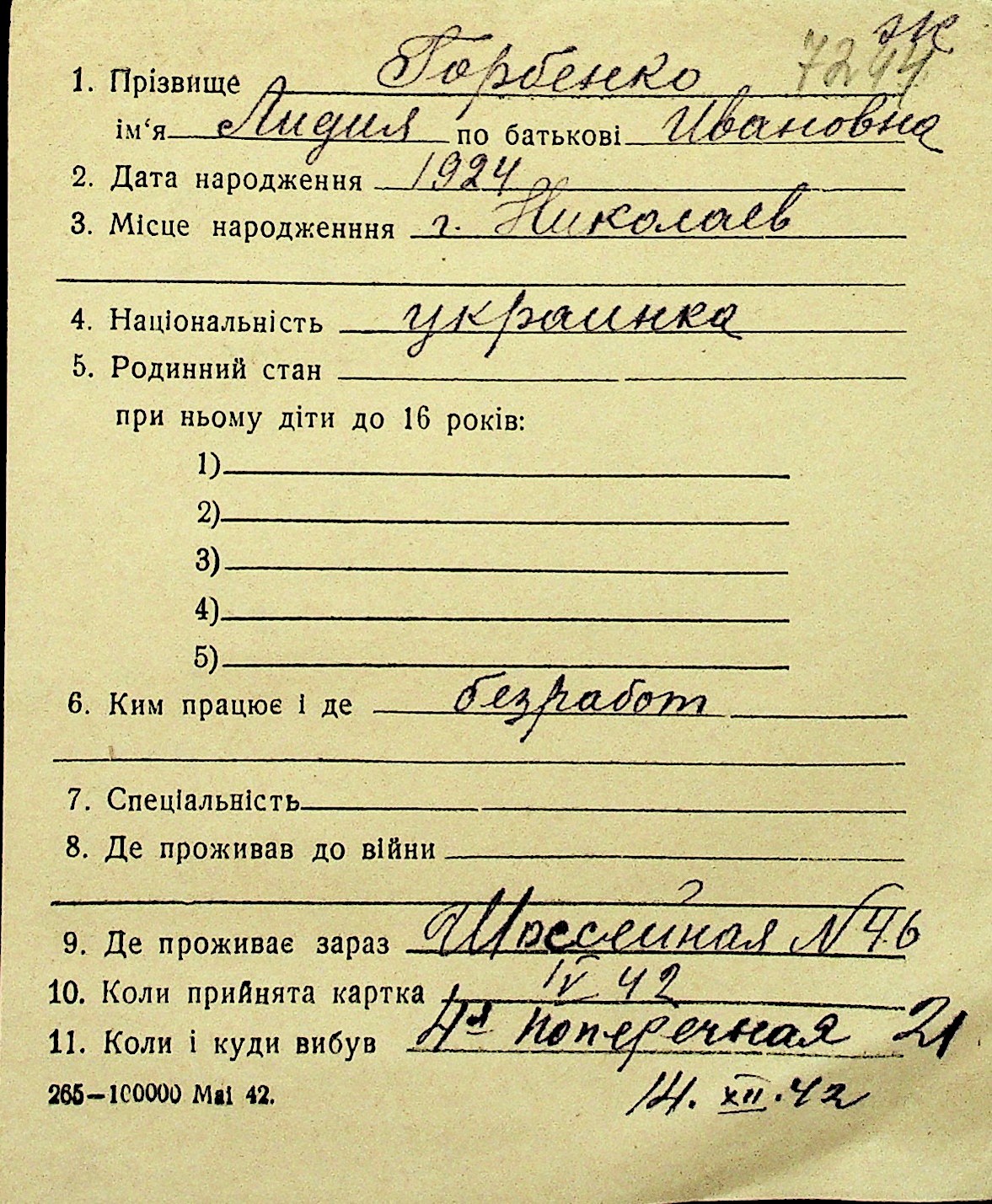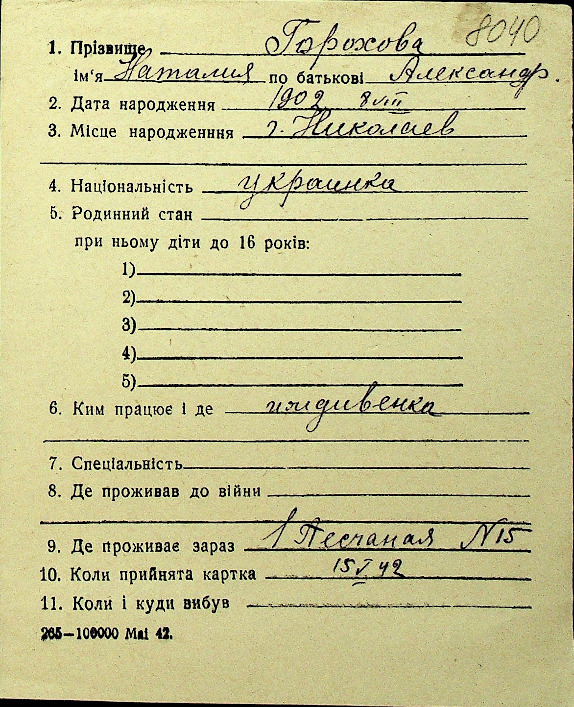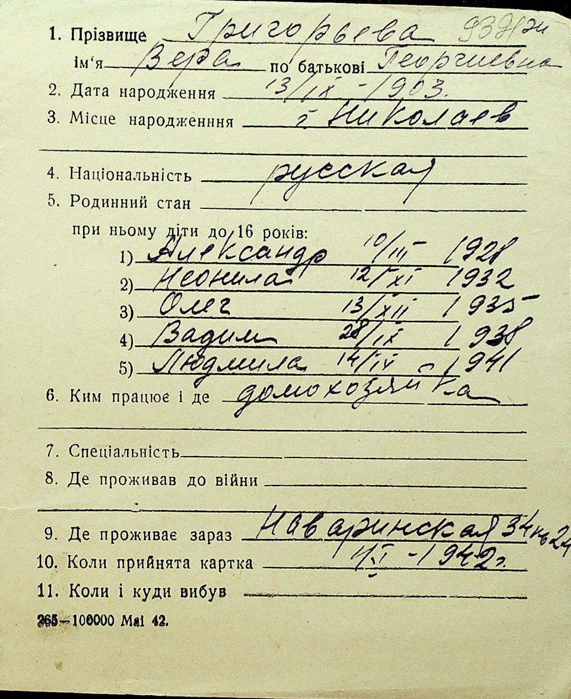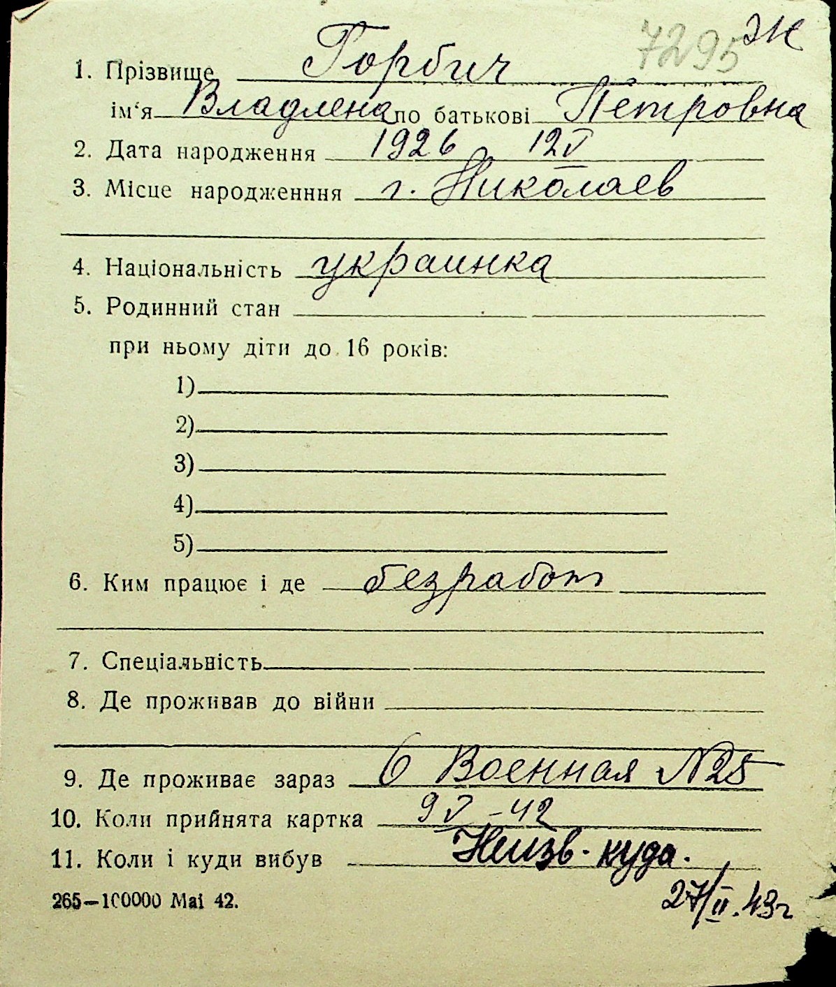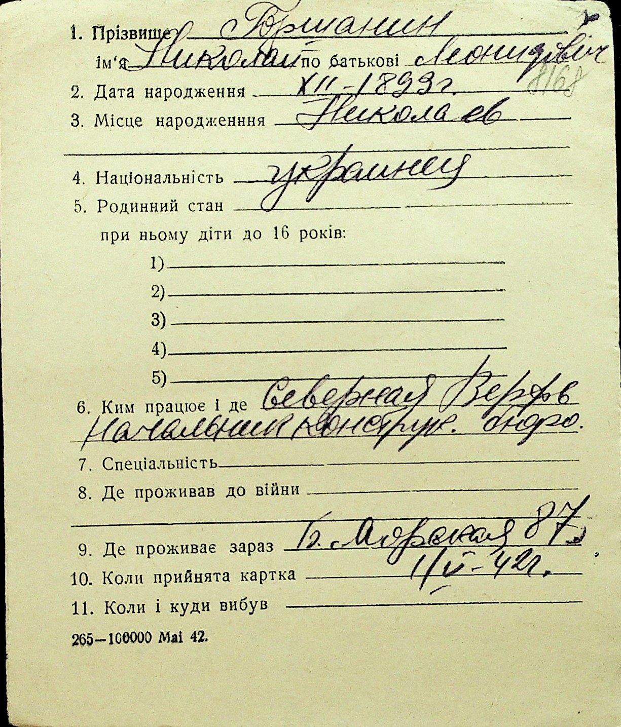 • • Перелік карток до фонду № Н-1016