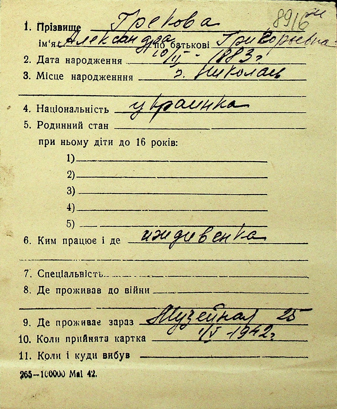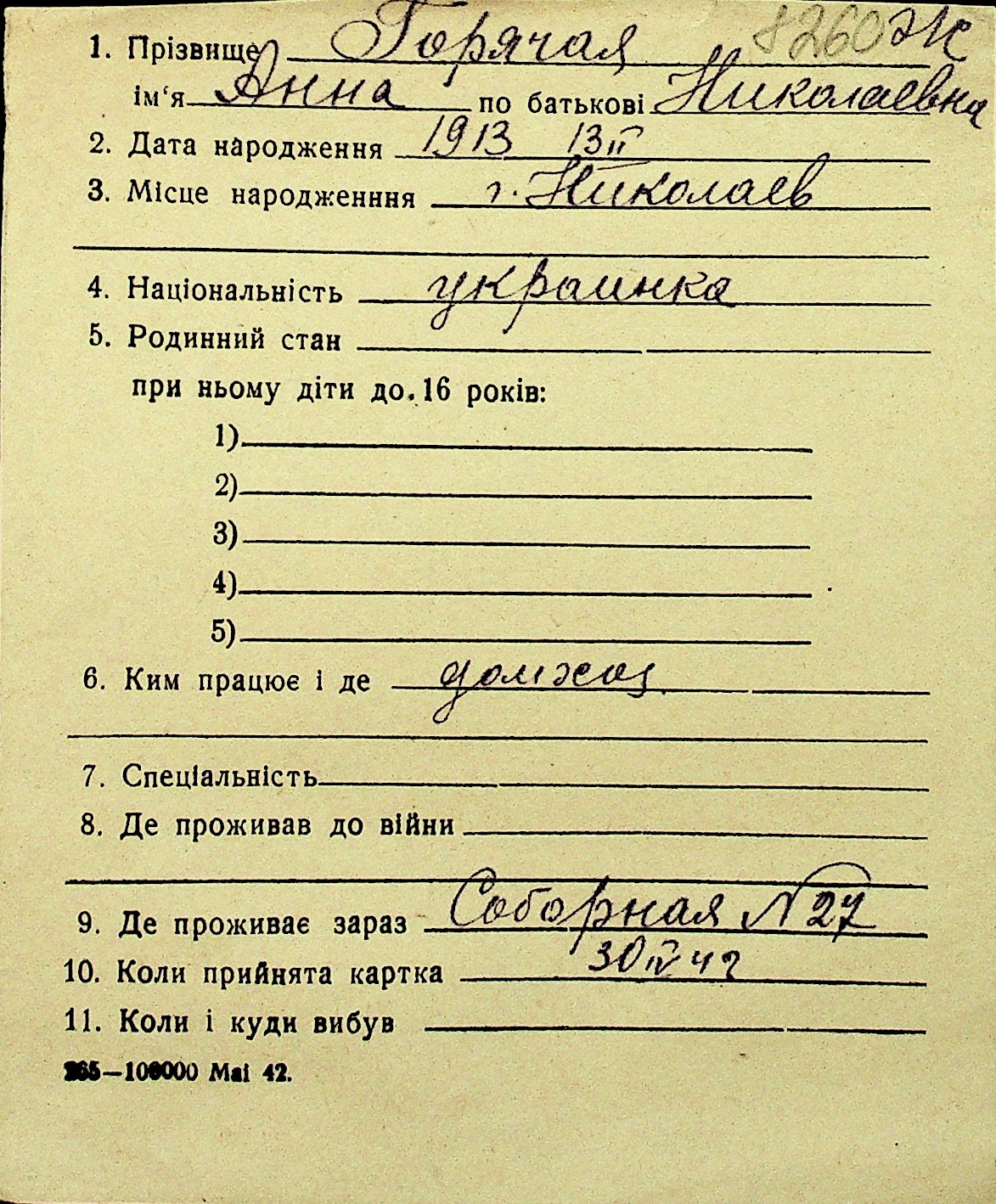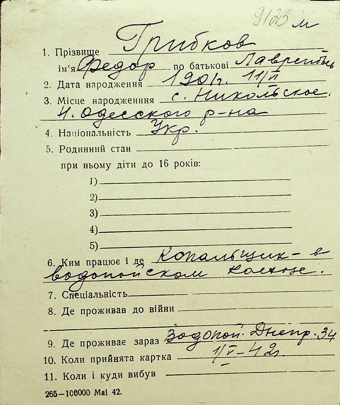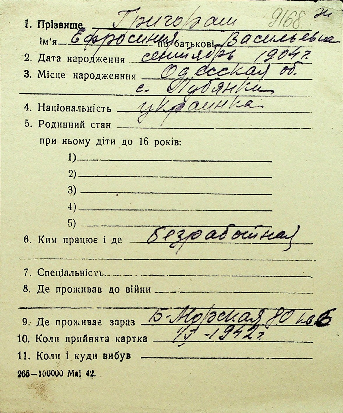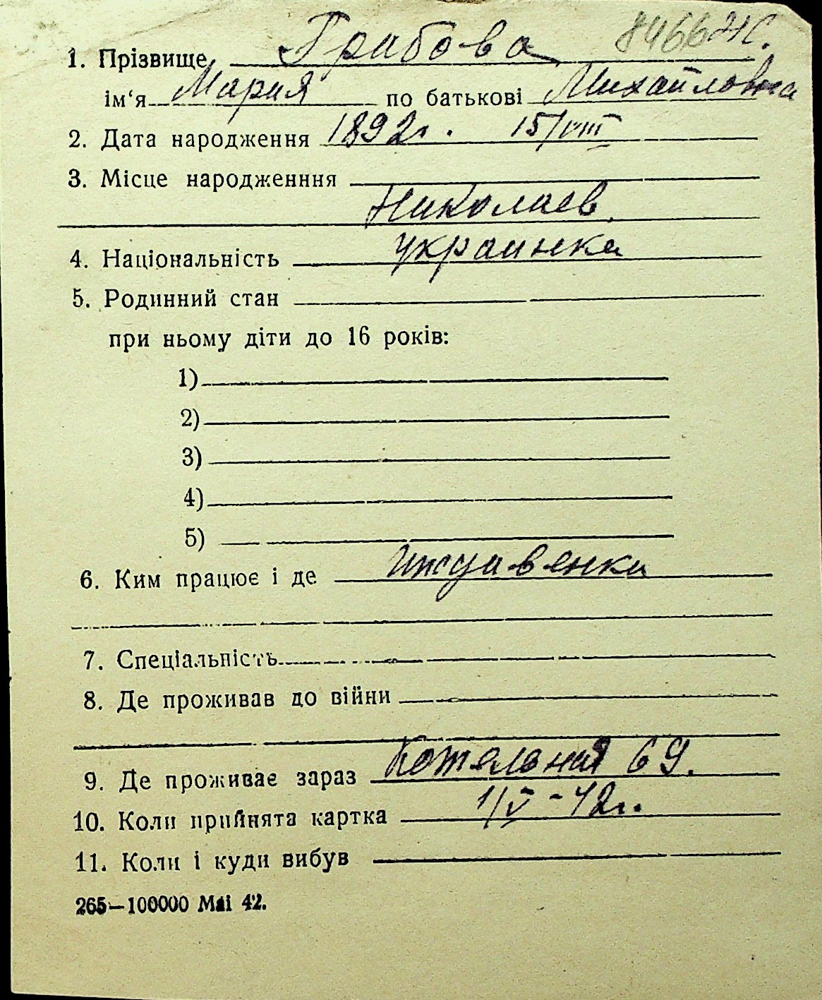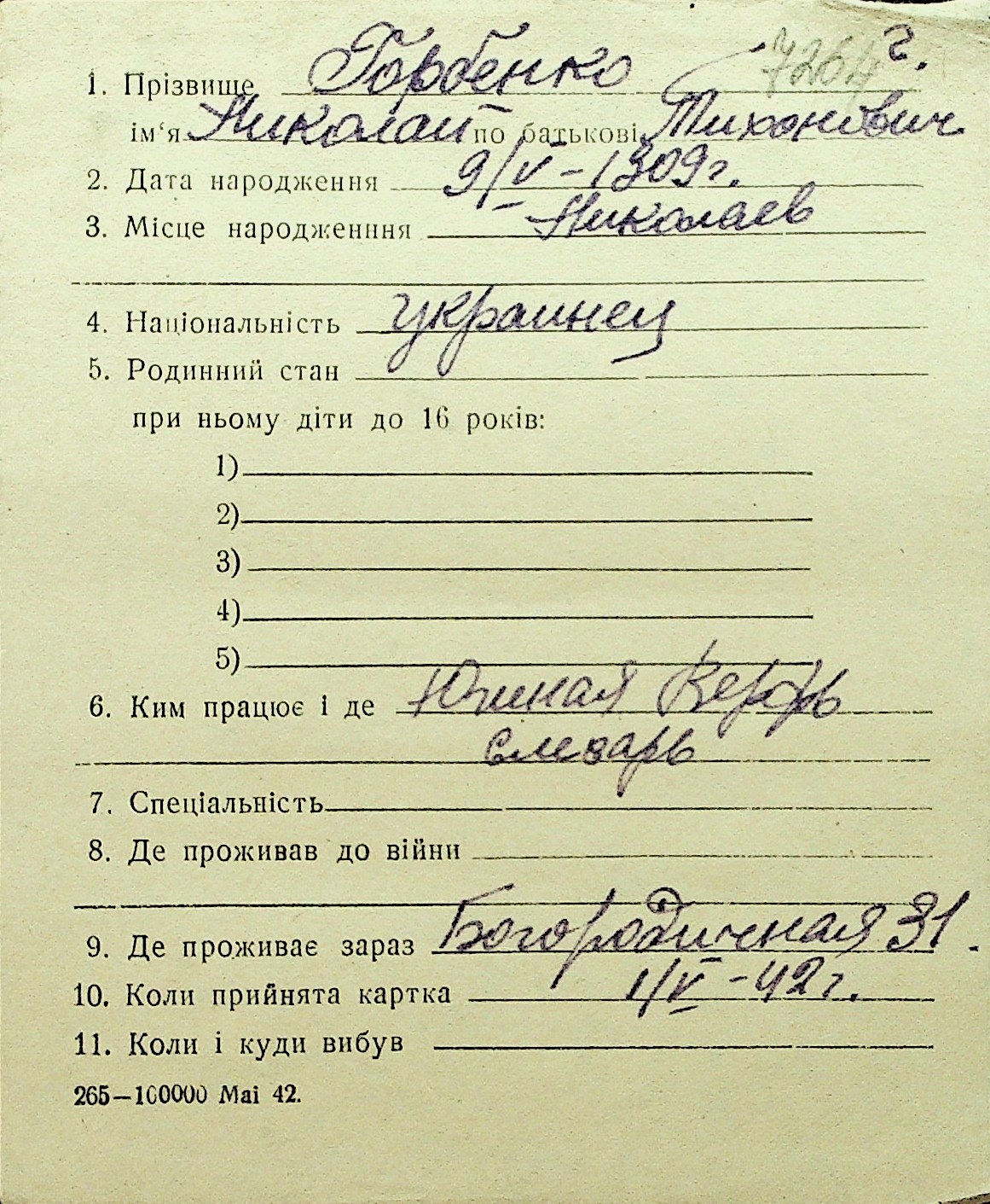 • • Перелік карток до фонду № Н-1016
