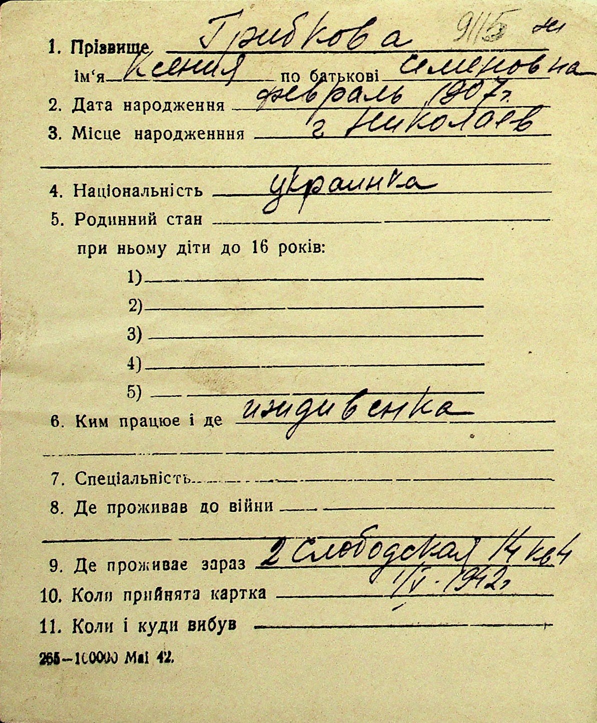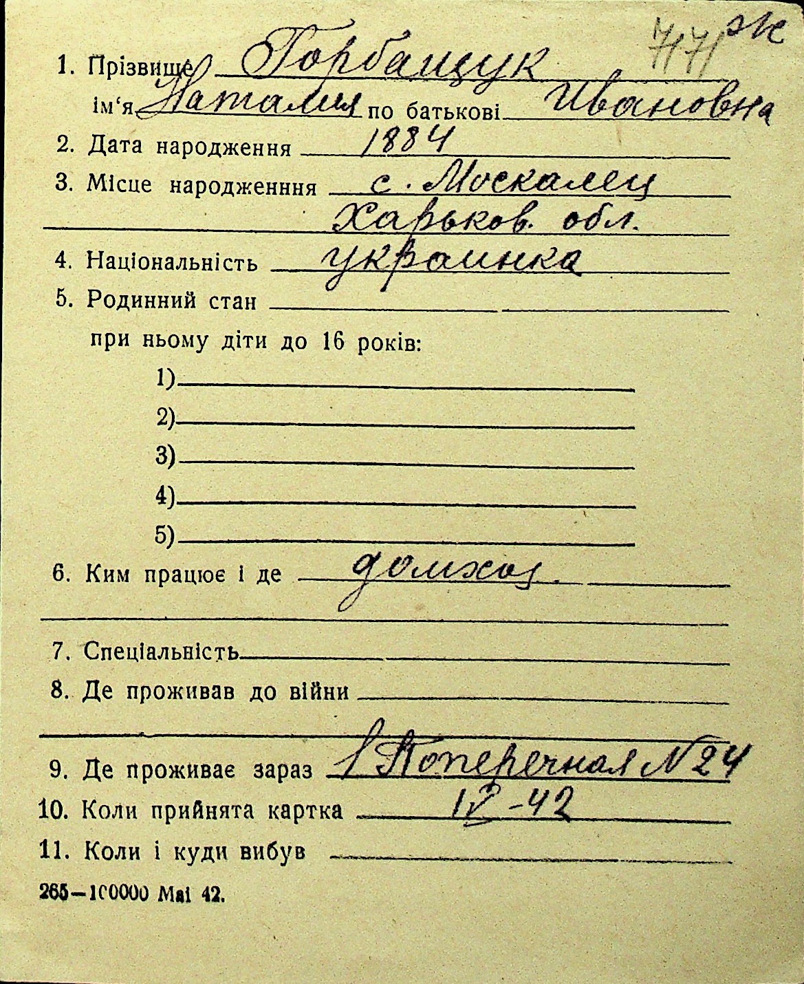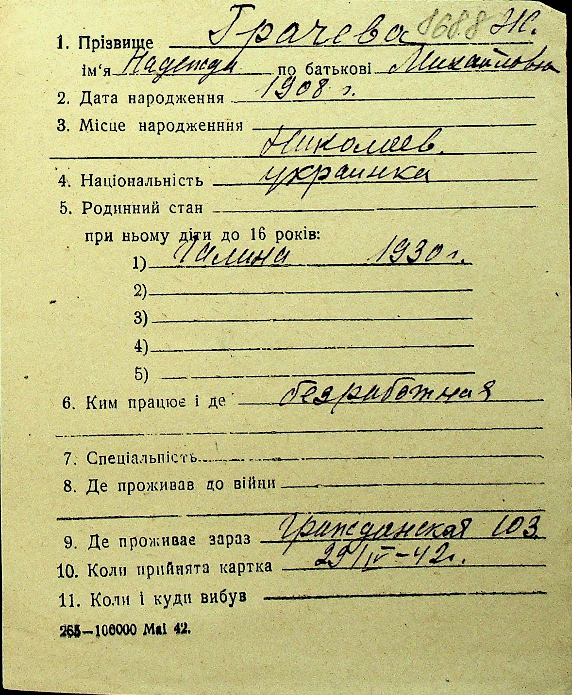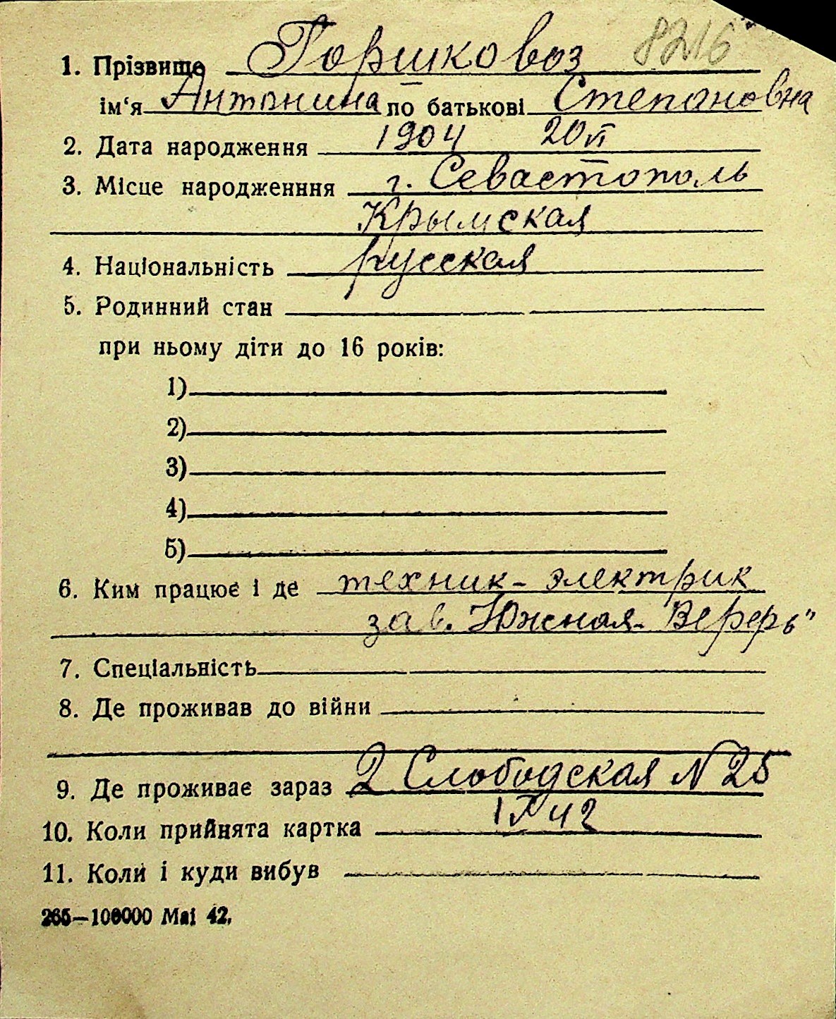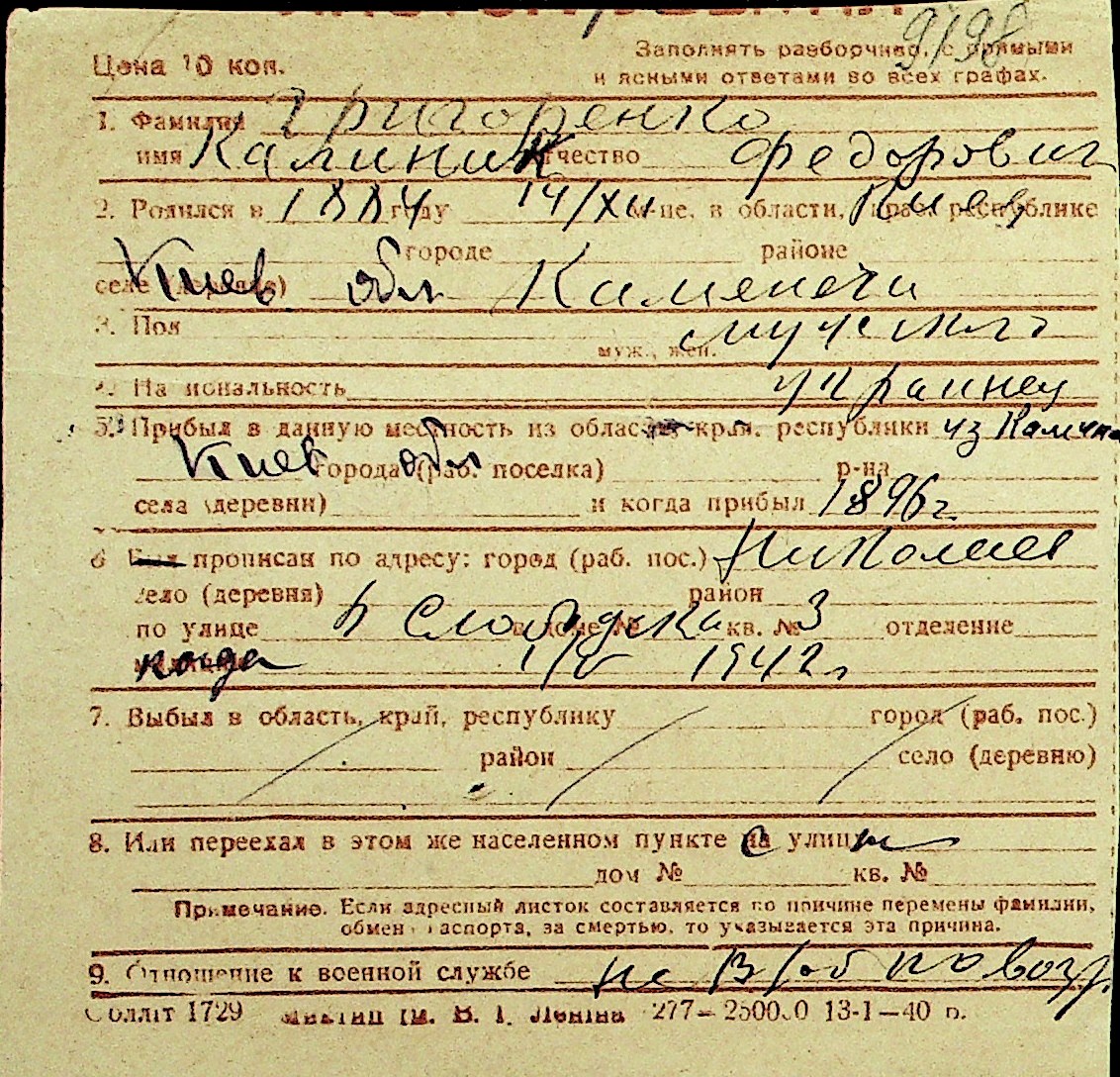 • • Перелік карток до фонду № Н-1016