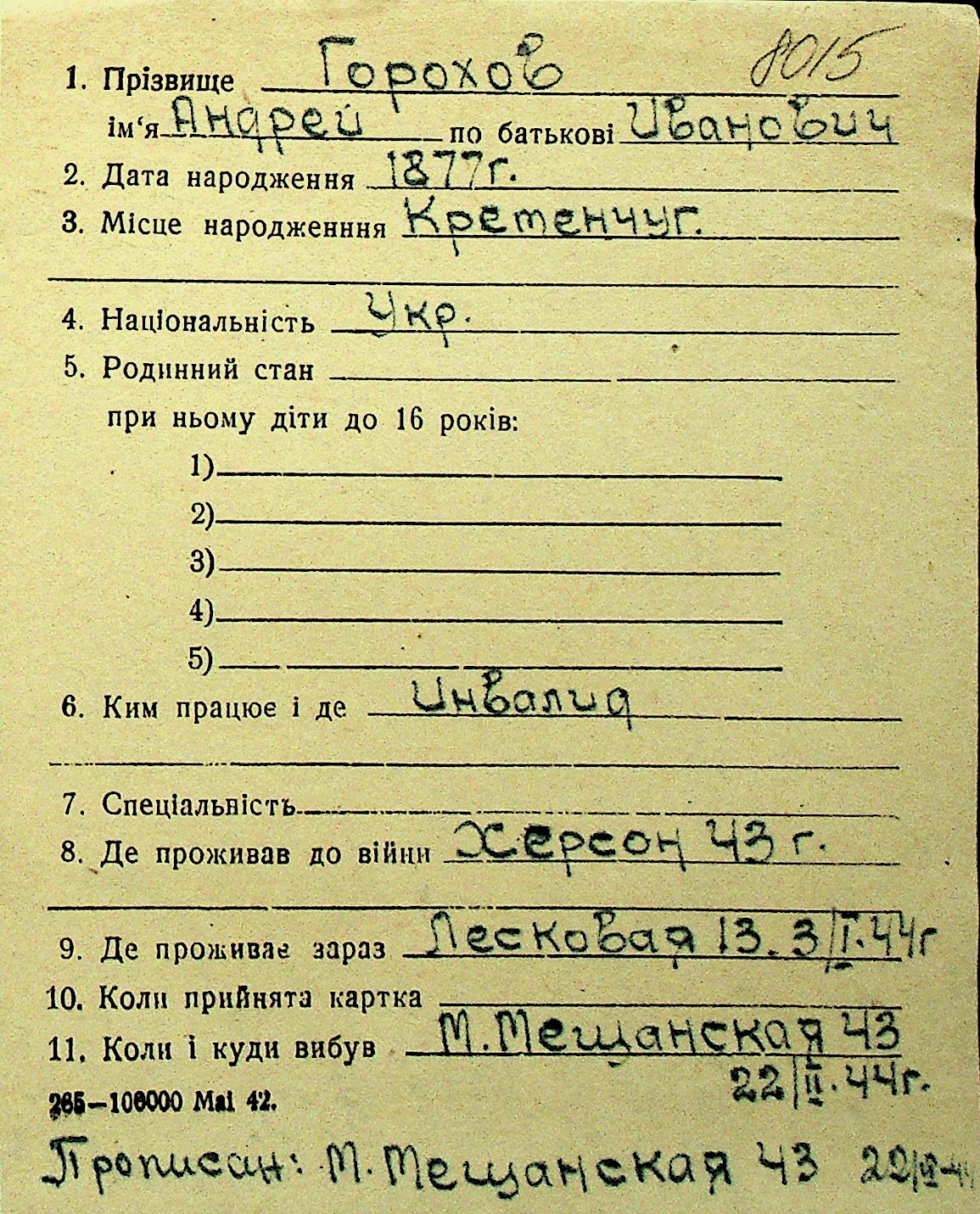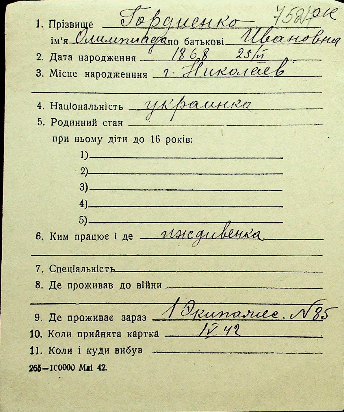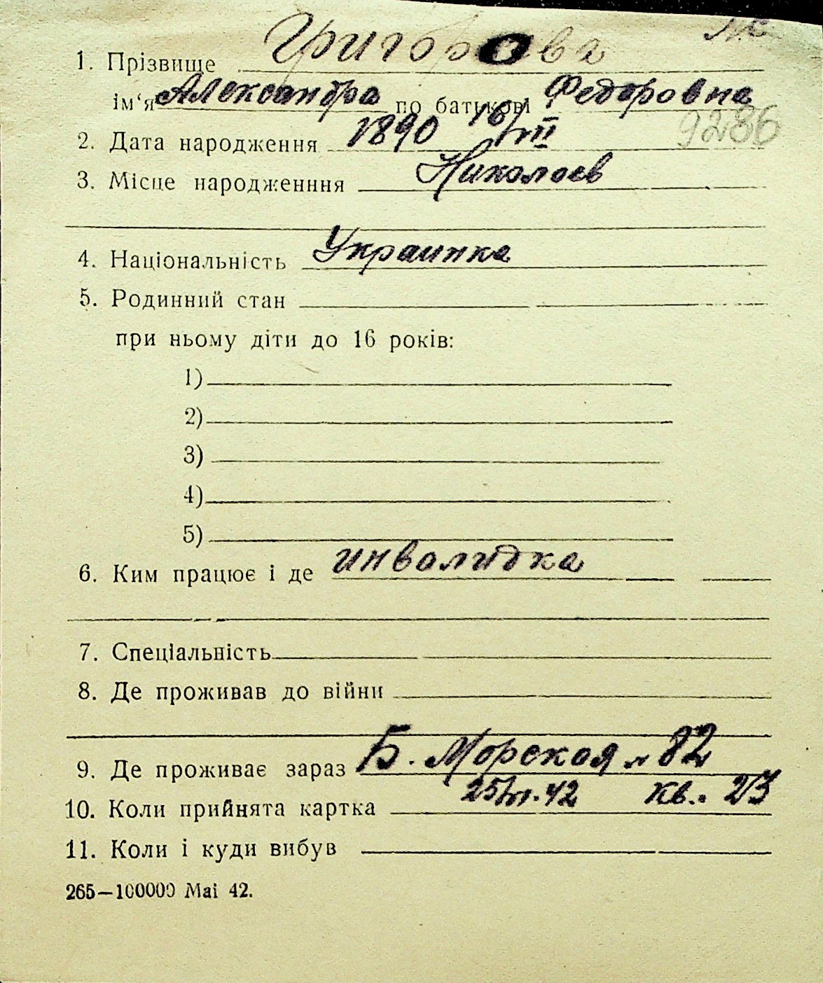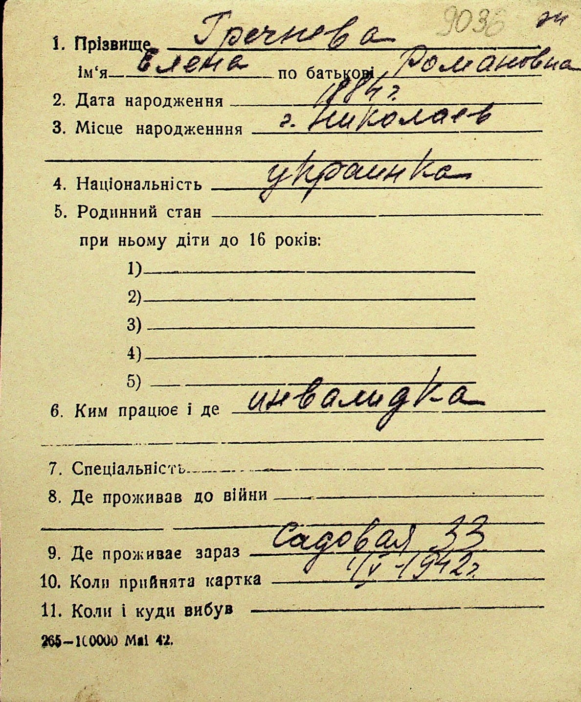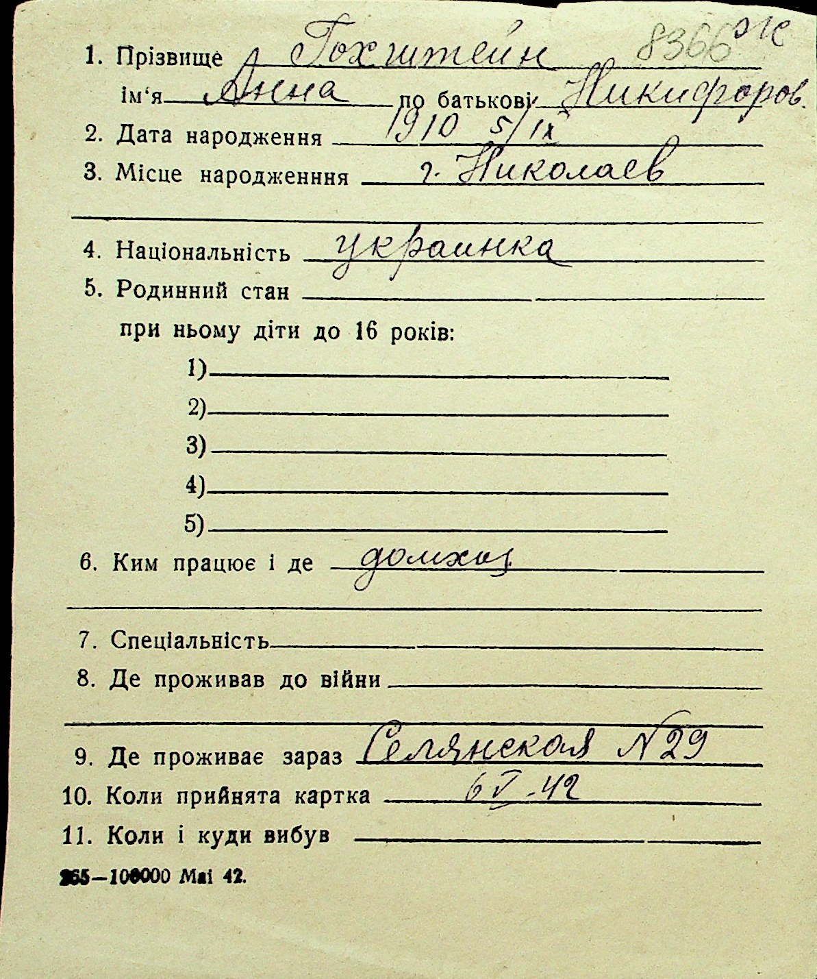 • • Перелік карток до фонду № Н-1016