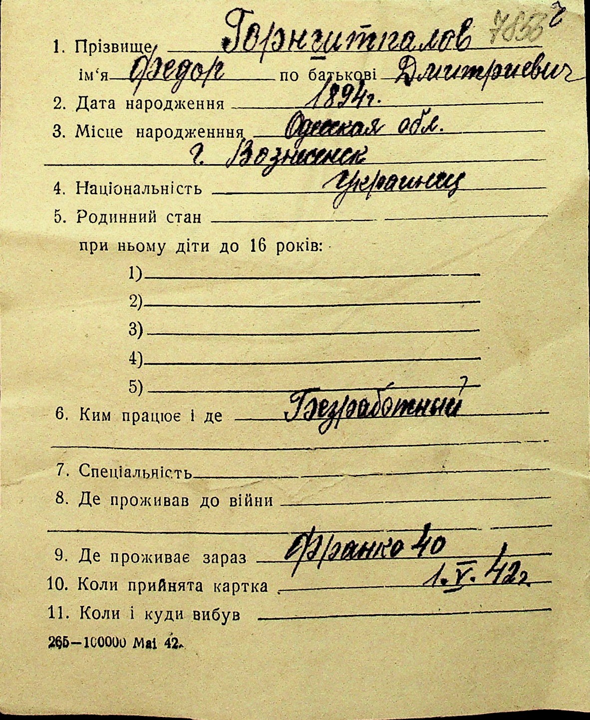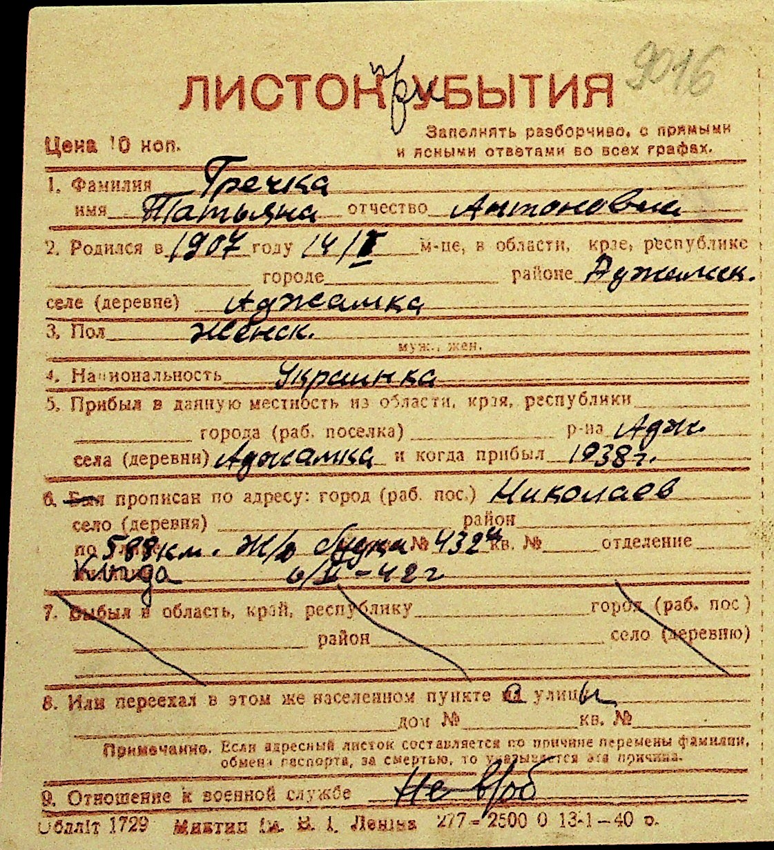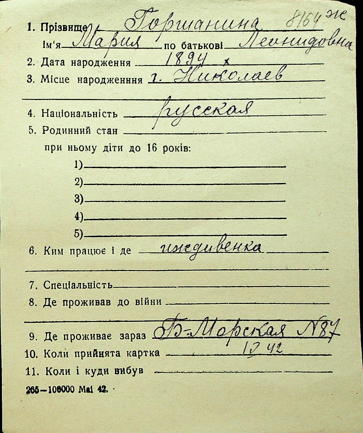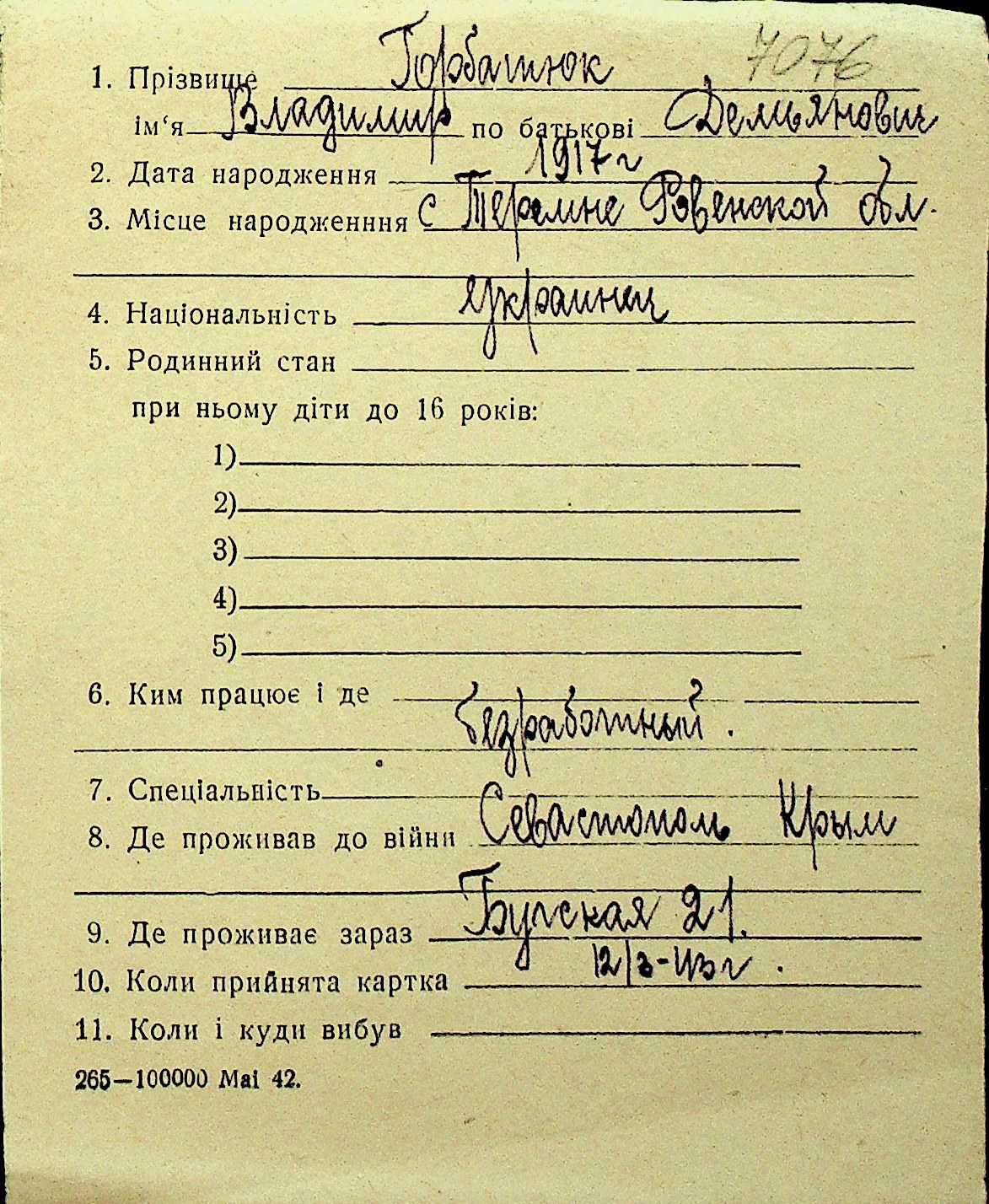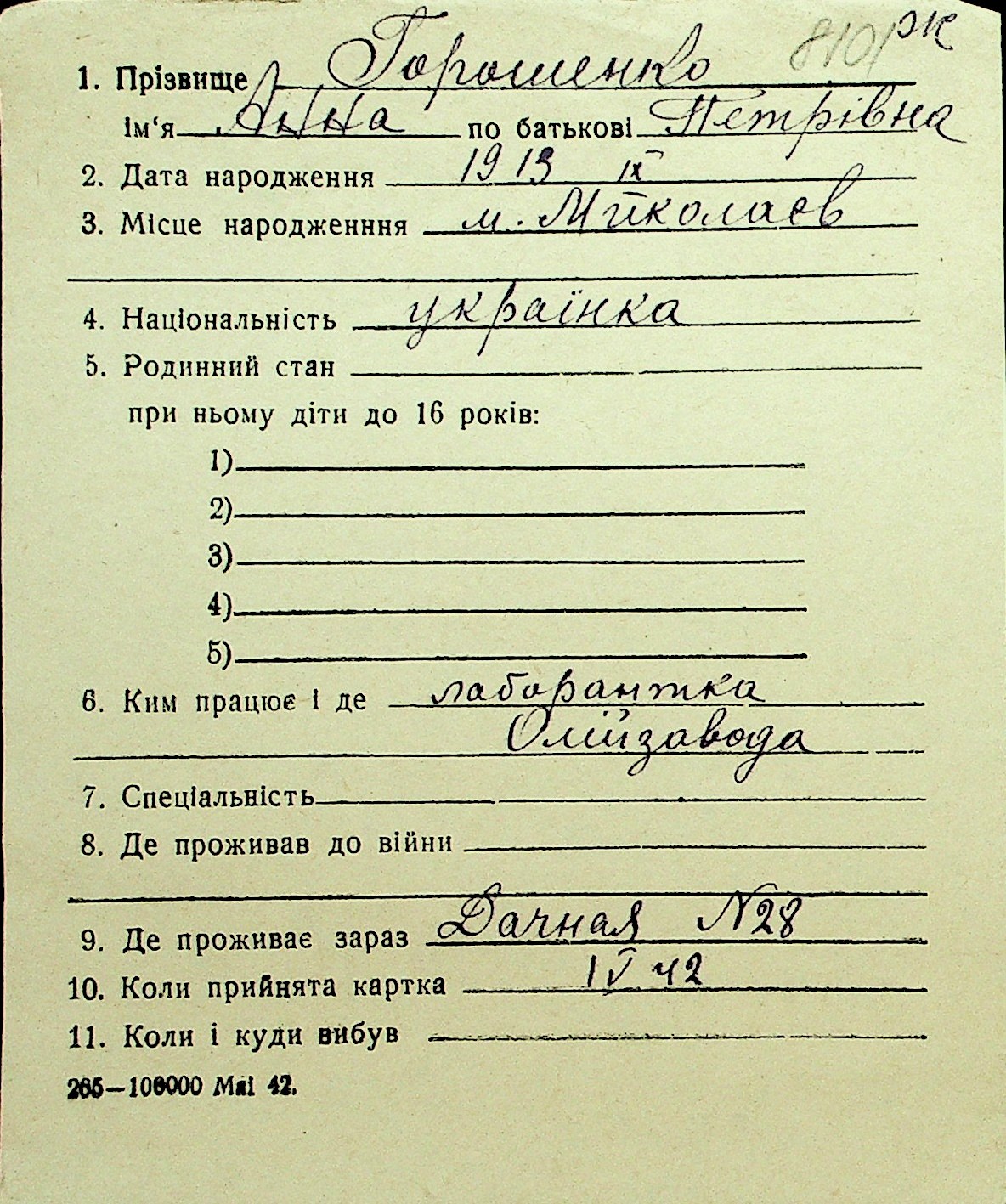 • • Перелік карток до фонду № Н-1016