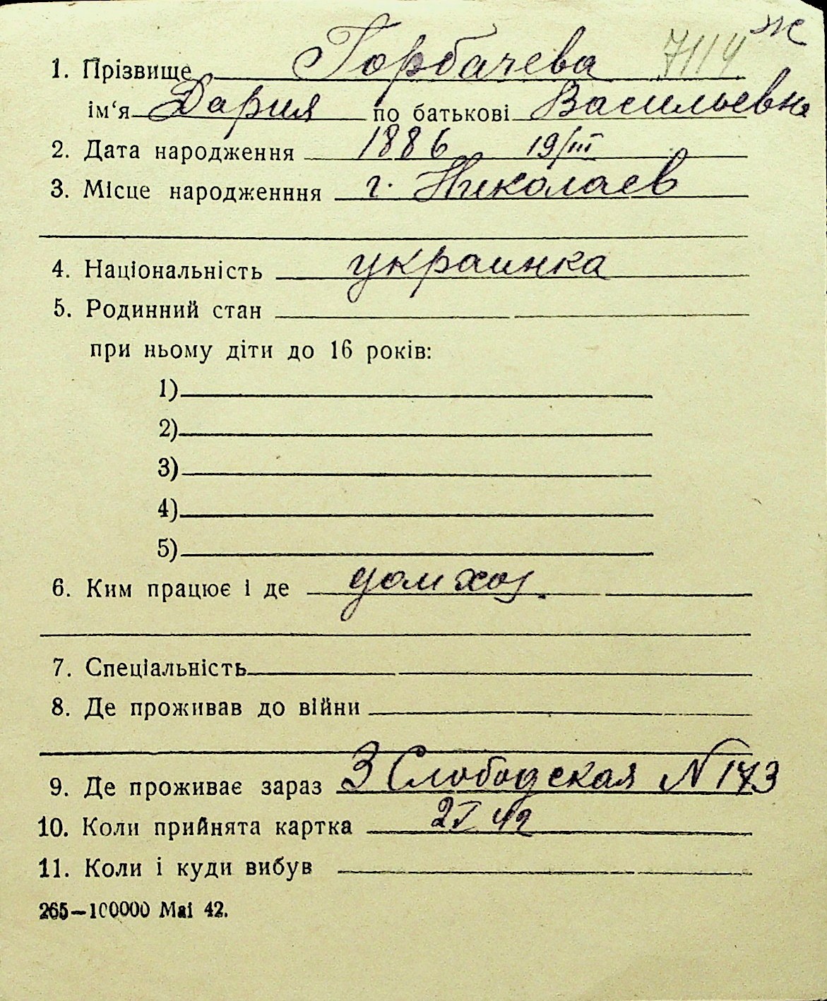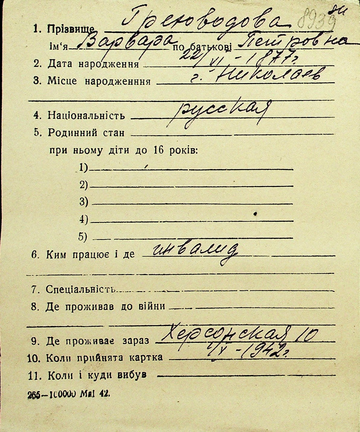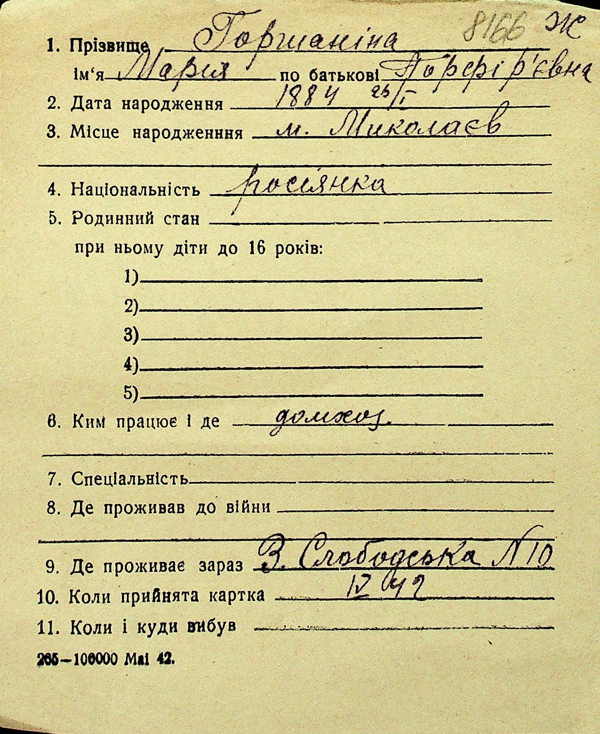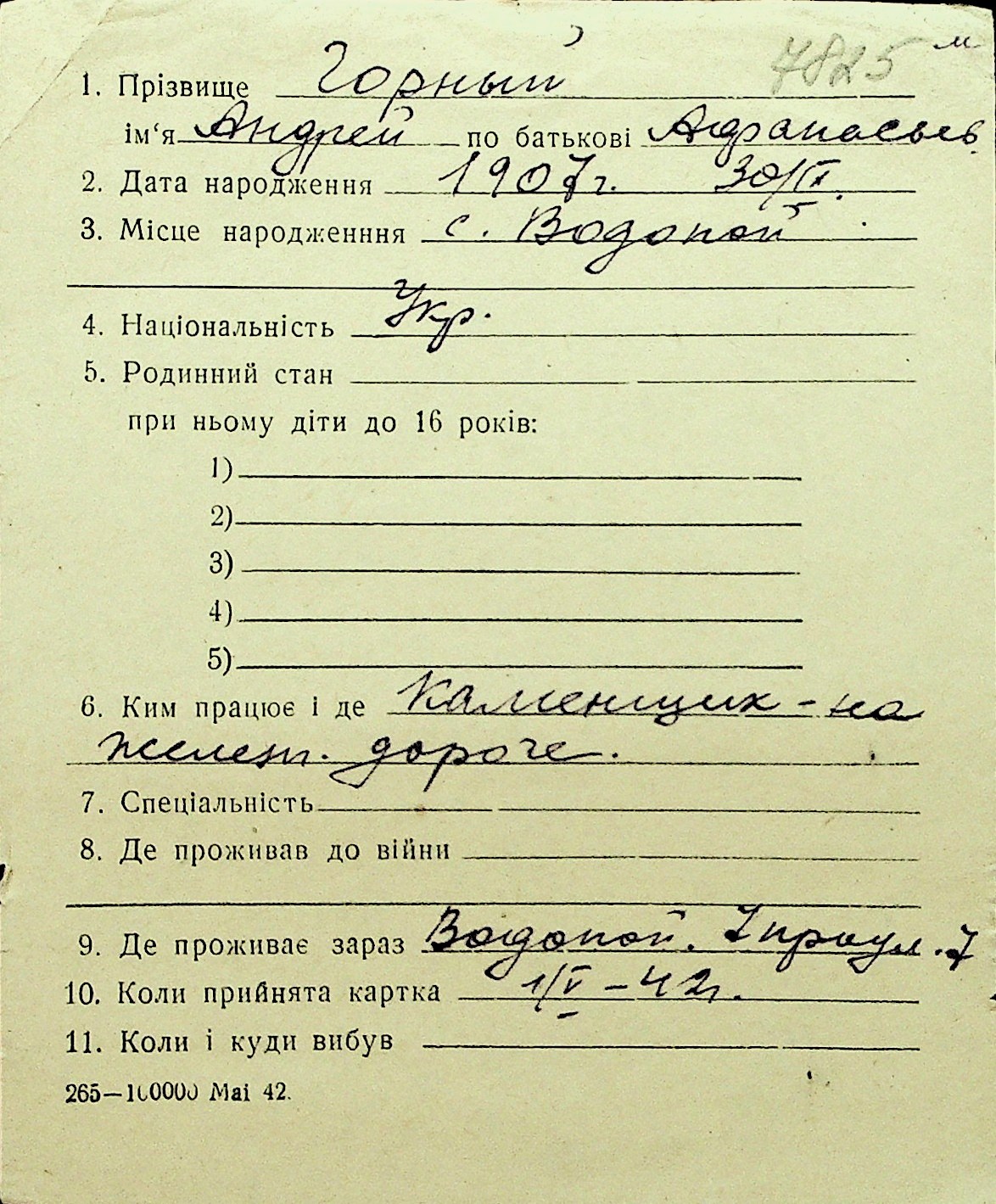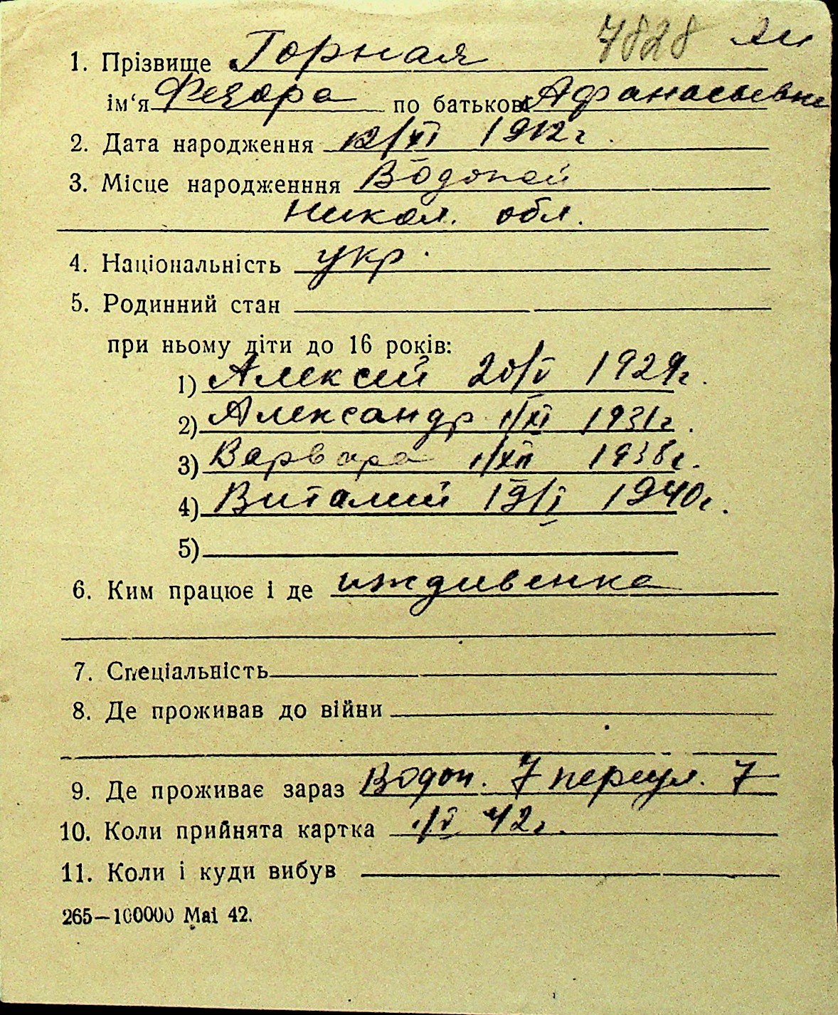 • • Перелік карток до фонду № Н-1016