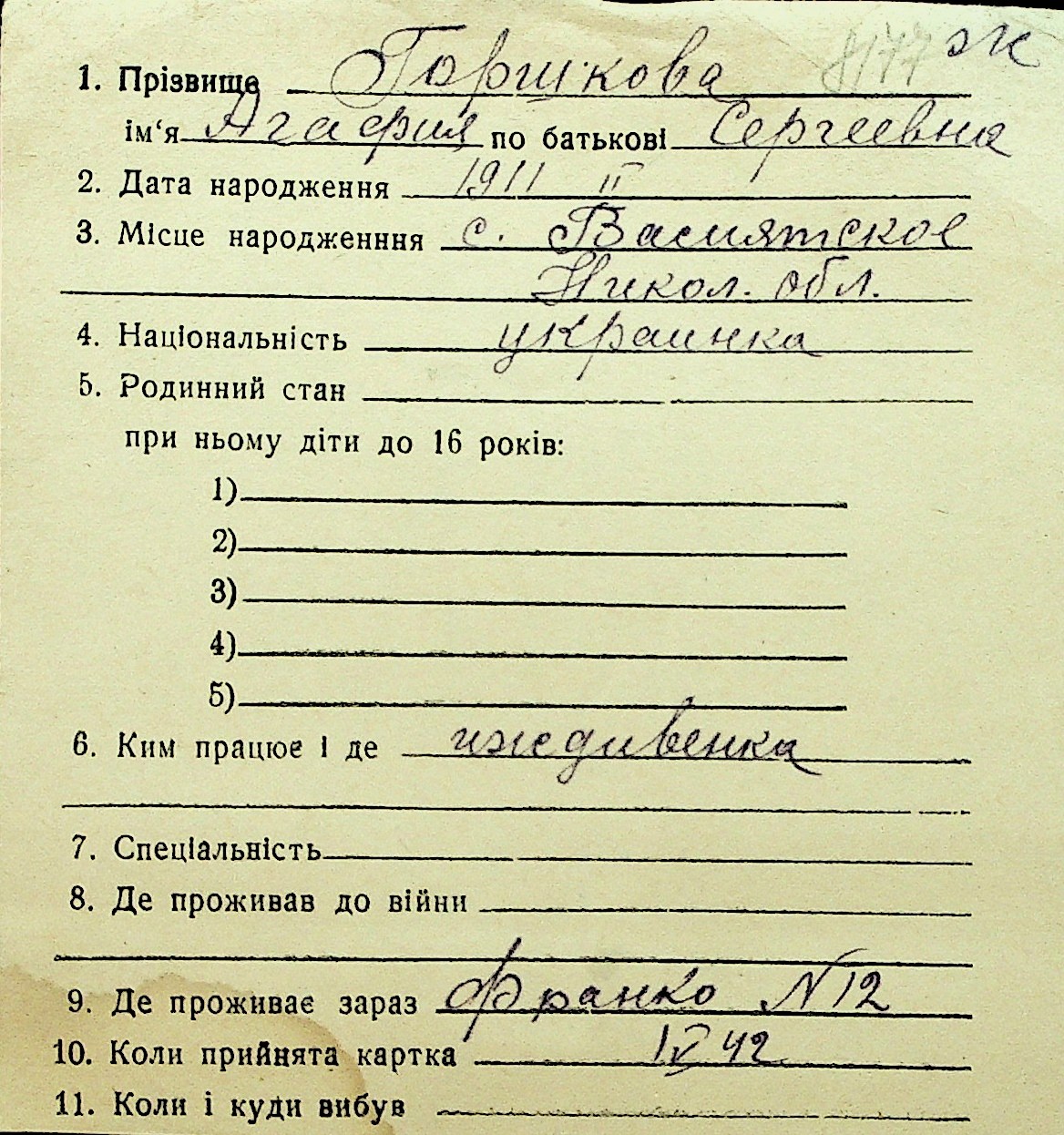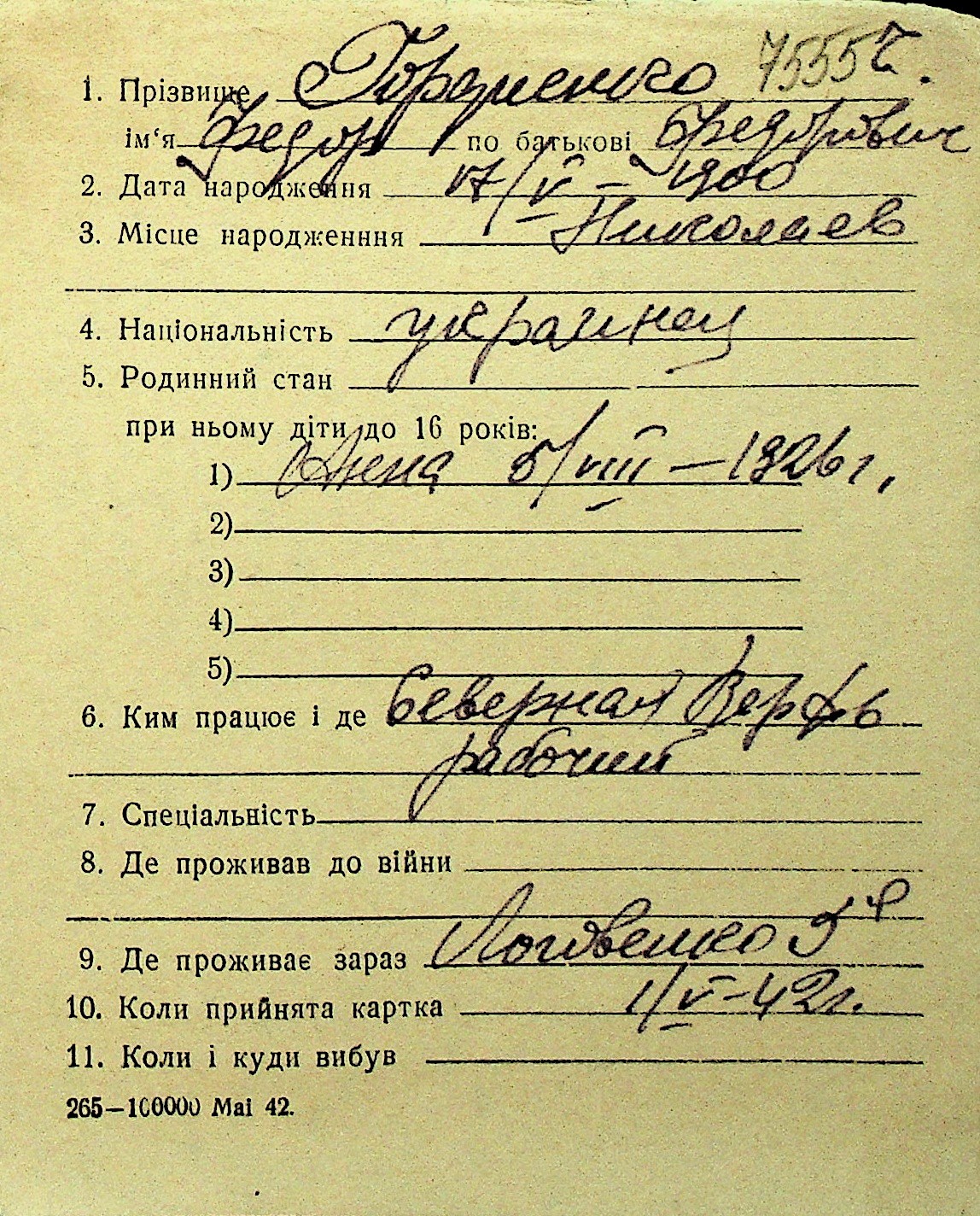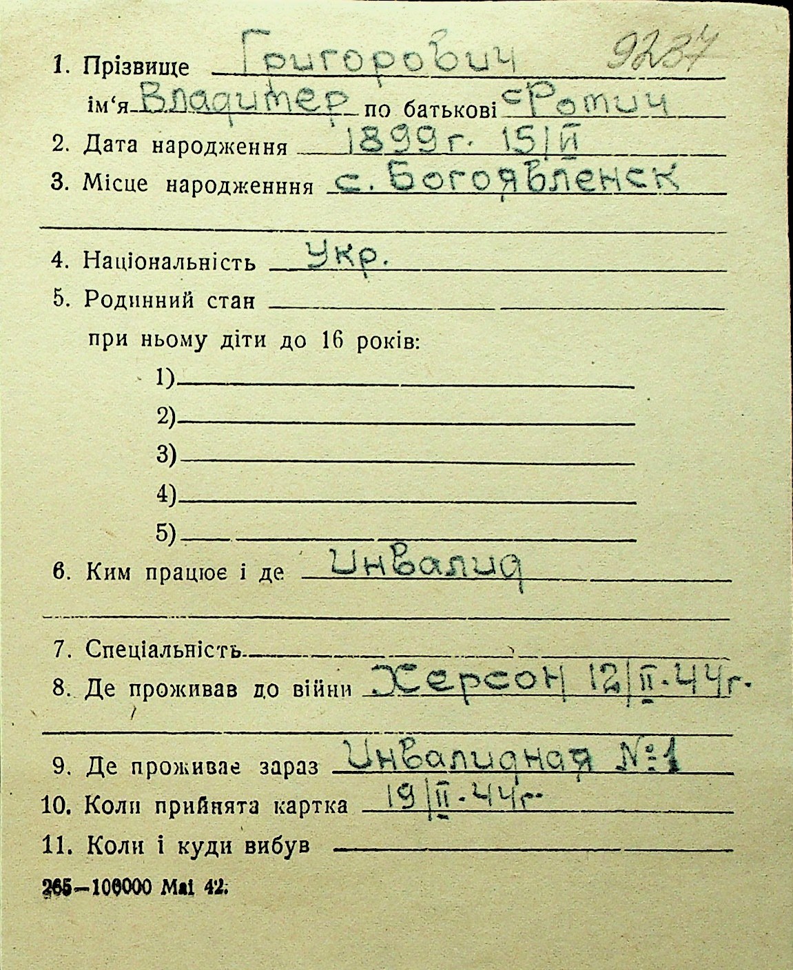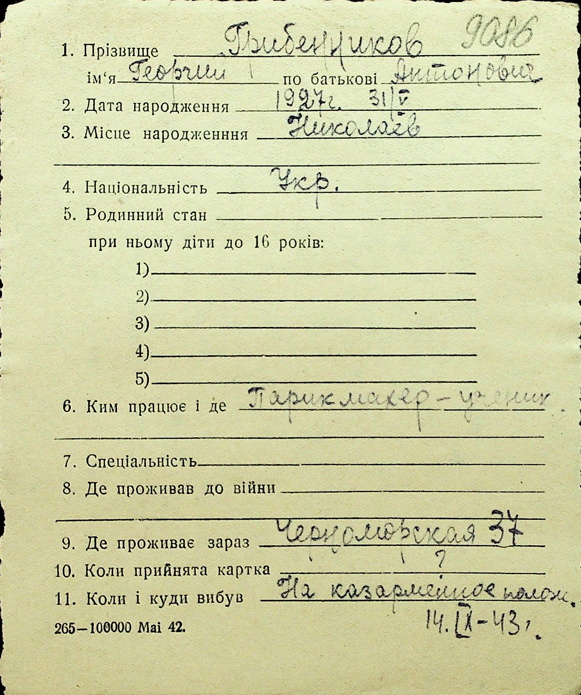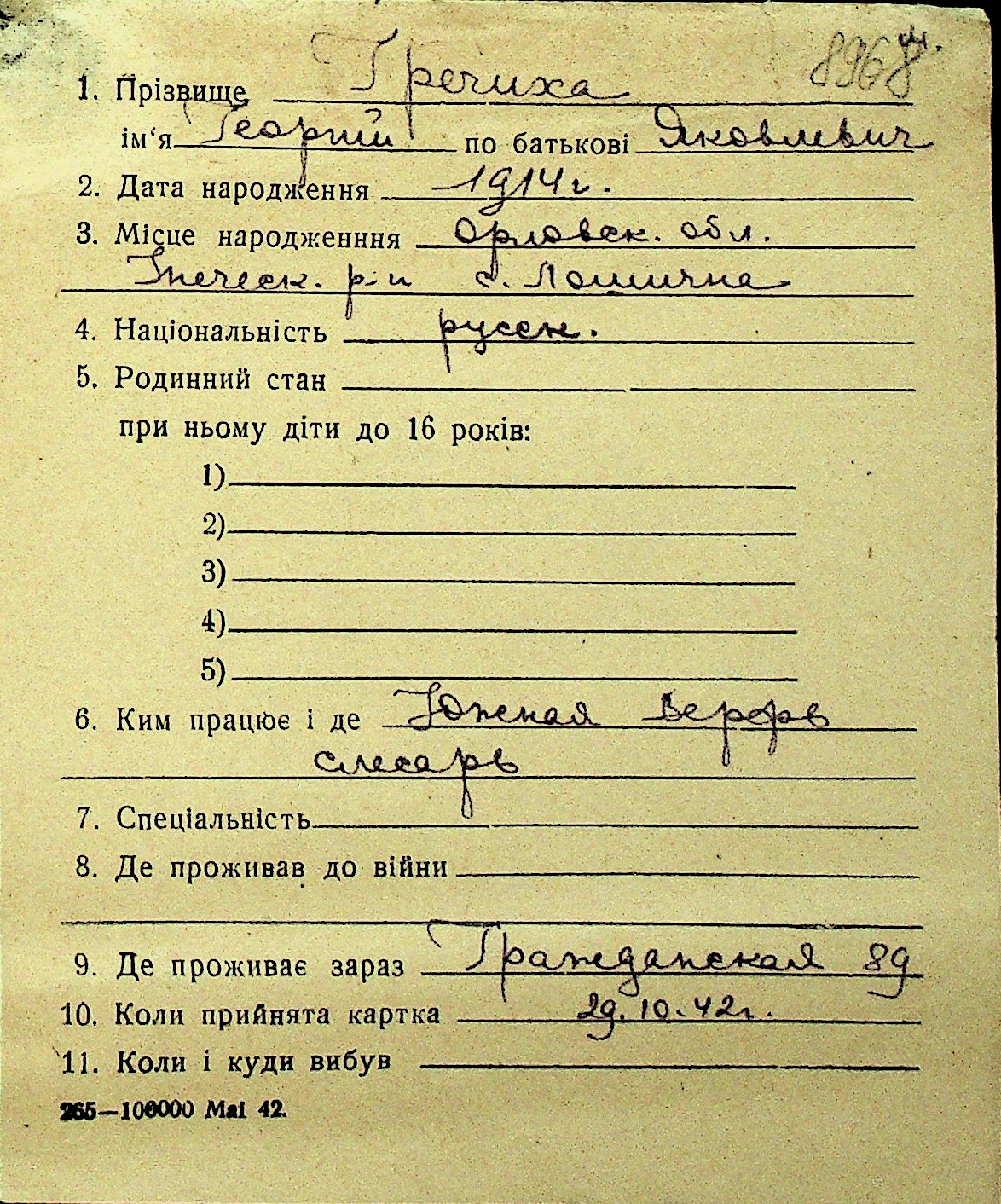 • • Перелік карток до фонду № Н-1016
