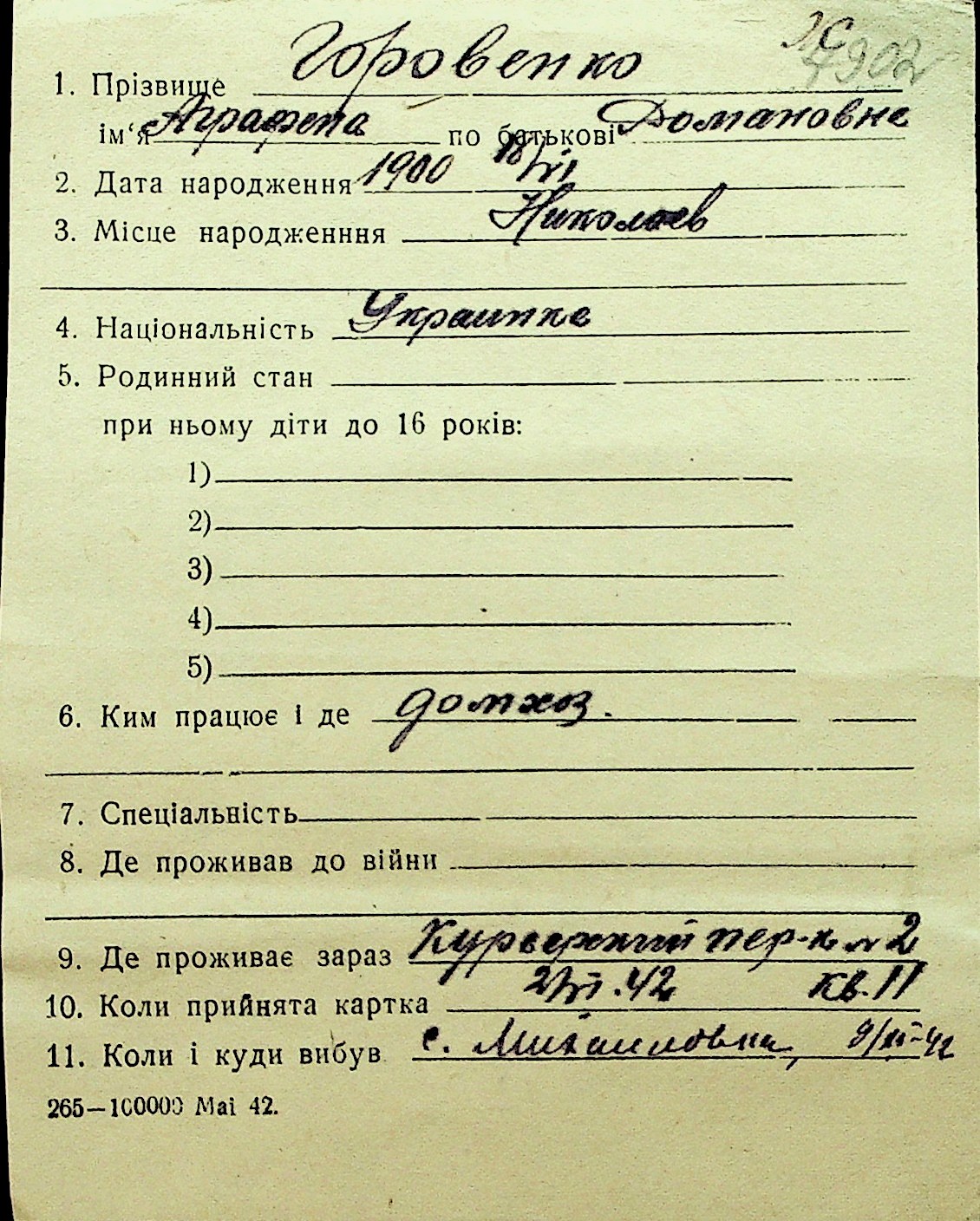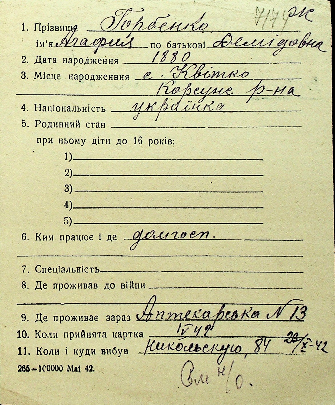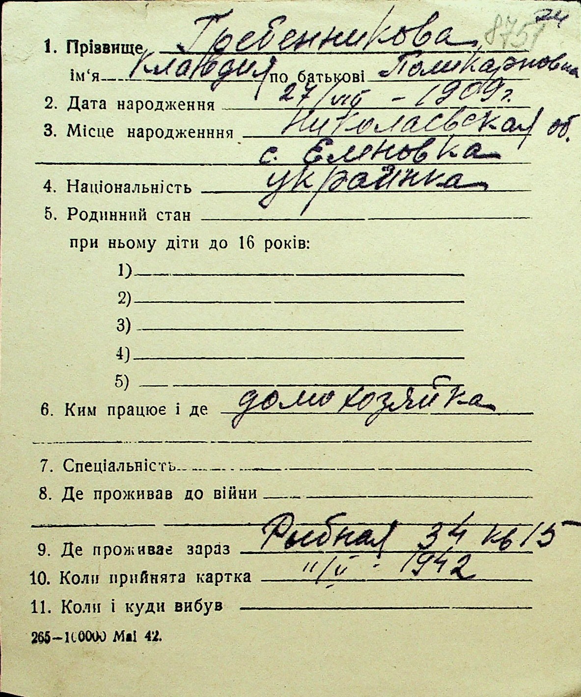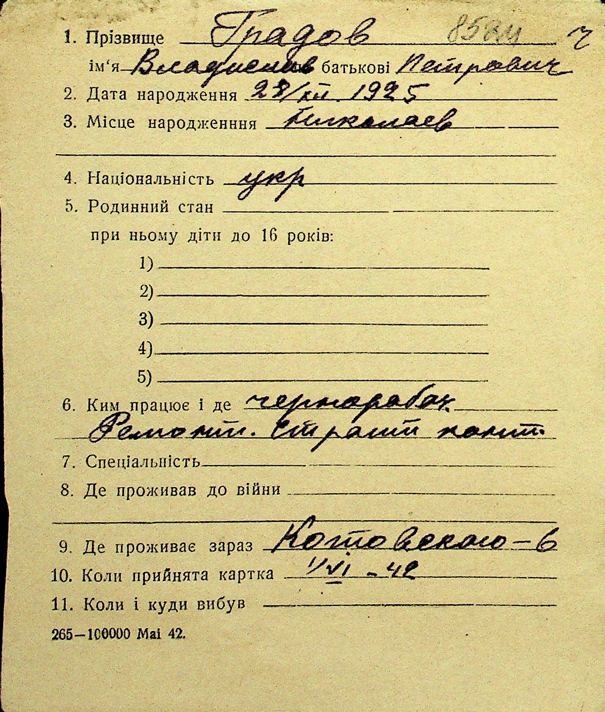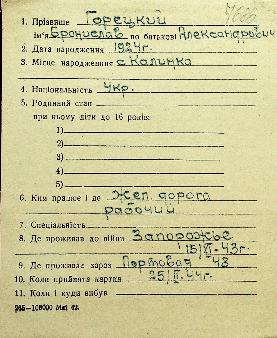 • • Перелік карток до фонду № Н-1016