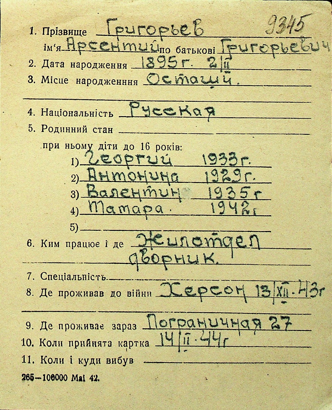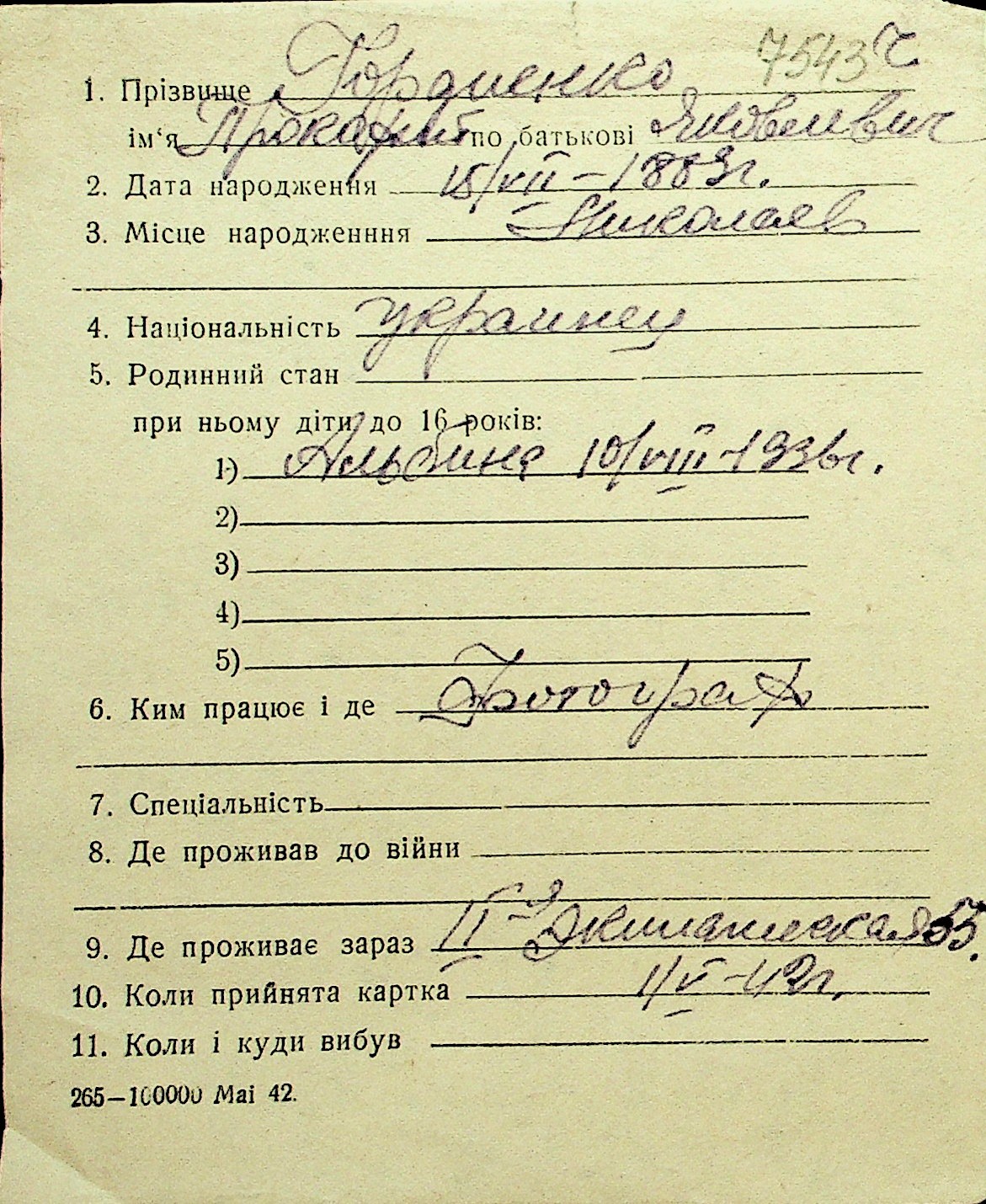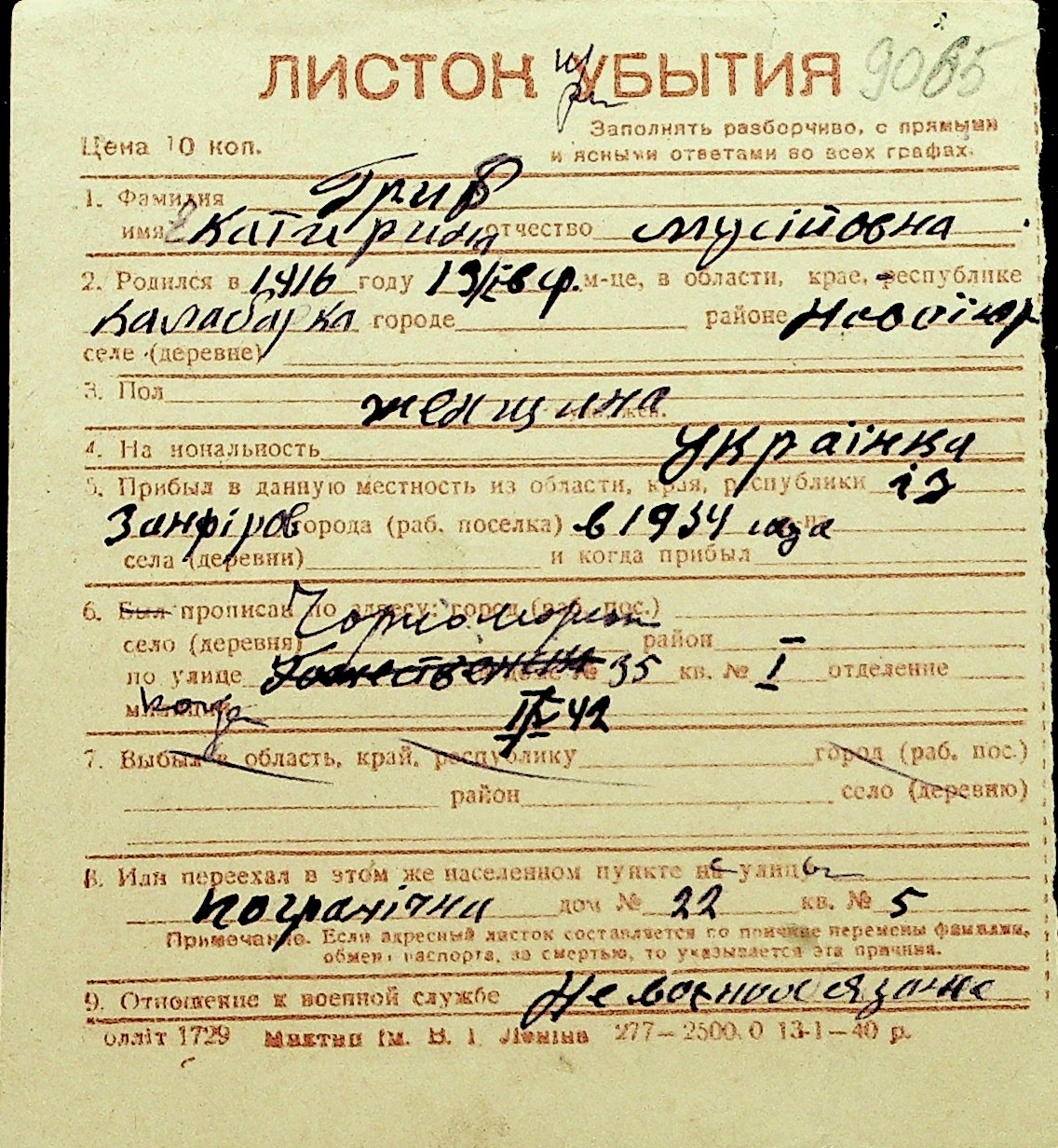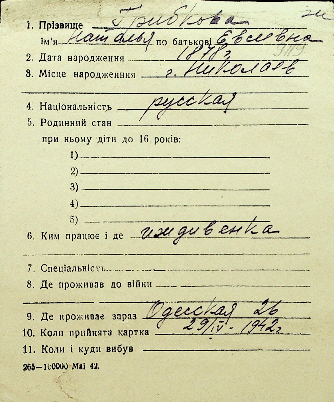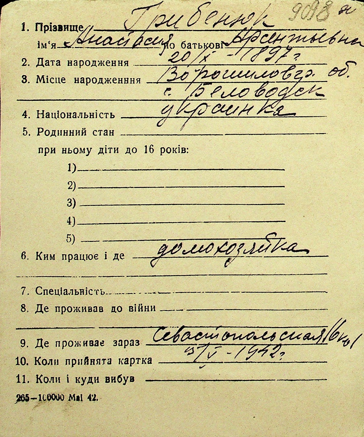• • Перелік карток до фонду № Н-1016