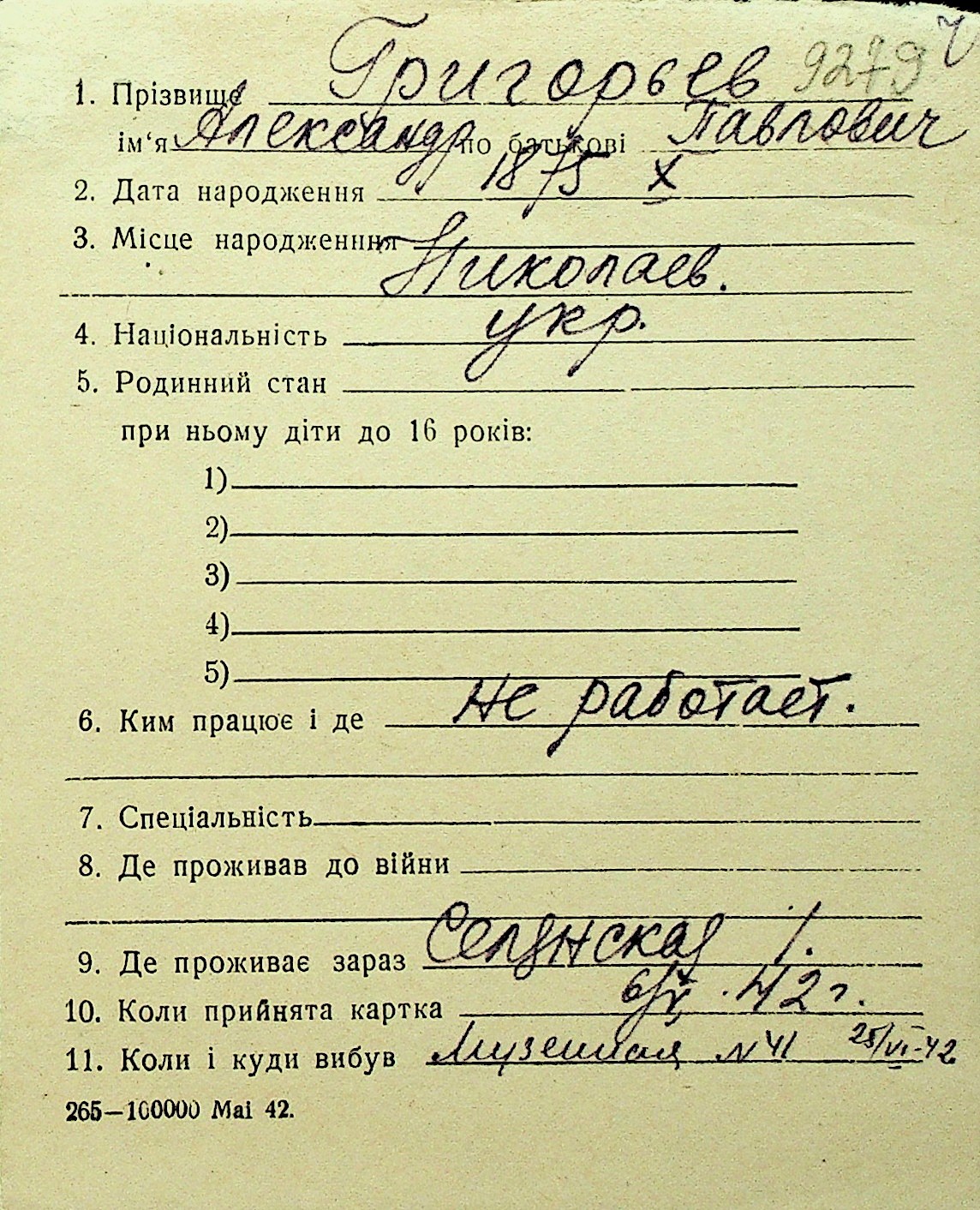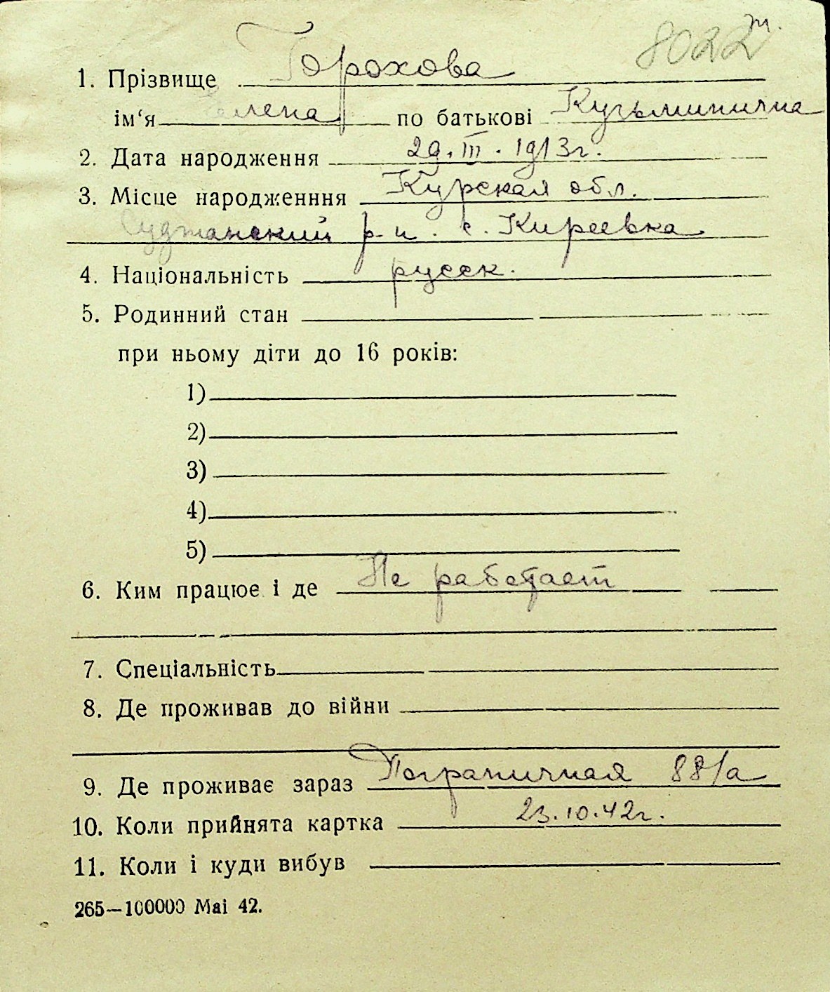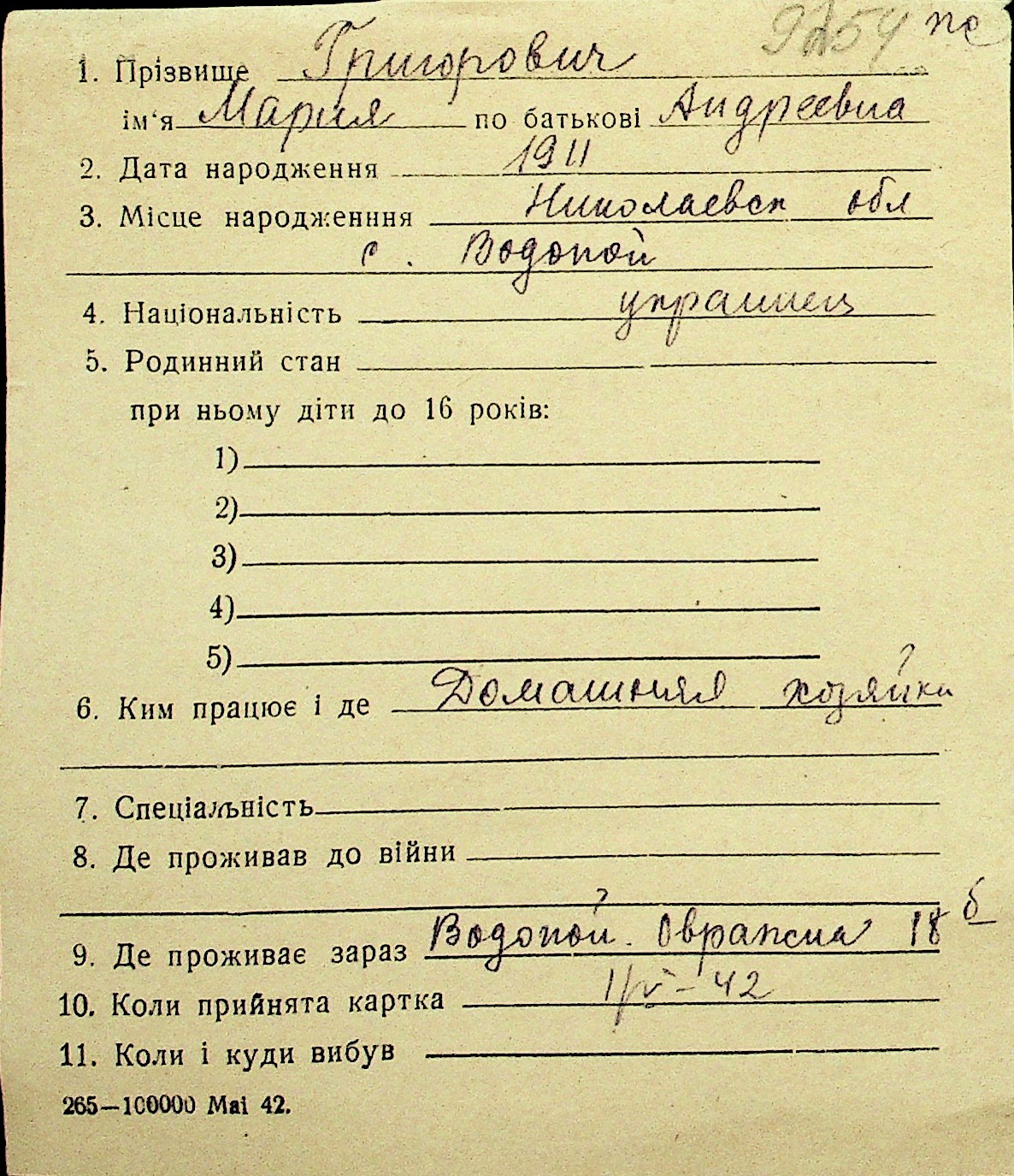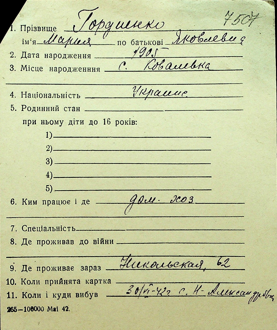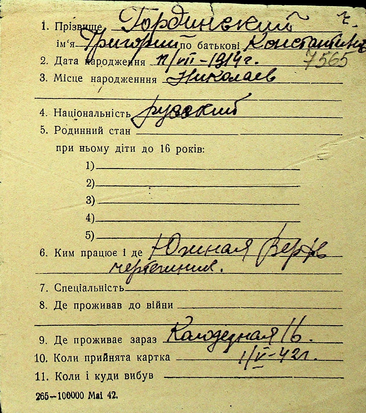 • • Перелік карток до фонду № Н-1016