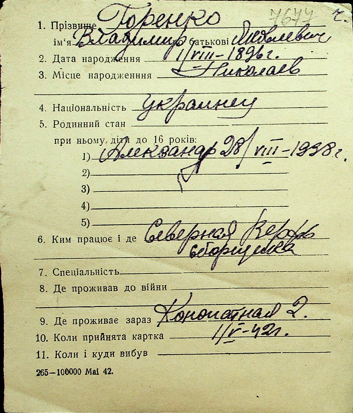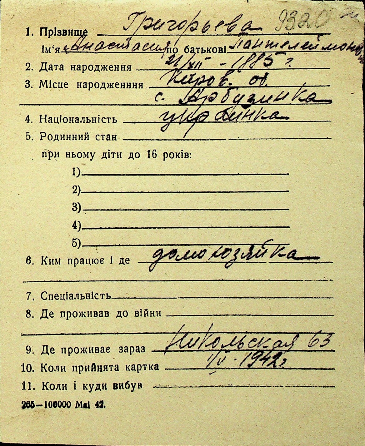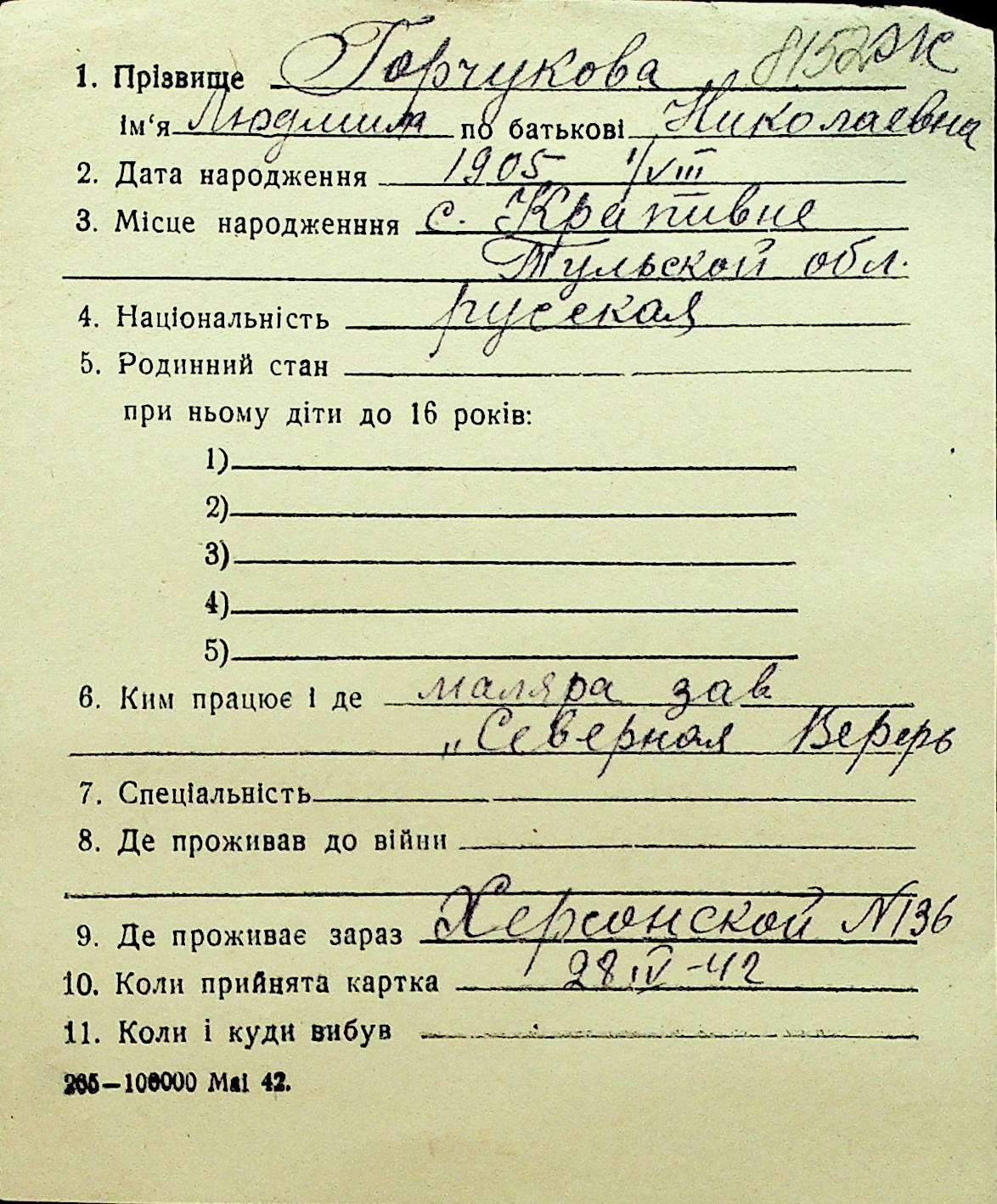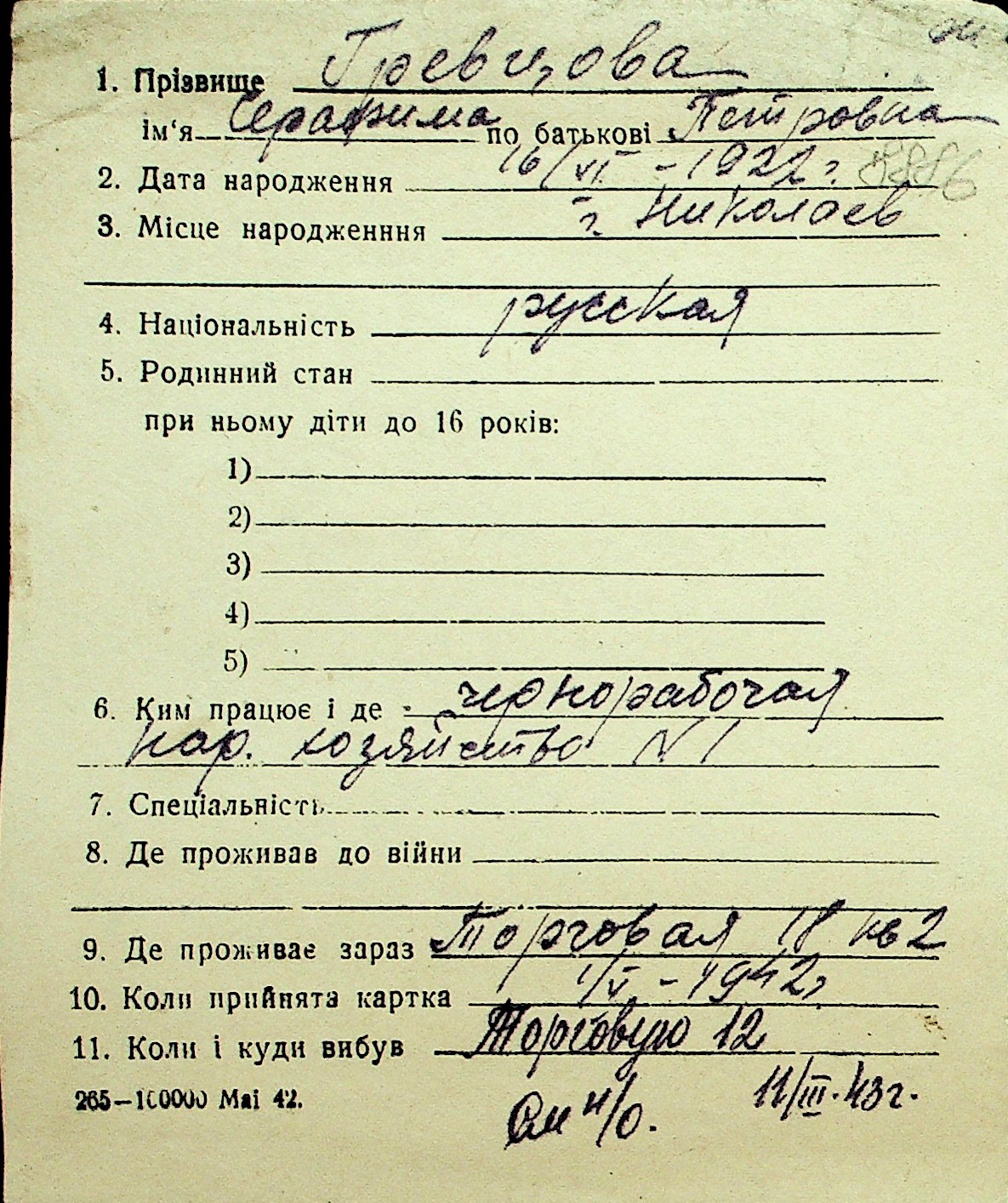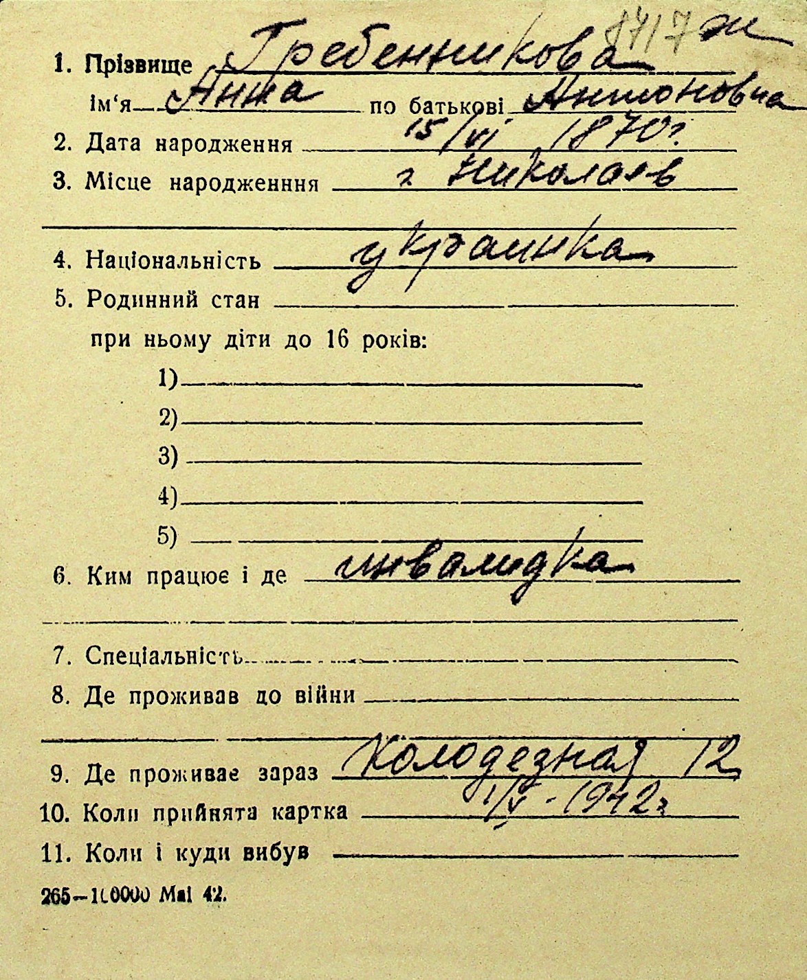 • • Перелік карток до фонду № Н-1016