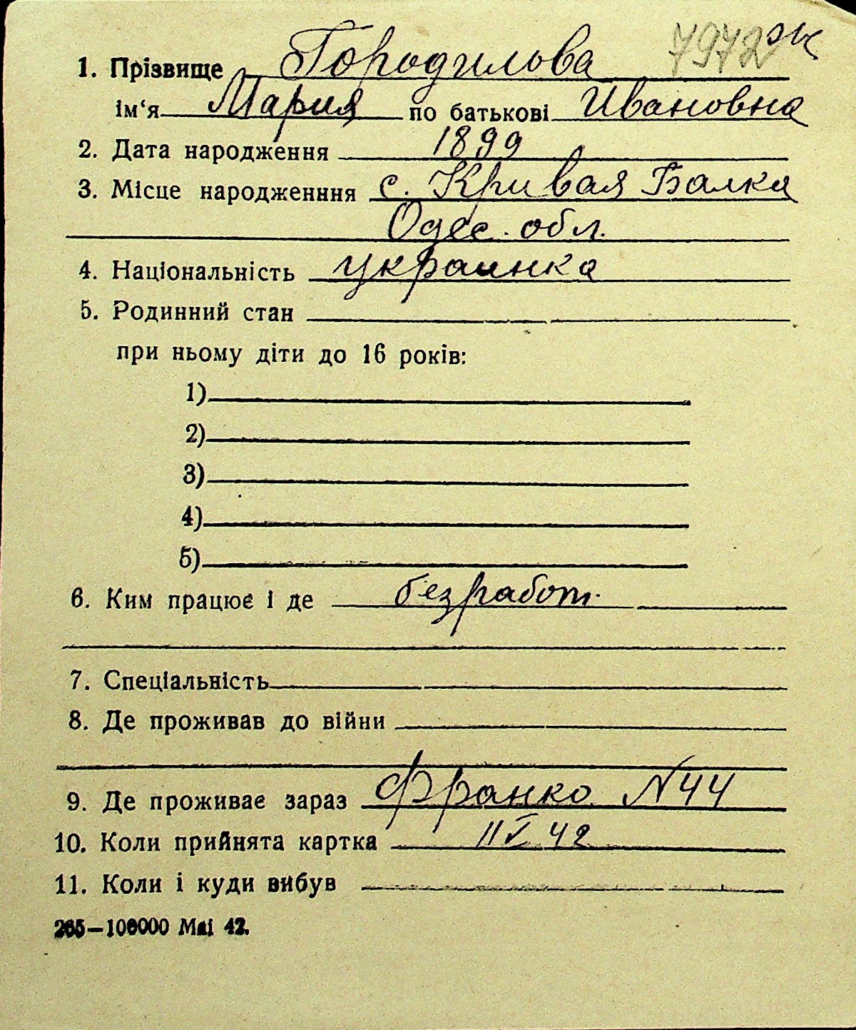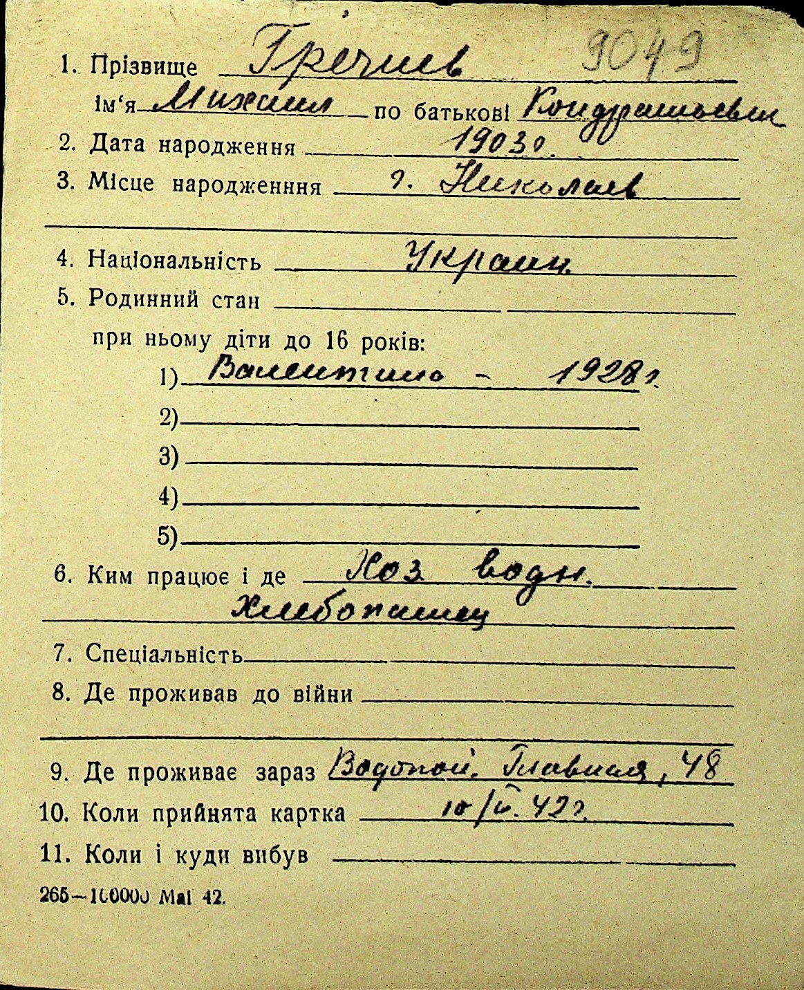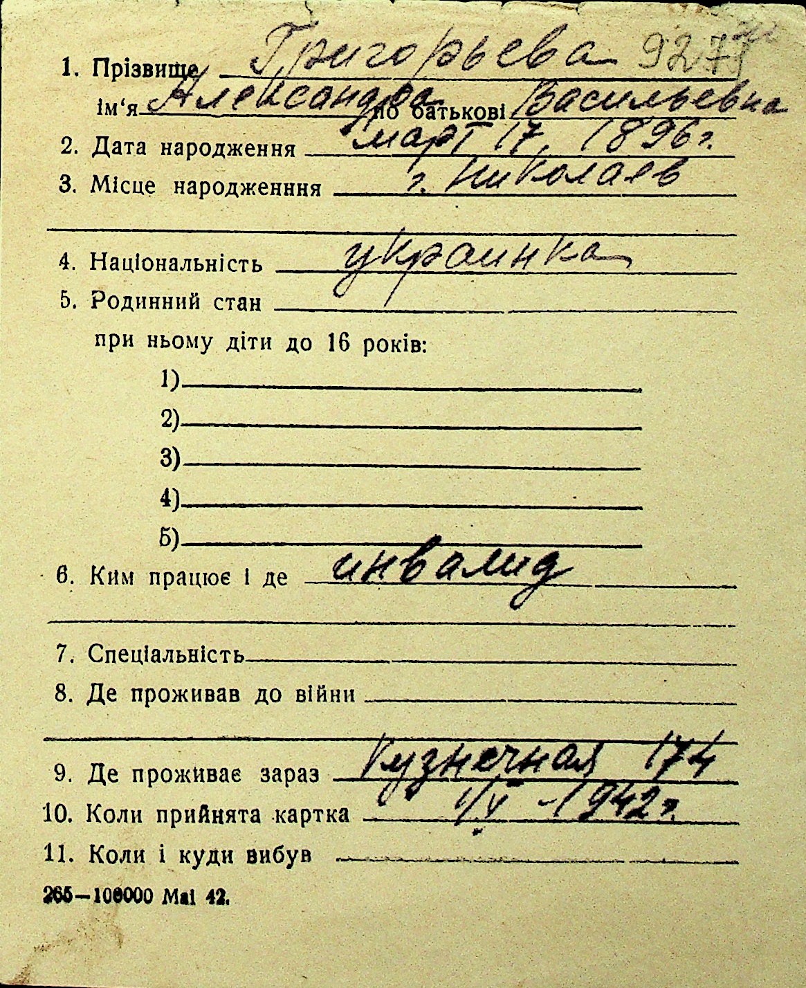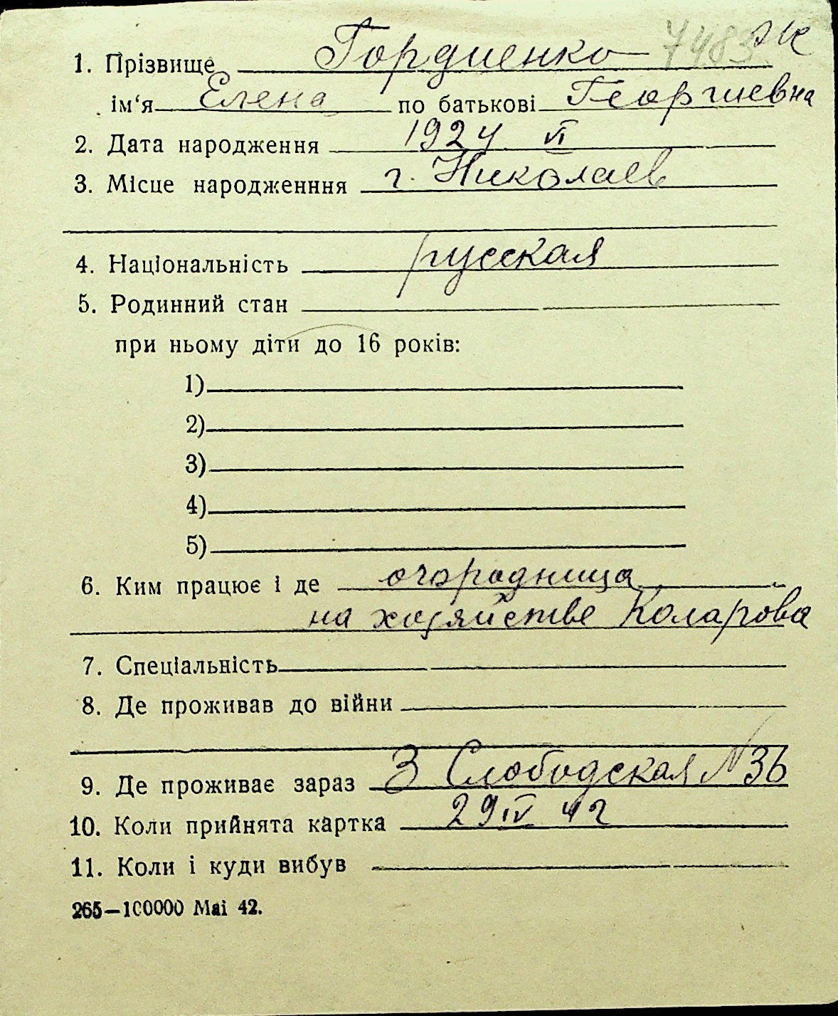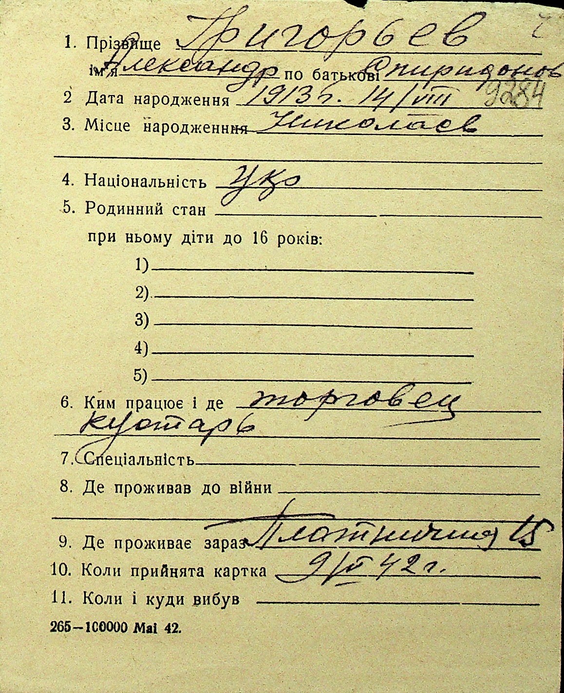 • • Перелік карток до фонду № Н-1016