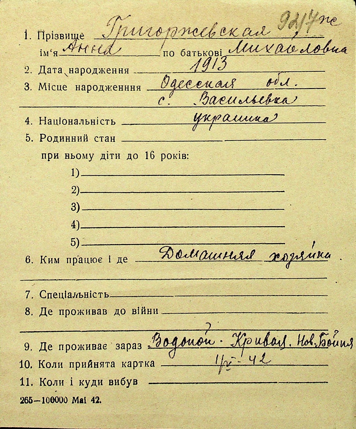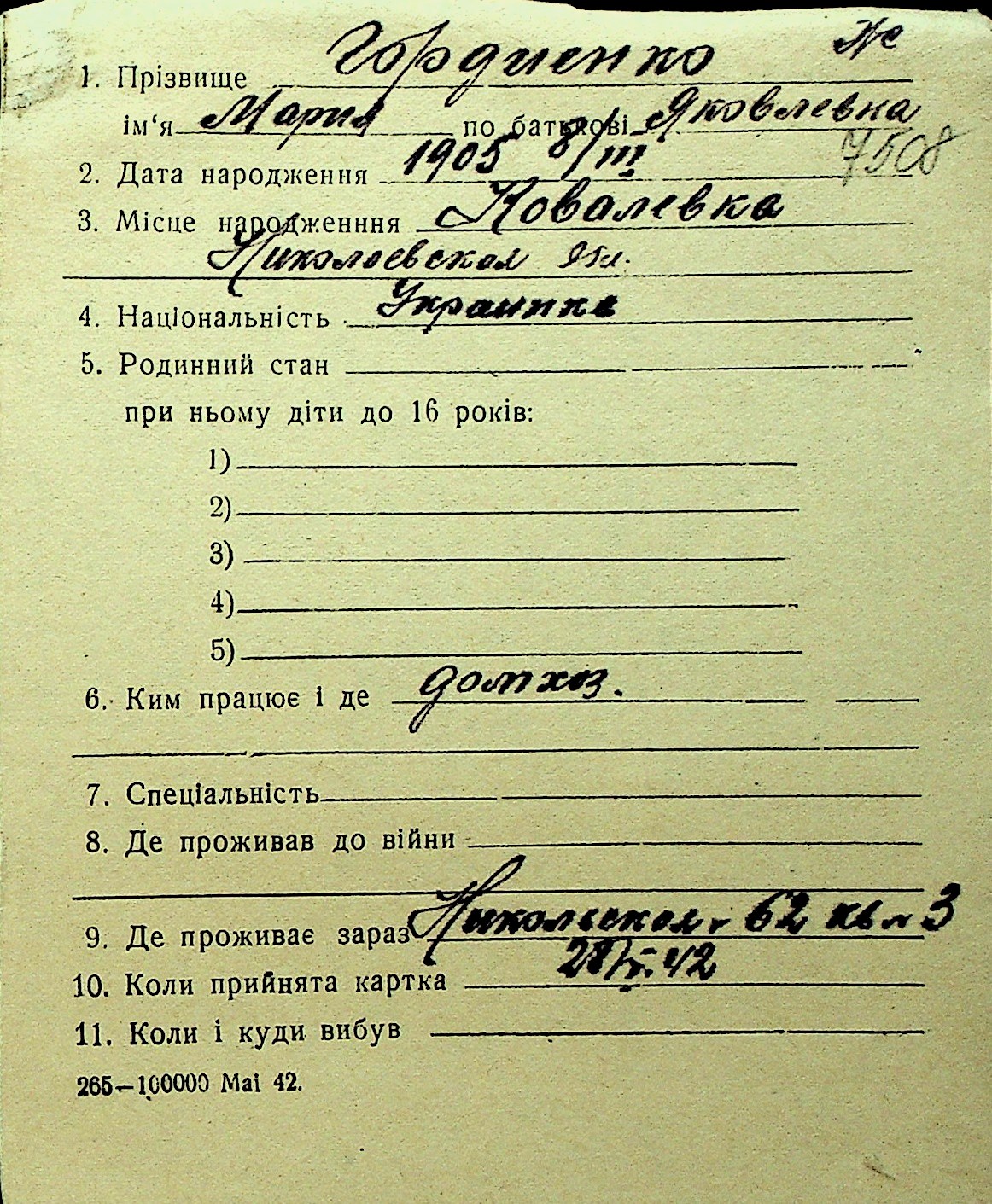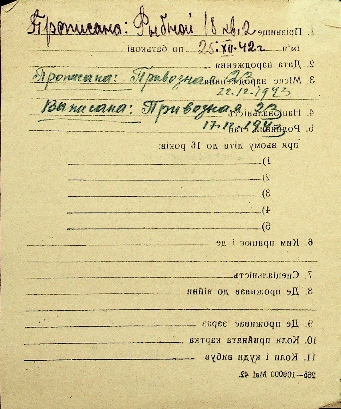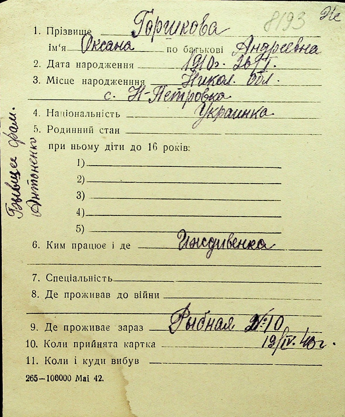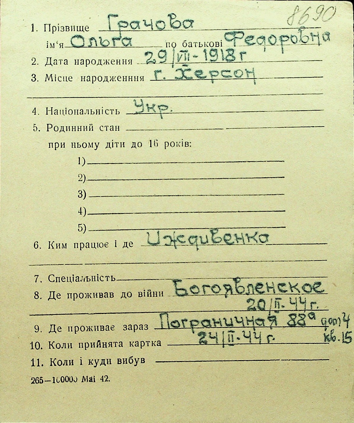 • • Перелік карток до фонду № Н-1016