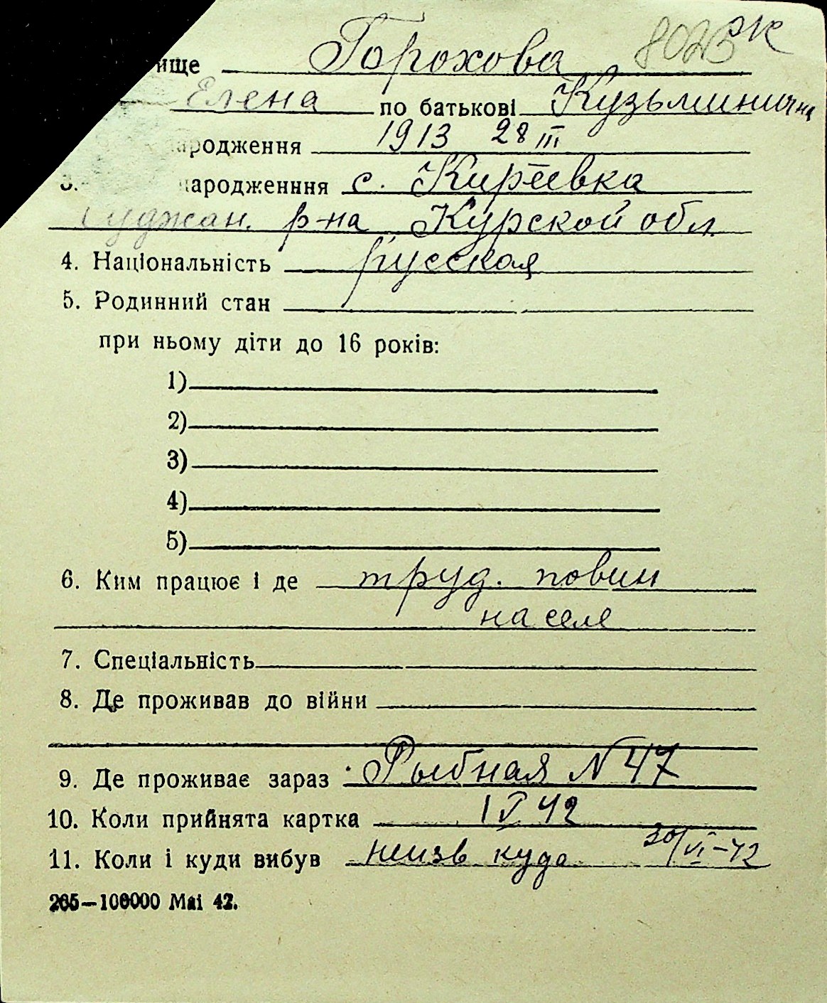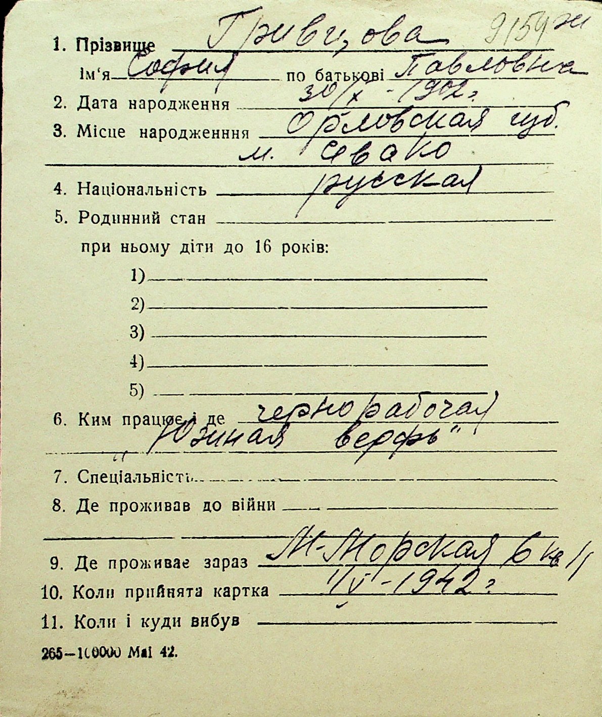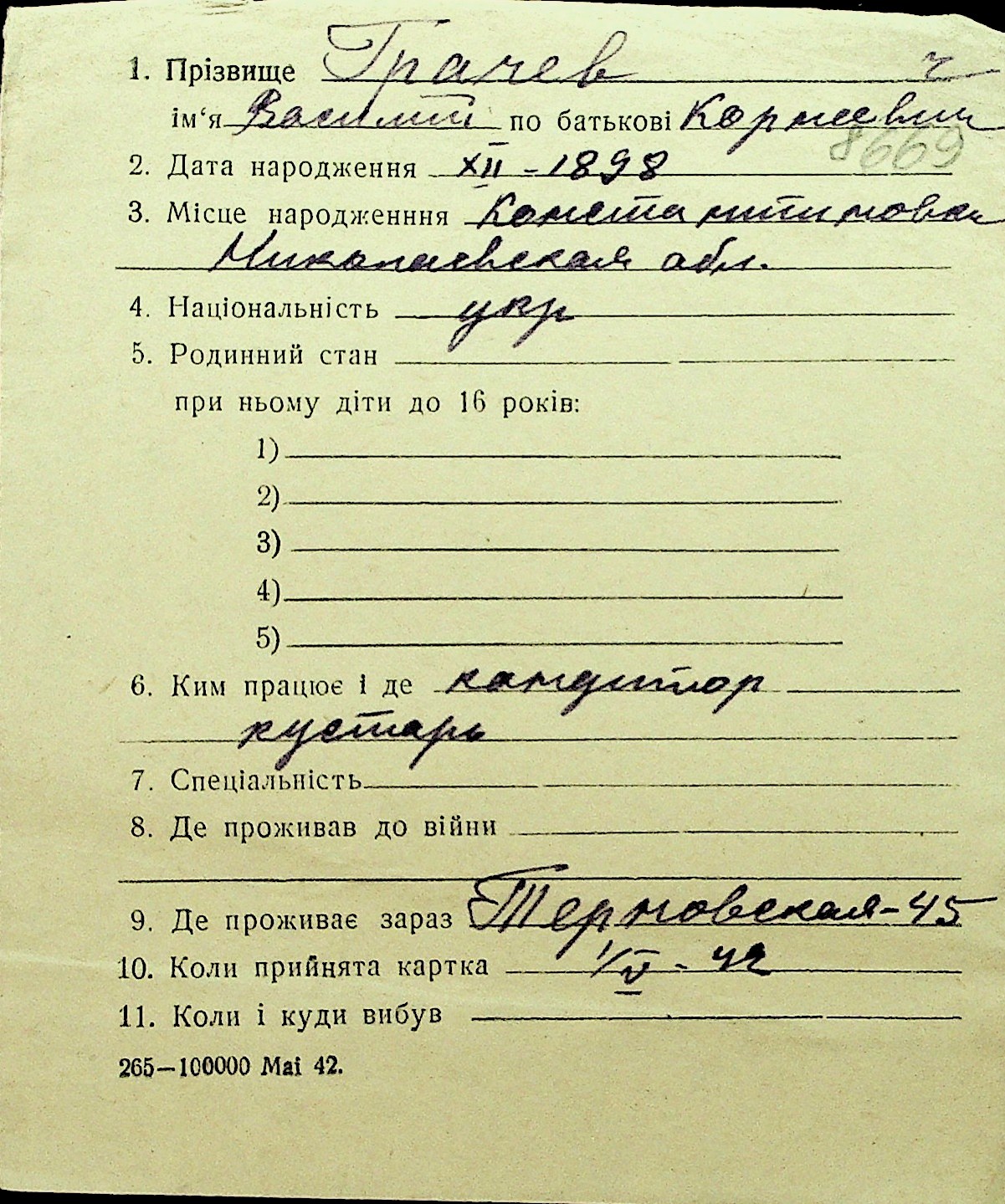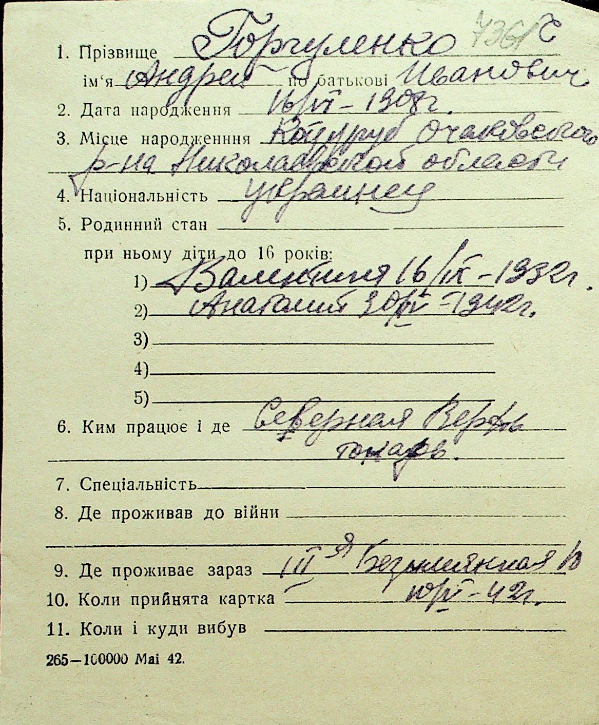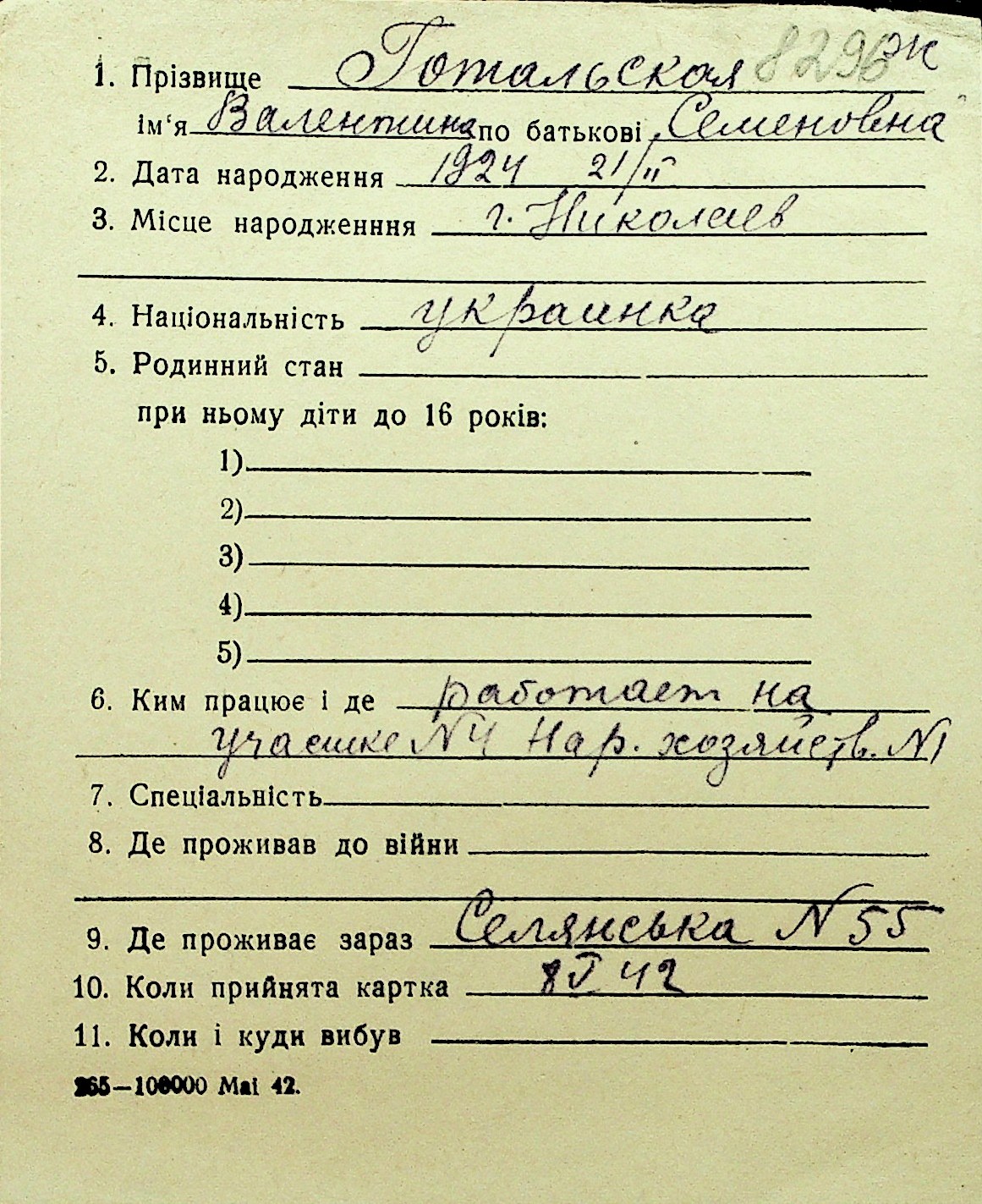 • • Перелік карток до фонду № Н-1016
