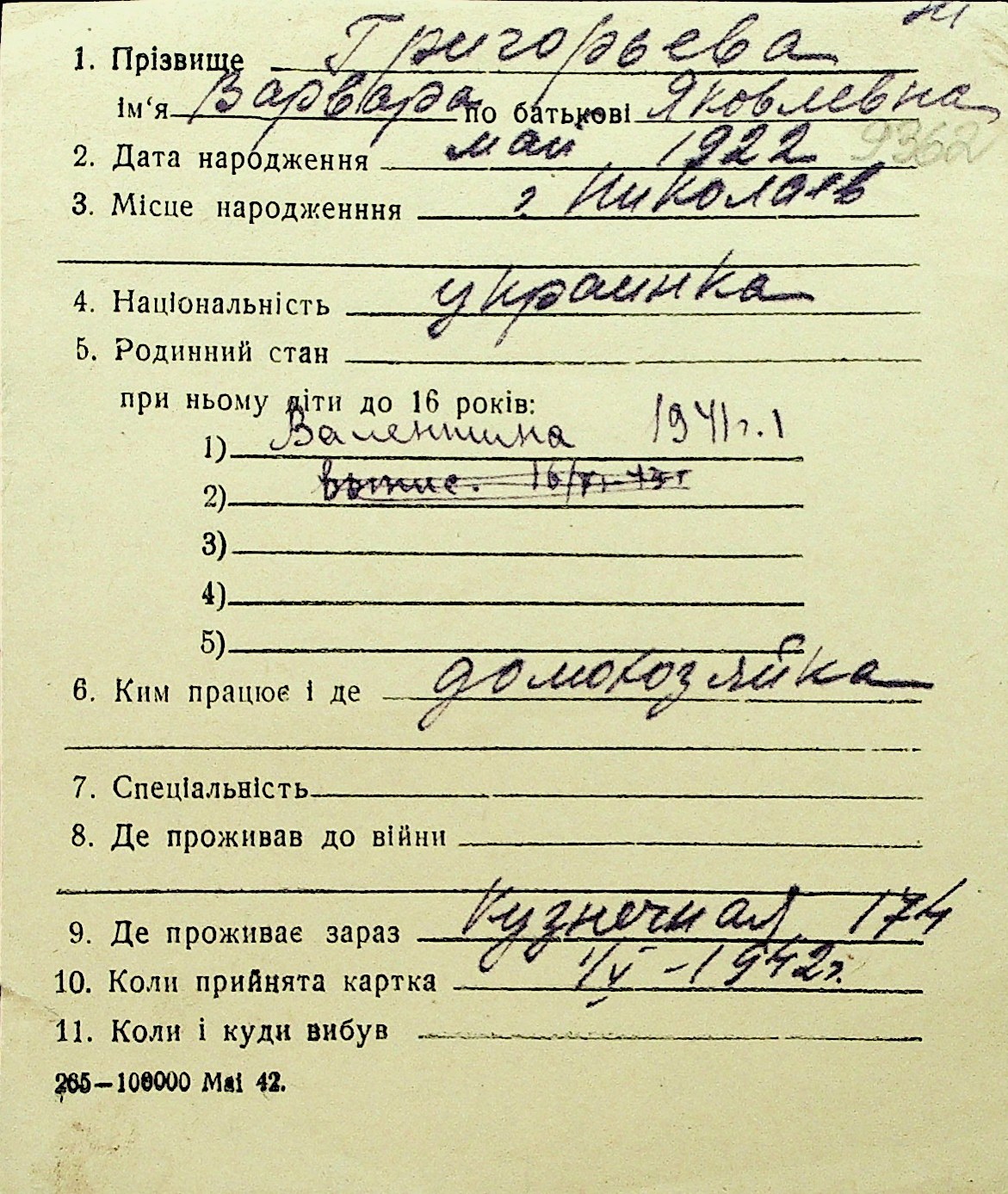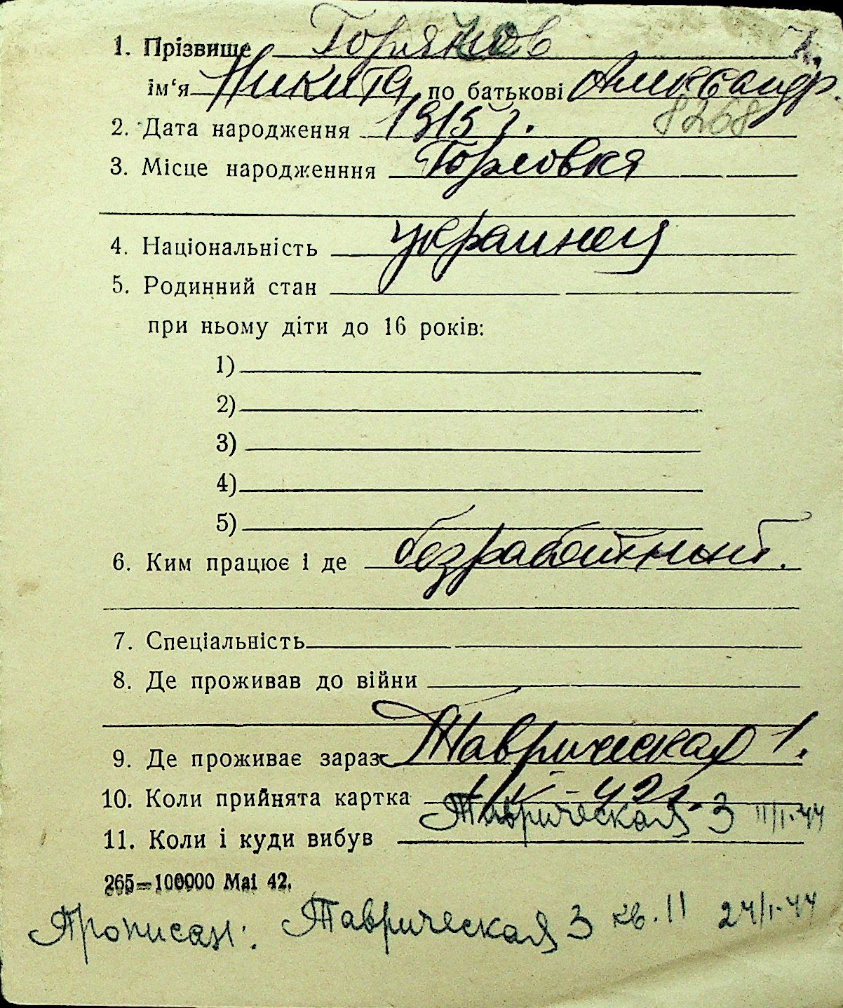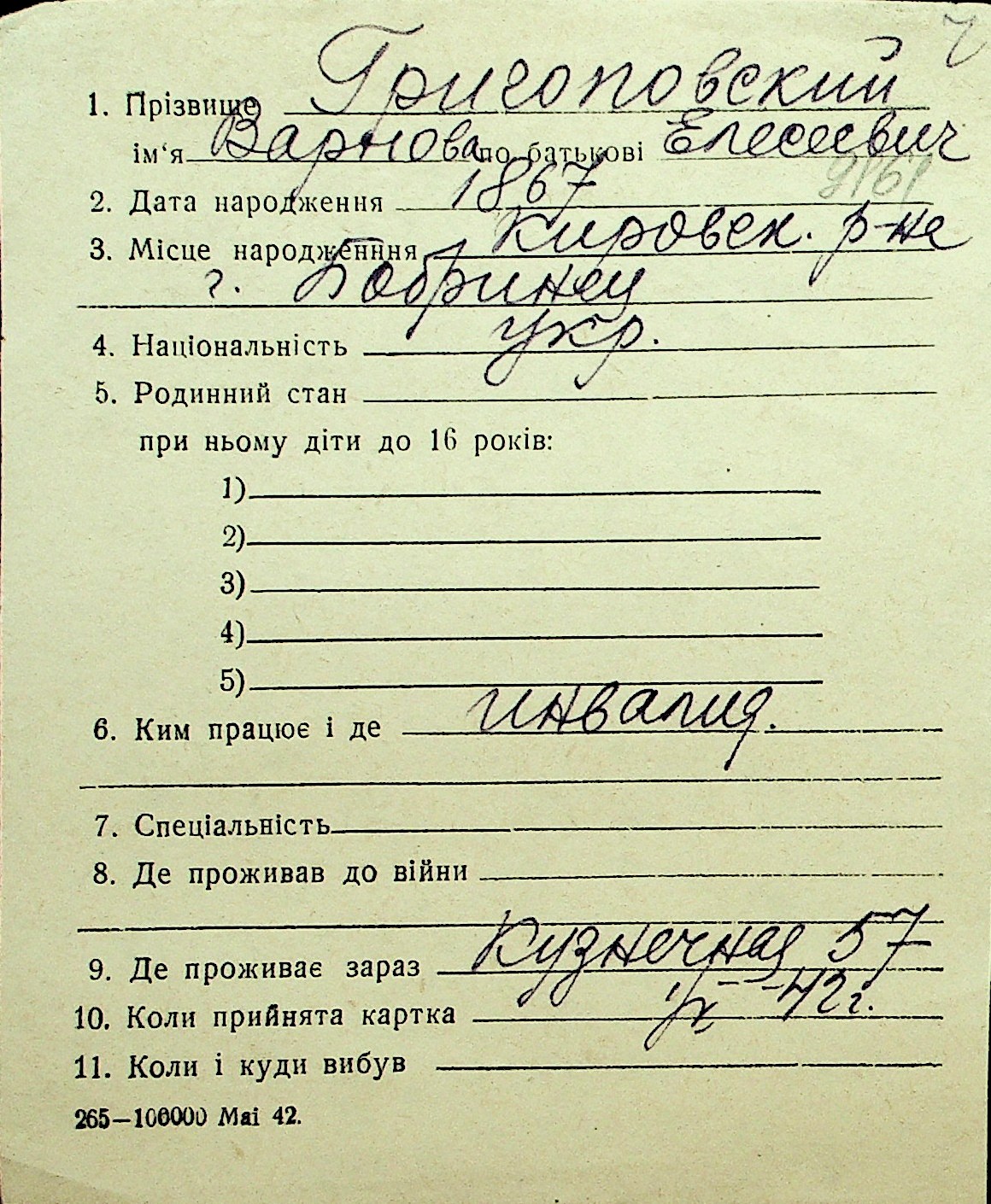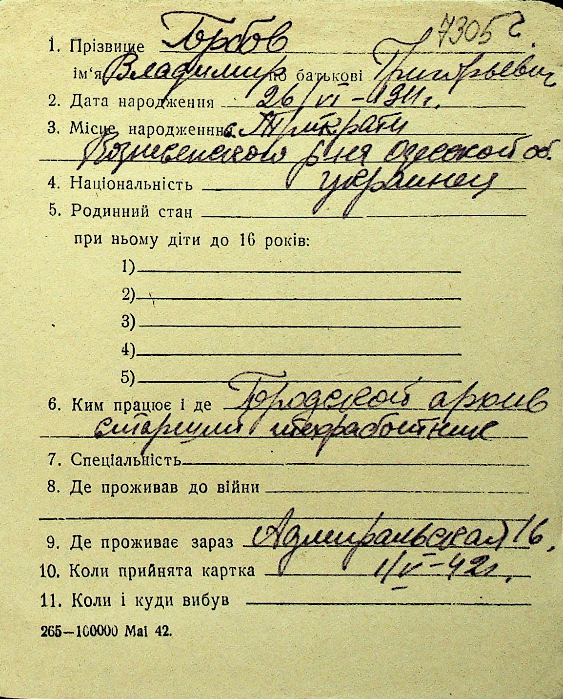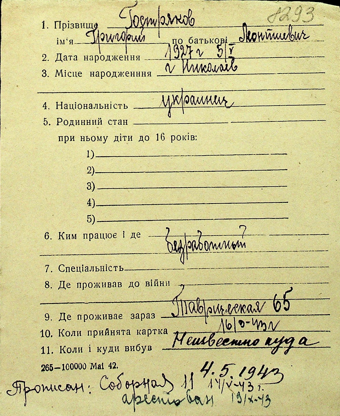 • • Перелік карток до фонду № Н-1016