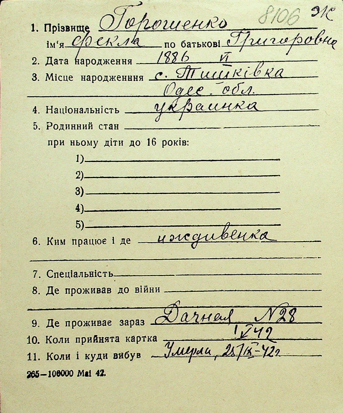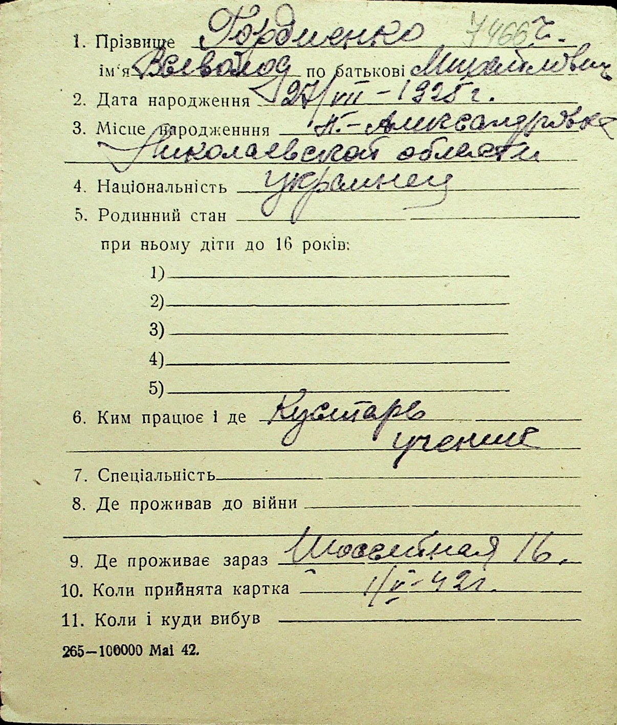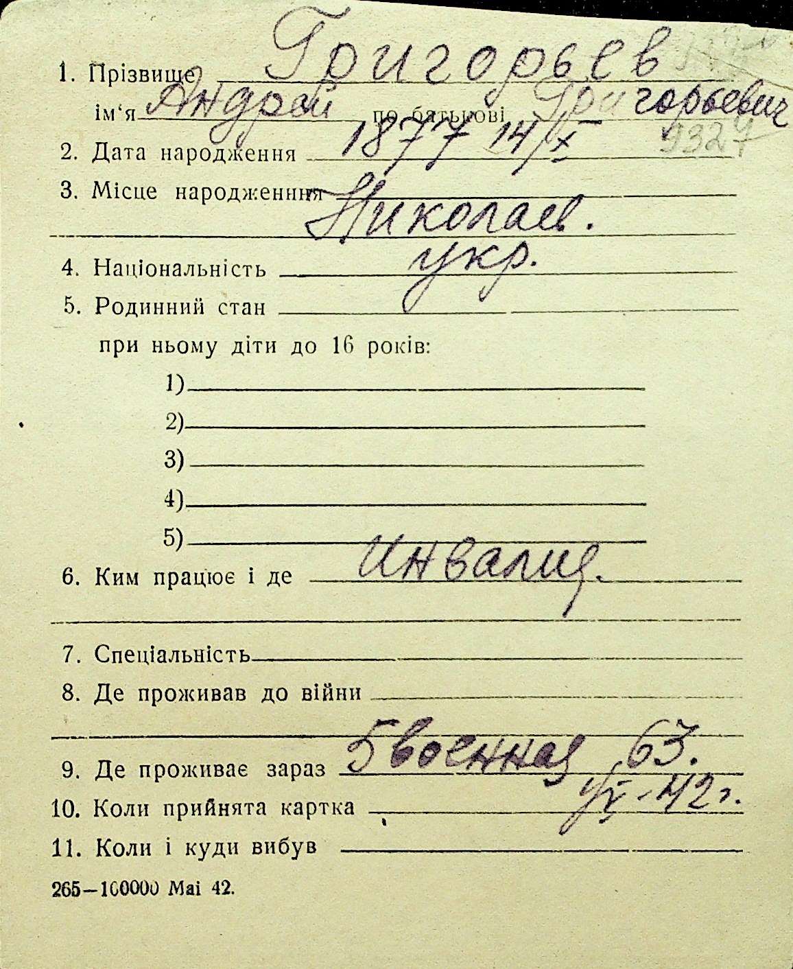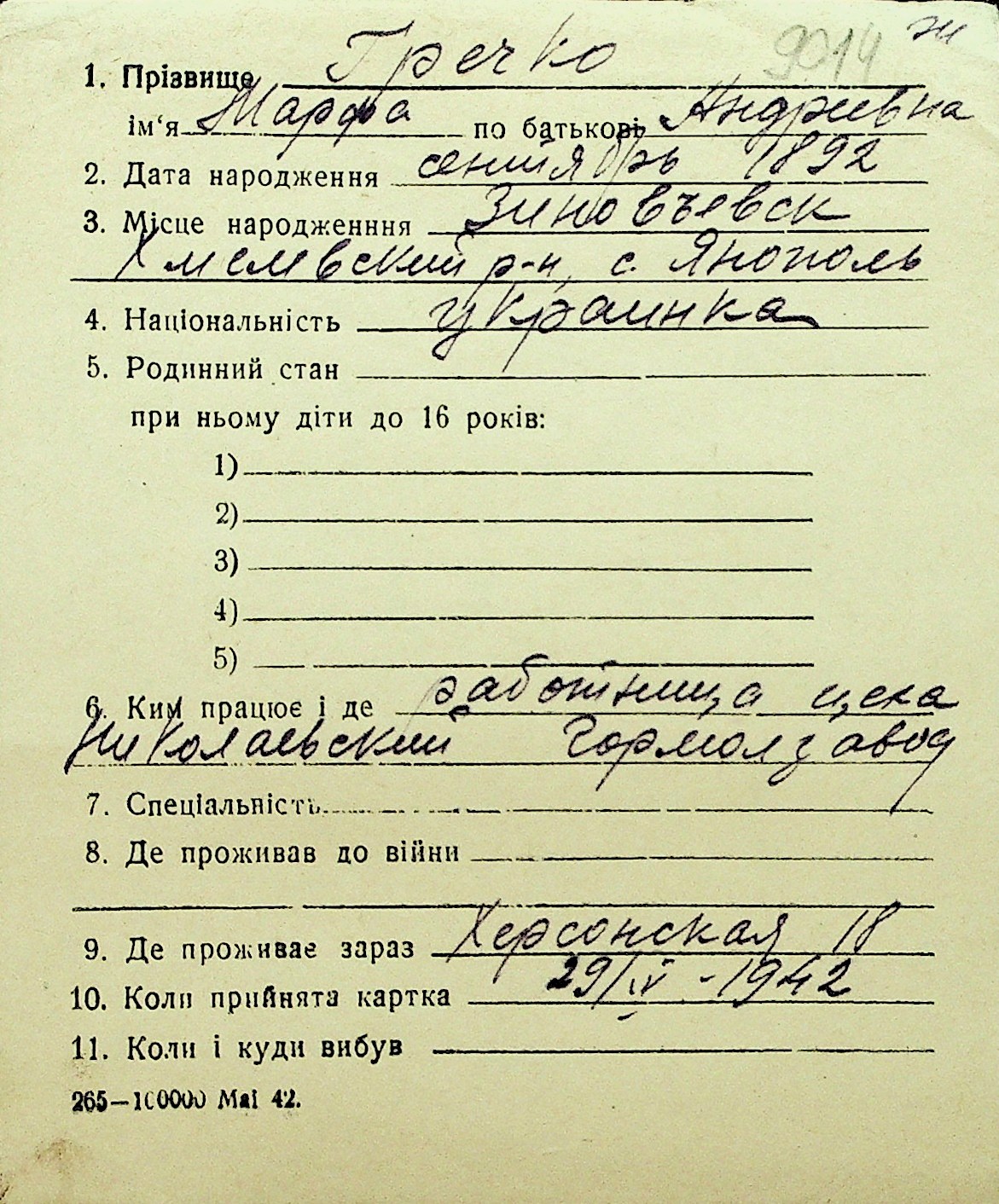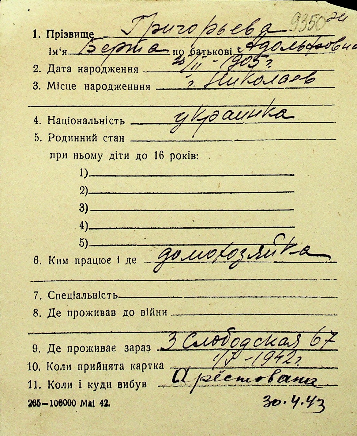 • • Перелік карток до фонду № Н-1016
