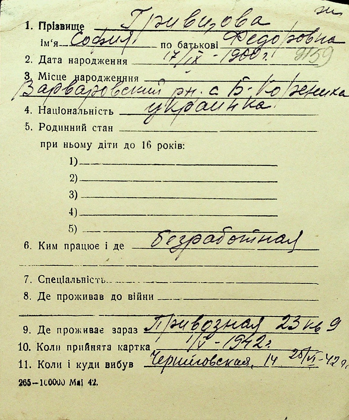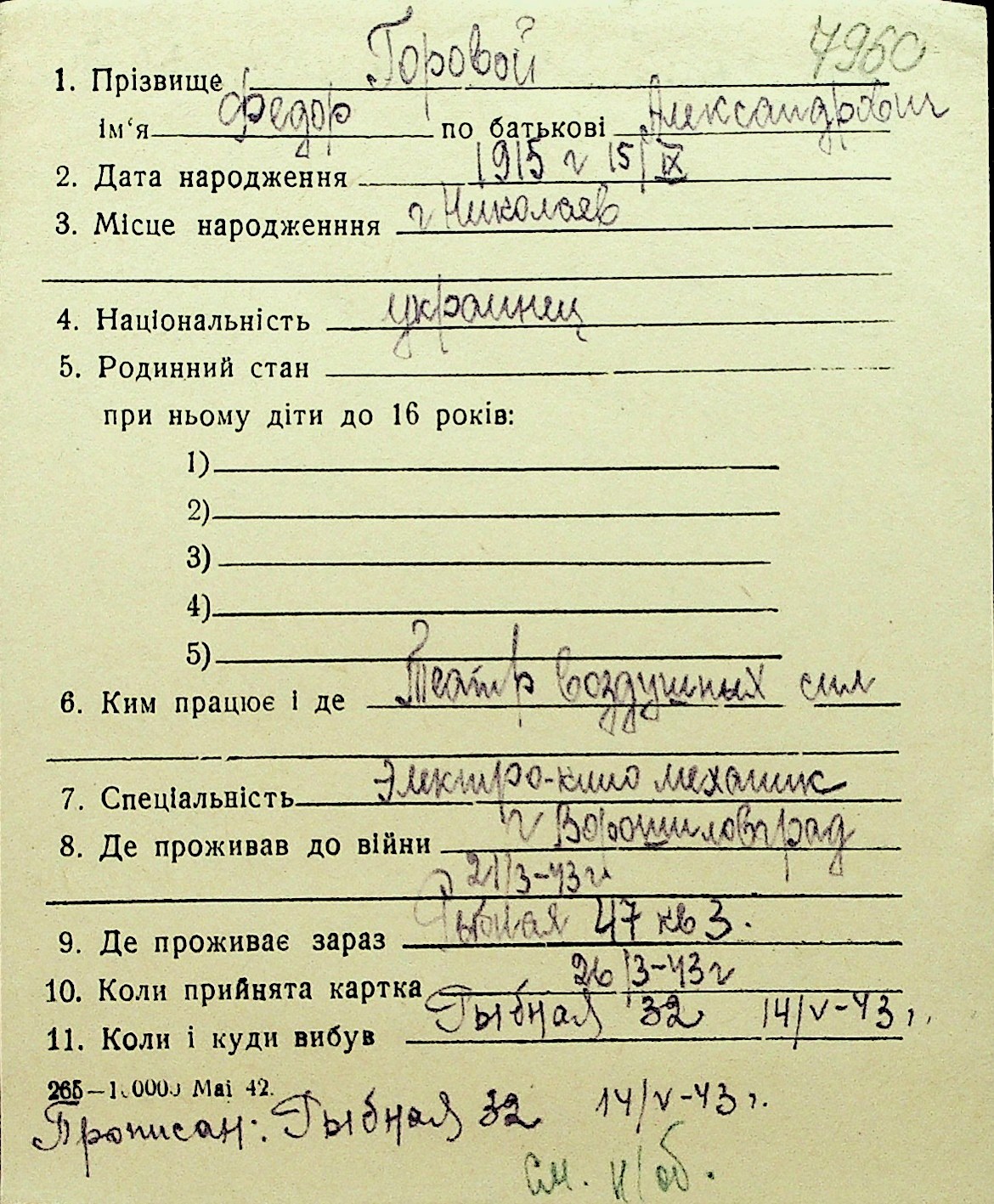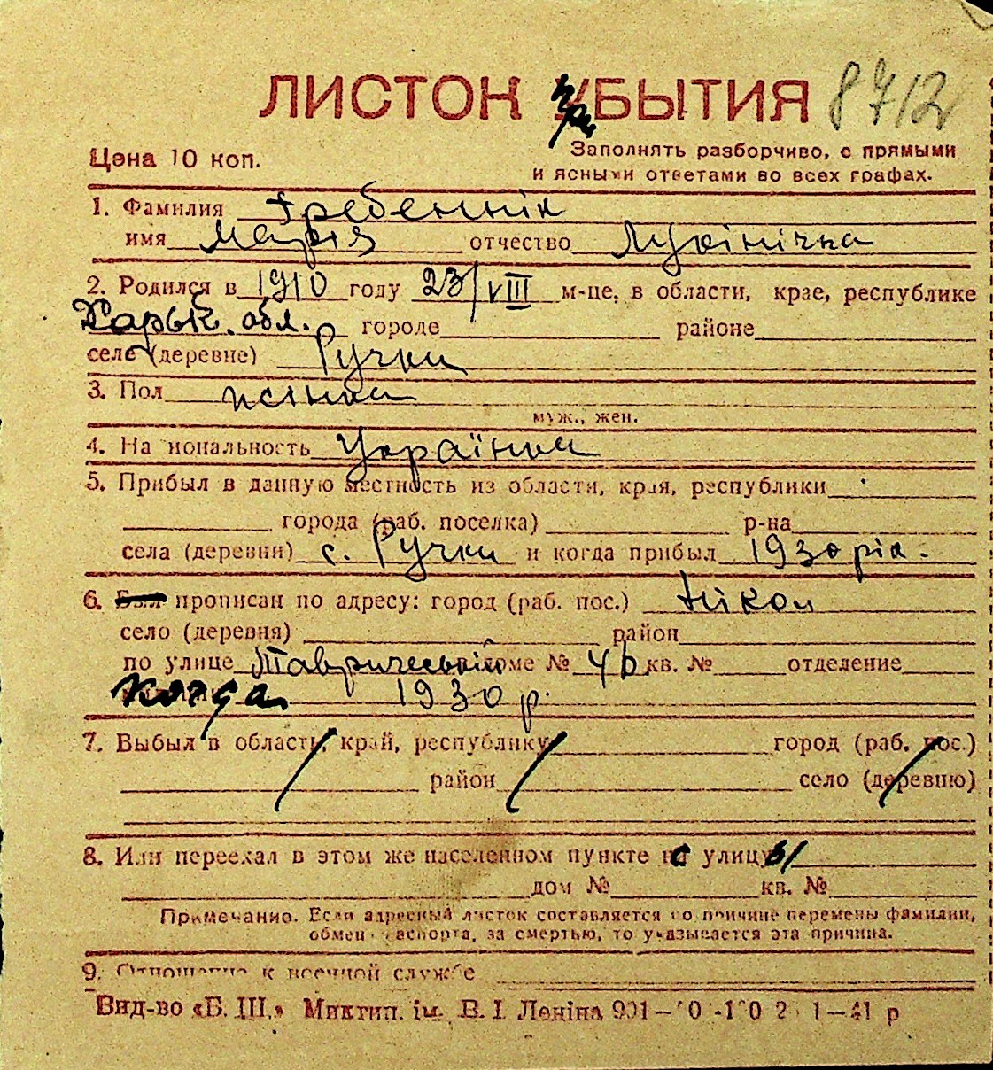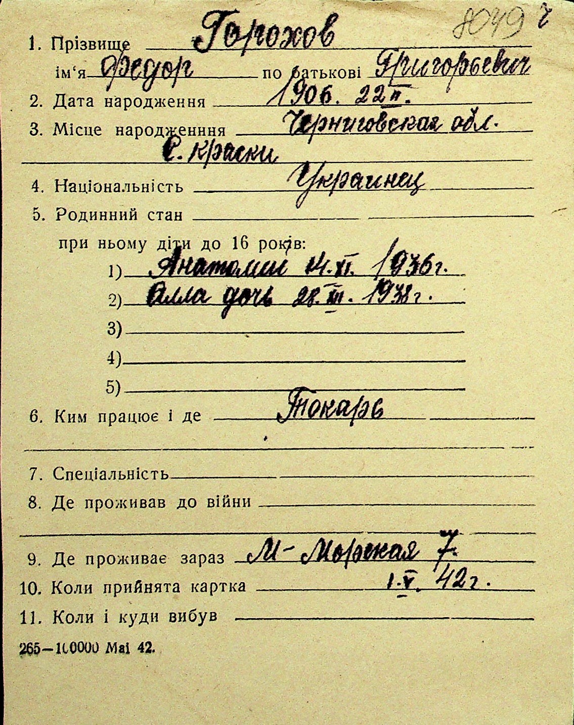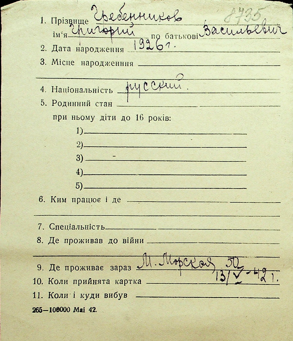• • Перелік карток до фонду № Н-1016