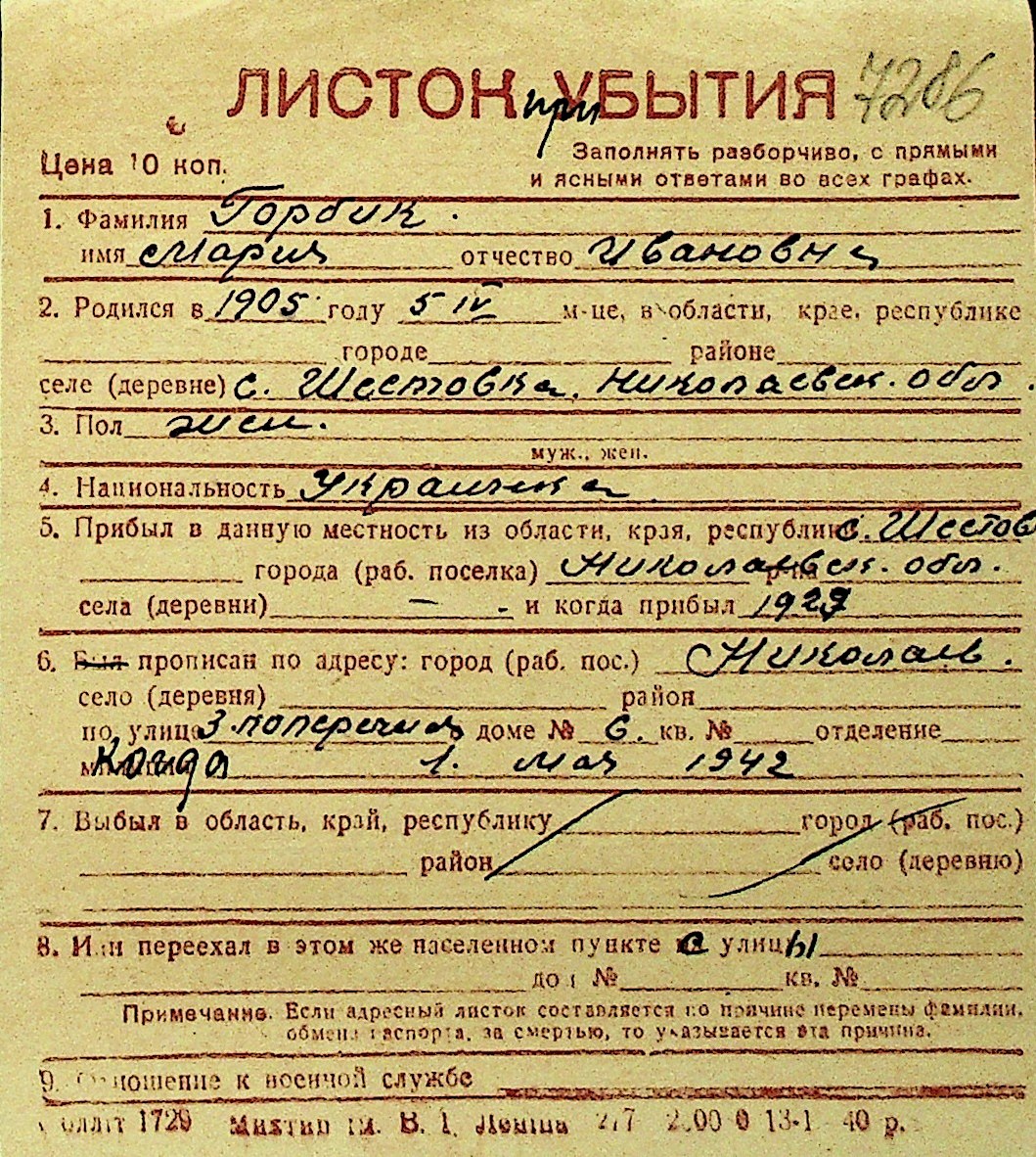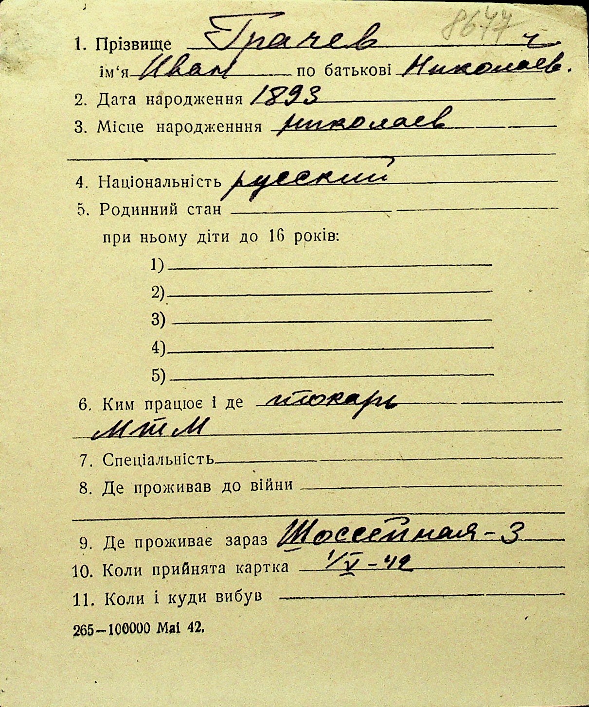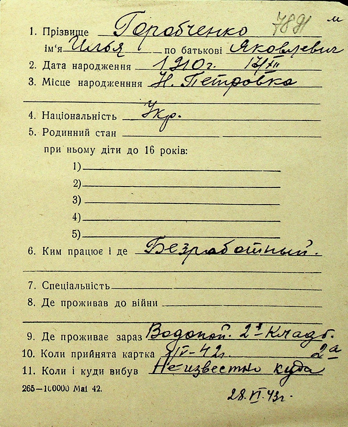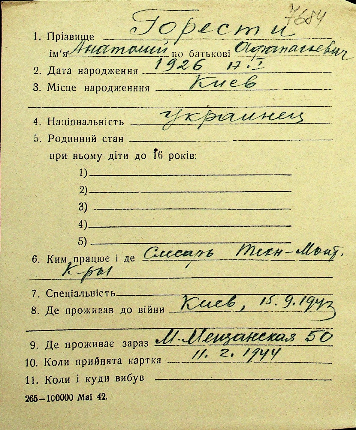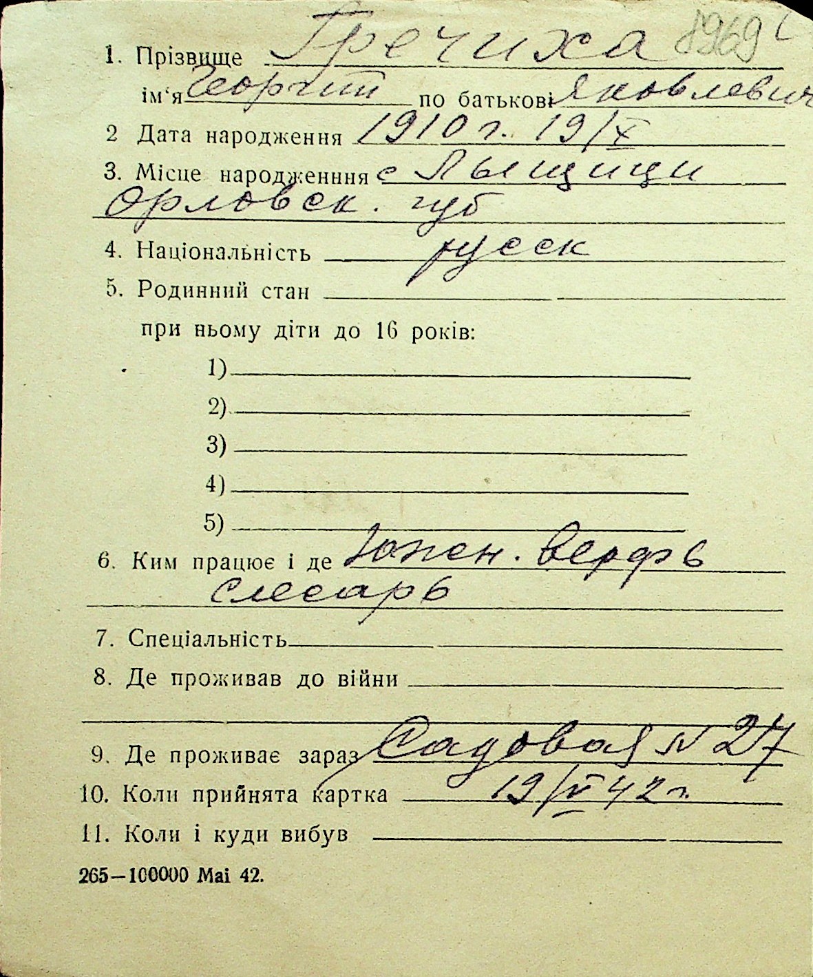 • • Перелік карток до фонду № Н-1016