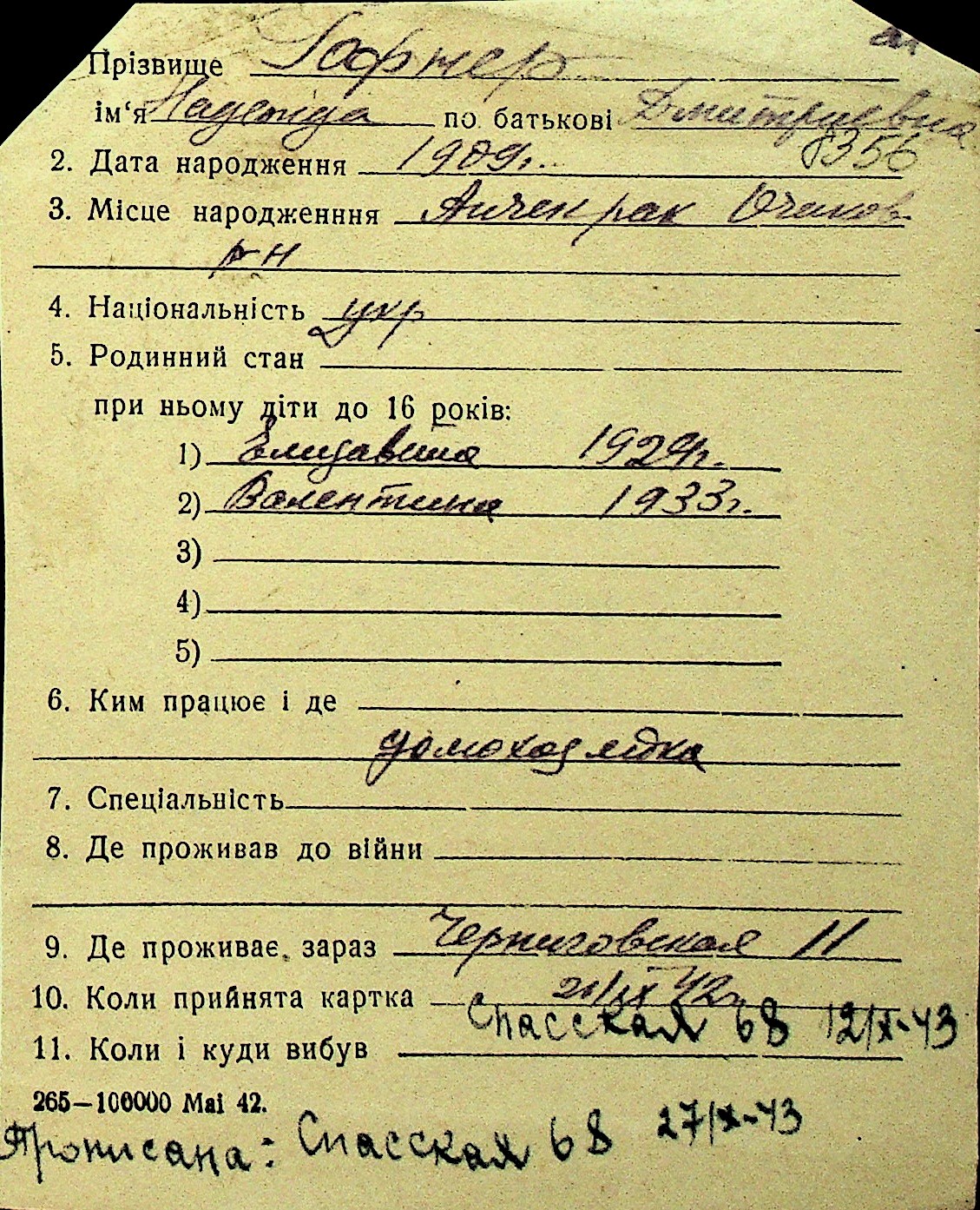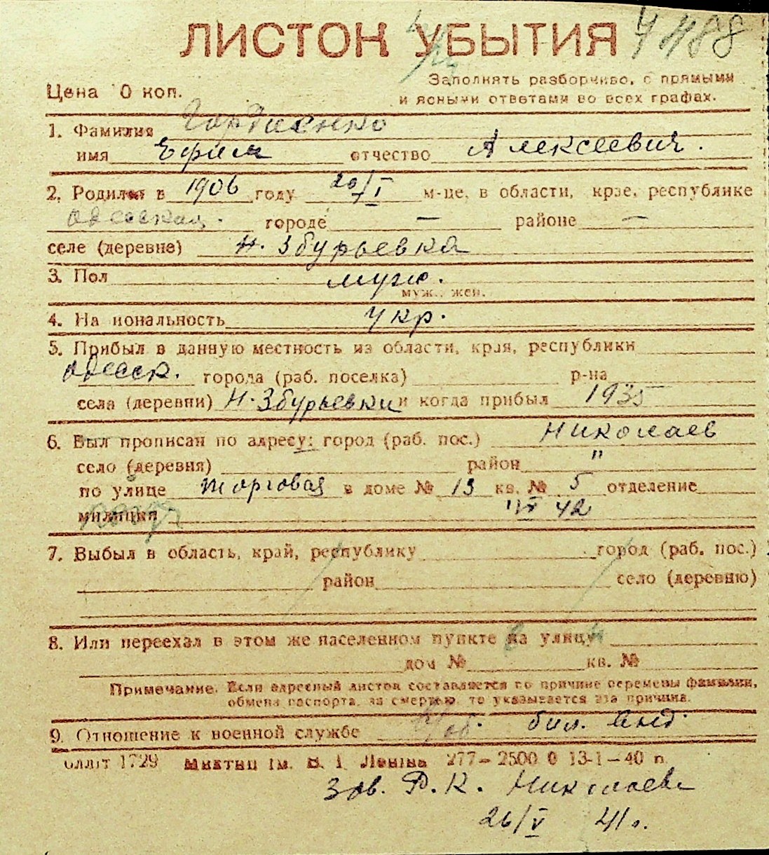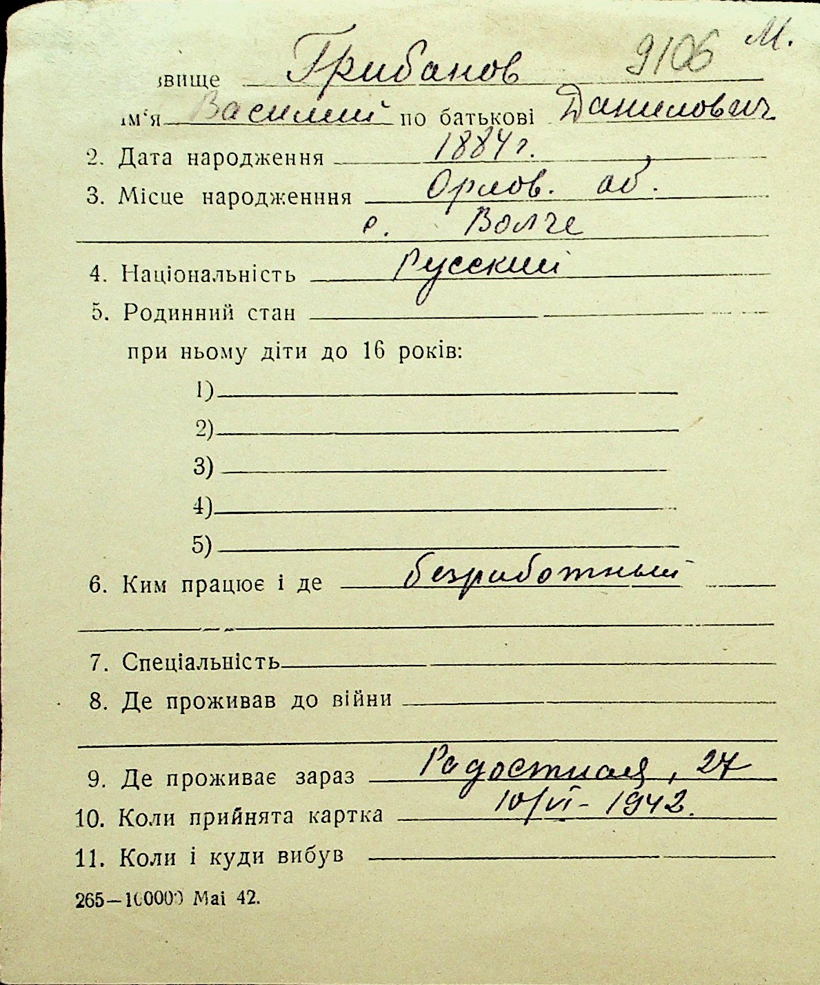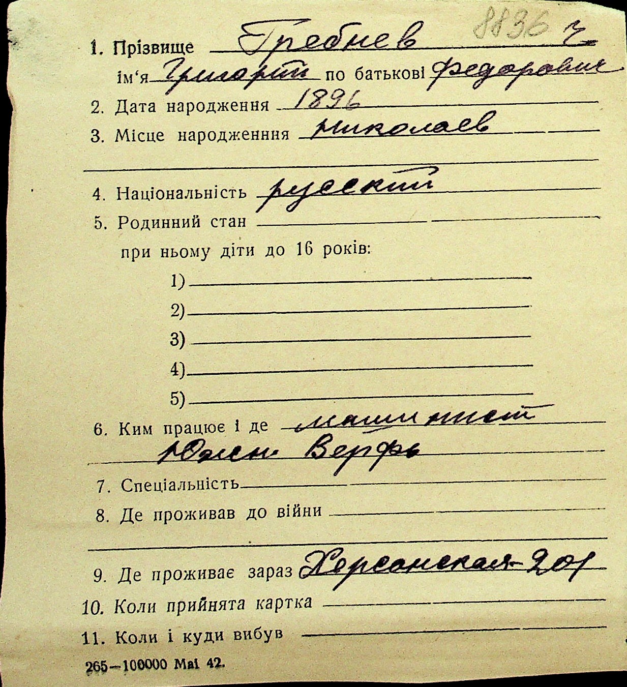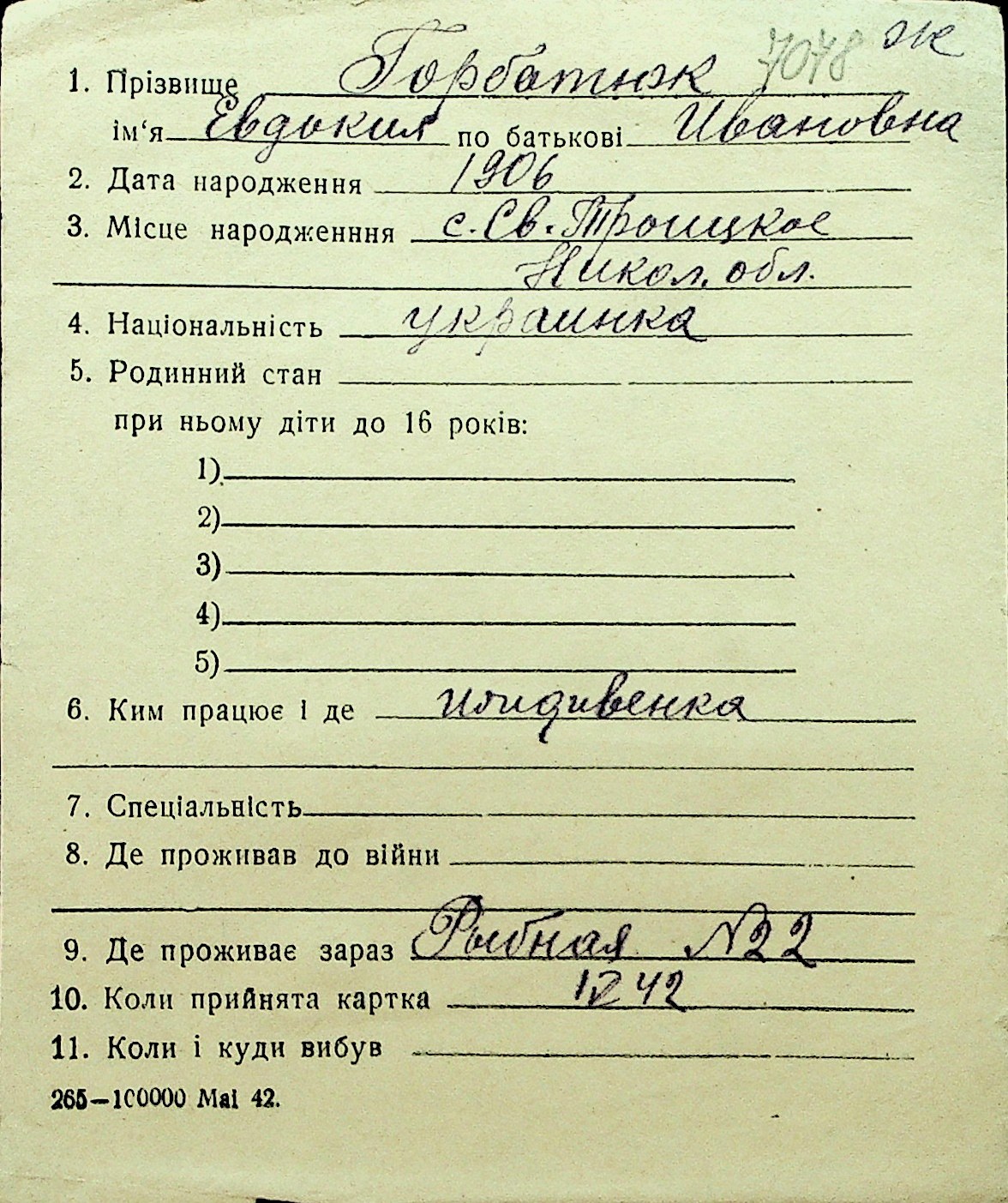 • • Перелік карток до фонду № Н-1016